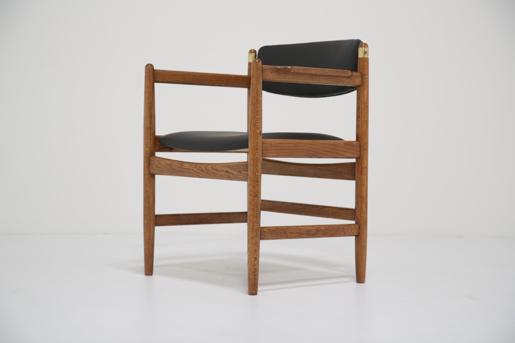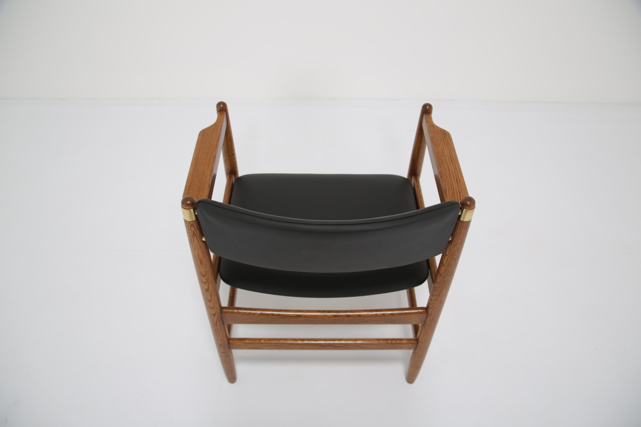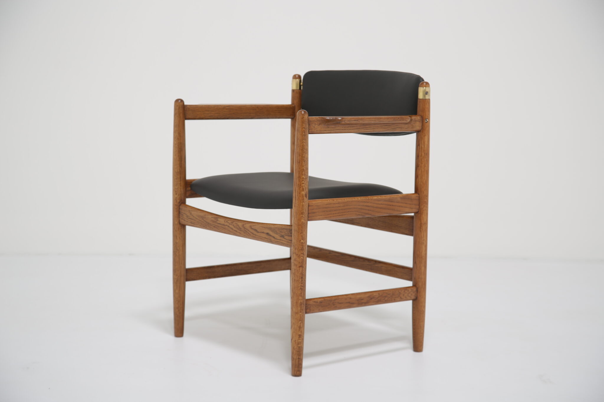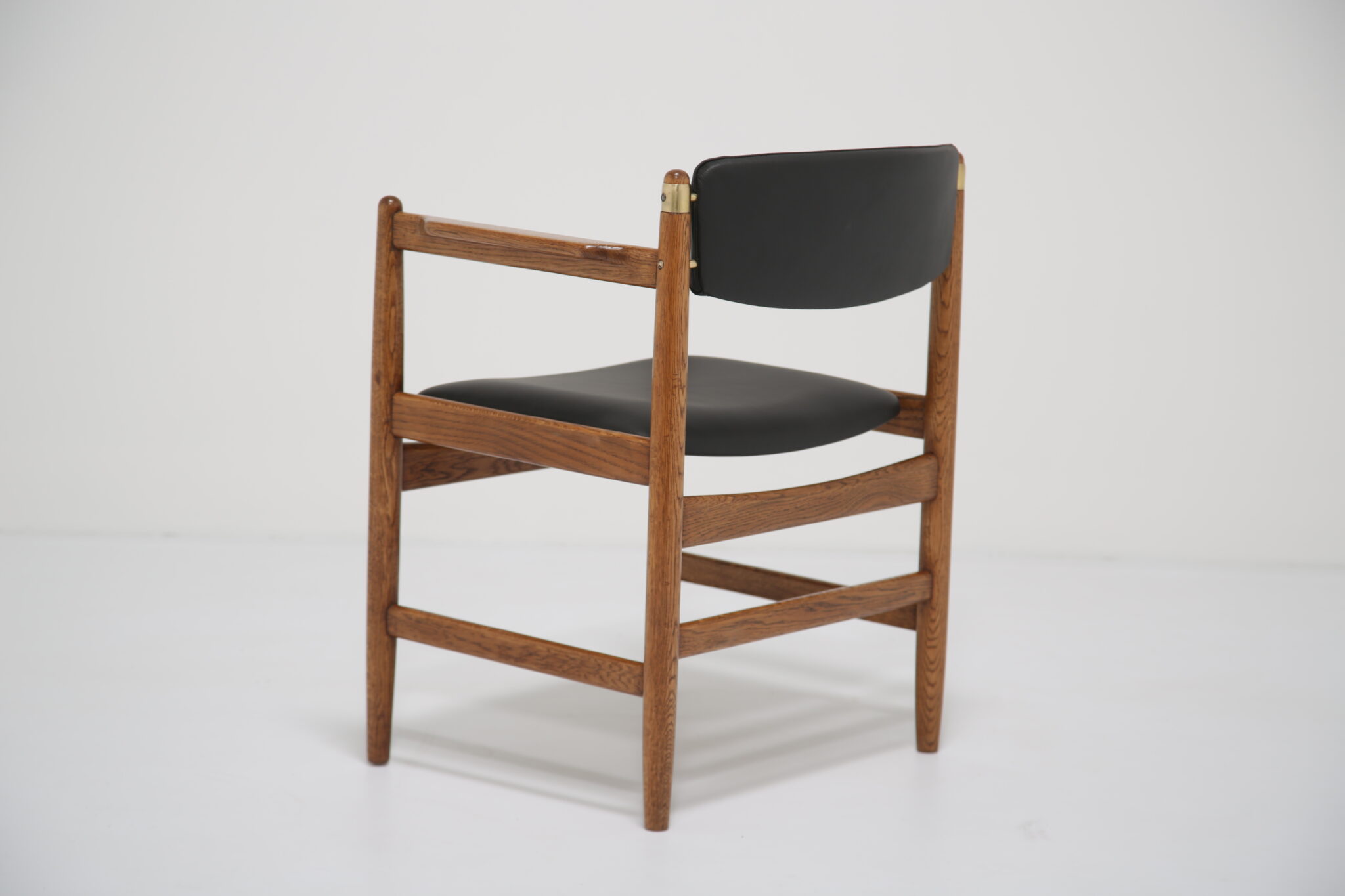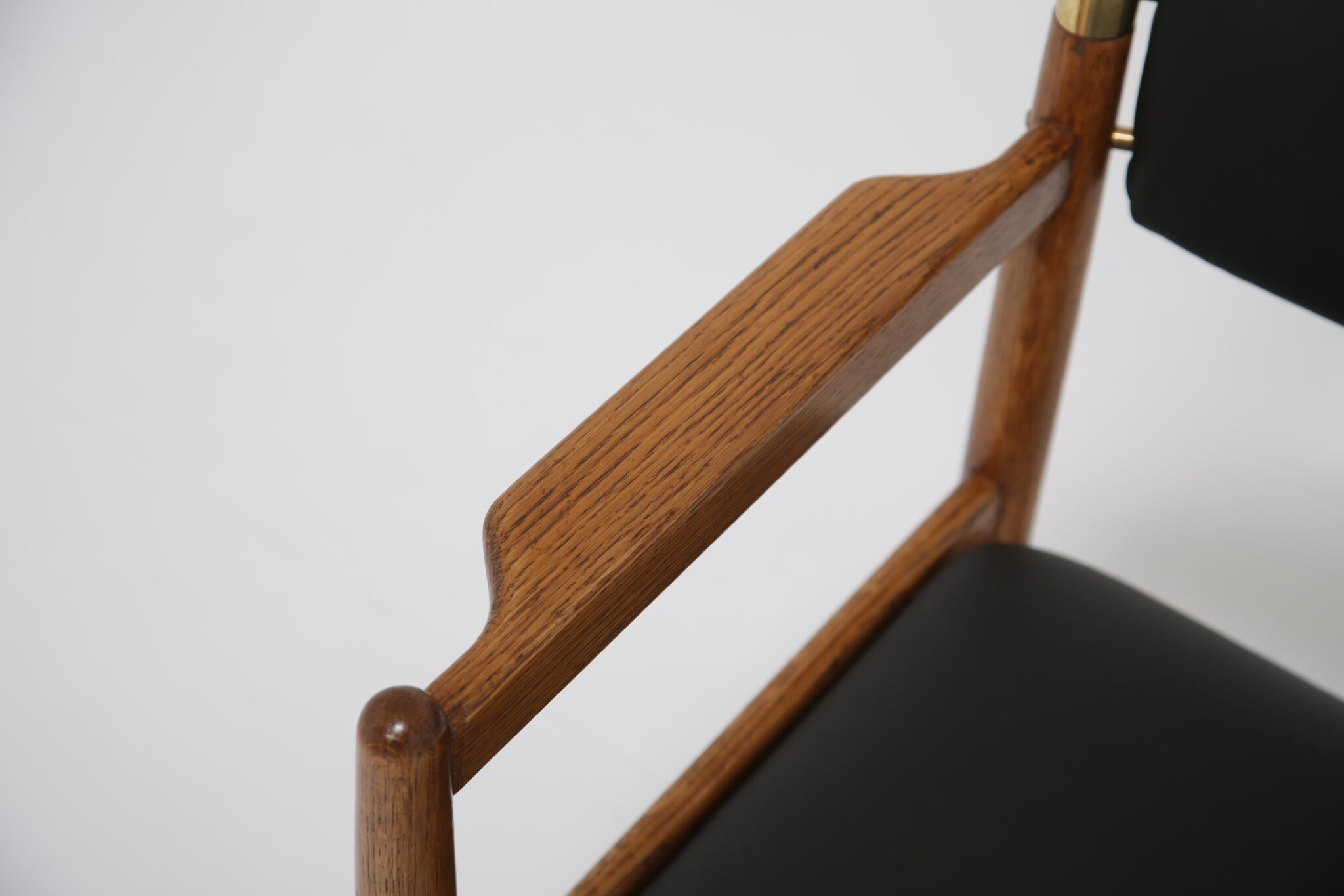 The solid oak frame has undergone a full restoration by our in-house team. The old finish was stripped and the wood was hand-sanded using various grades of paper and finished with French polish to revive its original luster. All joints have been inspected and re-glued when necessary. The upholstery has been done using premium Scandinavian leather, with new foam to ensure longevity and the highest quality possible.