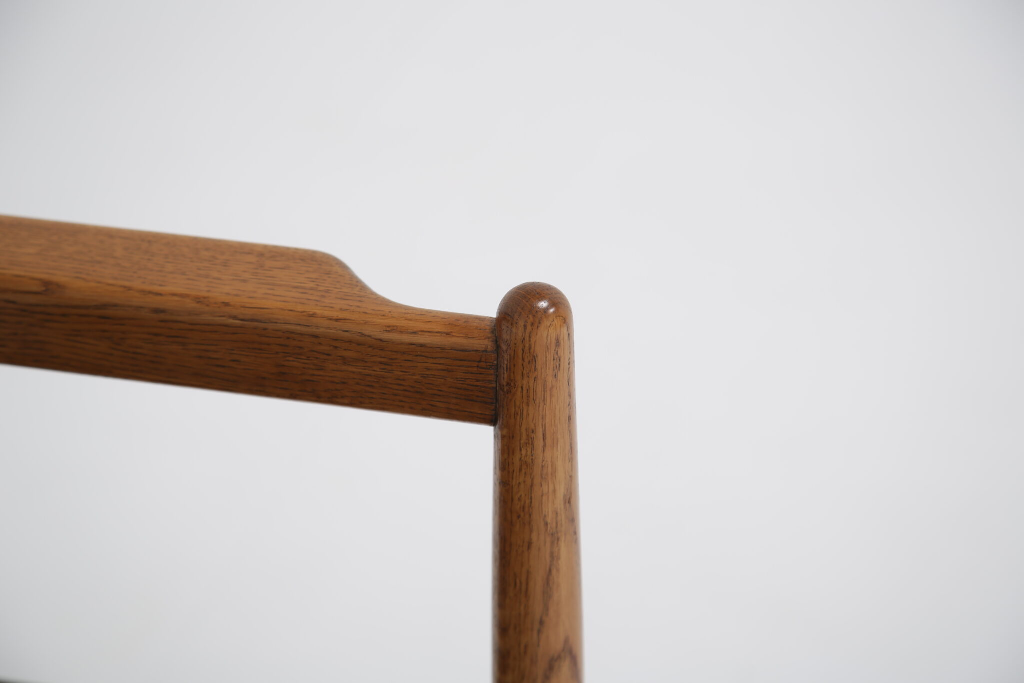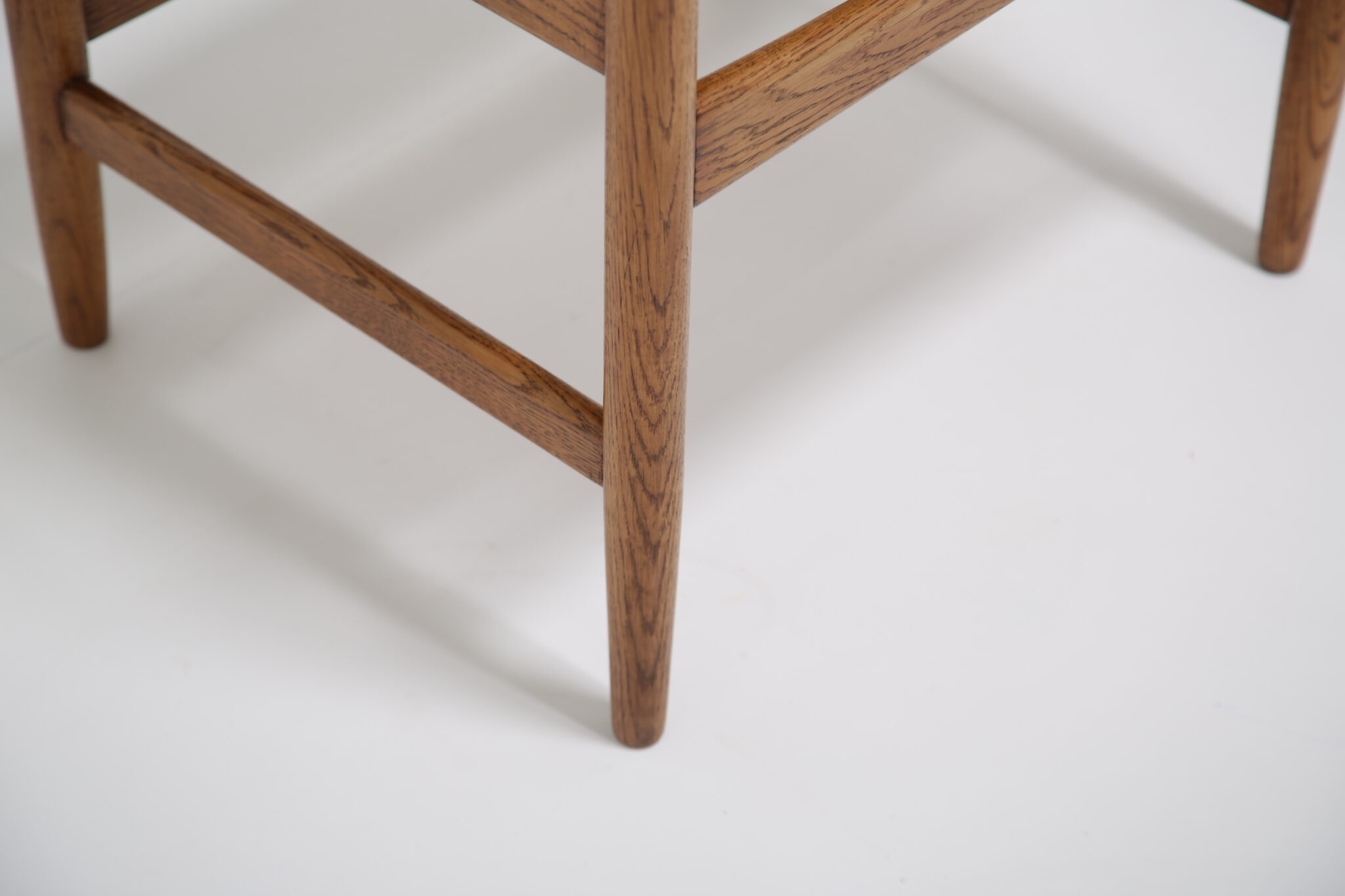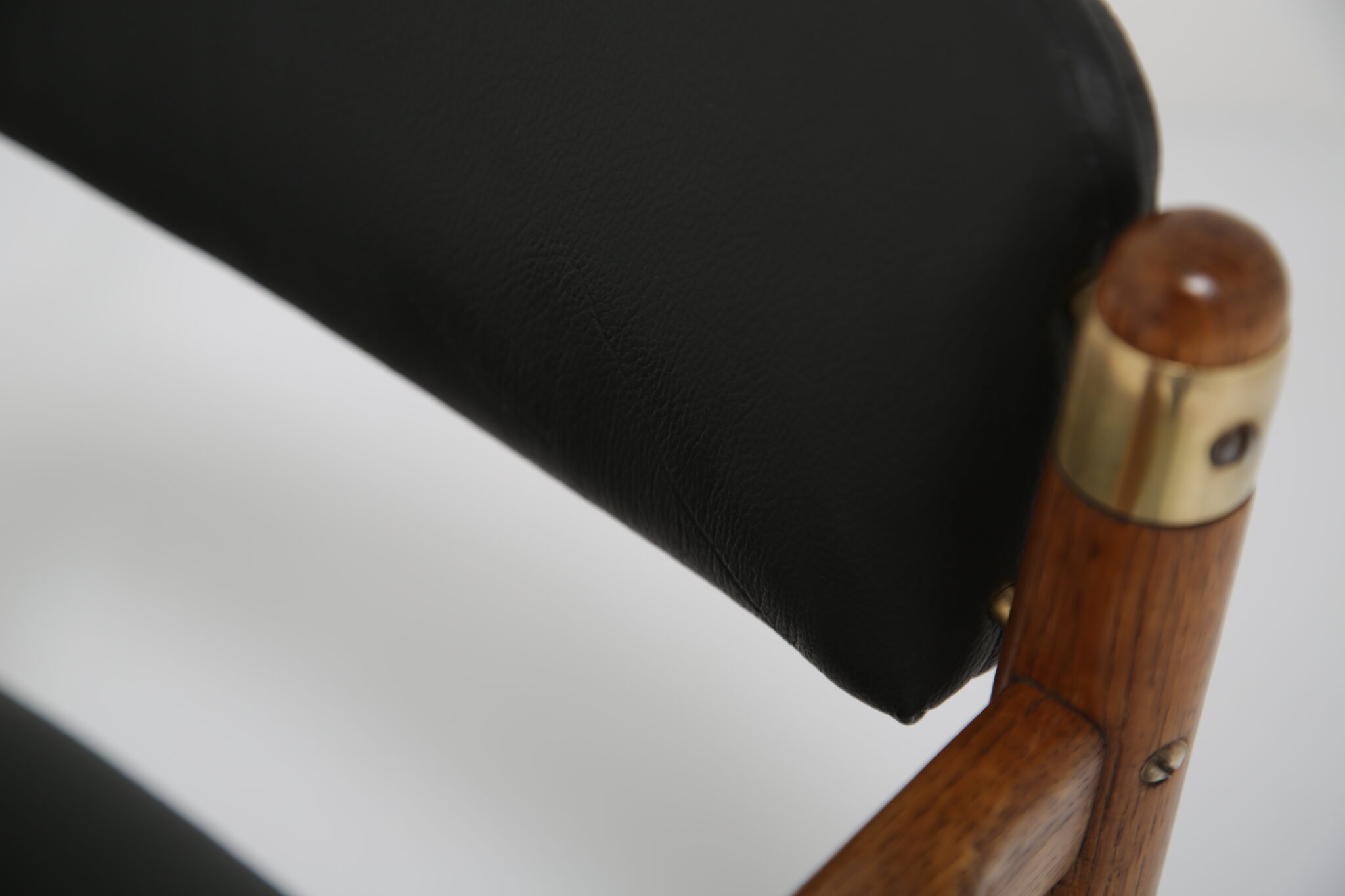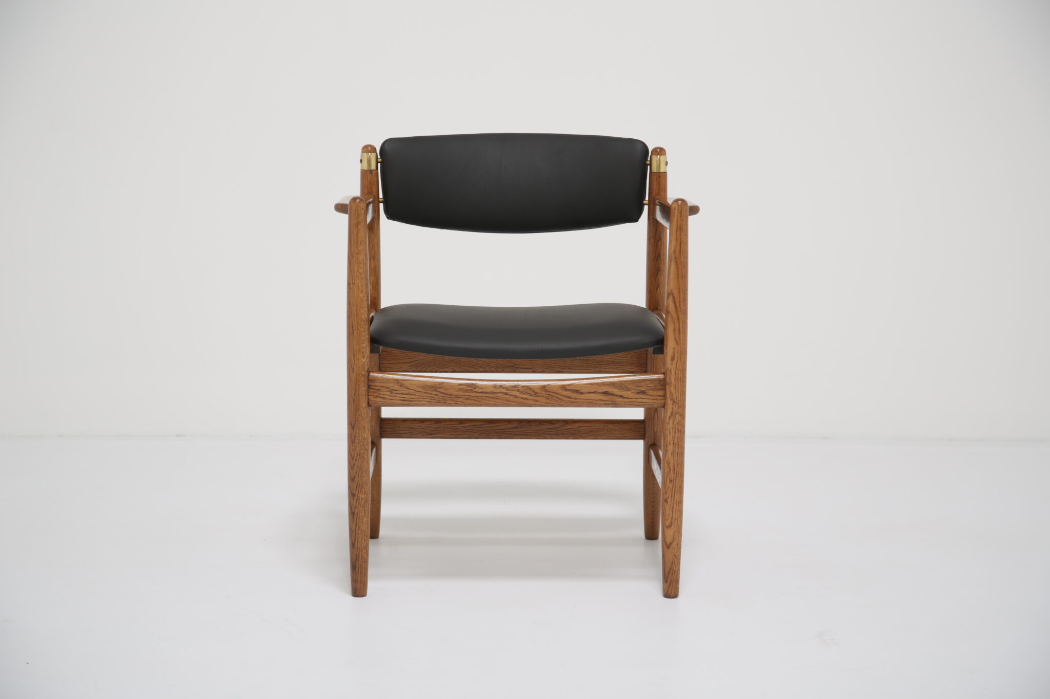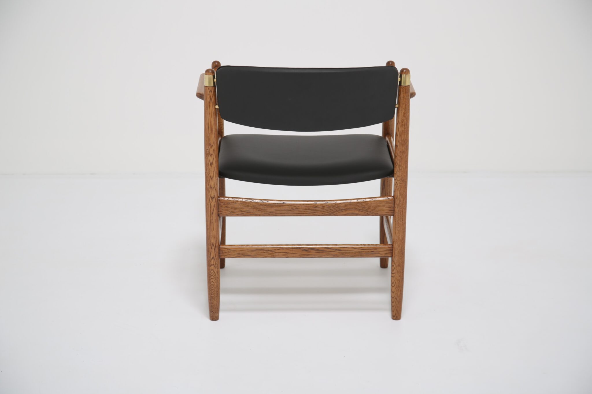 The solid oak frame has undergone a full restoration by our in-house team. The old finish was stripped and the wood was hand-sanded using various grades of paper and finished with French polish to revive its original luster. All joints have been inspected and re-glued when necessary. The upholstery has been done using premium Scandinavian leather, with new foam to ensure longevity and the highest quality possible.