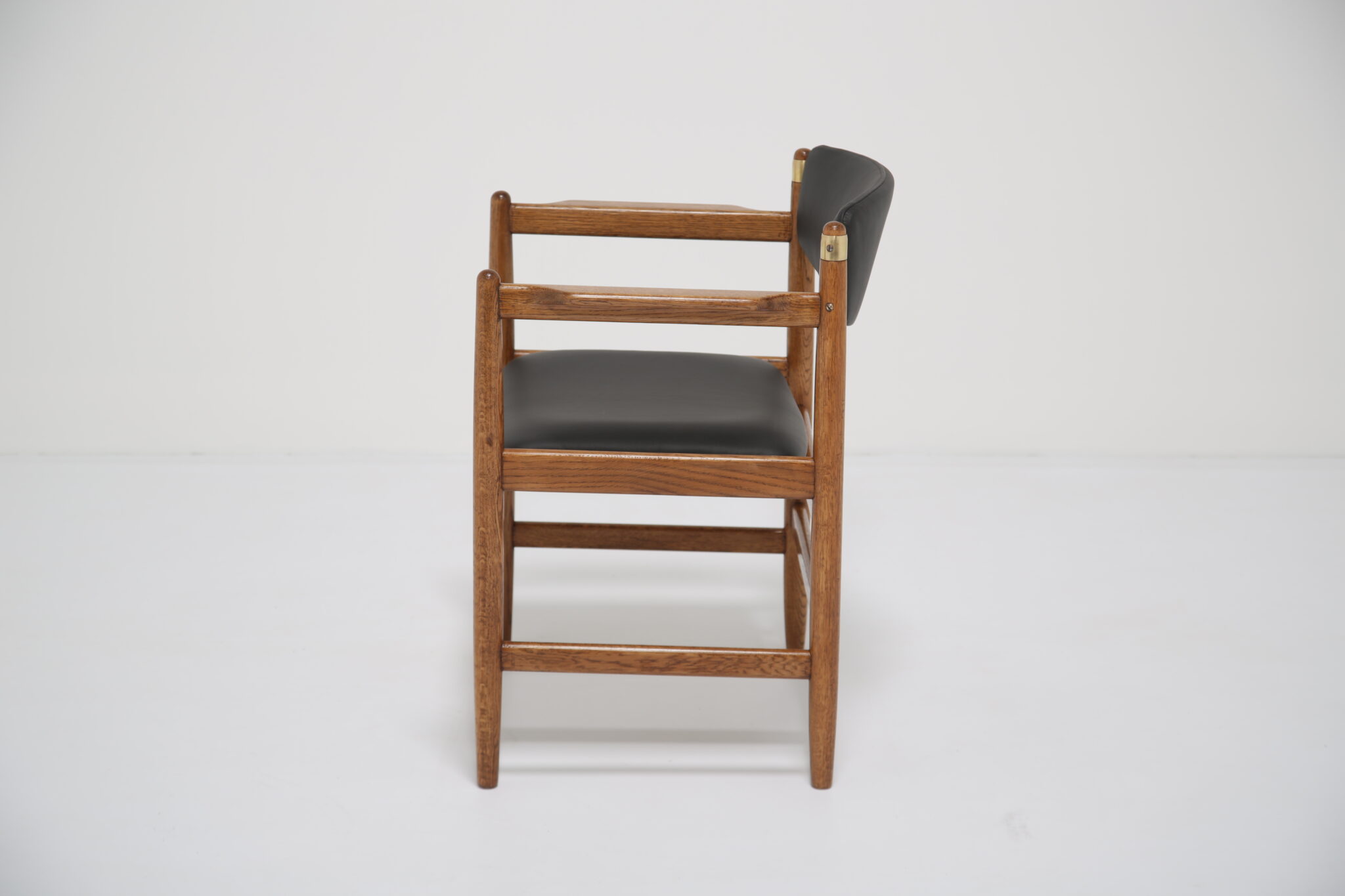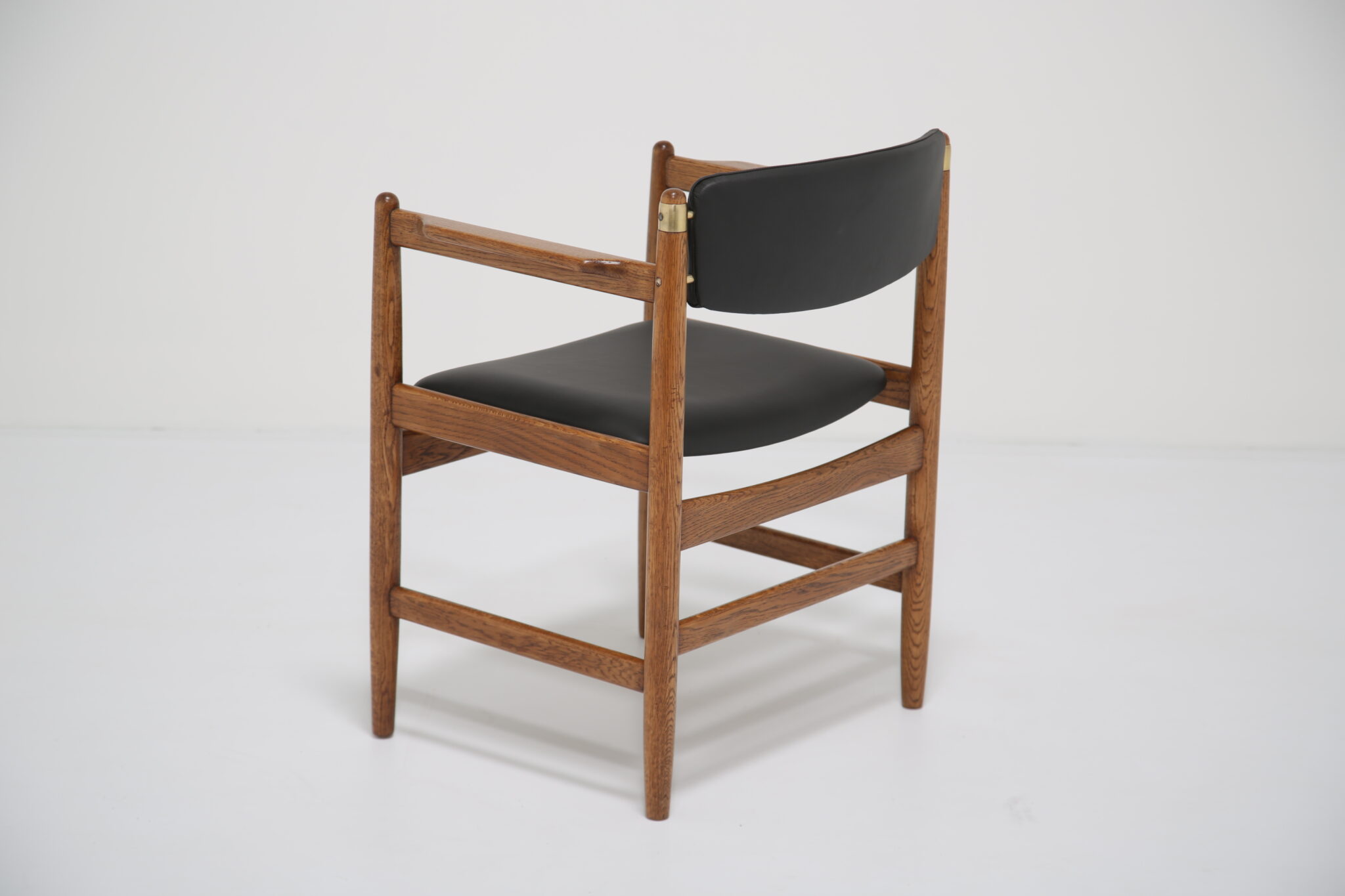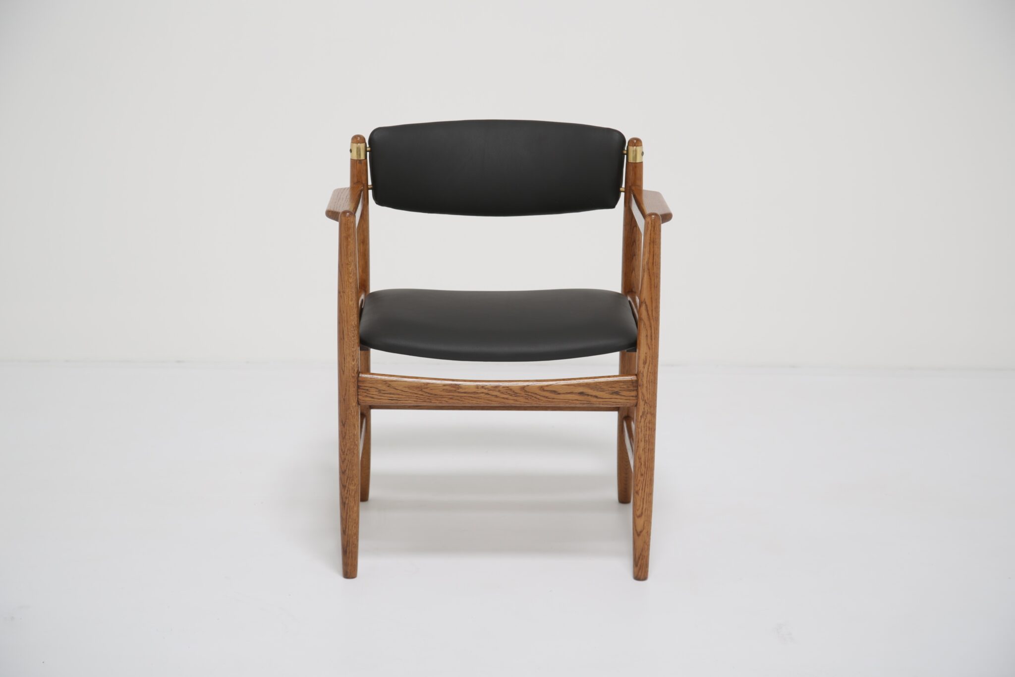 This beautifully restored Danish armchair showcases the craftsmanship and timeless design of mid-century furniture. Originally found with faded fabric, surface wear, and a darkened finish (see final image), the chair has been completely revitalized by our in-house restoration team. We paired the chair with premium black Scandinavian leather that has a lovely grained pattern and soft feel.
