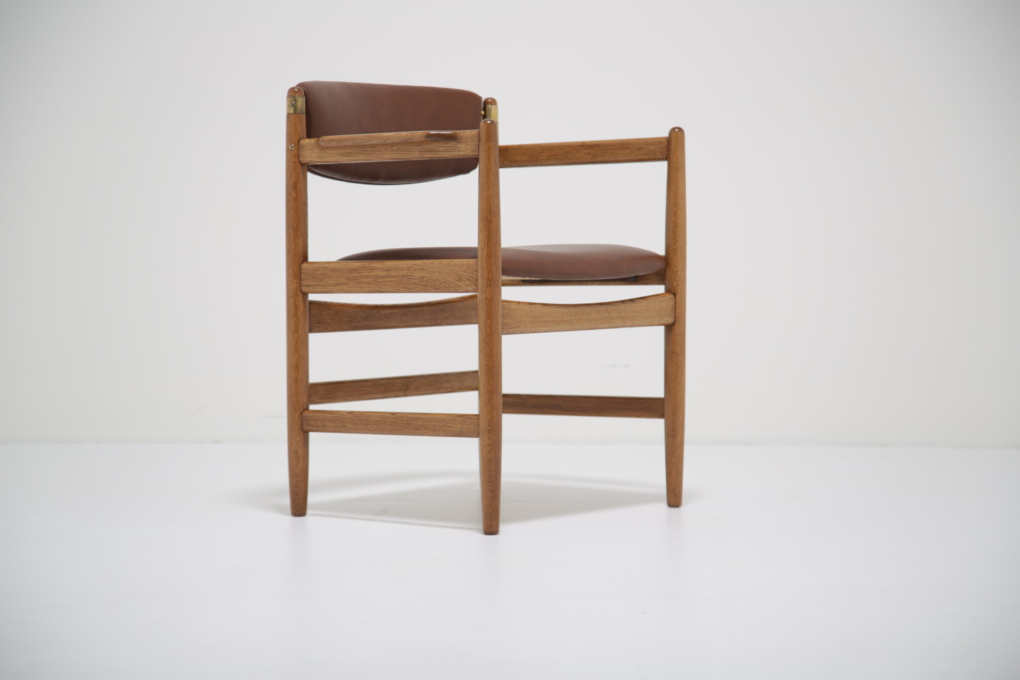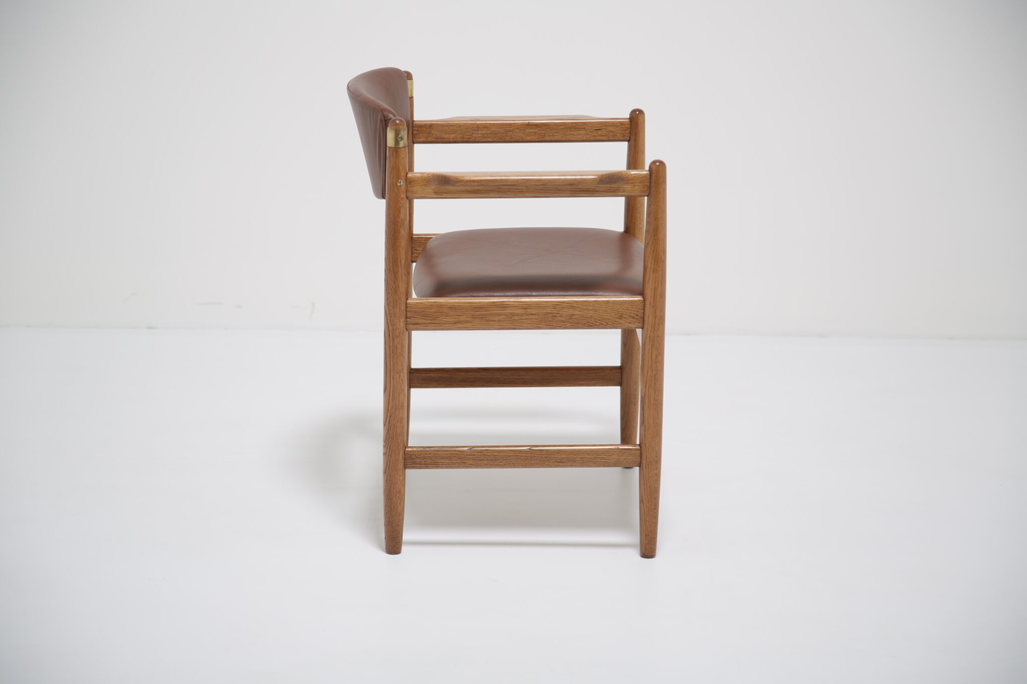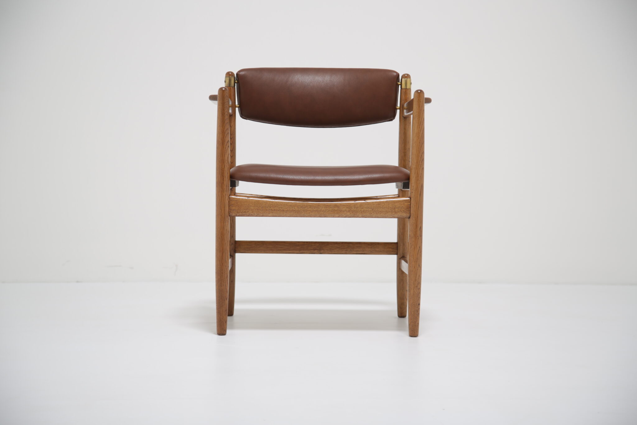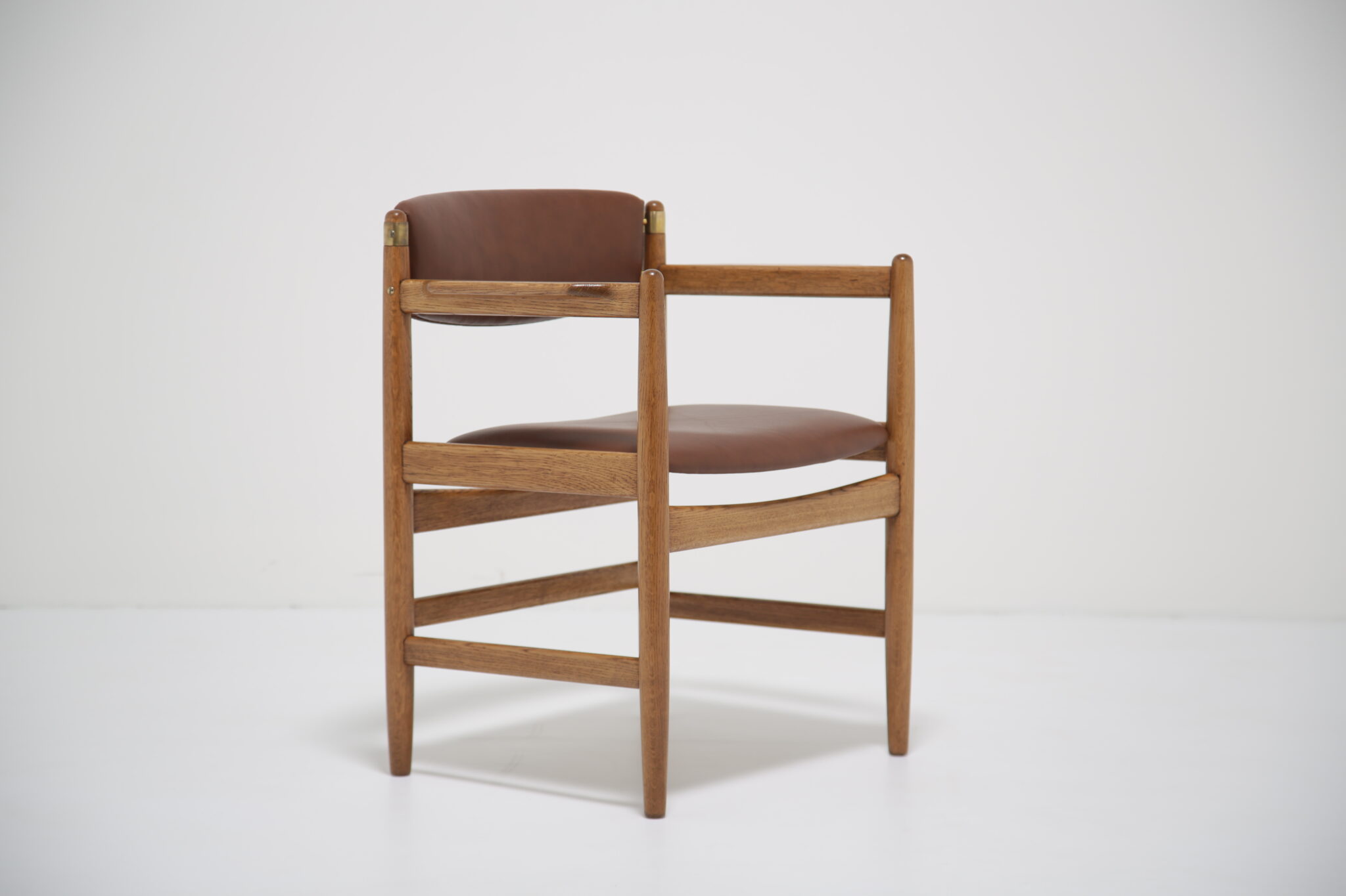 This beautifully restored Danish armchair showcases the craftsmanship and timeless design of mid-century furniture. Originally found with faded fabric, surface wear, and a darkened finish (see final image), the chair has been completely revitalized by our in-house restoration team. We paired the chair with a premium brown Scandinavian leather that has a lovely grained pattern and soft feel.