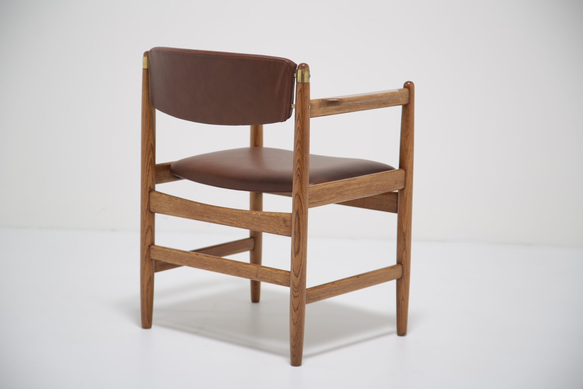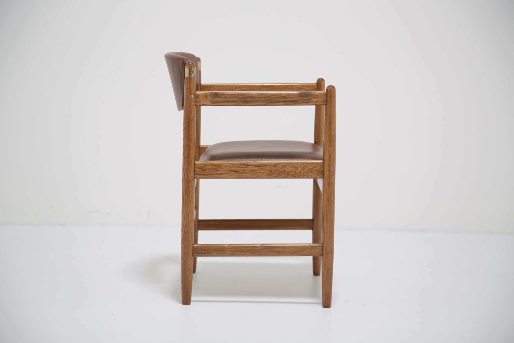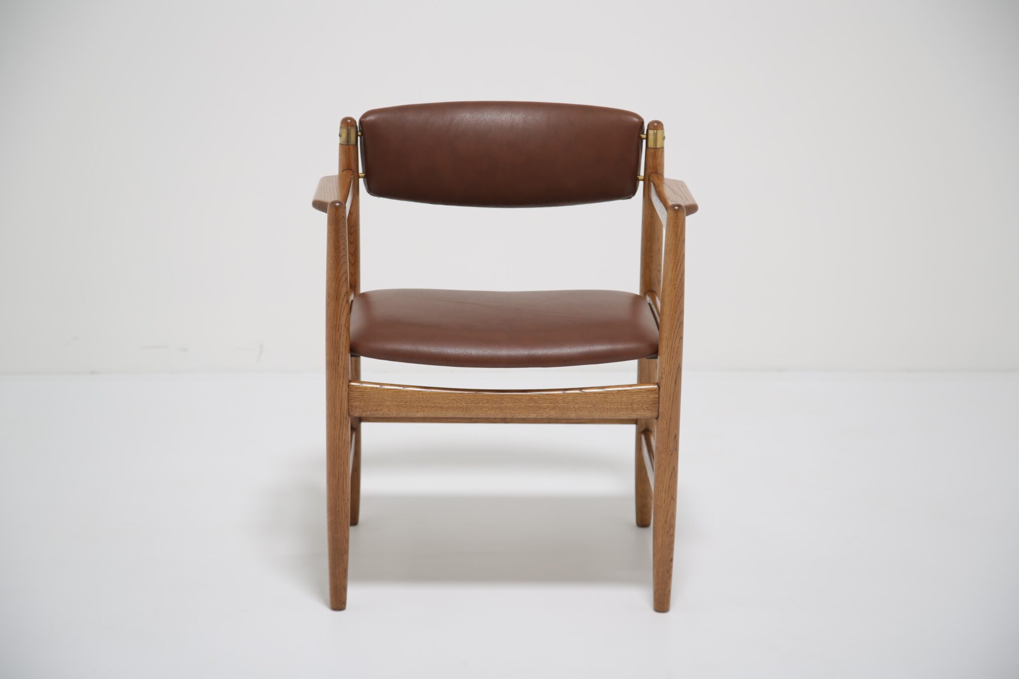 This beautifully restored Danish armchair showcases the craftsmanship and timeless design of mid-century furniture. Originally found with faded fabric, surface wear, and a darkened finish (see final image), the chair has been completely revitalized by our in-house restoration team. We paired the chair with a premium brown Scandinavian leather that has a lovely grained pattern and soft feel.
