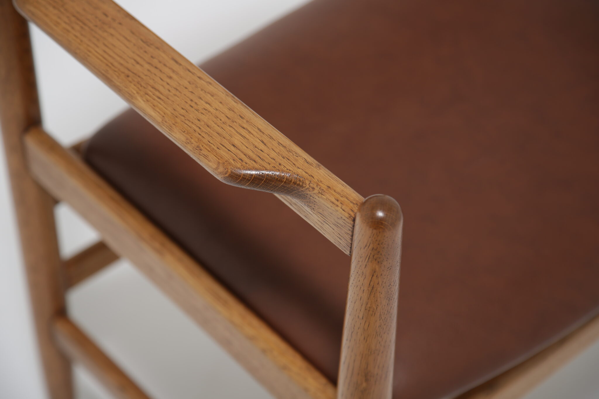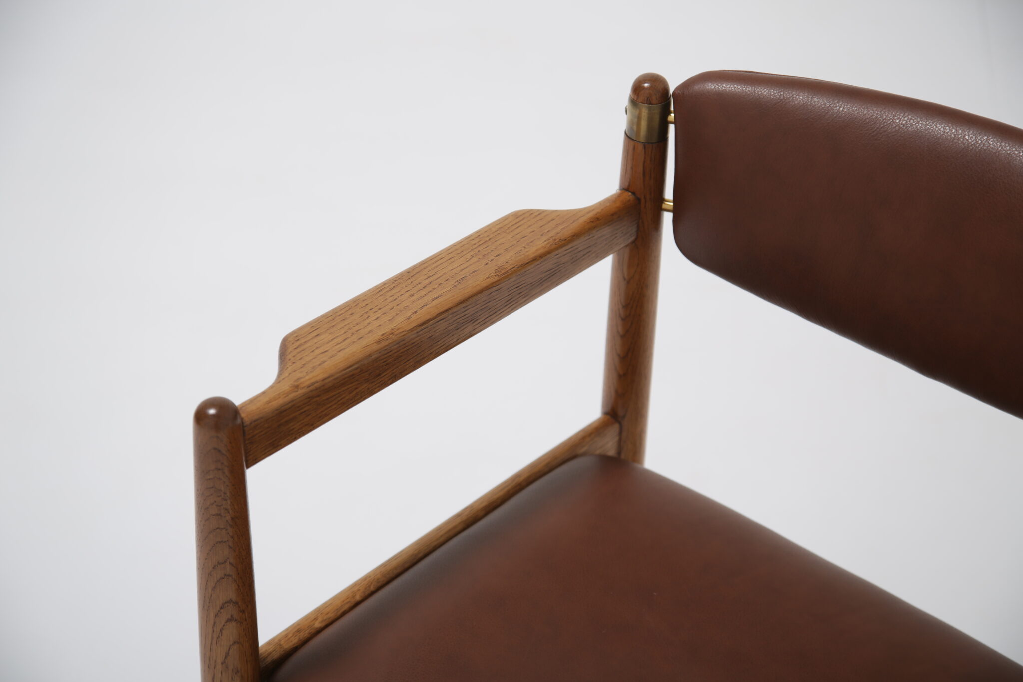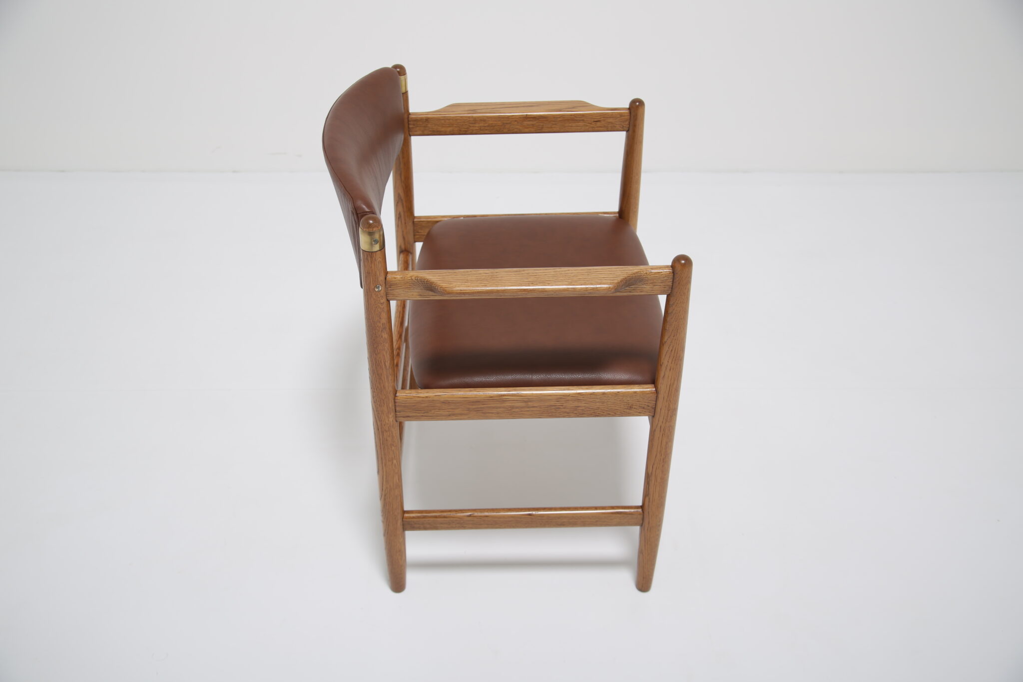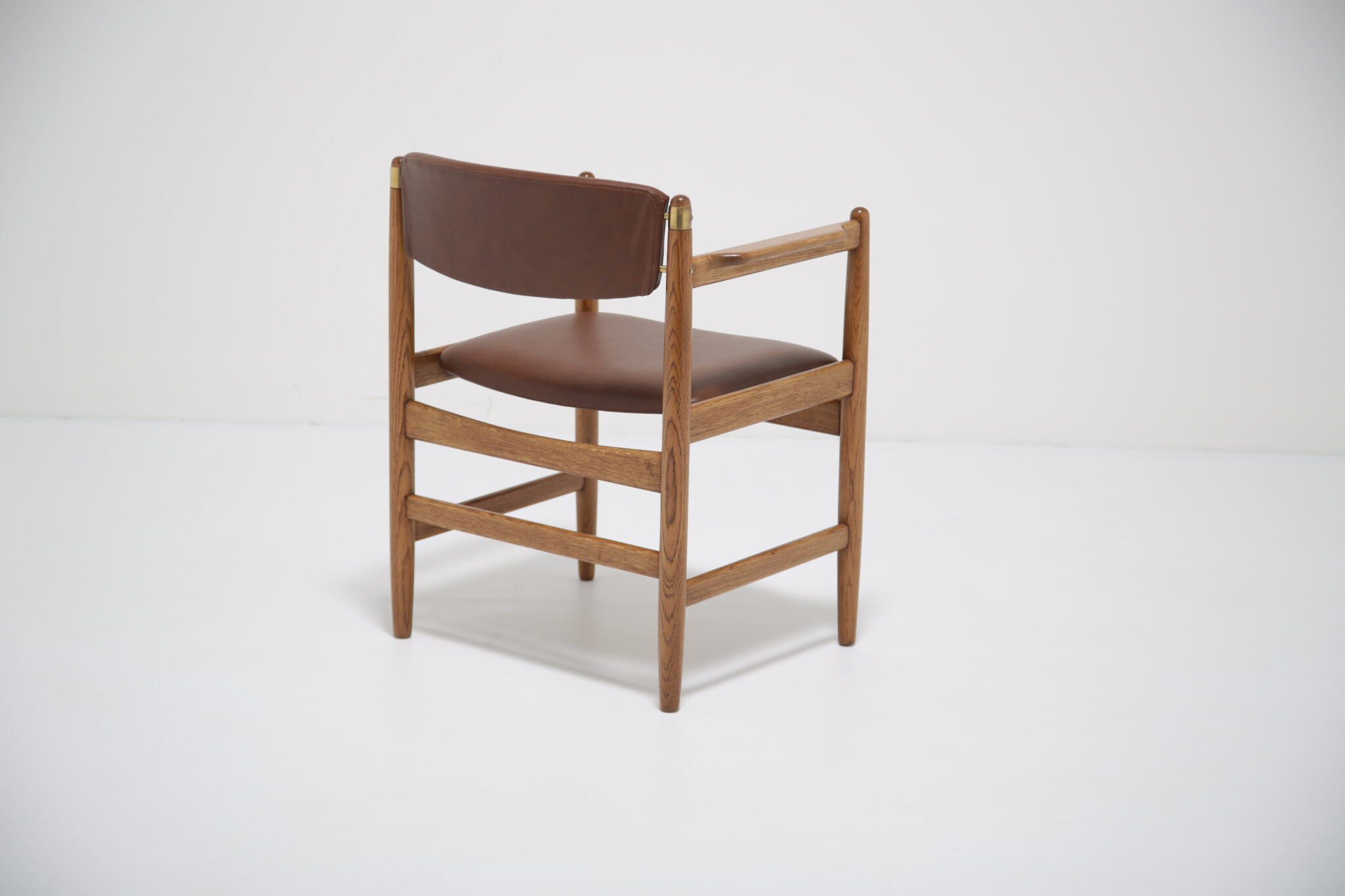 This beautifully restored Danish armchair showcases the craftsmanship and timeless design of mid-century furniture. Originally found with faded fabric, surface wear, and a darkened finish (see final image), the chair has been completely revitalized by our in-house restoration team. We paired the chair with a premium brown Scandinavian leather that has a lovely grained pattern and soft feel.