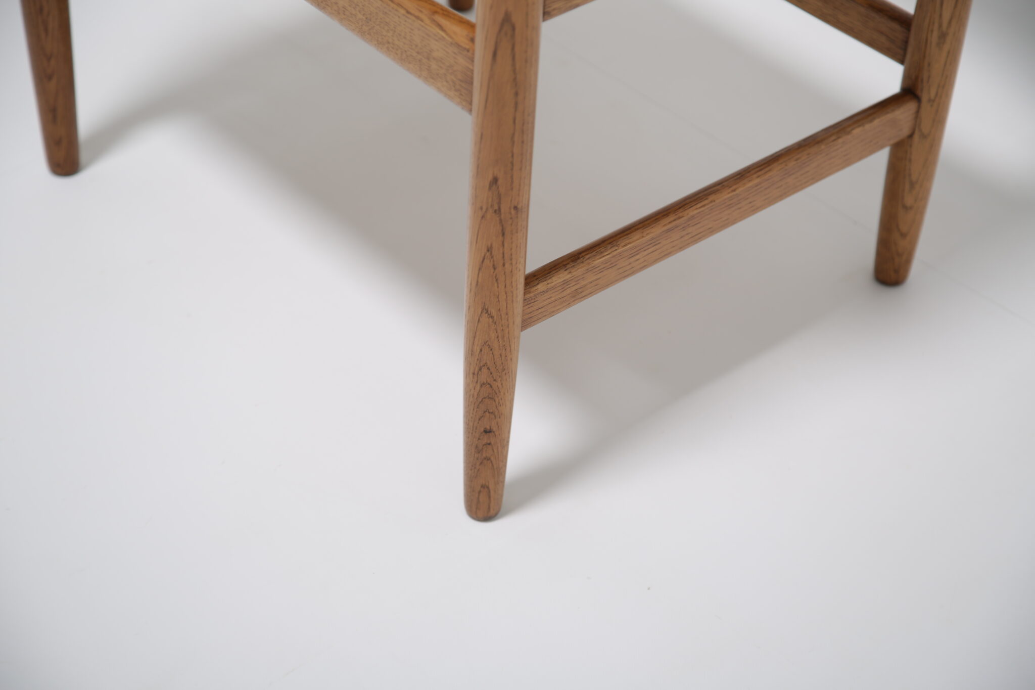 The solid oak frame has undergone a full restoration by our in-house team. The old finish was stripped and the wood was hand-sanded using various grades of paper and finished with French polish to revive its original luster. All joints have been inspected and re-glued when necessary. The upholstery has been done using premium Scandinavian leather, with new foam to ensure longevity and the highest quality possible.