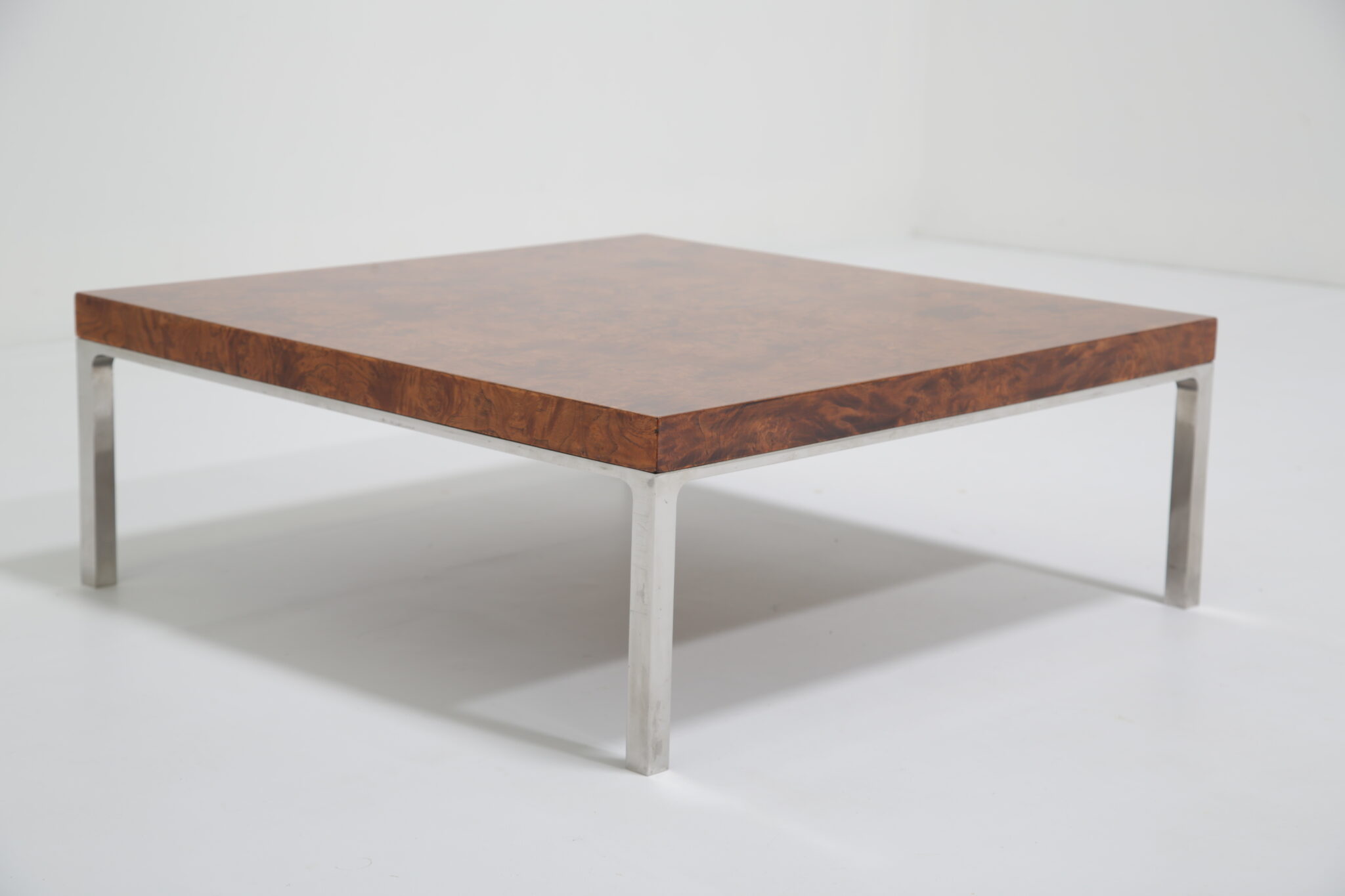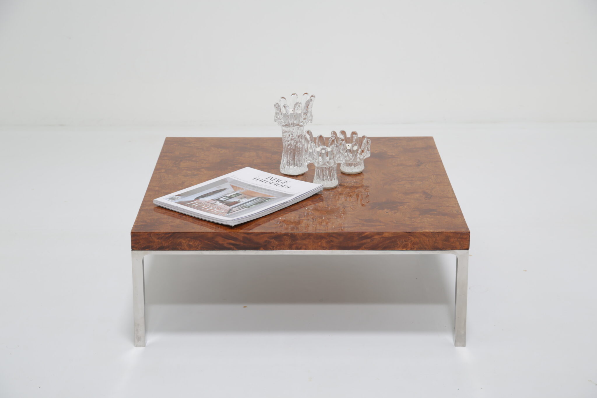 If you are on the hunt for a low coffee table with style and design, this could be the one for you. Manufactured in olive burl wood and paired with a chrome frame, it creates a beautiful minimalist design that is reflective. This table has been expertly restored by our talented team and has been sprayed in a gloss finish to bring it back to it’s former glory. This could also work as a side table between a sofa and an armchair to hold a tall lamp or vase.