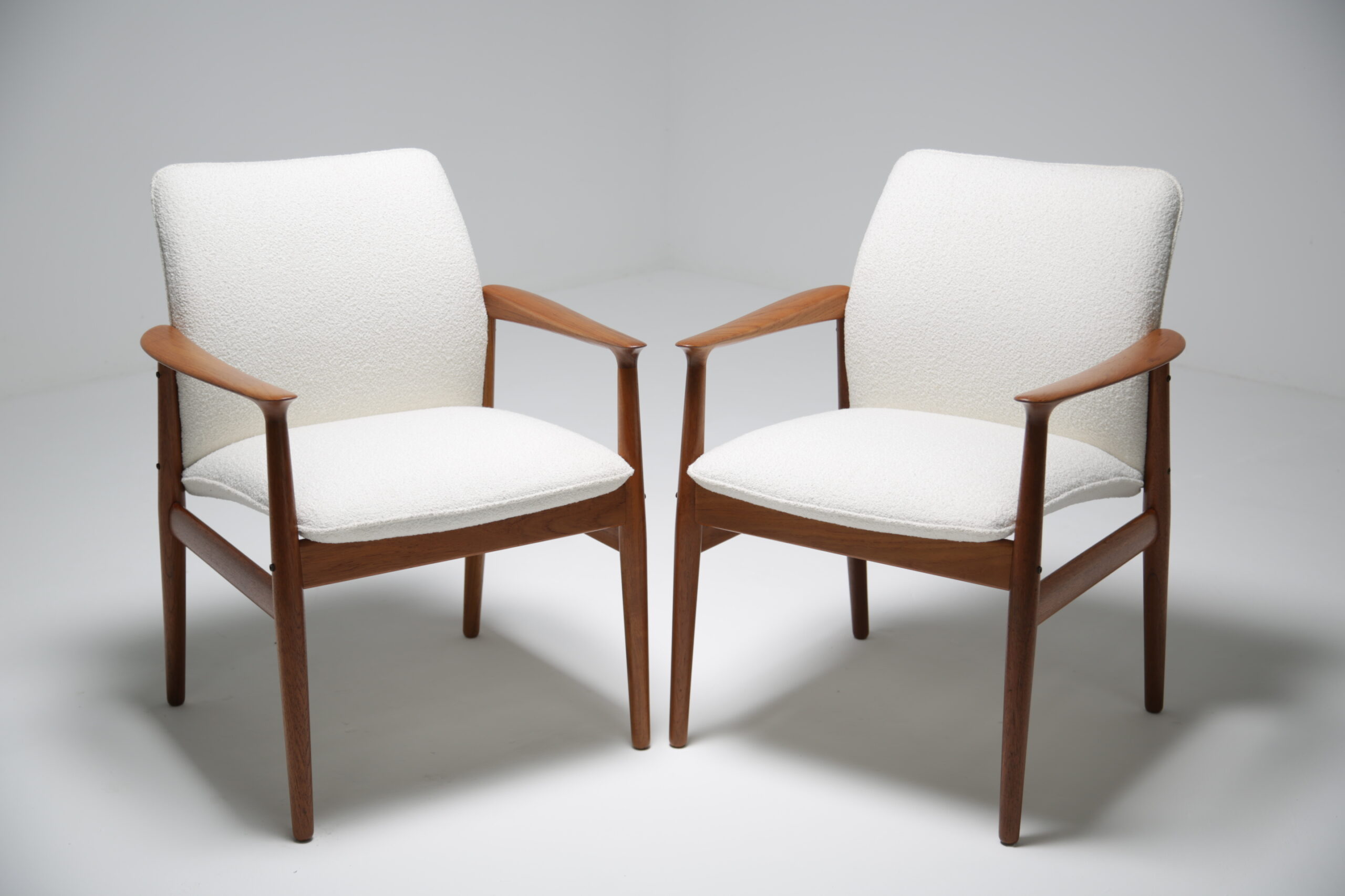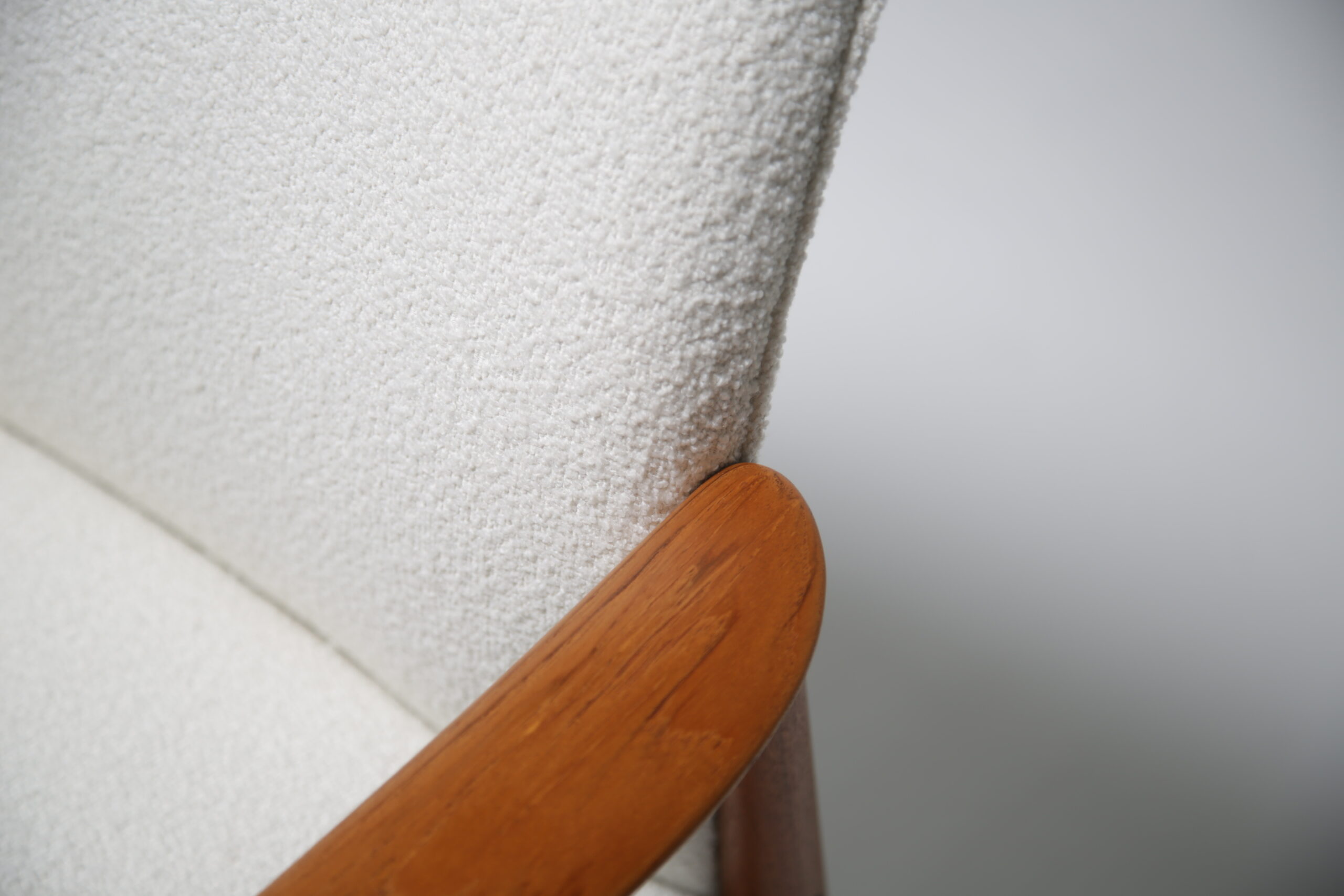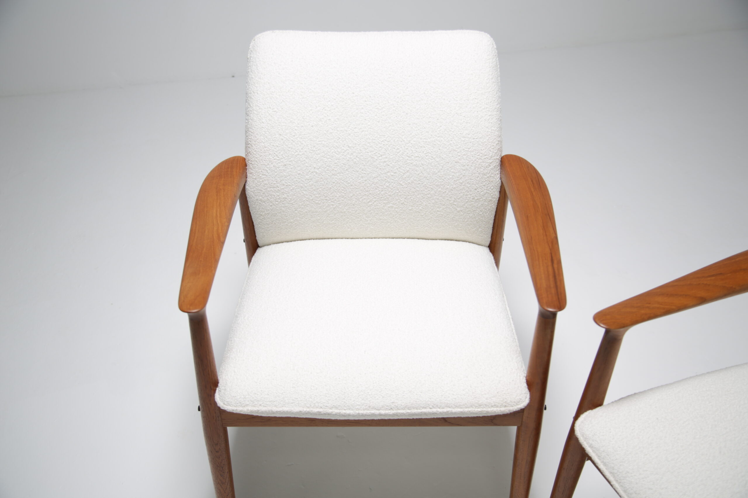 Excellent. Teak frames fully restored. Newly upholstered in white bouclé. Ready for immediate use in any interior.
