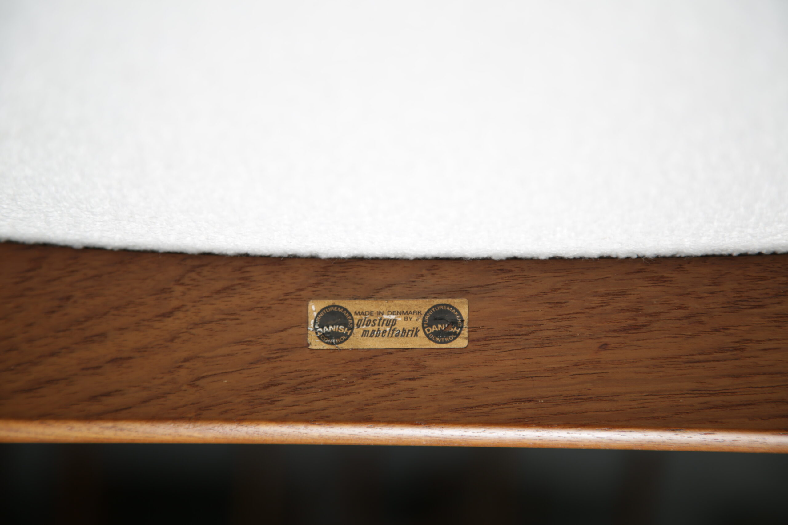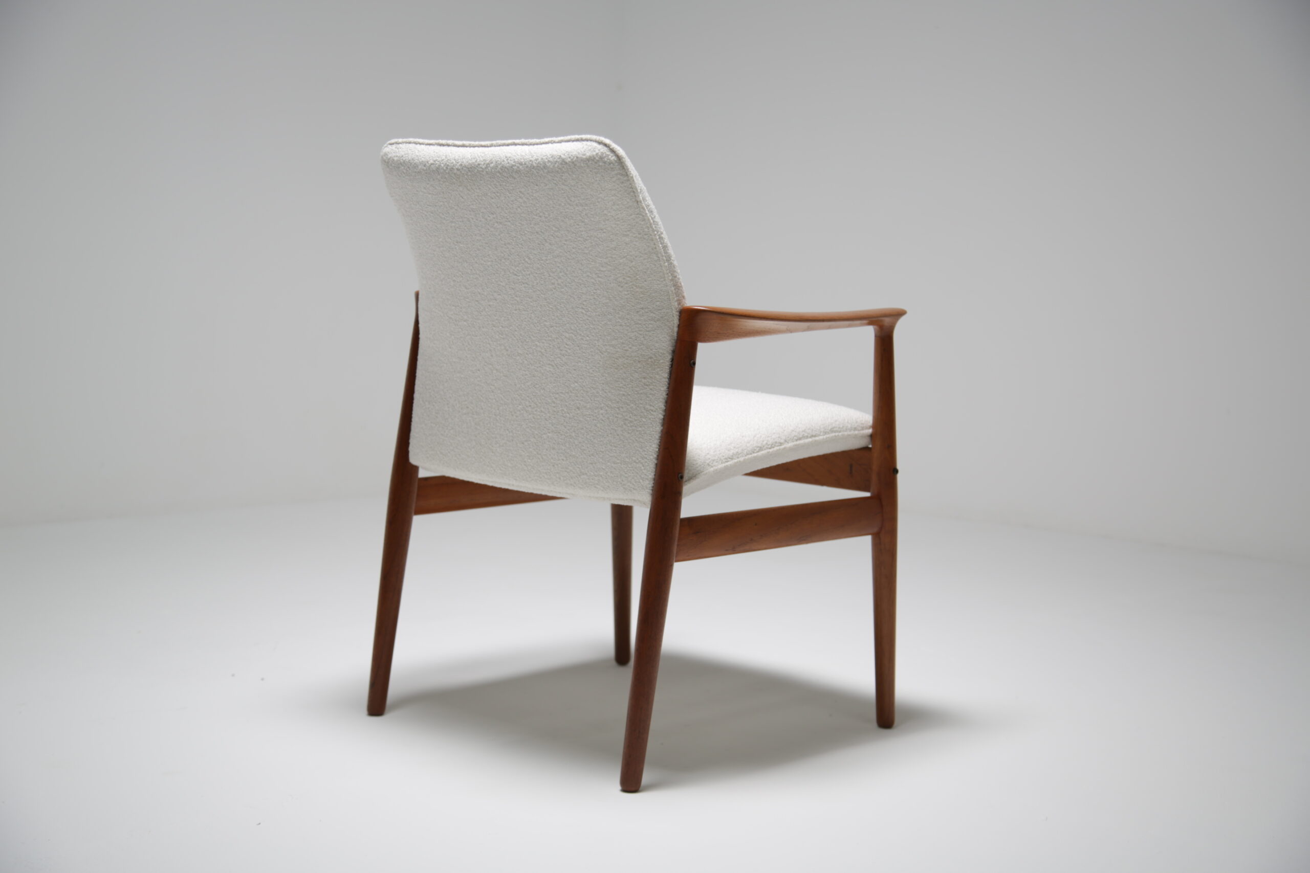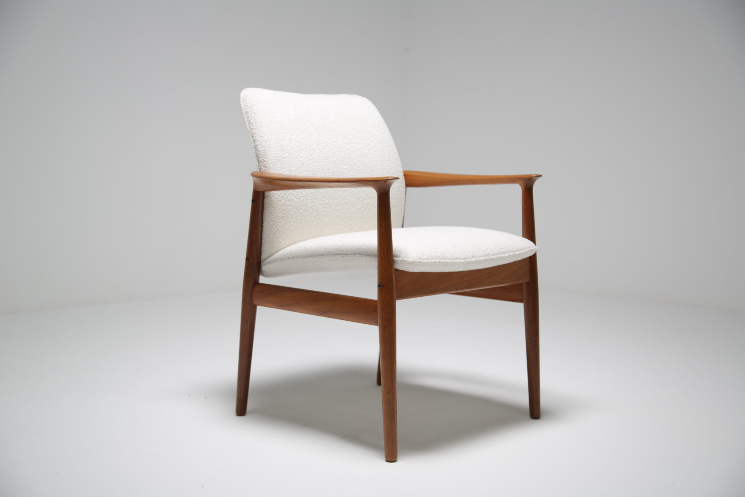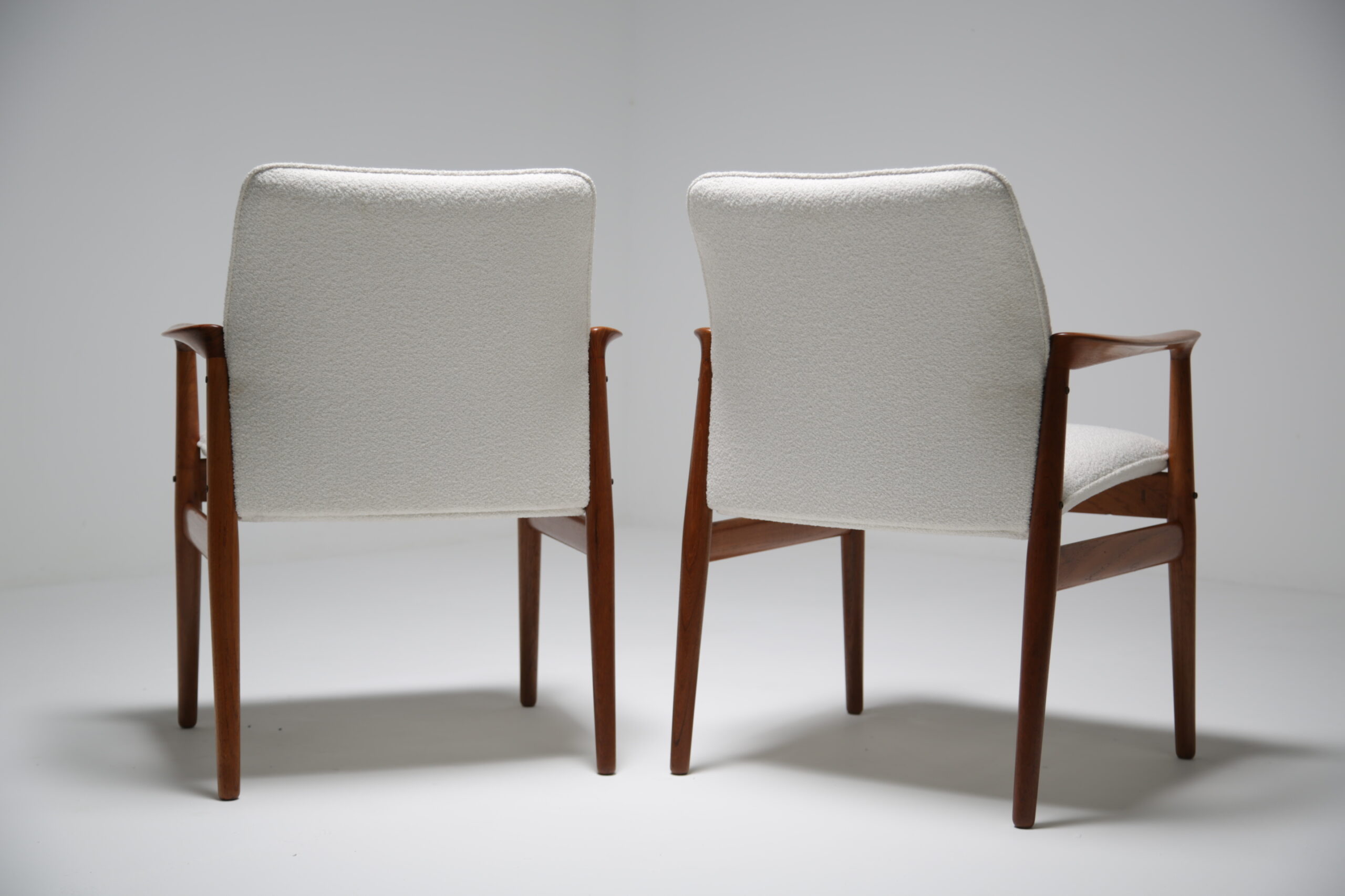 Excellent. Teak frames fully restored. Newly upholstered in white bouclé. Ready for immediate use in any interior.