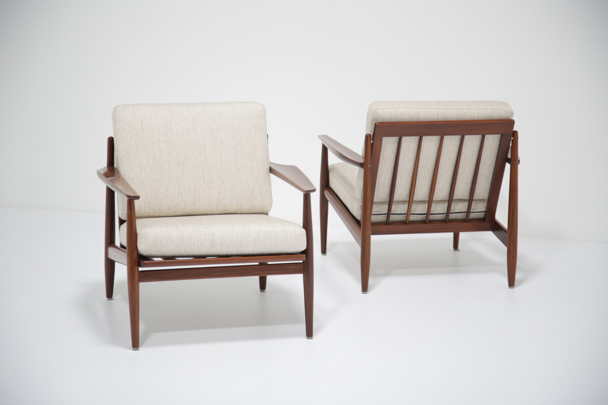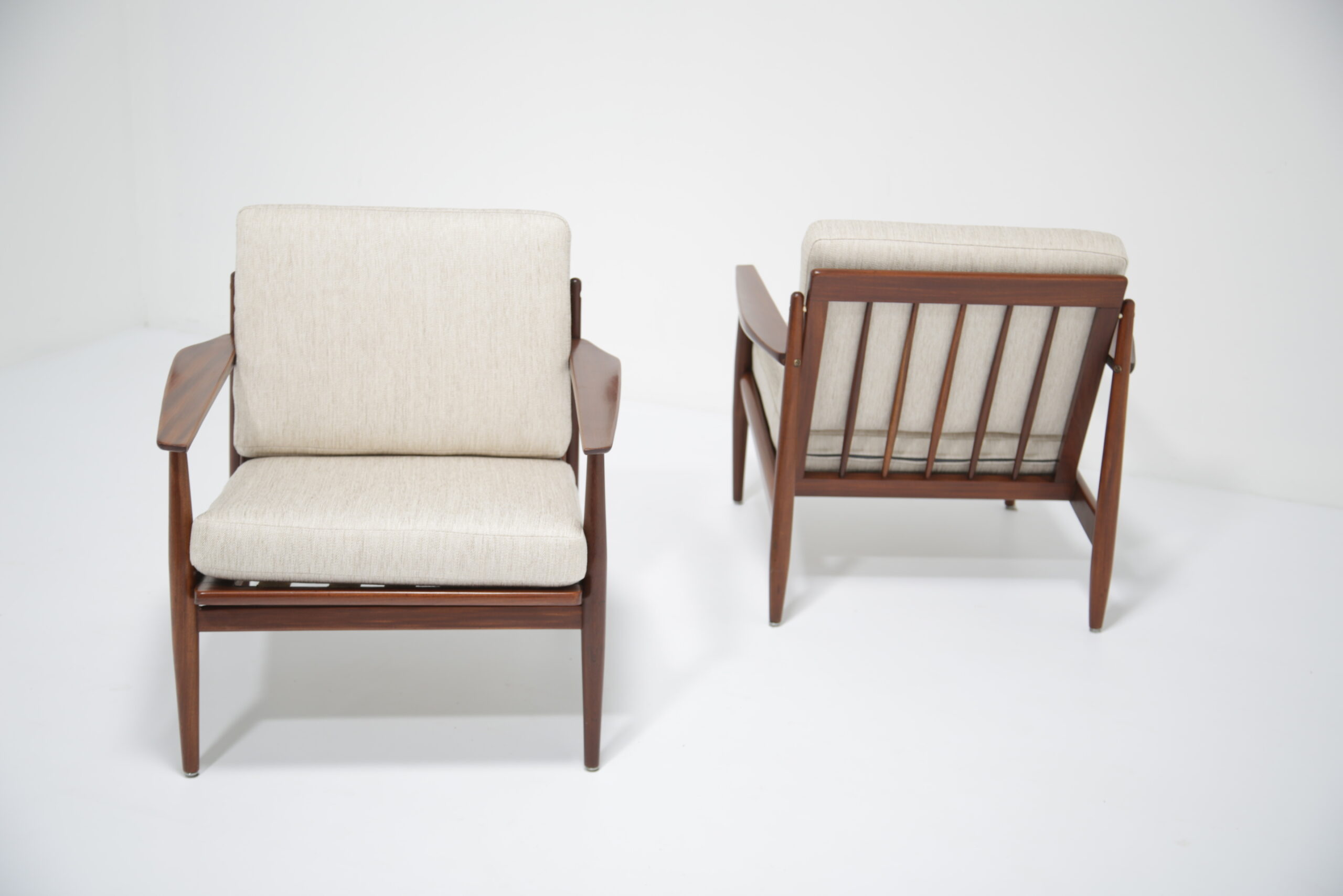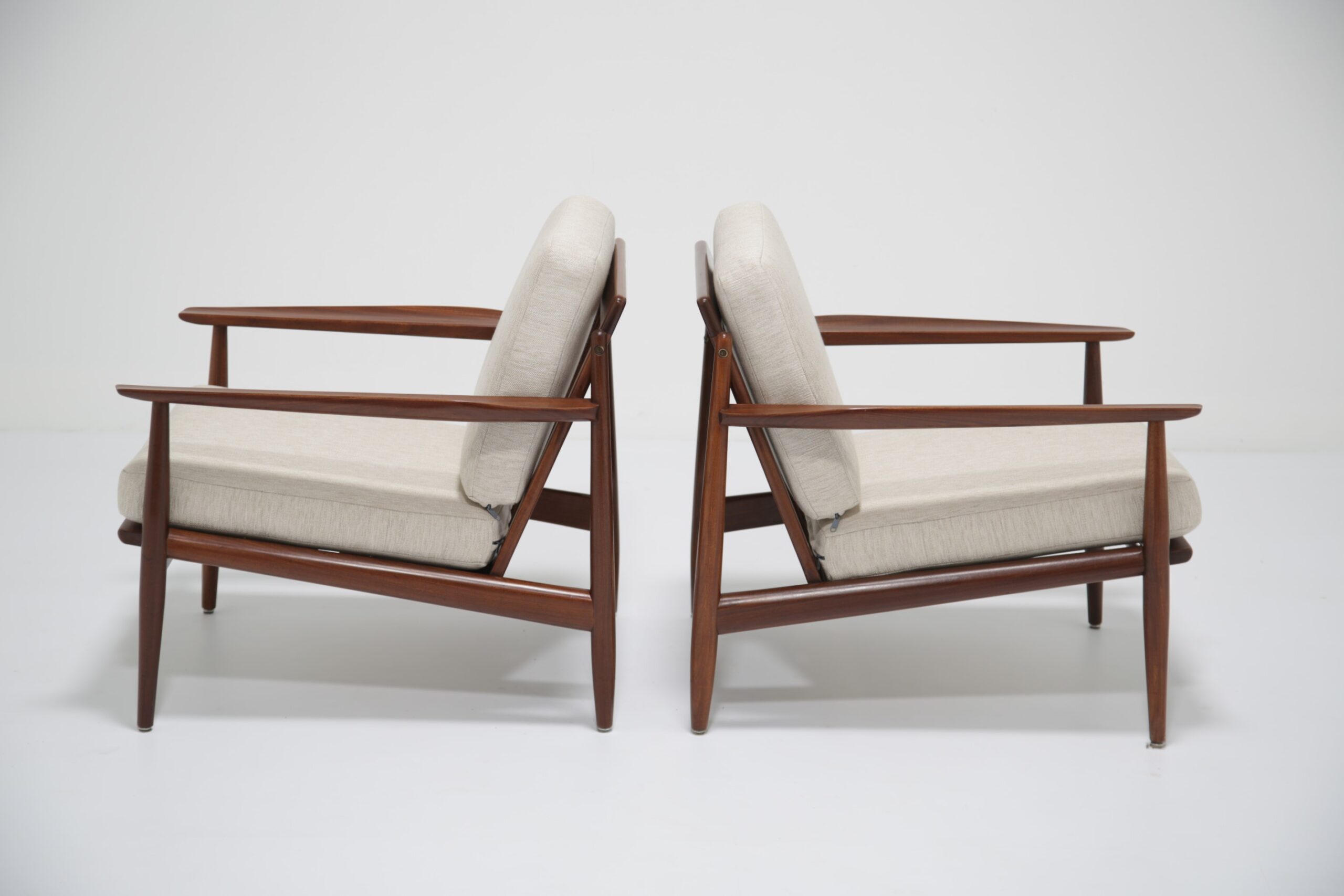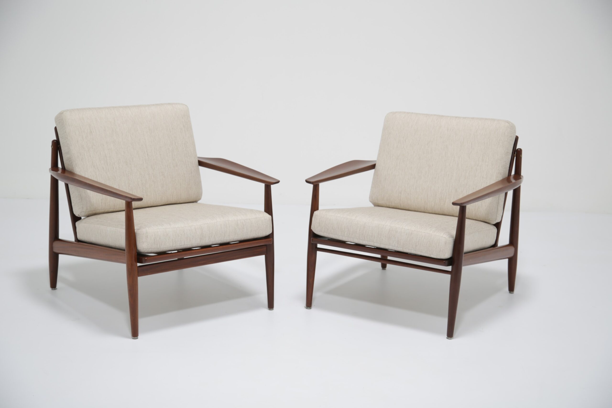 Vintage Danish Teak Lounge Chairs by Arne Vodder for Glostrup Mobelfabrik – Beautifully restored and newly upholstered in a lovely oatmeal fabric. These chairs are comfortable and packs a punch in terms of style and overall design. They are manufactured in teak, with beautifully curved arms, with organic lines, tapering legs and a slatted back configuration. Designed by the renowned Danish designer Arne Vodder for Glostrup in the 1950s.