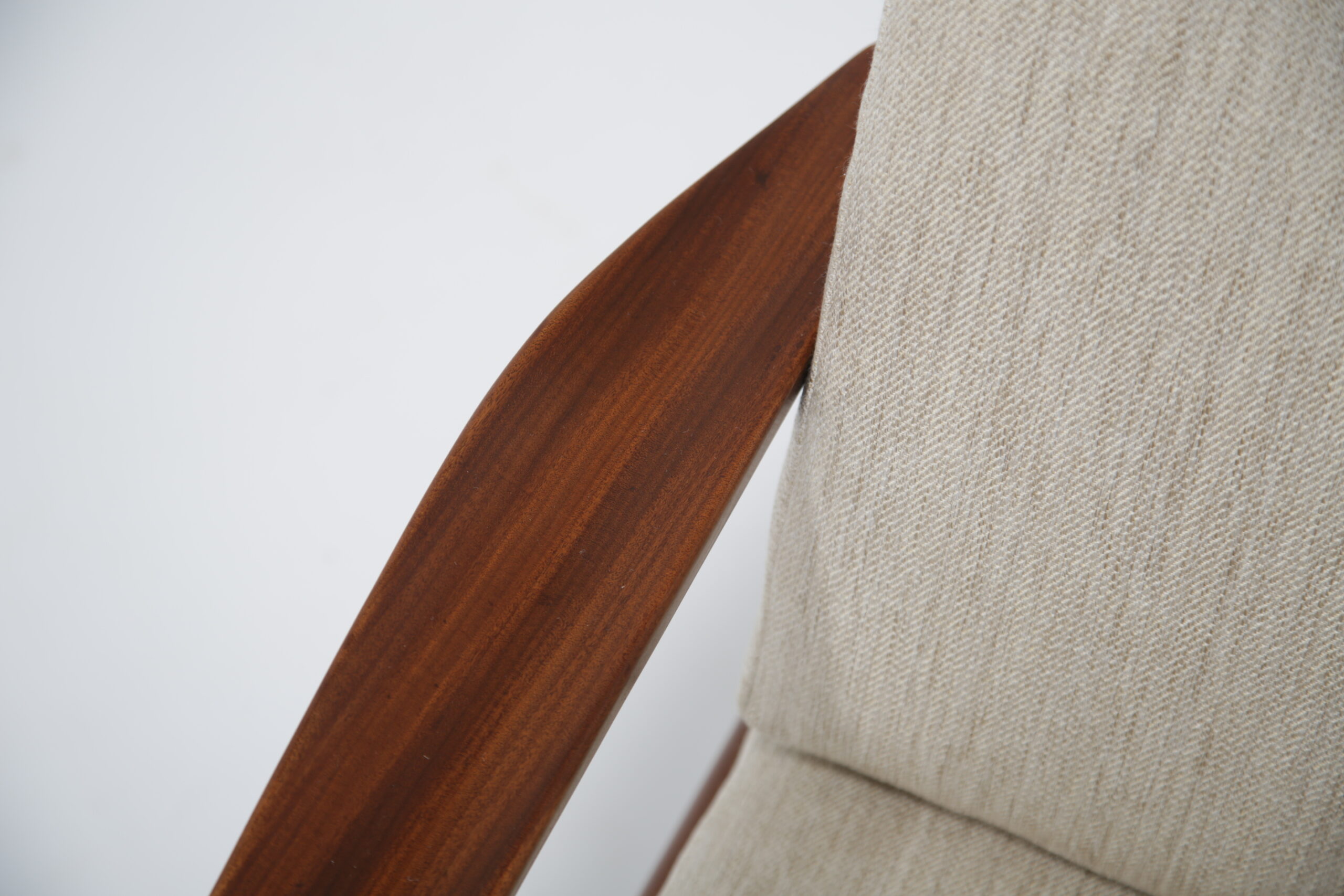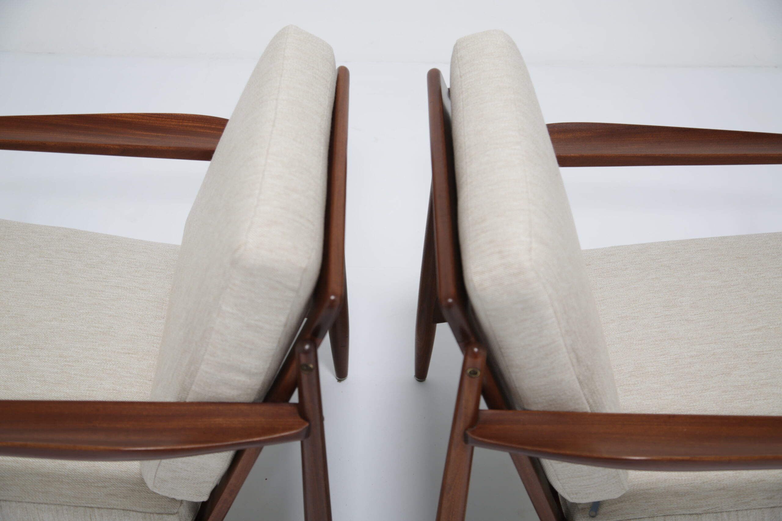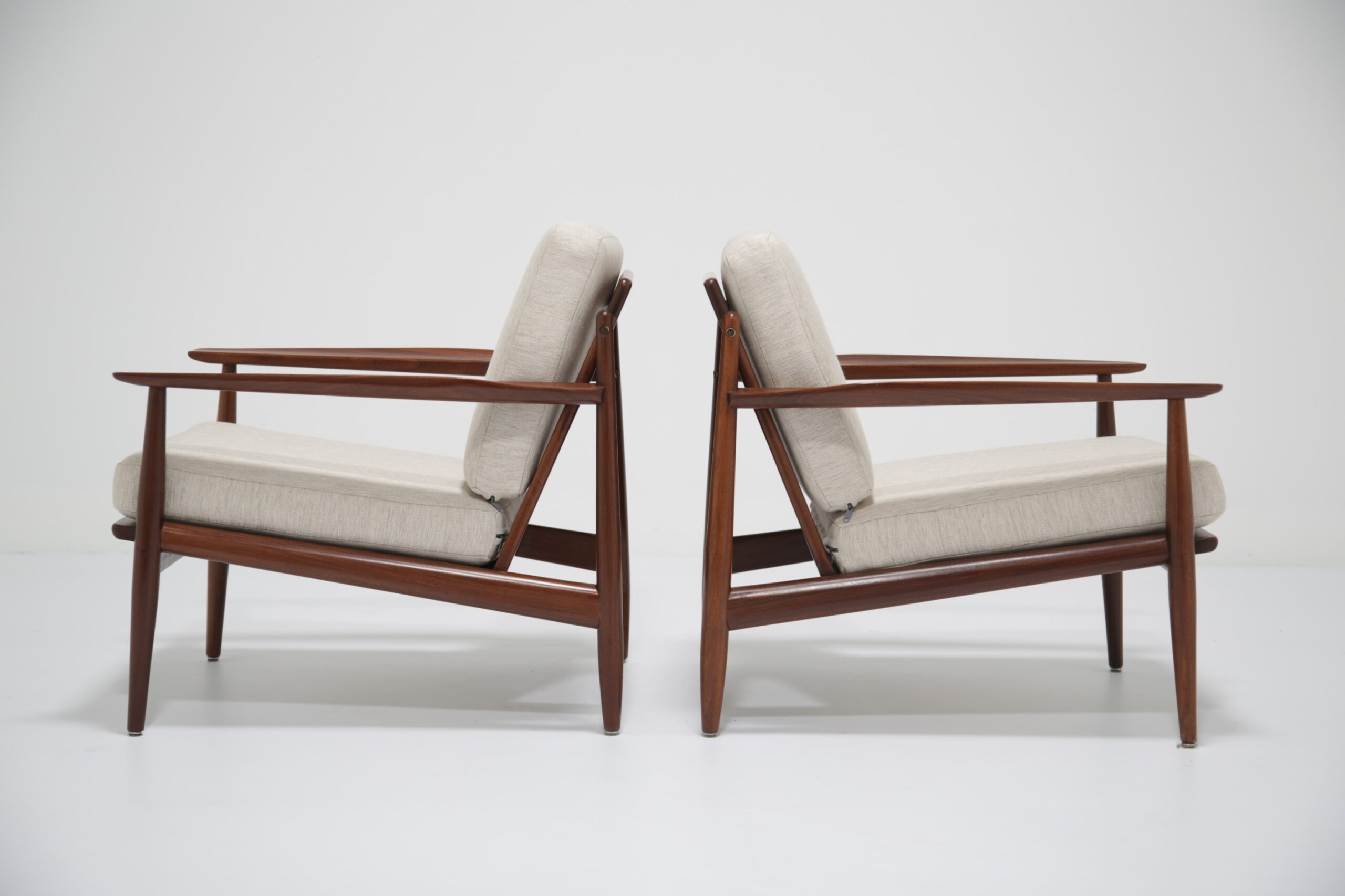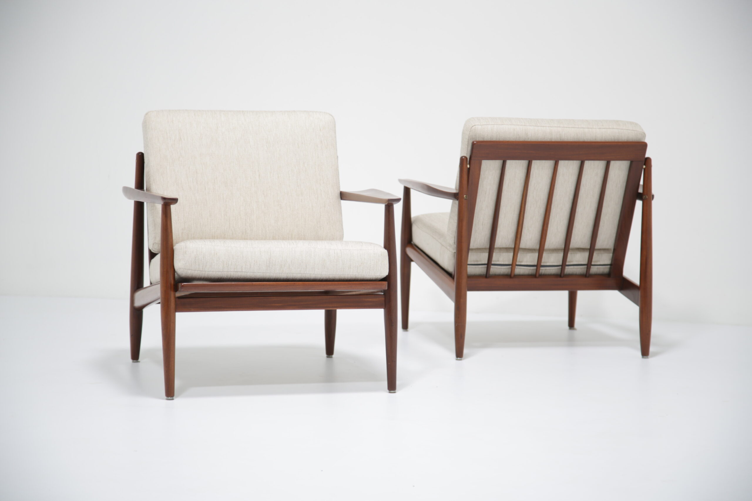 Vintage Danish Teak Lounge Chairs by Arne Vodder for Glostrup Mobelfabrik – Beautifully restored and newly upholstered in a lovely oatmeal fabric. These chairs are comfortable and packs a punch in terms of style and overall design. They are manufactured in teak, with beautifully curved arms, with organic lines, tapering legs and a slatted back configuration. Designed by the renowned Danish designer Arne Vodder for Glostrup in the 1950s.