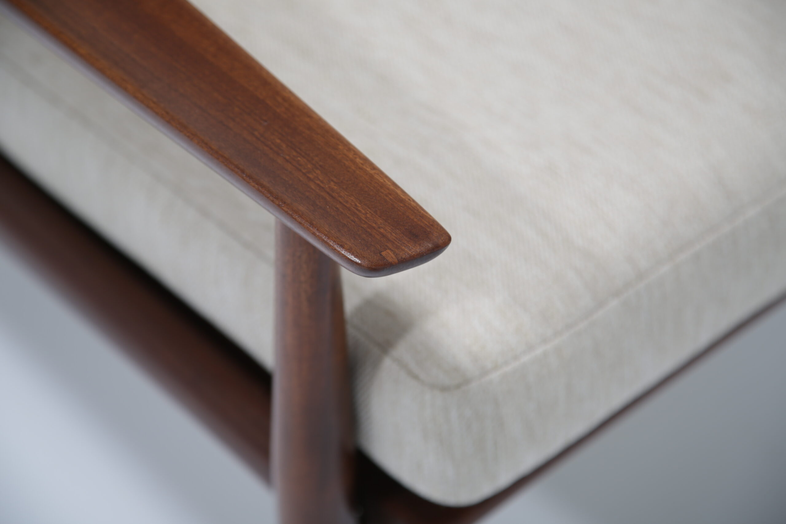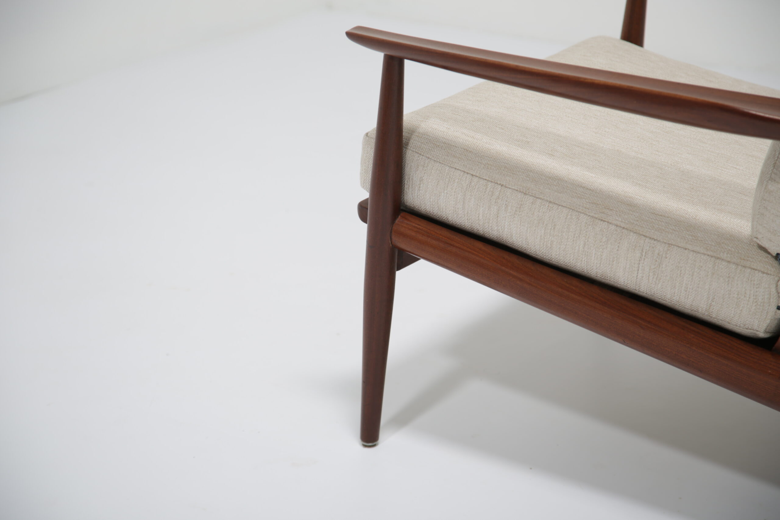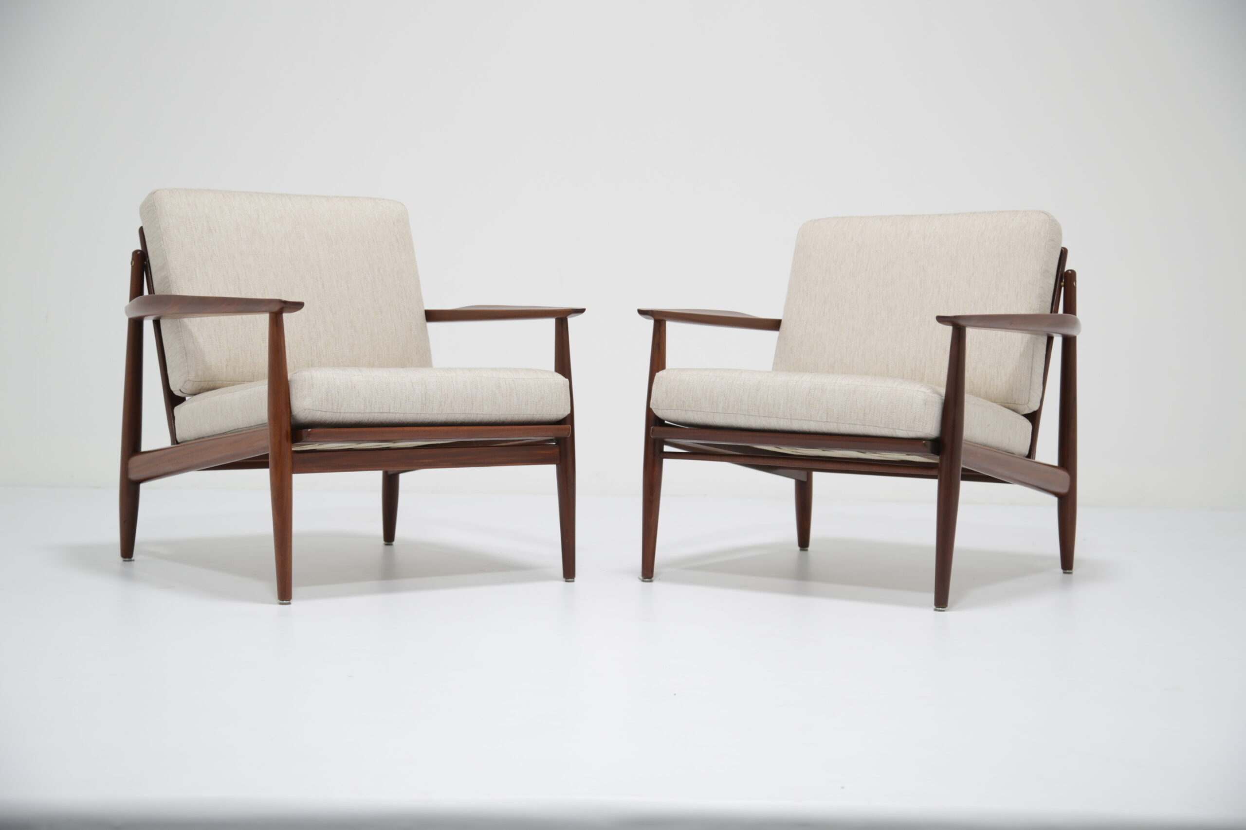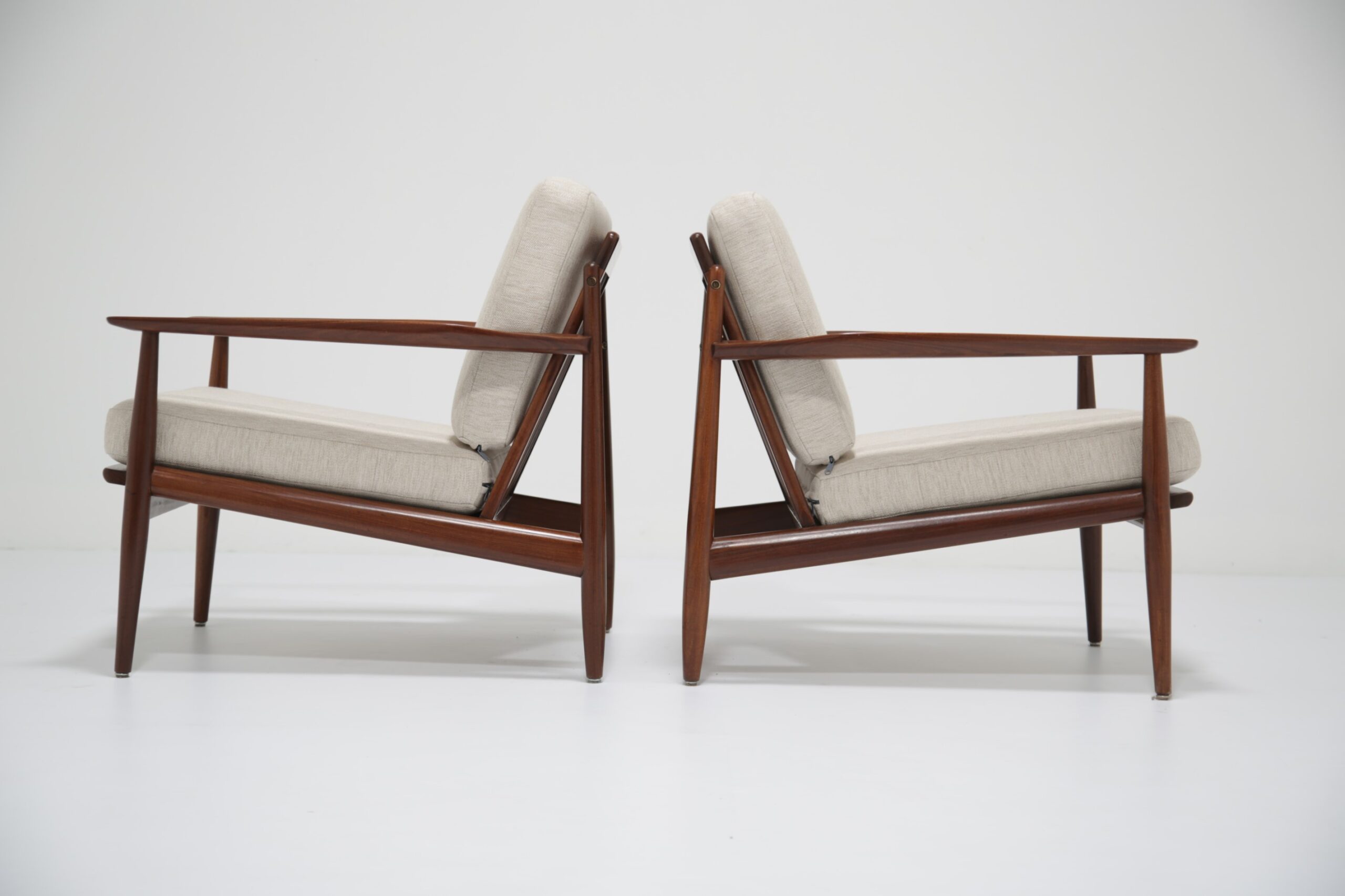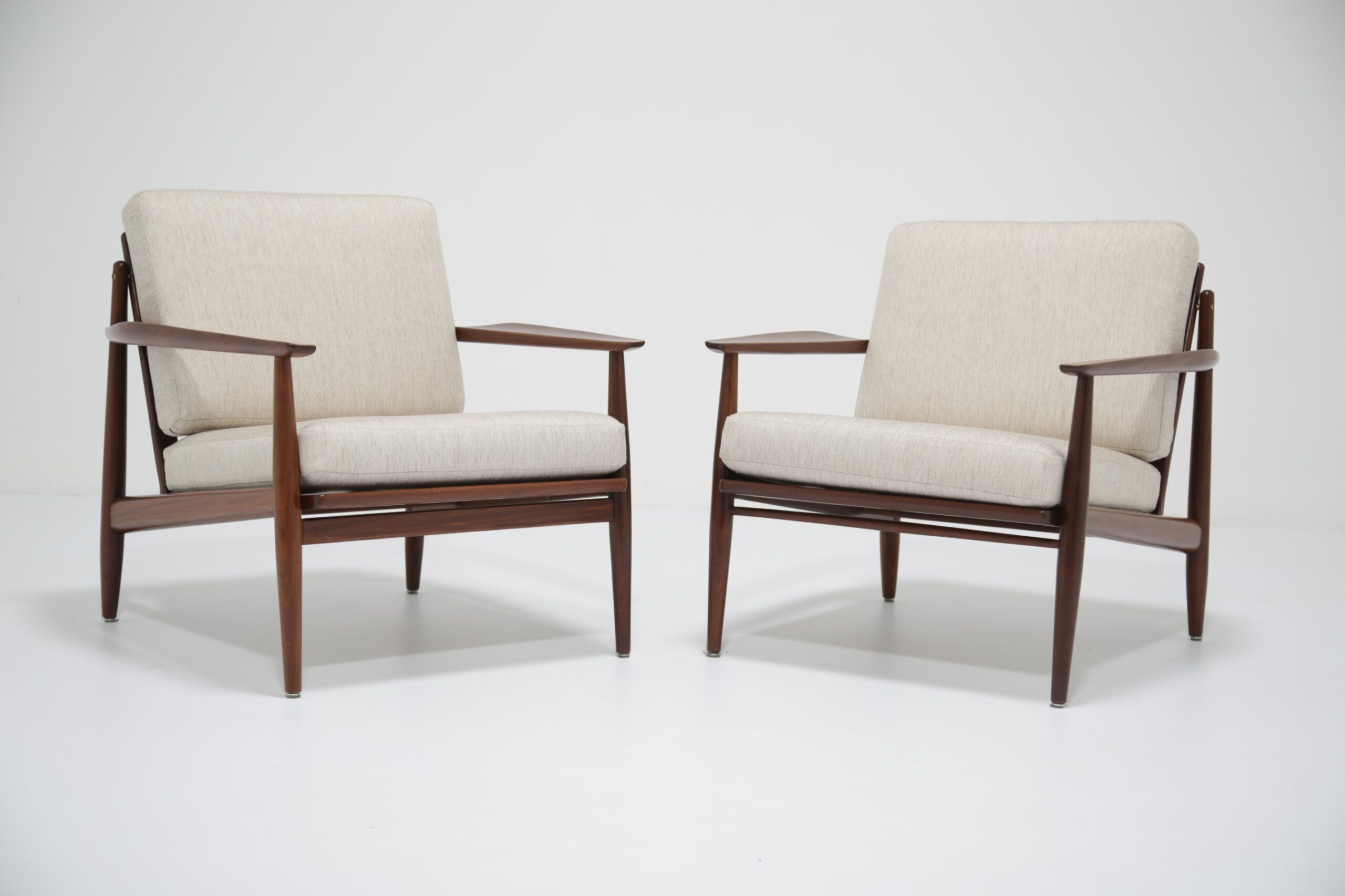Vintage Danish Teak Lounge Chairs by Arne Vodder for Glostrup Mobelfabrik – Beautifully restored and newly upholstered in a lovely oatmeal fabric. These chairs are comfortable and packs a punch in terms of style and overall design. They are manufactured in teak, with beautifully curved arms, with organic lines, tapering legs and a slatted back configuration. Designed by the renowned Danish designer Arne Vodder for Glostrup in the 1950s.