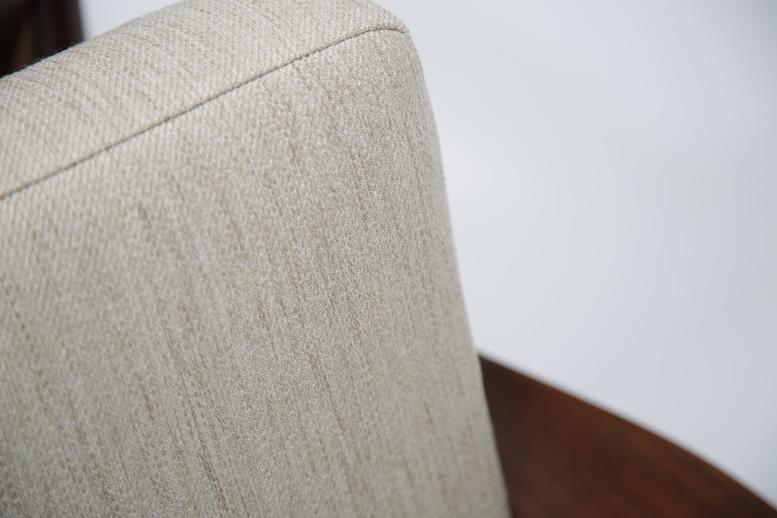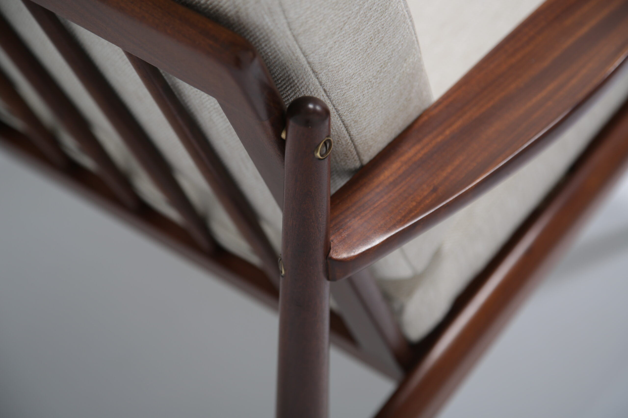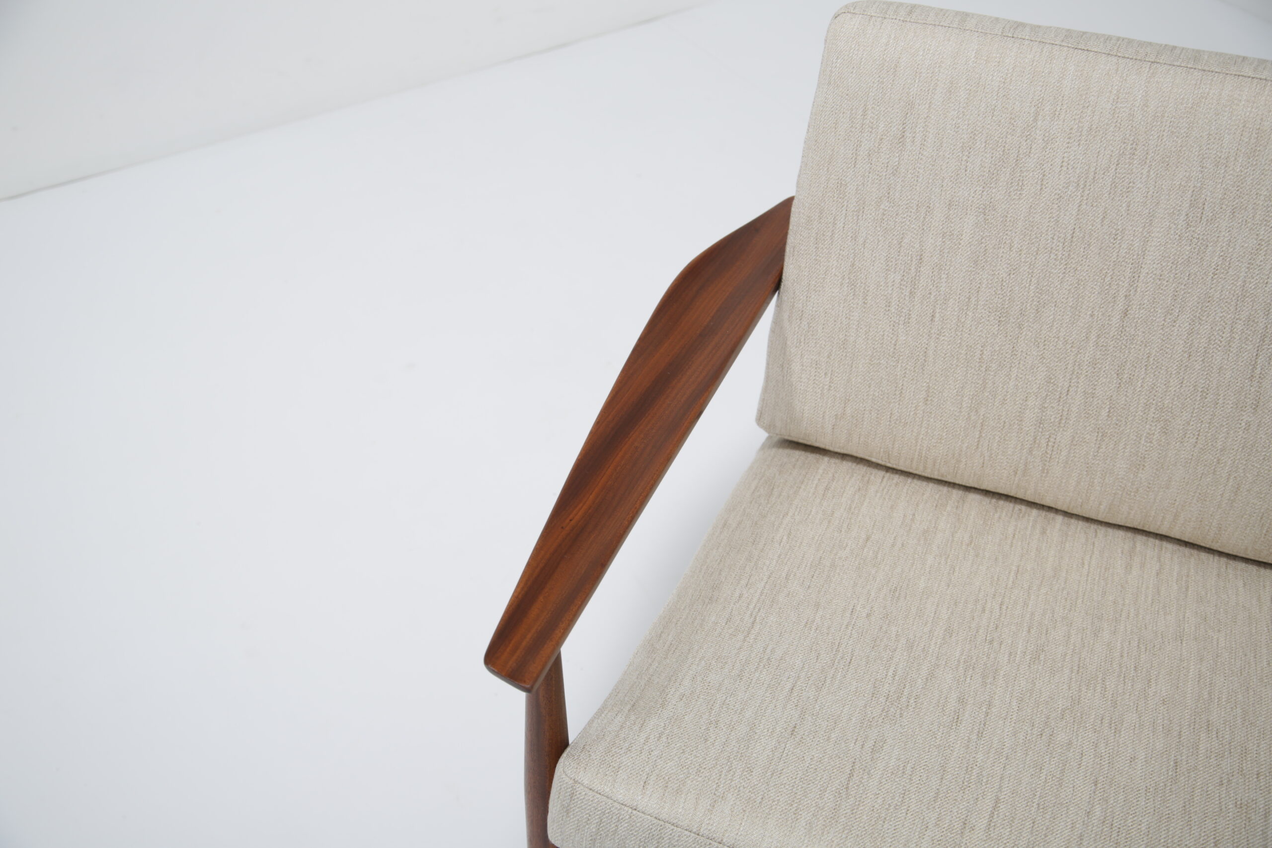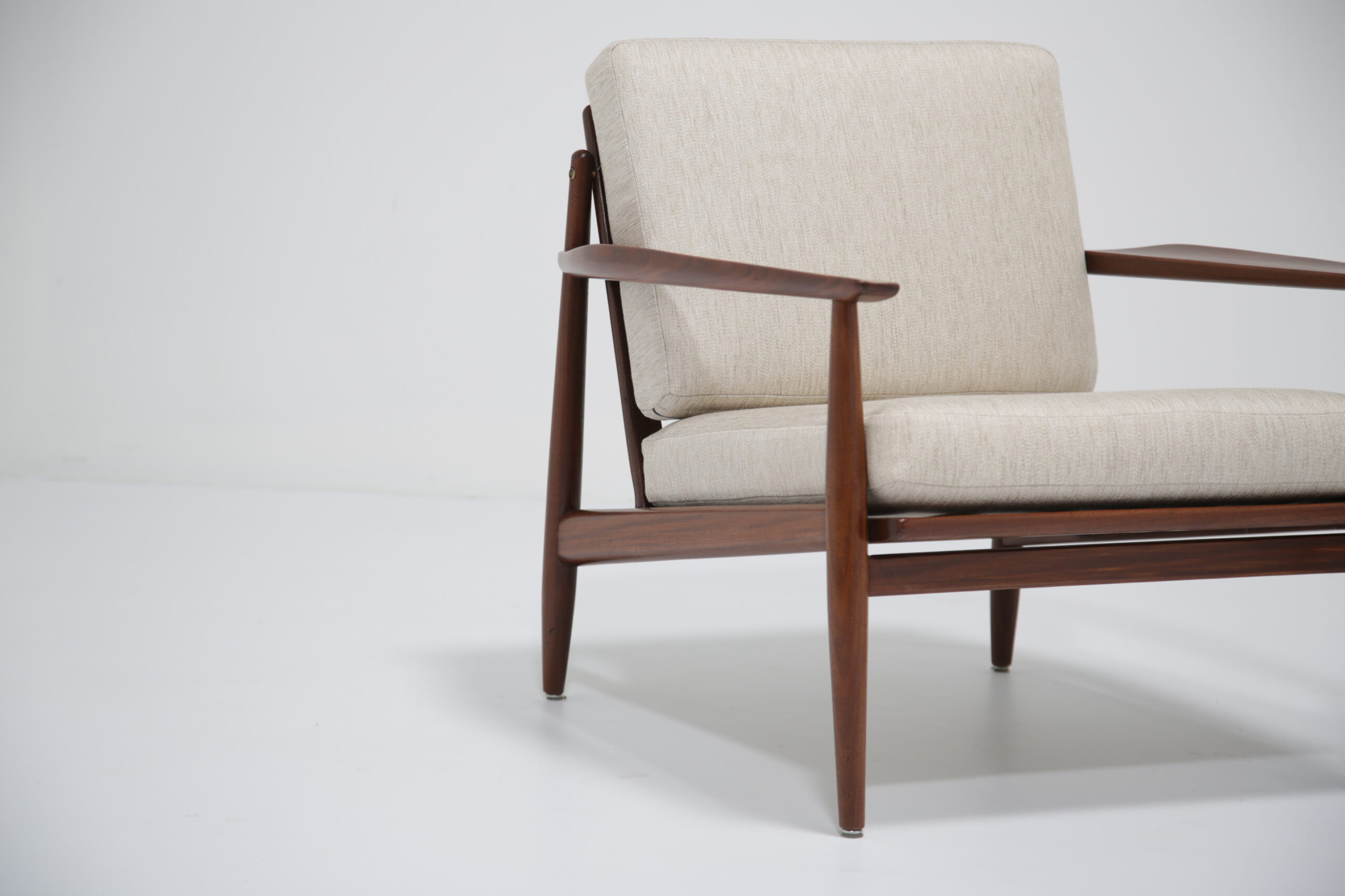 Vintage Danish Teak Lounge Chairs by Arne Vodder for Glostrup Mobelfabrik – Beautifully restored and newly upholstered in a lovely oatmeal fabric. These chairs are comfortable and packs a punch in terms of style and overall design. They are manufactured in teak, with beautifully curved arms, with organic lines, tapering legs and a slatted back configuration. Designed by the renowned Danish designer Arne Vodder for Glostrup in the 1950s.