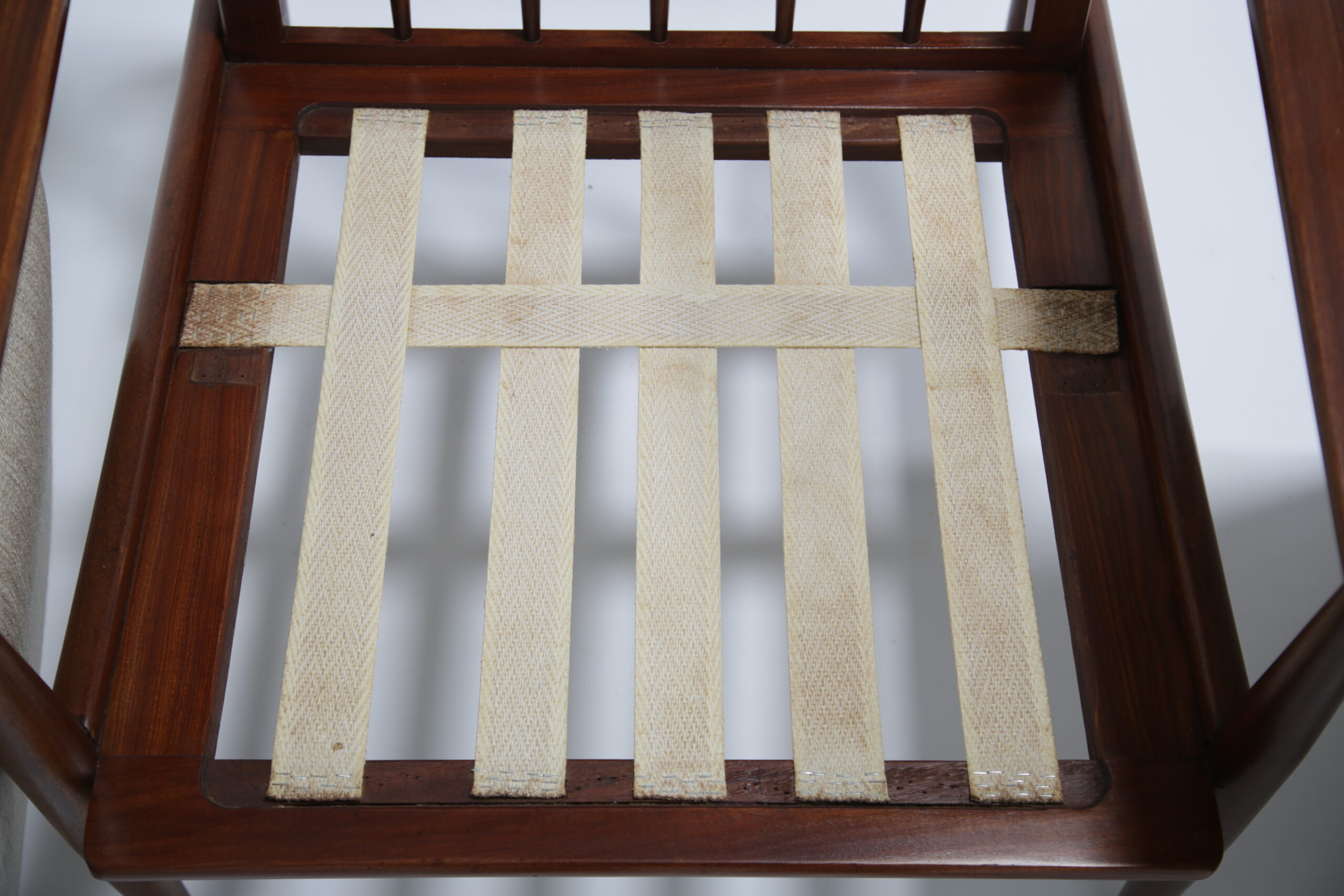 The frames have been fully restored which includes stripping the old varnish, gluing the joints and sanding any imperfections for a smooth polish. The upholstery is modern, durable and we have also changed the foam.
