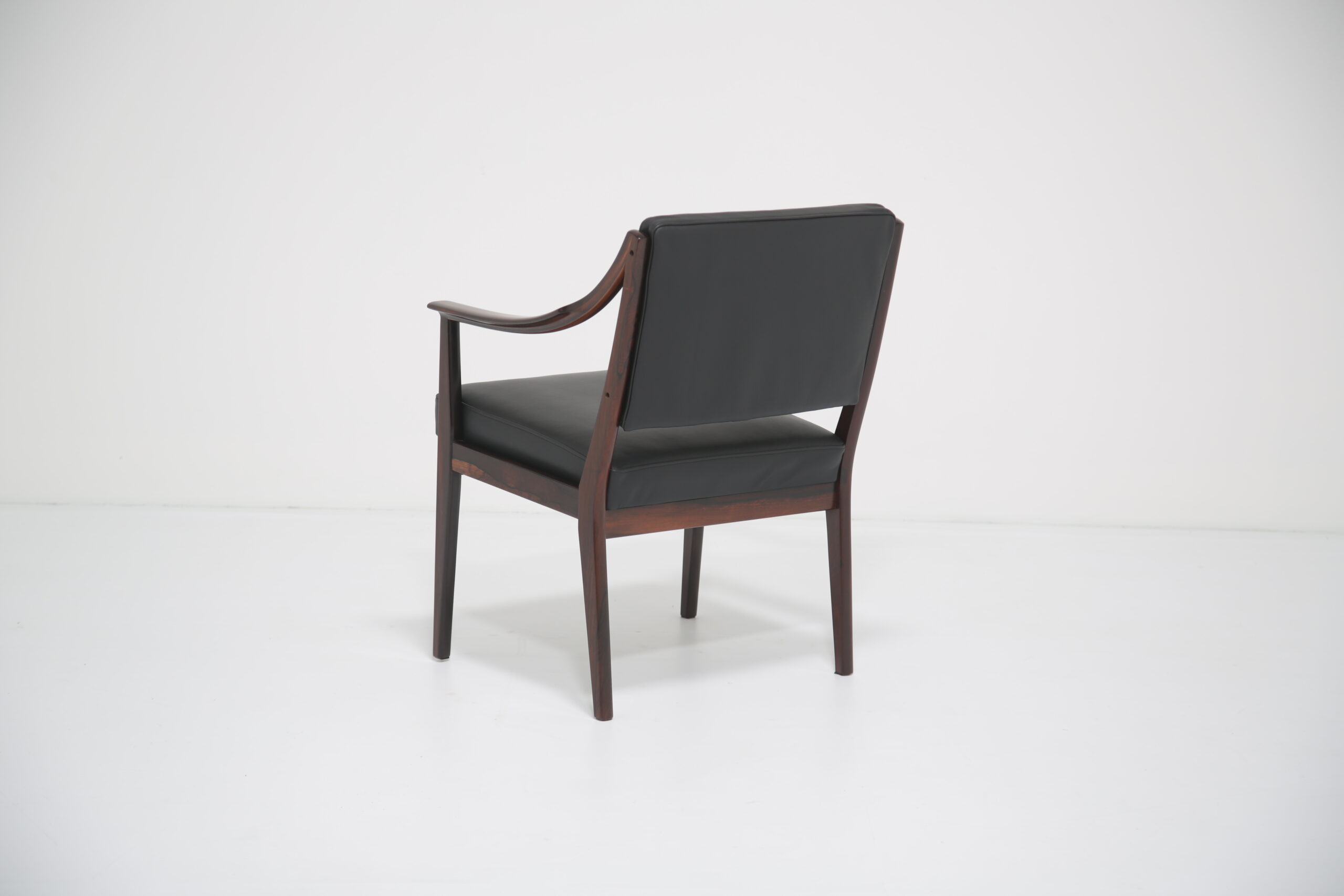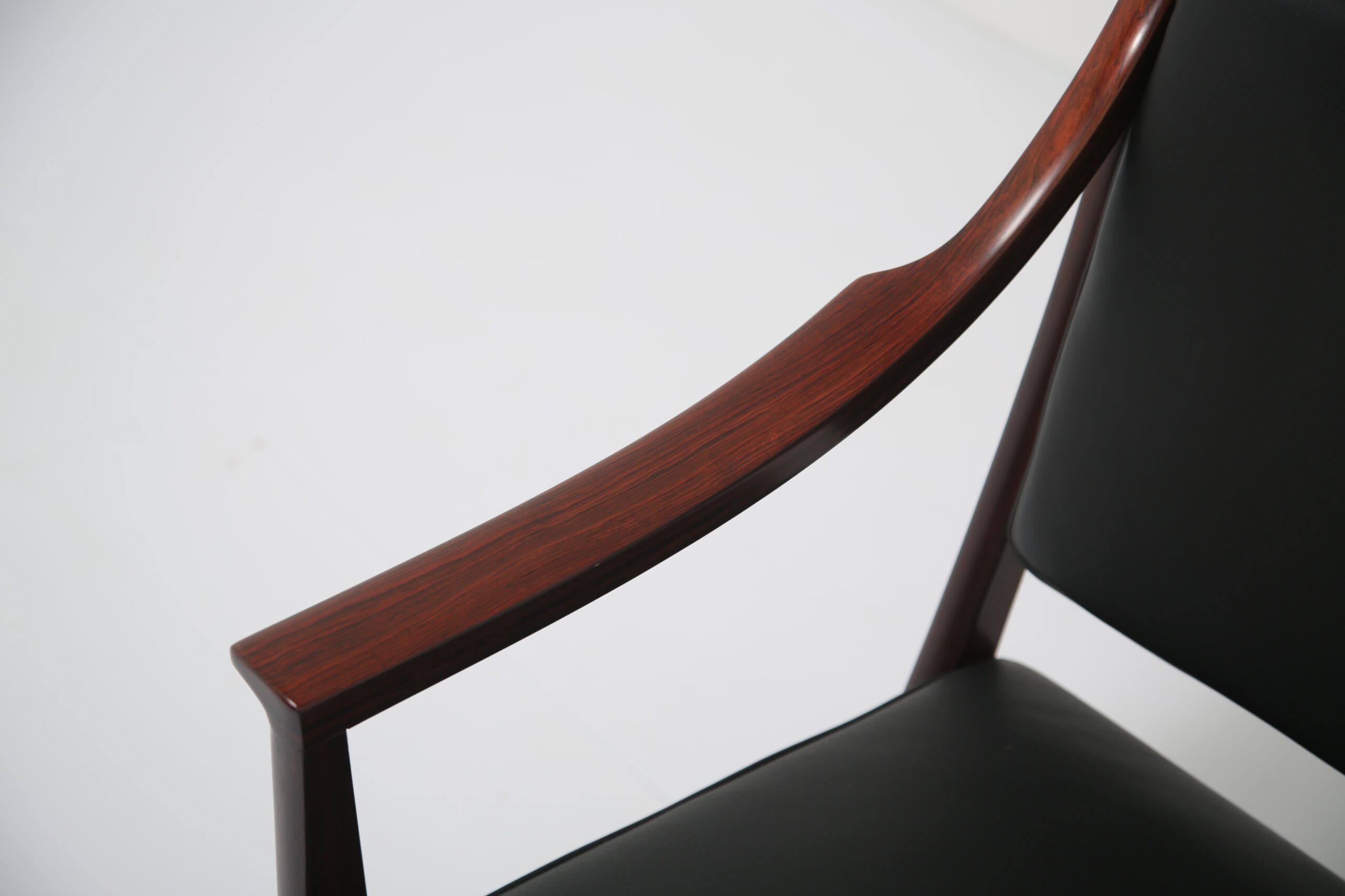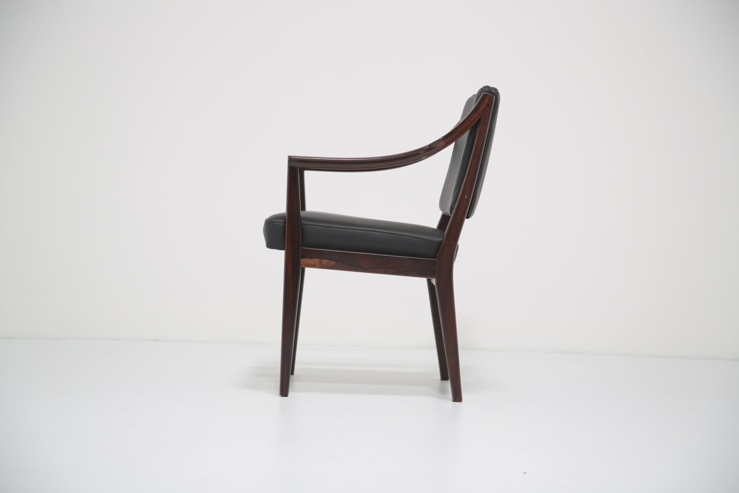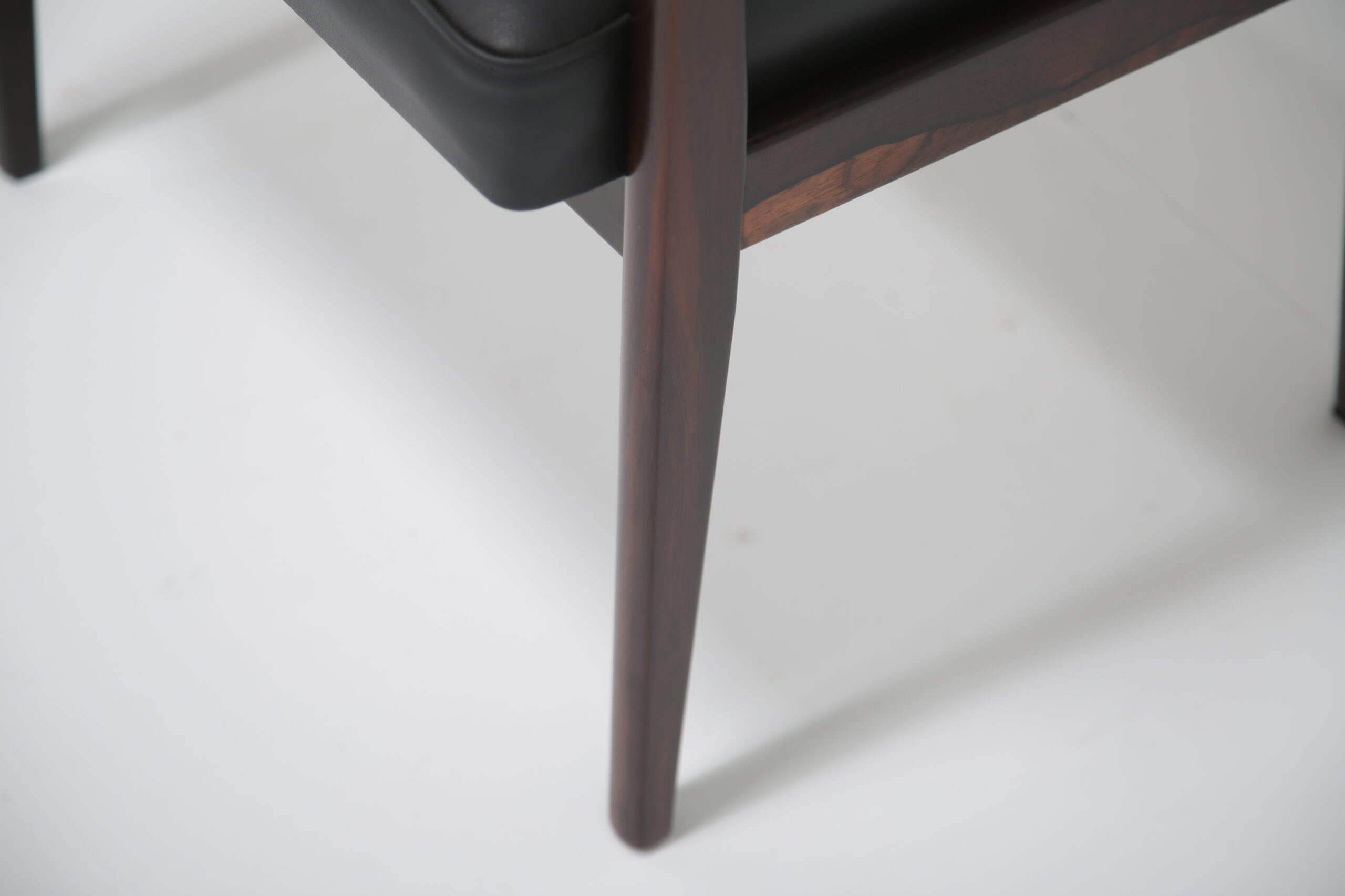 Designed by Swedish modernist Karl Erik Ekselius for JOC Vetlanda in the 1960s, this refined rosewood armchair exemplifies Scandinavian elegance and precision craftsmanship. The frame features beautifully sculpted armrests that flow seamlessly into the backrest, highlighting the designer’s mastery of organic lines and delicate curvature. The solid rosewood showcases deep tonal richness and striking natural grain, while the clean, architectural silhouette ensures the chair is visually light yet robust in structure. Newly upholstered in a high-grade black leather, the seat and back cushions provide a sleek, tailored finish that complements the warmth of the timber. A perfect fusion of comfort, restraint and luxury, this is a quintessential mid-century Scandinavian design.