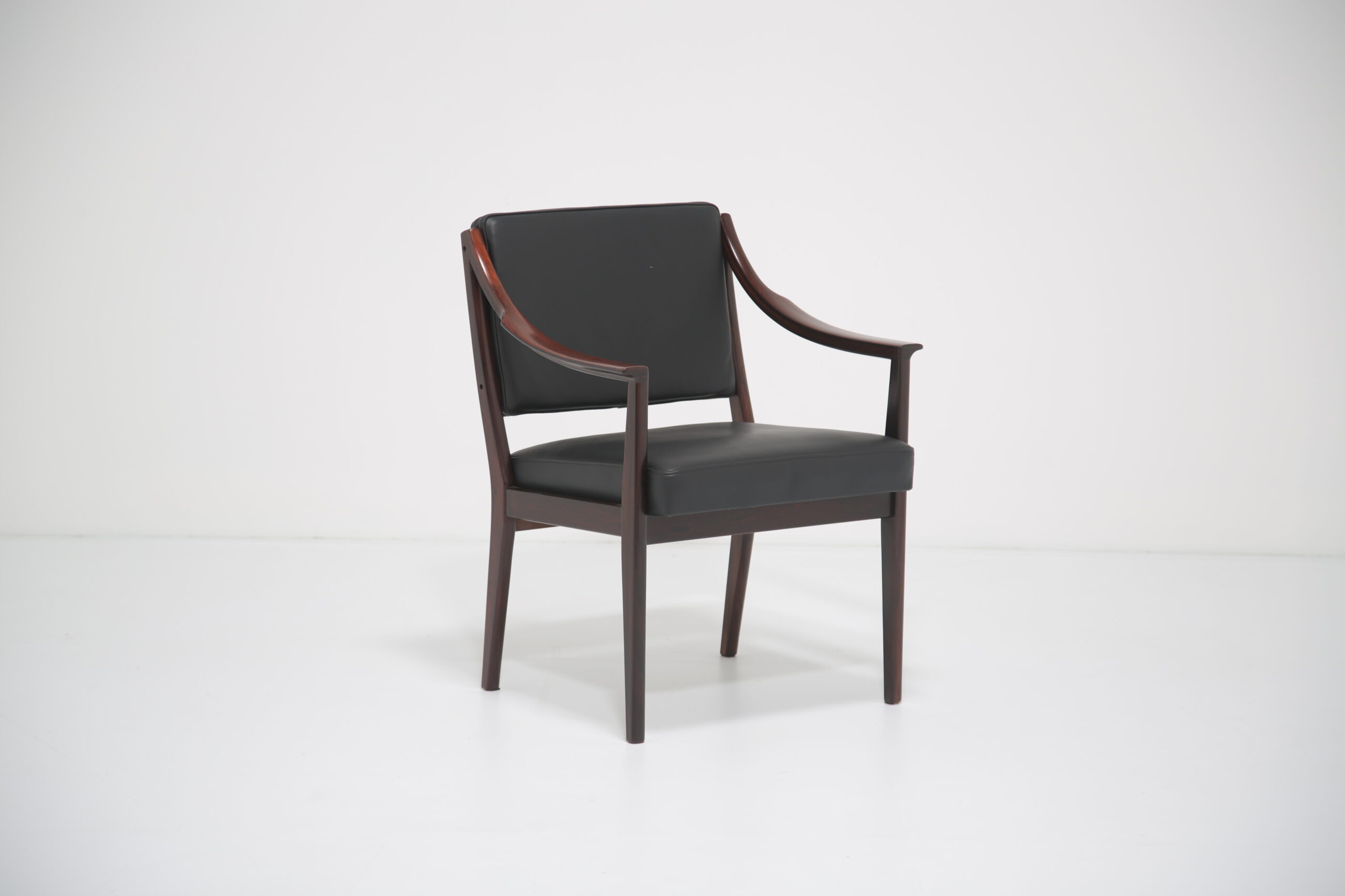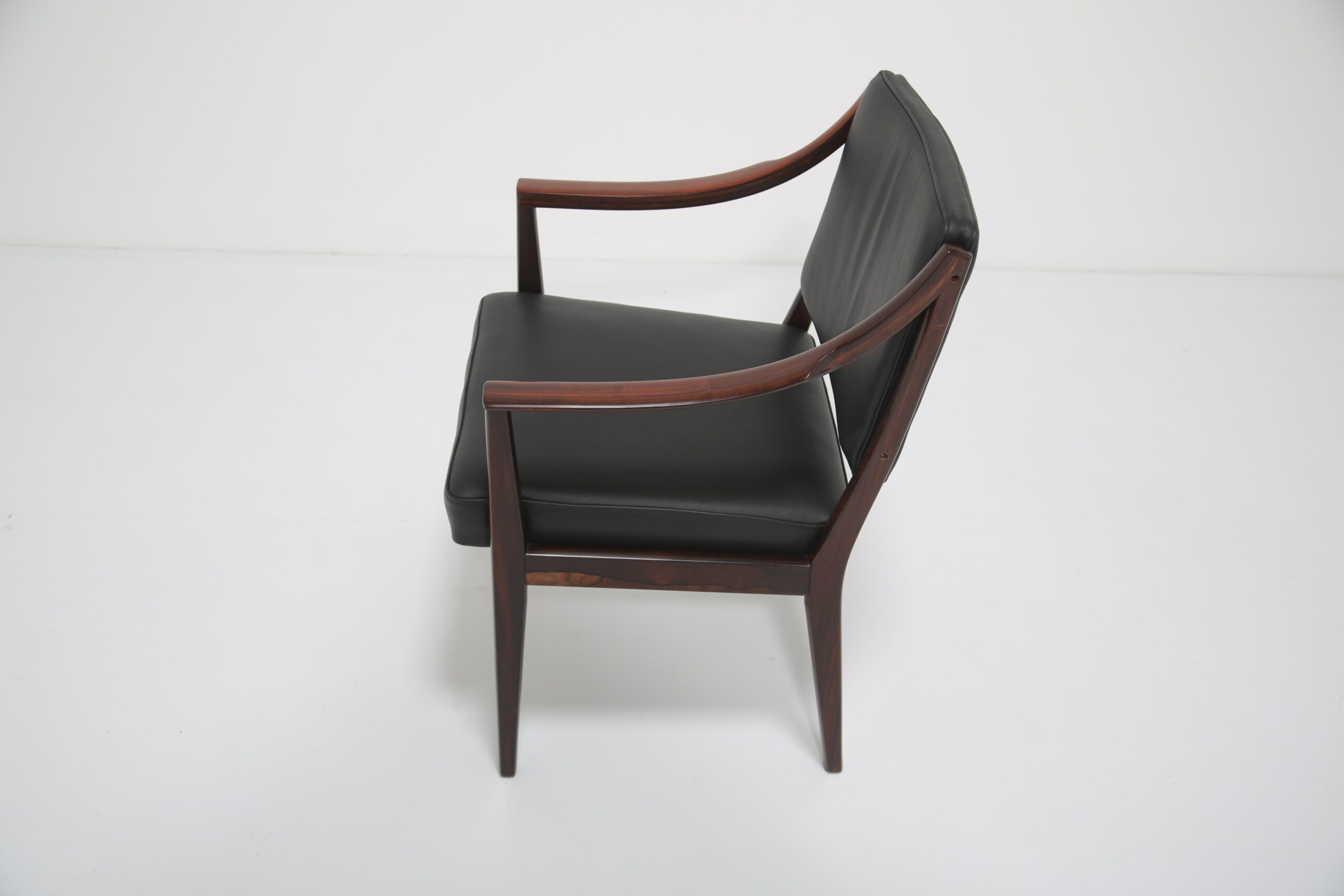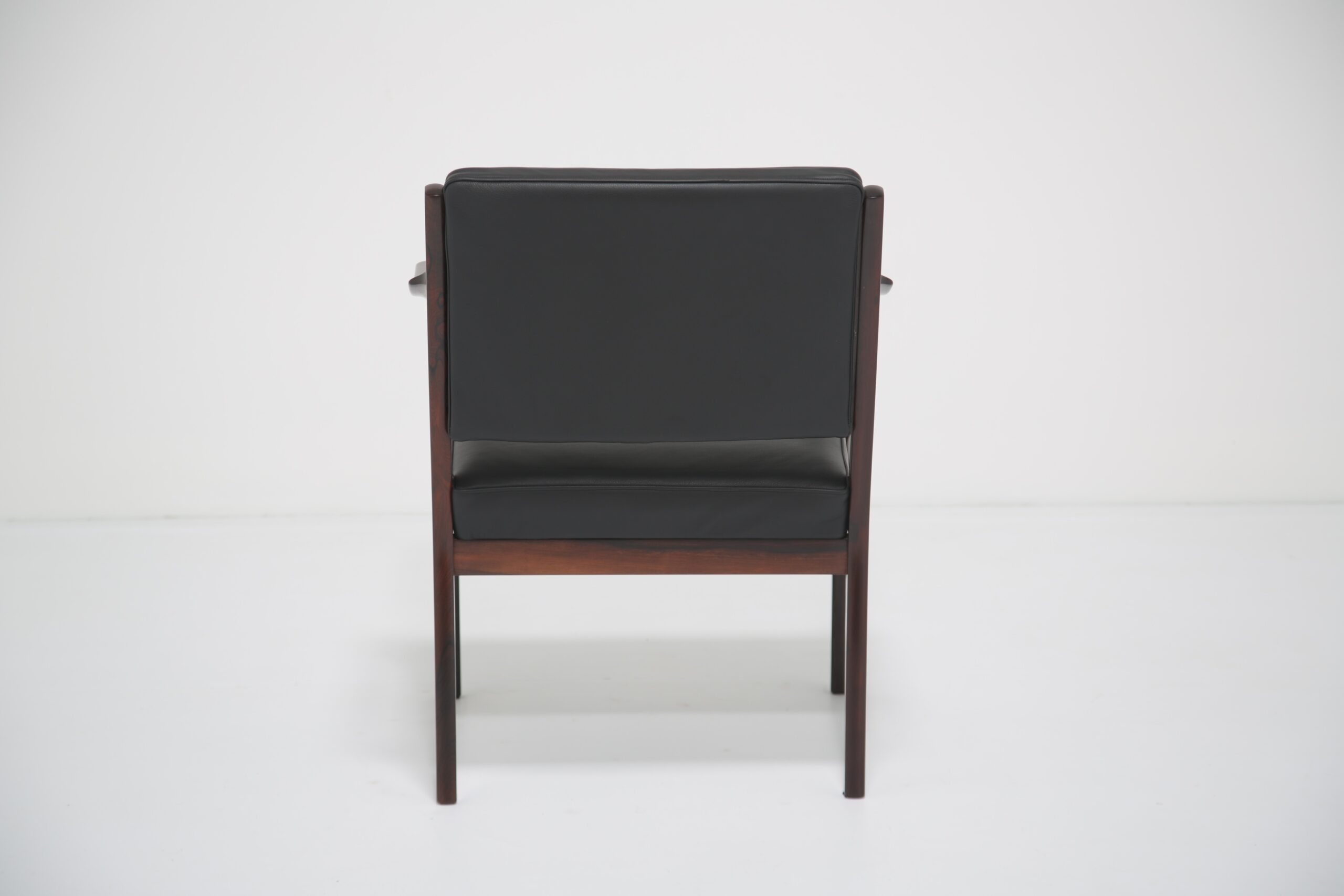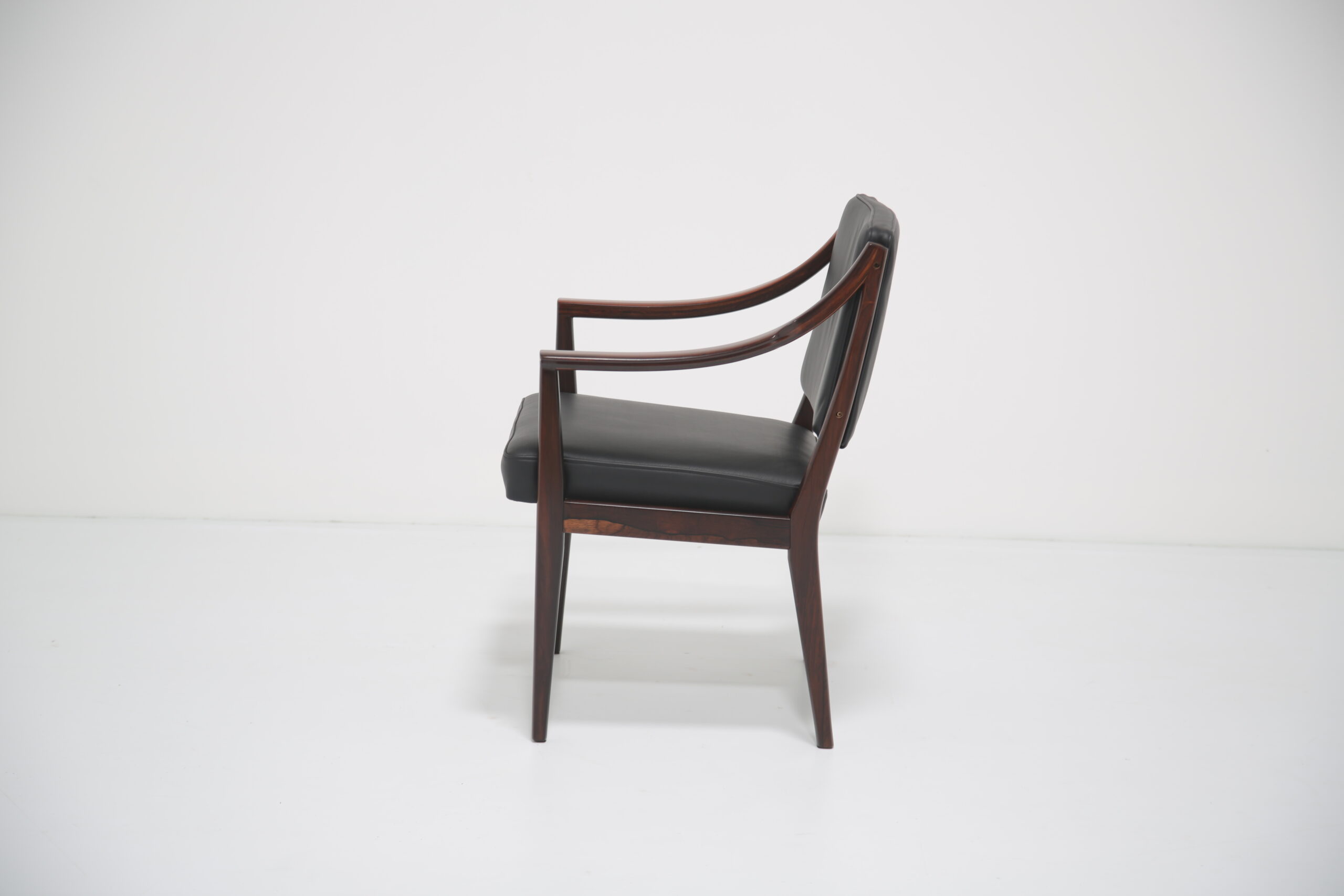 Designed by Swedish modernist Karl Erik Ekselius for JOC Vetlanda in the 1960s, this refined rosewood armchair exemplifies Scandinavian elegance and precision craftsmanship. The frame features beautifully sculpted armrests that flow seamlessly into the backrest, highlighting the designer’s mastery of organic lines and delicate curvature. The solid rosewood showcases deep tonal richness and striking natural grain, while the clean, architectural silhouette ensures the chair is visually light yet robust in structure. Newly upholstered in a high-grade black leather, the seat and back cushions provide a sleek, tailored finish that complements the warmth of the timber. A perfect fusion of comfort, restraint and luxury, this is a quintessential mid-century Scandinavian design.