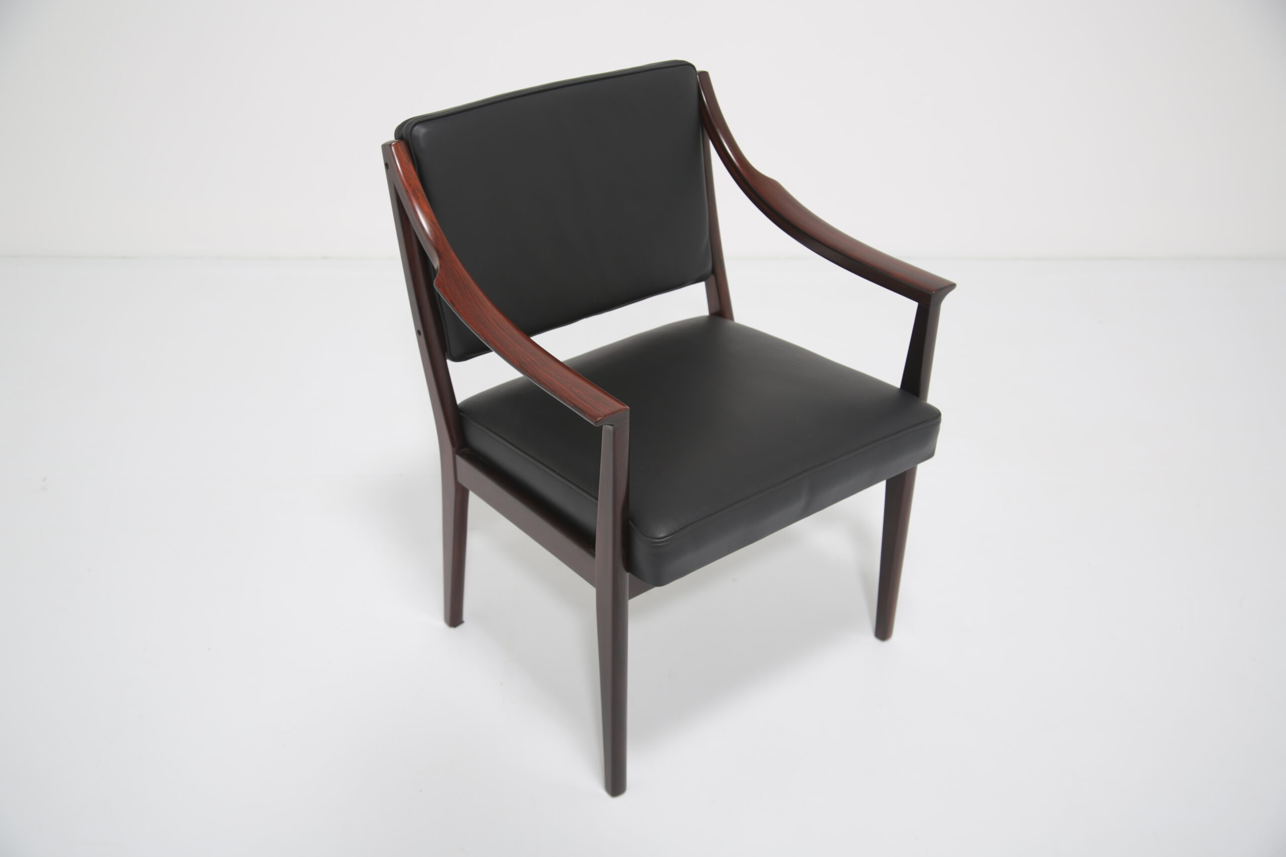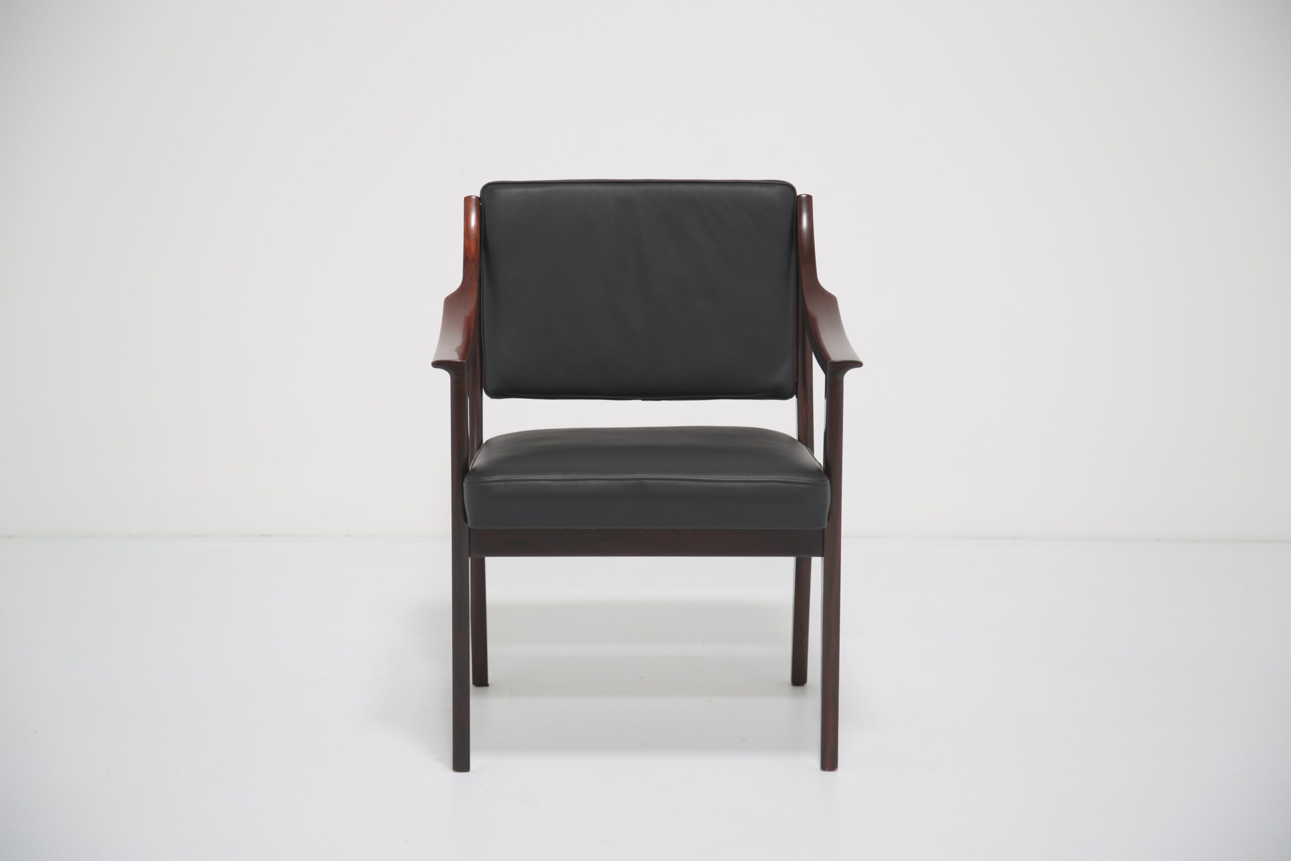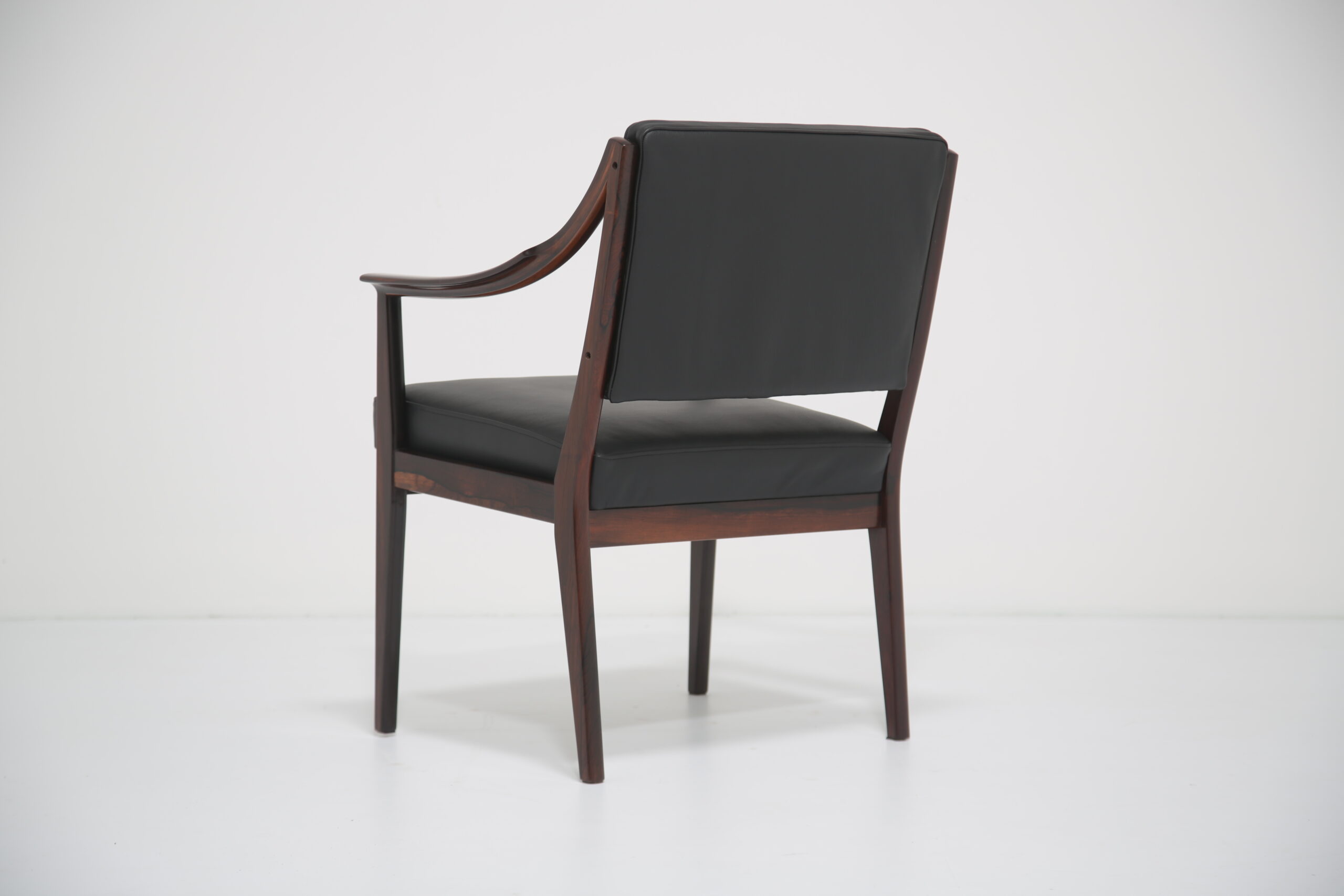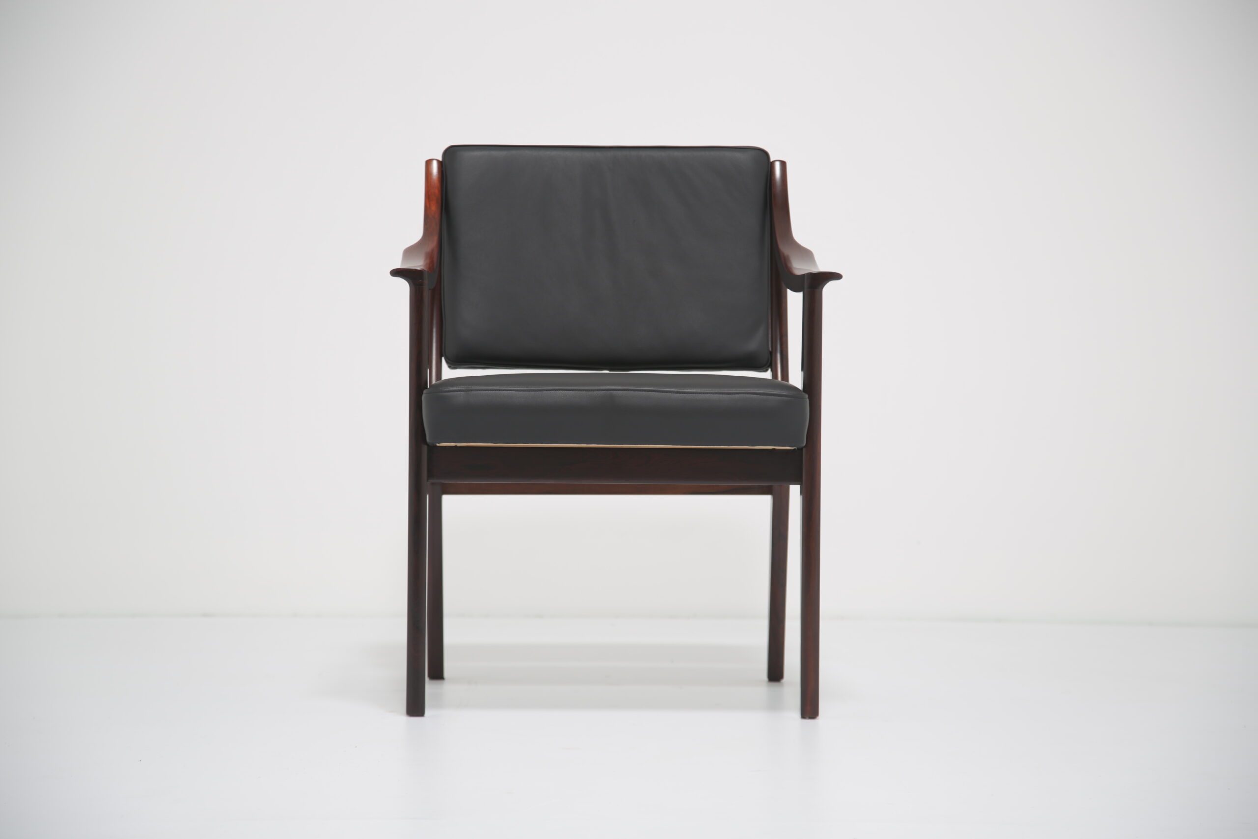 Designed by Swedish modernist Karl Erik Ekselius for JOC Vetlanda in the 1960s, this refined rosewood armchair exemplifies Scandinavian elegance and precision craftsmanship. The frame features beautifully sculpted armrests that flow seamlessly into the backrest, highlighting the designer’s mastery of organic lines and delicate curvature. The solid rosewood showcases deep tonal richness and striking natural grain, while the clean, architectural silhouette ensures the chair is visually light yet robust in structure. Newly upholstered in a high-grade black leather, the seat and back cushions provide a sleek, tailored finish that complements the warmth of the timber. A perfect fusion of comfort, restraint and luxury, this is a quintessential mid-century Scandinavian design.