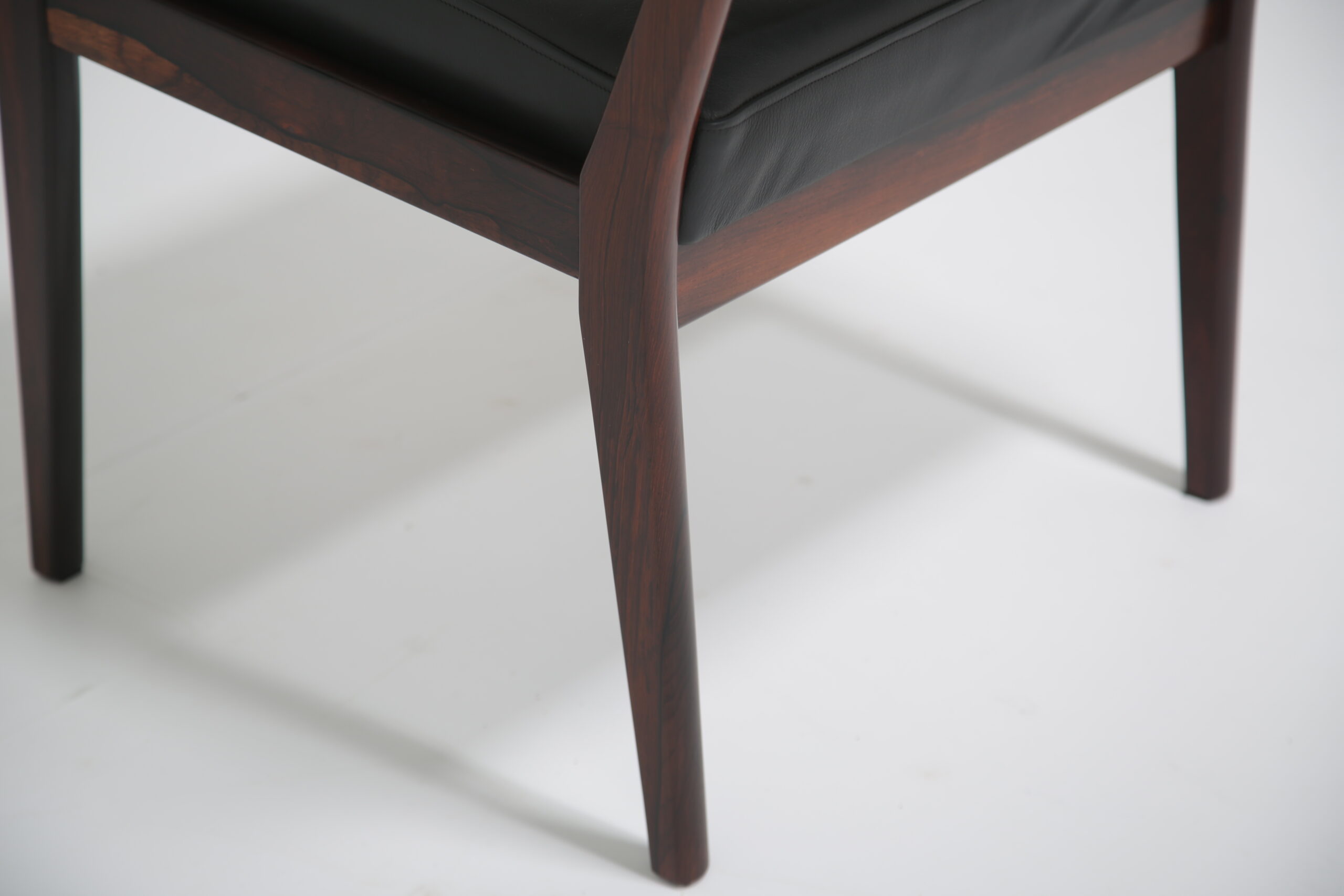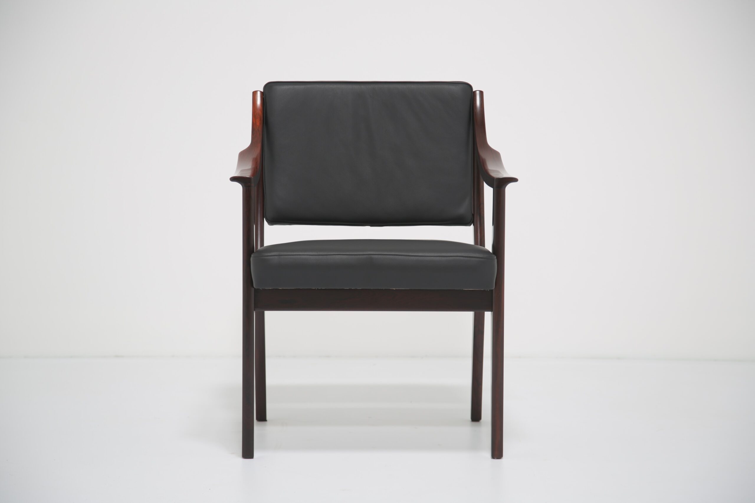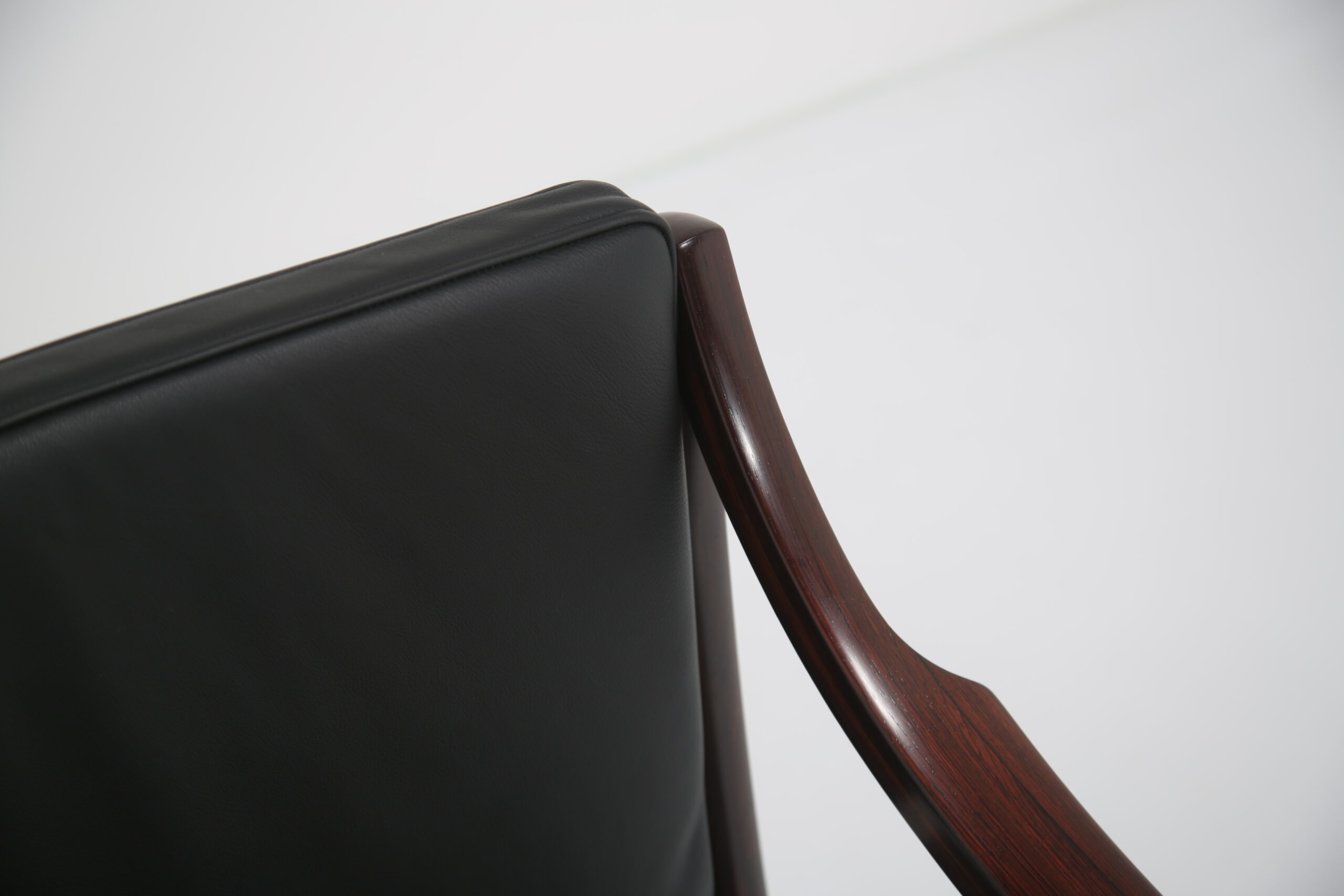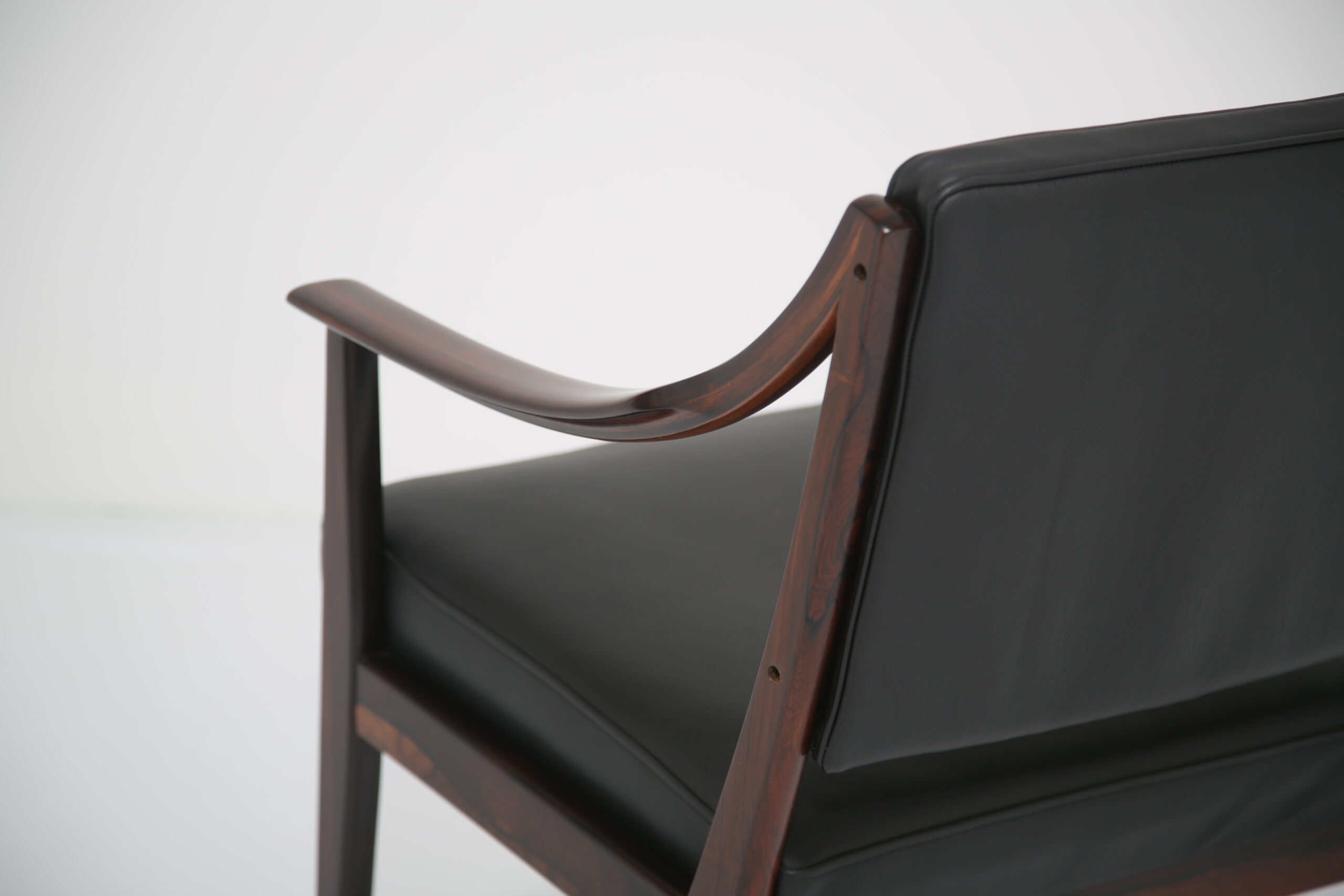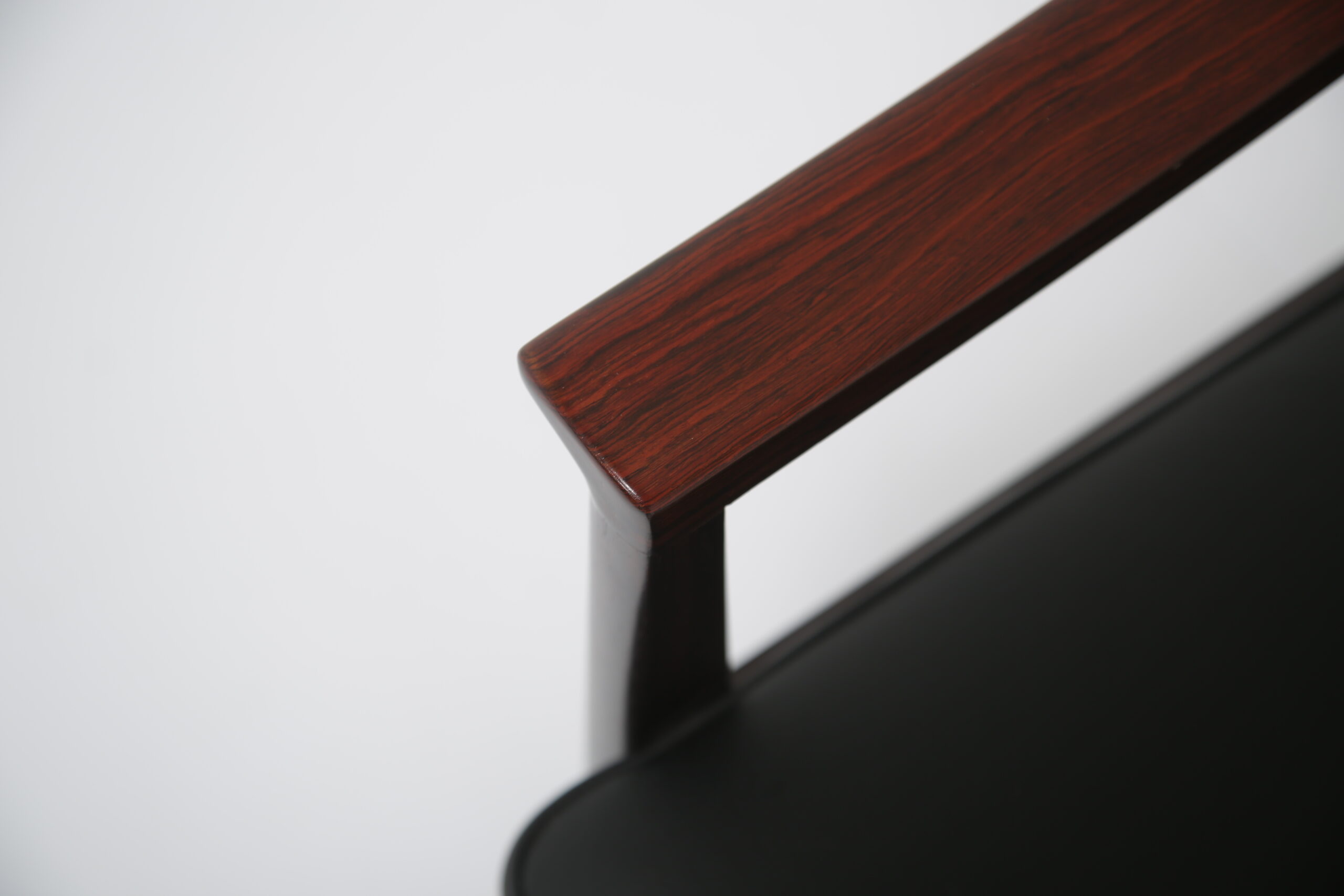 A rare Swedish design by Ekselius showcasing sculptural rosewood and distinctive armrest shaping, elevated by luxurious black leather. A sophisticated and timeless statement piece.