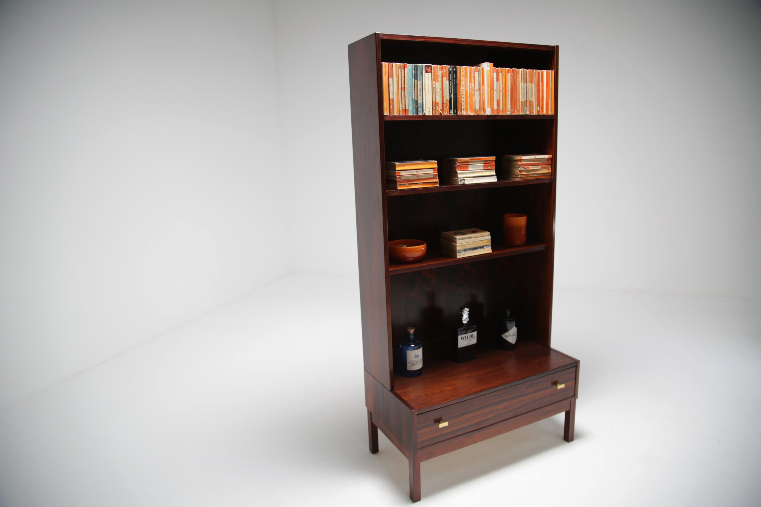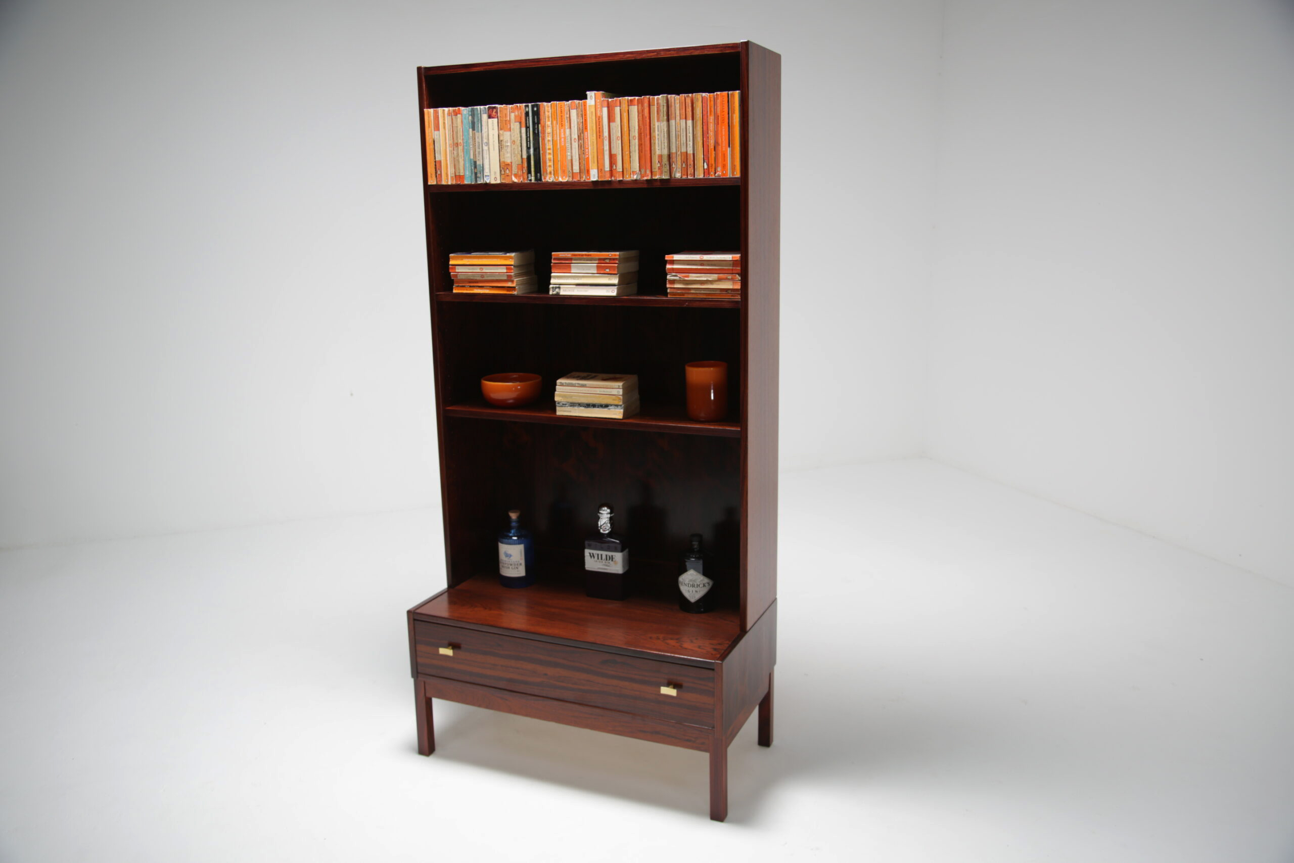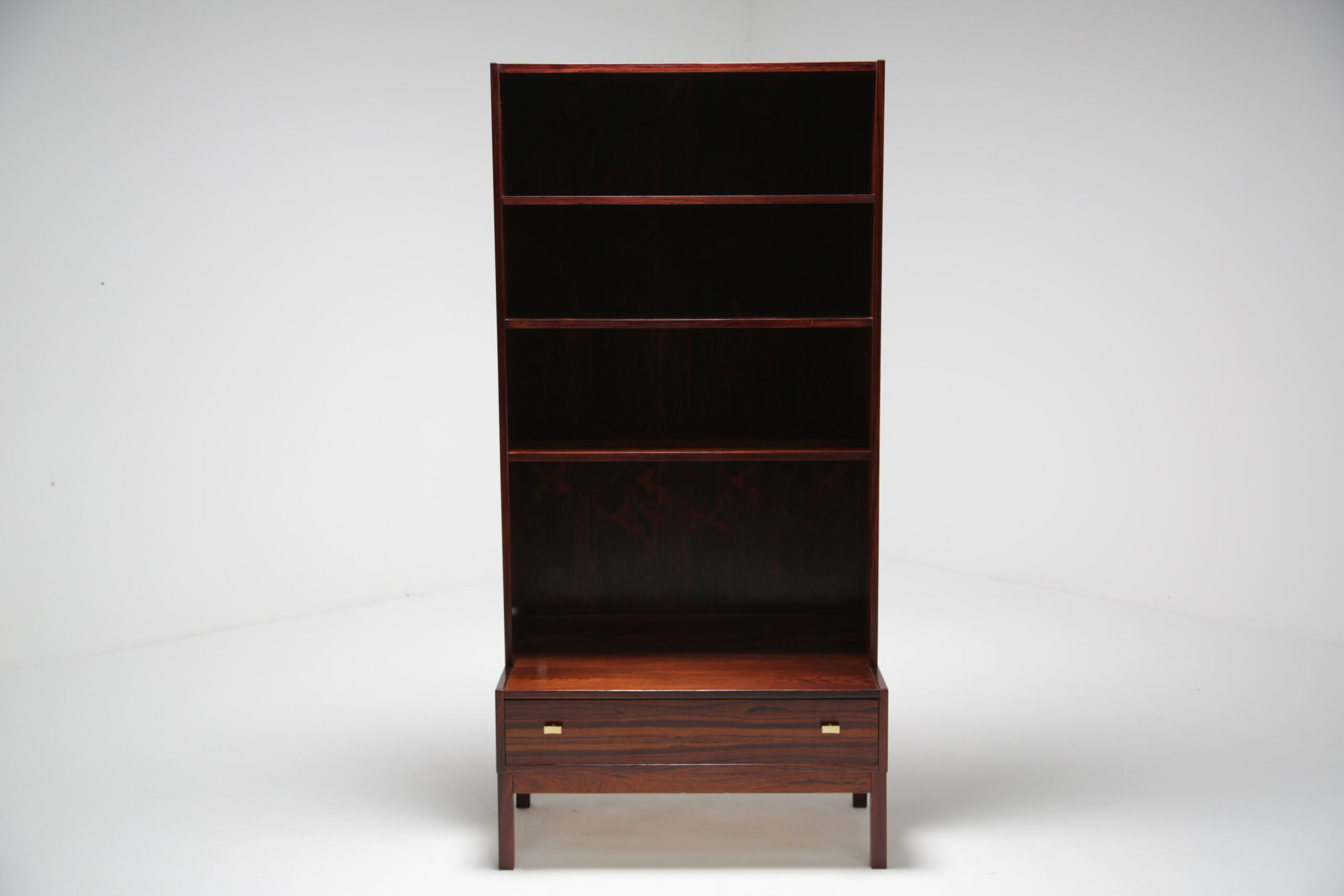 Rosewood Bookcase, model “Excellent”: Presented here is a tall and narrow bookcase unit manufactured in rosewood with a wonderful dark and pronounced grain. The bookcase features three adjustable shelves, which will accommodate most books, items and ornaments. The drawer base, which has nicely shaped brass handles offer additional storage. this unit would be perfect in an alcove or a space that needs additional storage without taking up too much room.