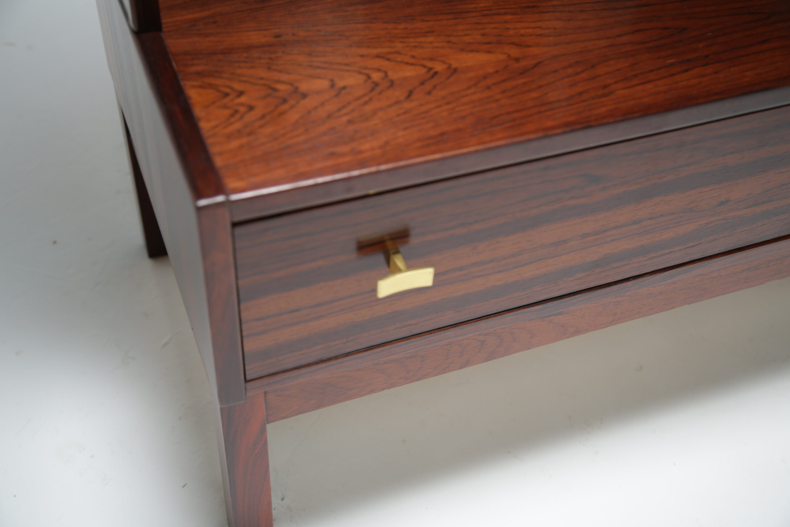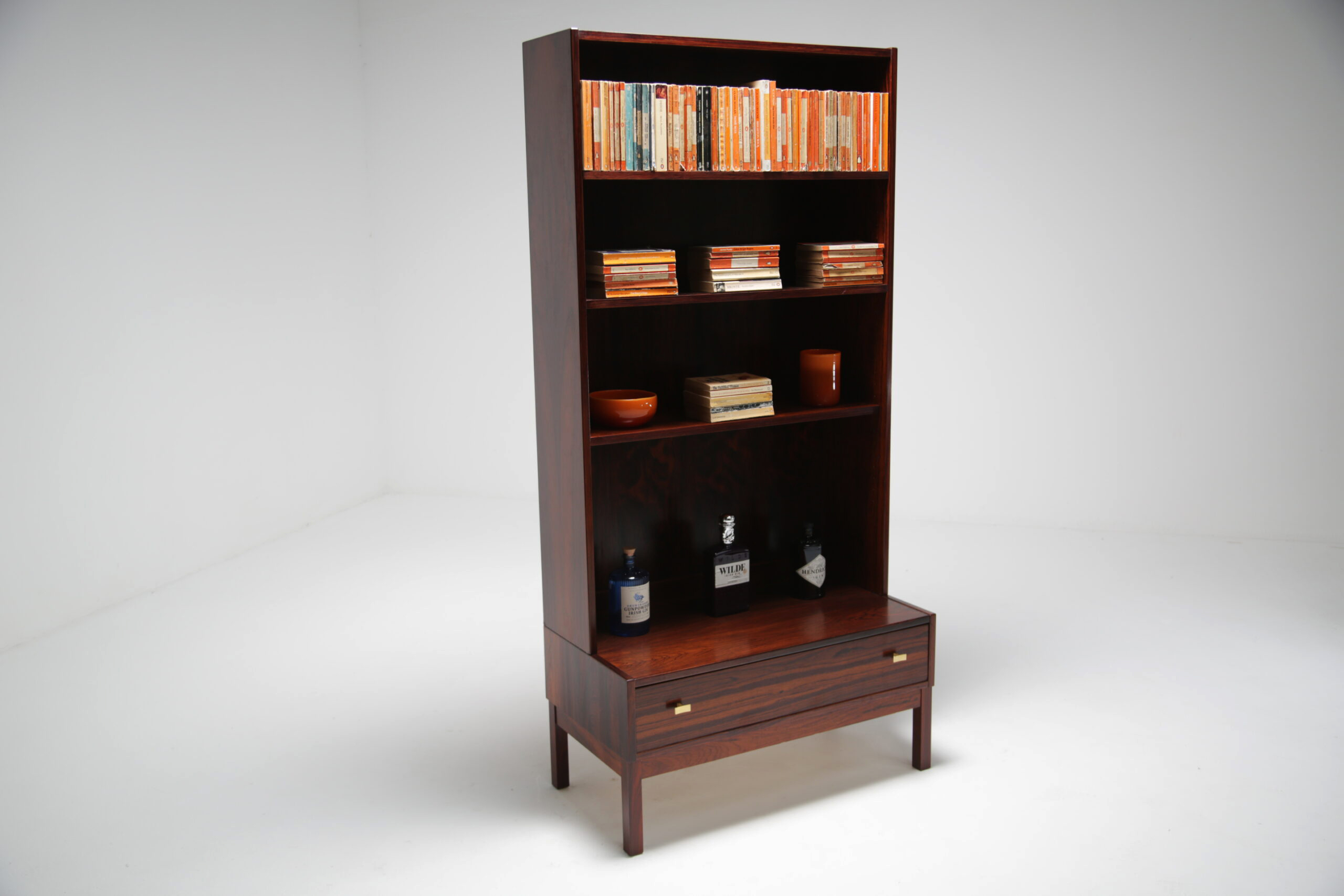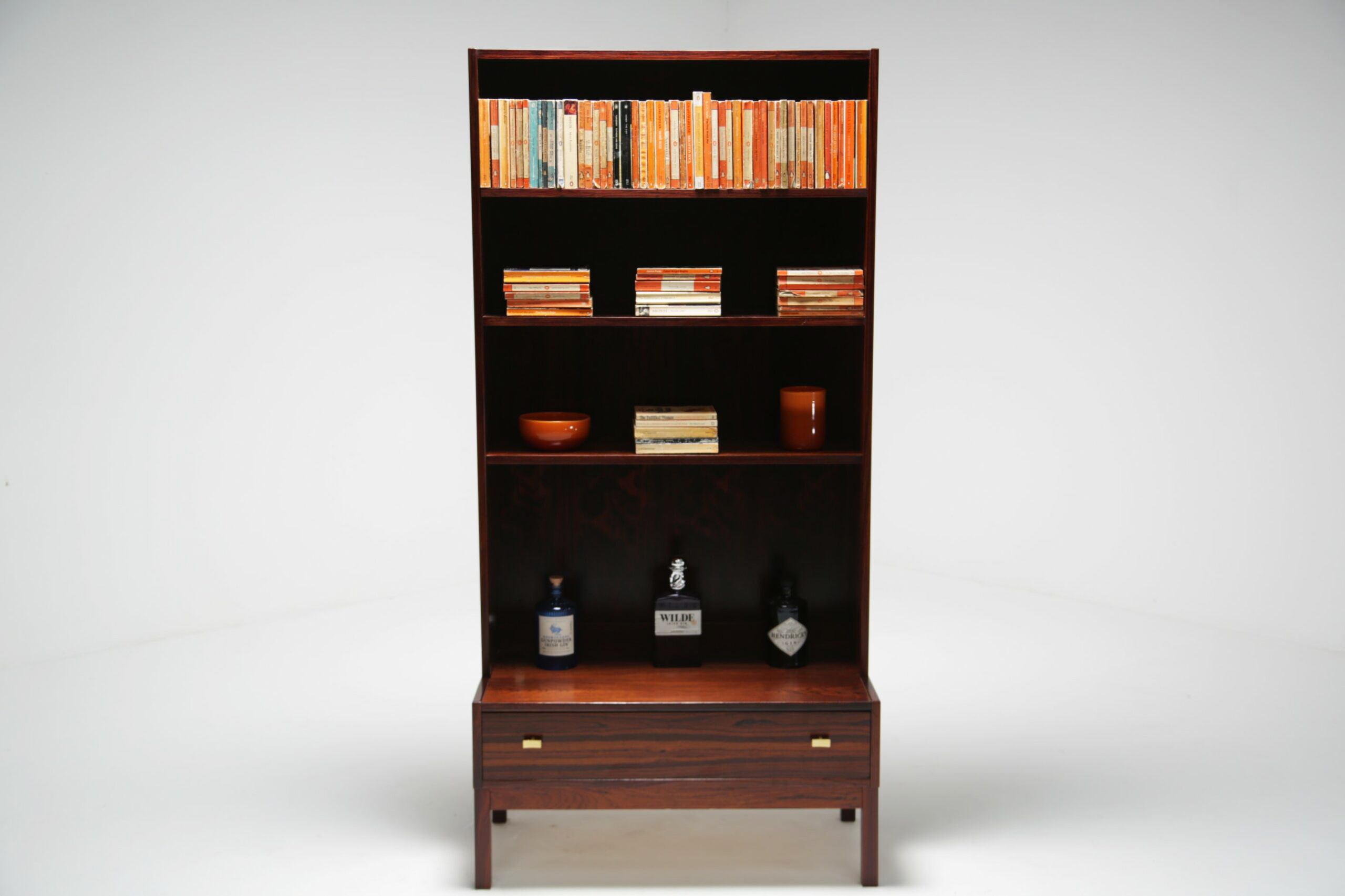 Rosewood Bookcase, model “Excellent”: Presented here is a tall and narrow bookcase unit manufactured in rosewood with a wonderful dark and pronounced grain. The bookcase features three adjustable shelves, which will accommodate most books, items and ornaments. The drawer base, which has nicely shaped brass handles offer additional storage. this unit would be perfect in an alcove or a space that needs additional storage without taking up too much room.