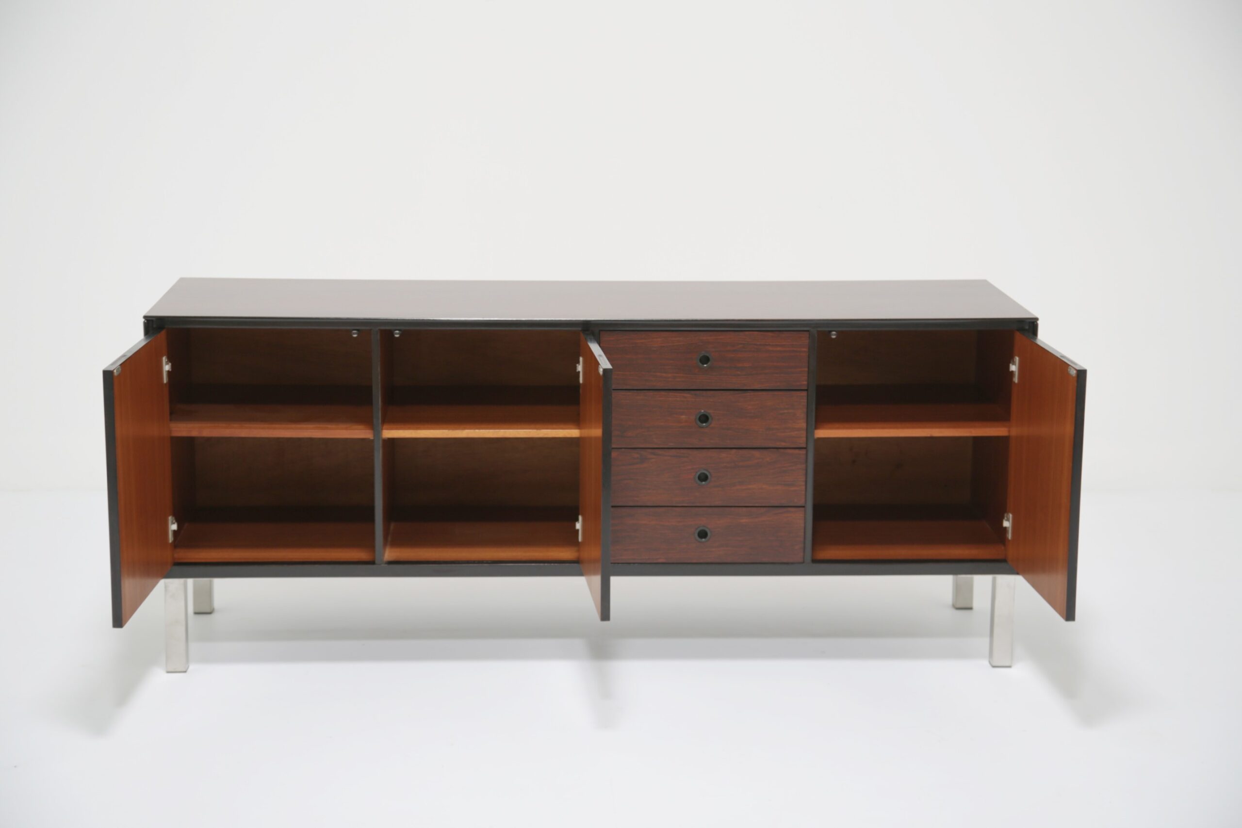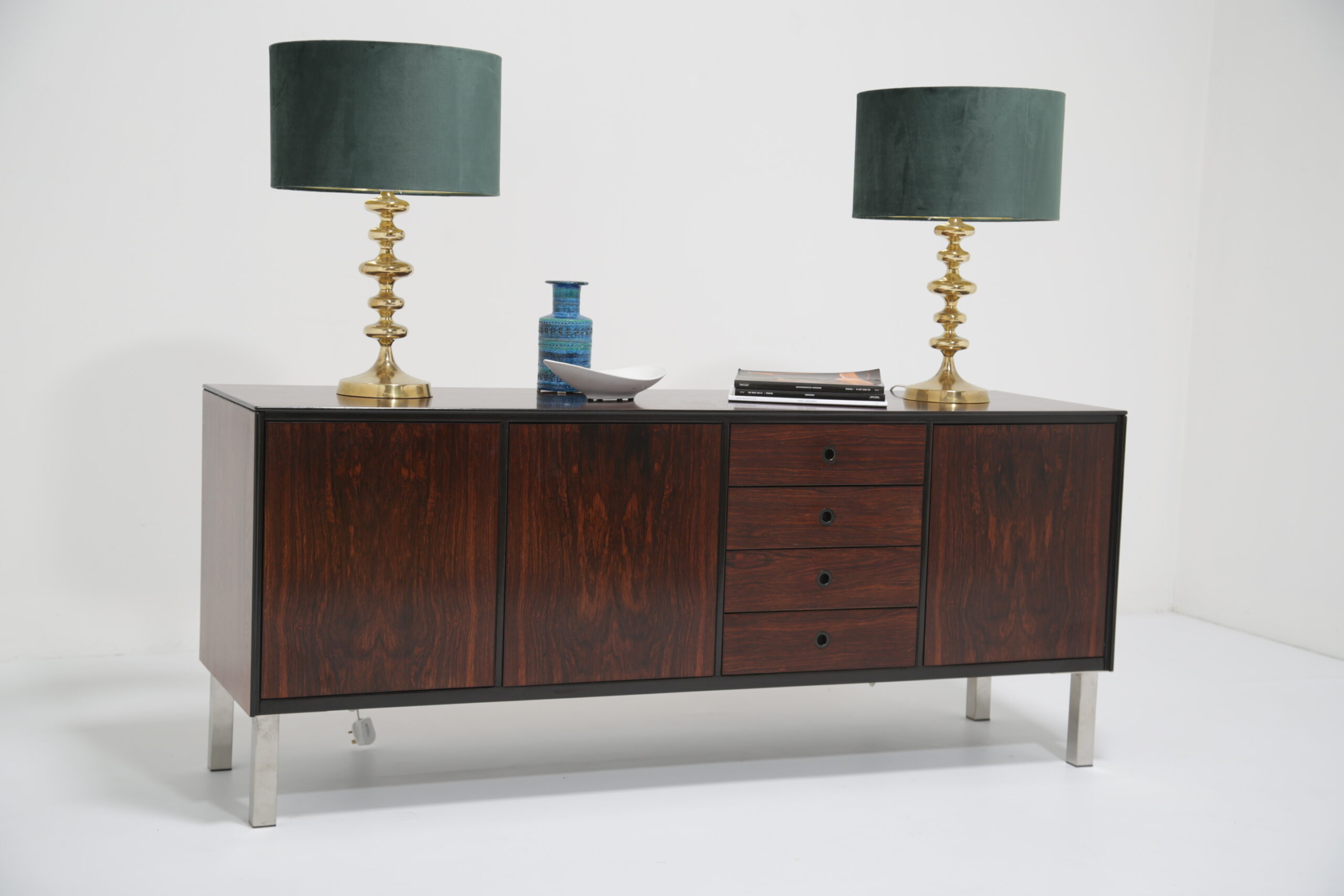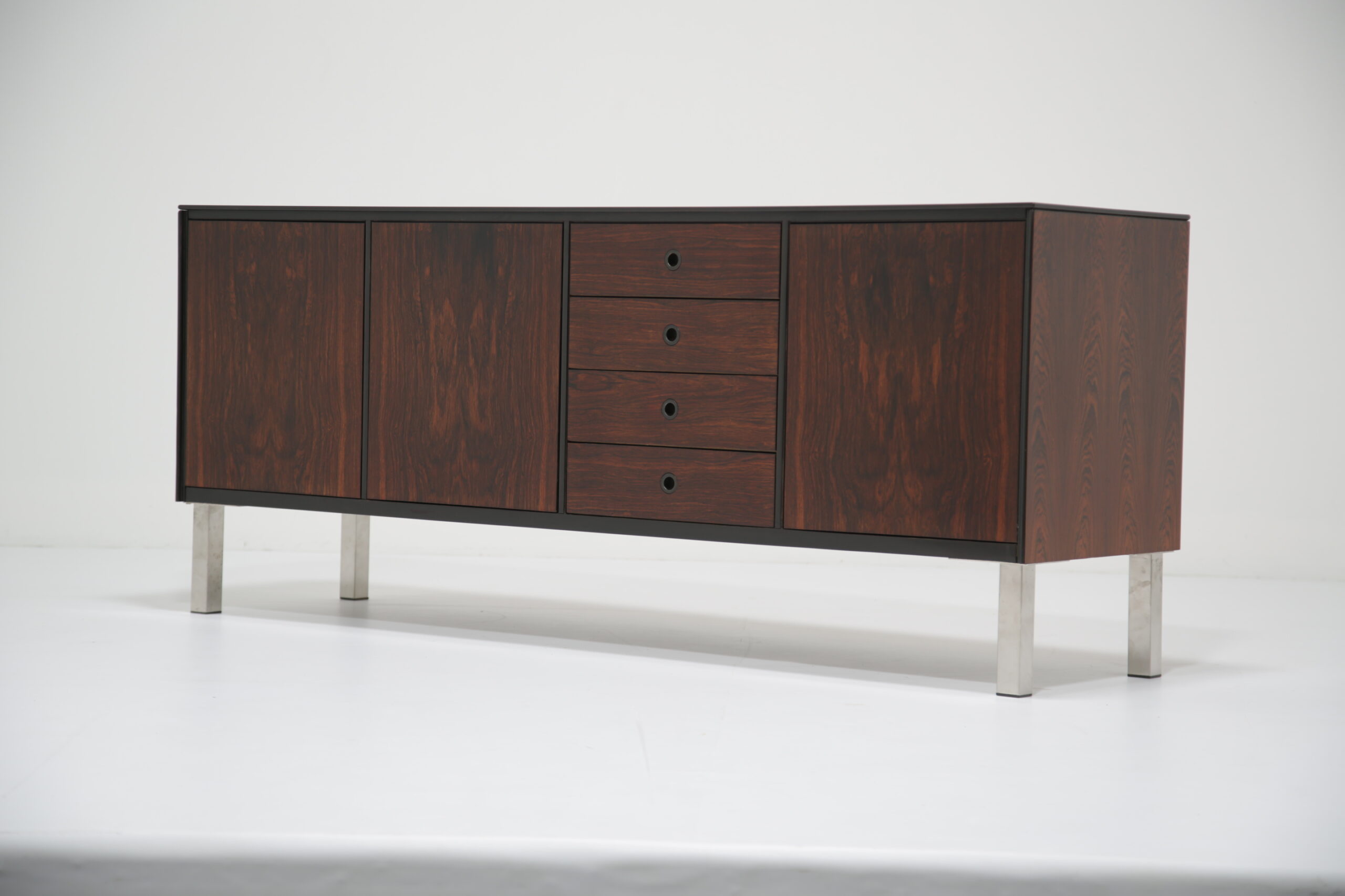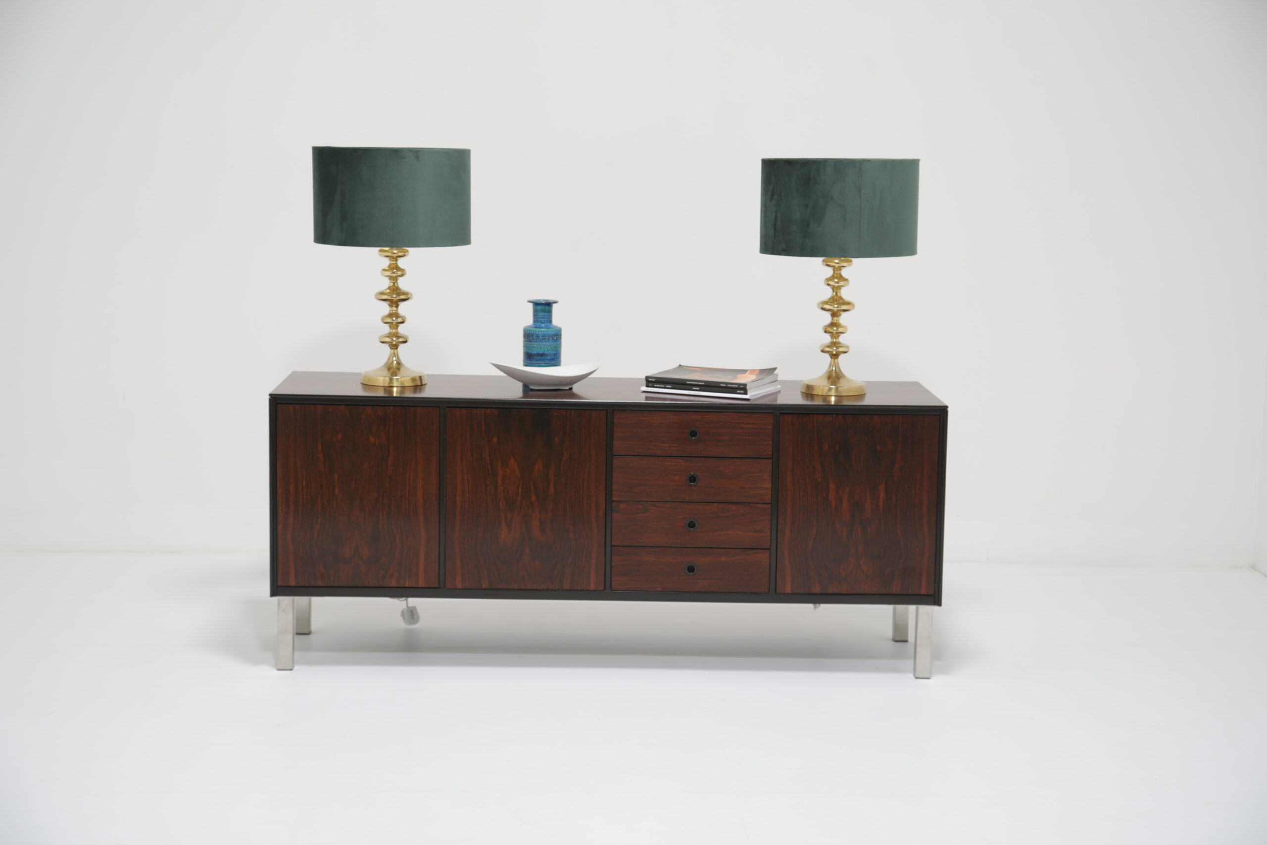 This sideboard has been expertly restored by our professional in-house restoration team. There are a some minor marks on the shelves which is to be noted but not visible when in situ. The chromed legs on this sideboard is not original but adds a nice modern element to this vintage piece.