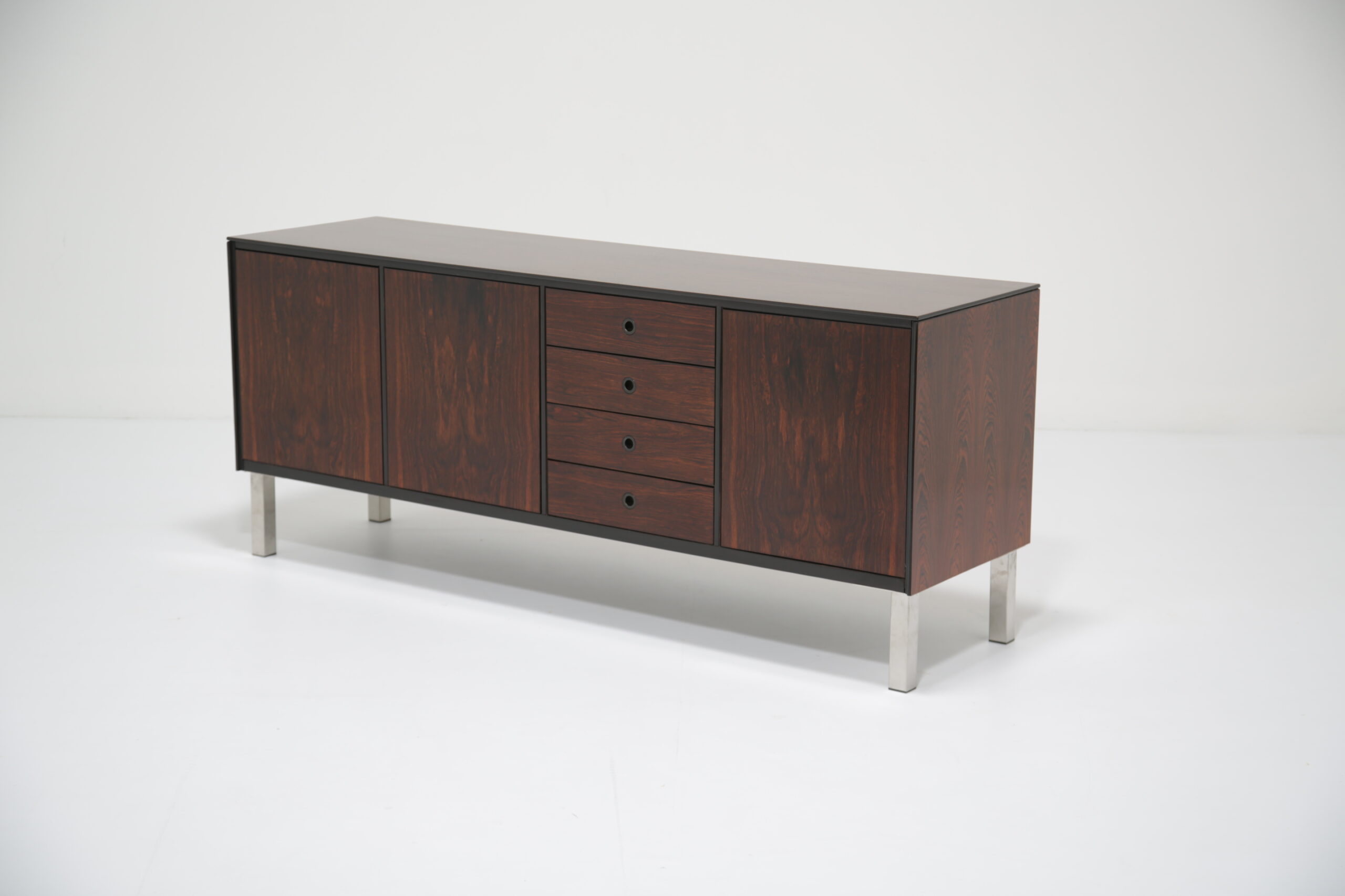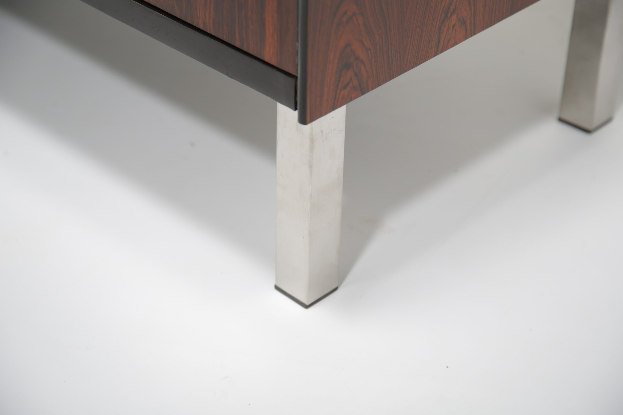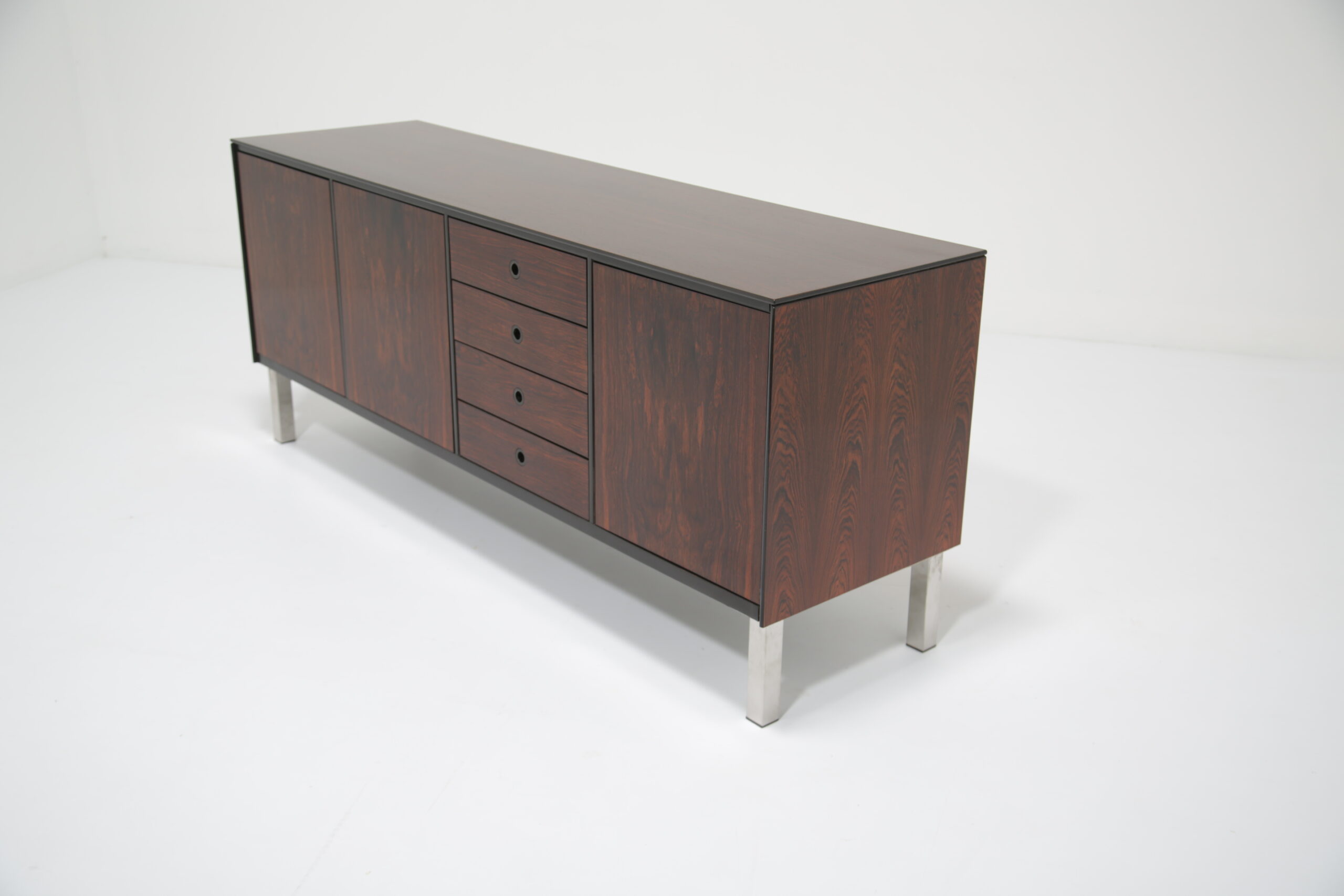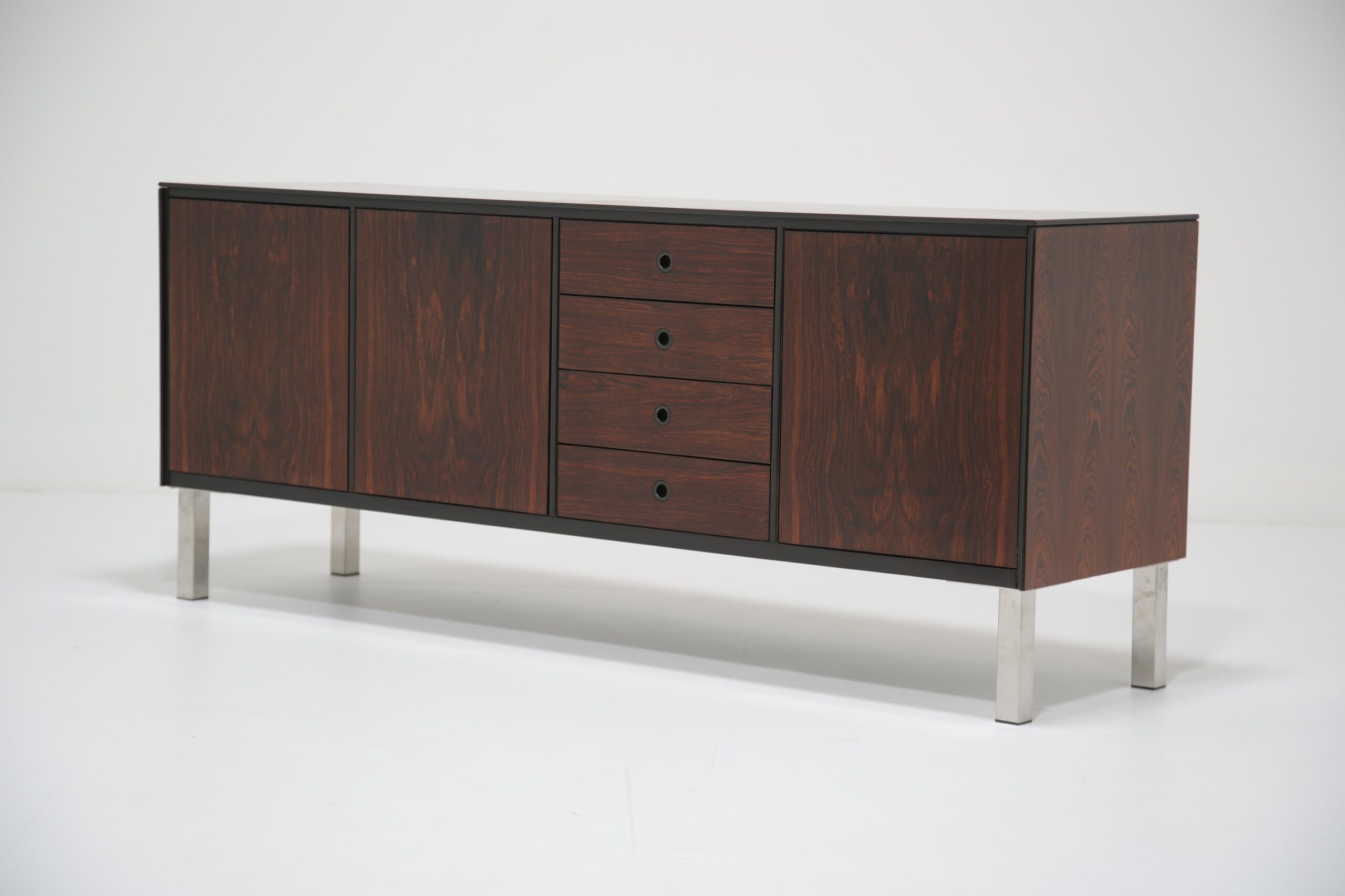 This sideboard has been expertly restored by our professional in-house restoration team. There are a some minor marks on the shelves which is to be noted but not visible when in situ. The chromed legs on this sideboard is not original but adds a nice modern element to this vintage piece.