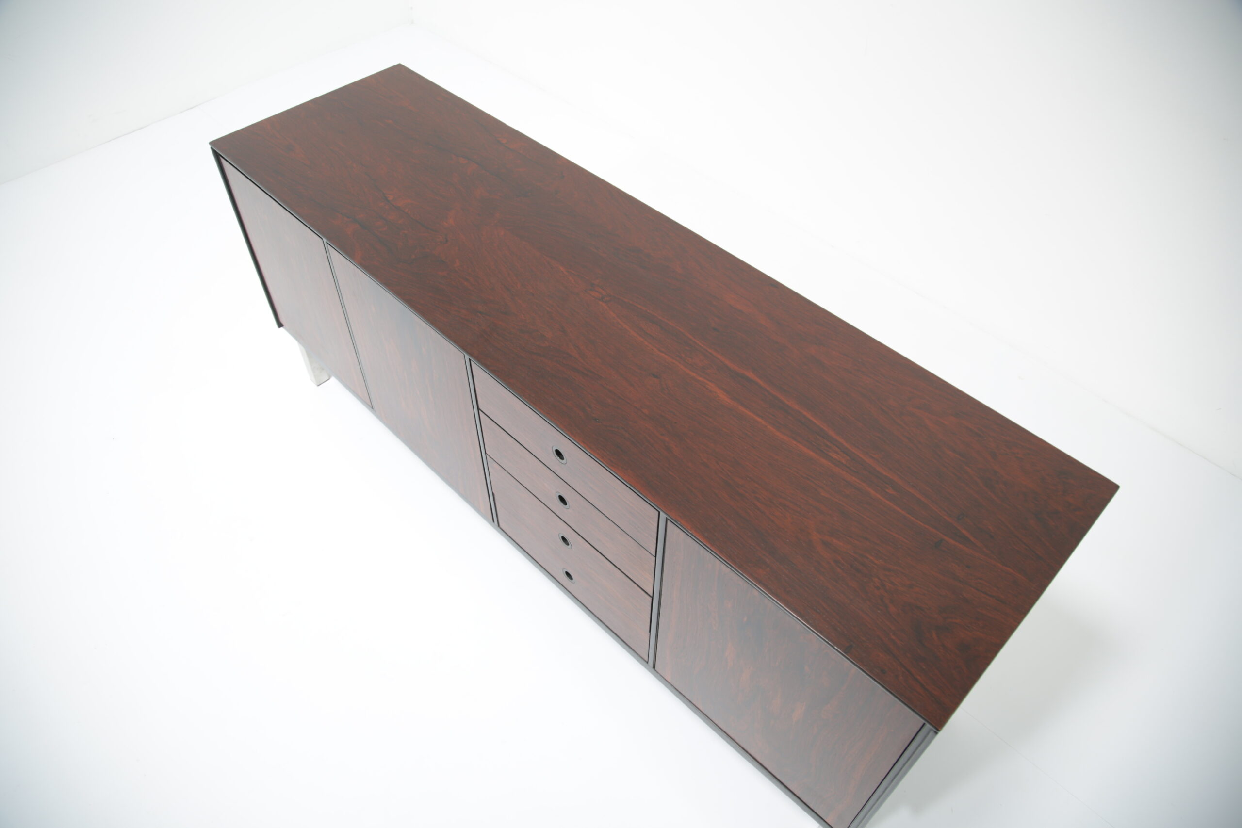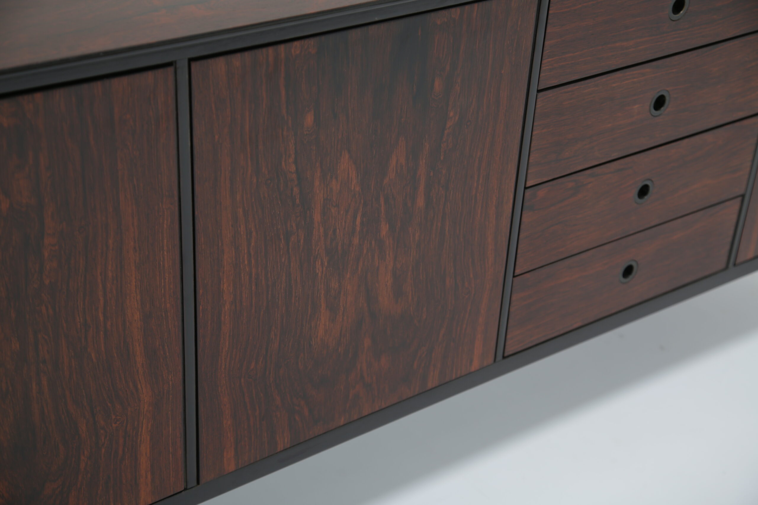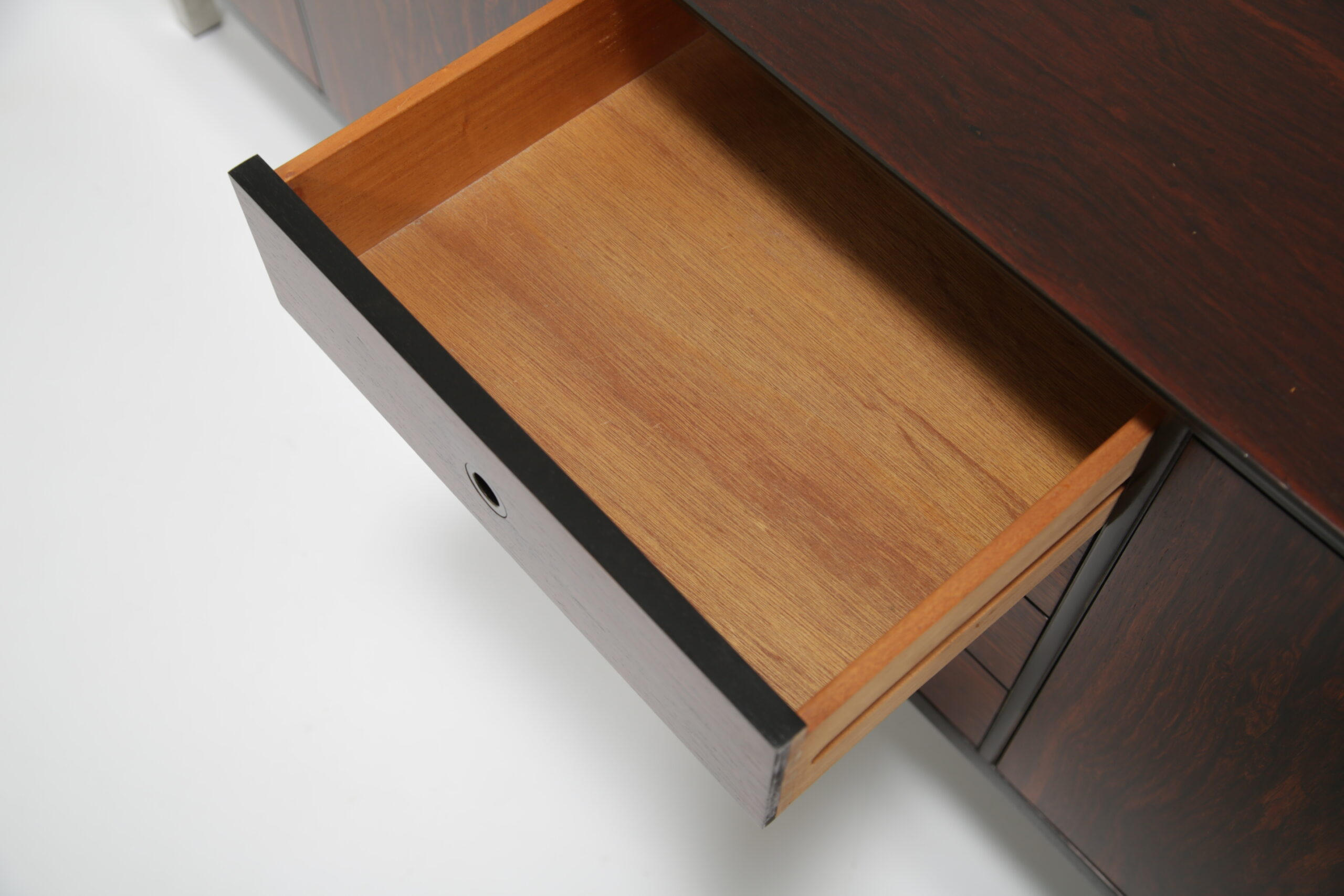 Just added to our extensive collection is this stunning sideboard featuring three doors and four pull out drawers. Designer remains unknown, but the style and features makes us believe this is either from the Netherlands or Germany. The design is minimalist with clean straight lines with a black surround which gives it a very modern sleek feel. This sideboard would be perfect for a hall, in a living room or in an office. Each door is hinged and equipped with a discreet push-to-open mechanism, similar to modern kitchen cabinetry and each shelf is removable or can be adjusted.