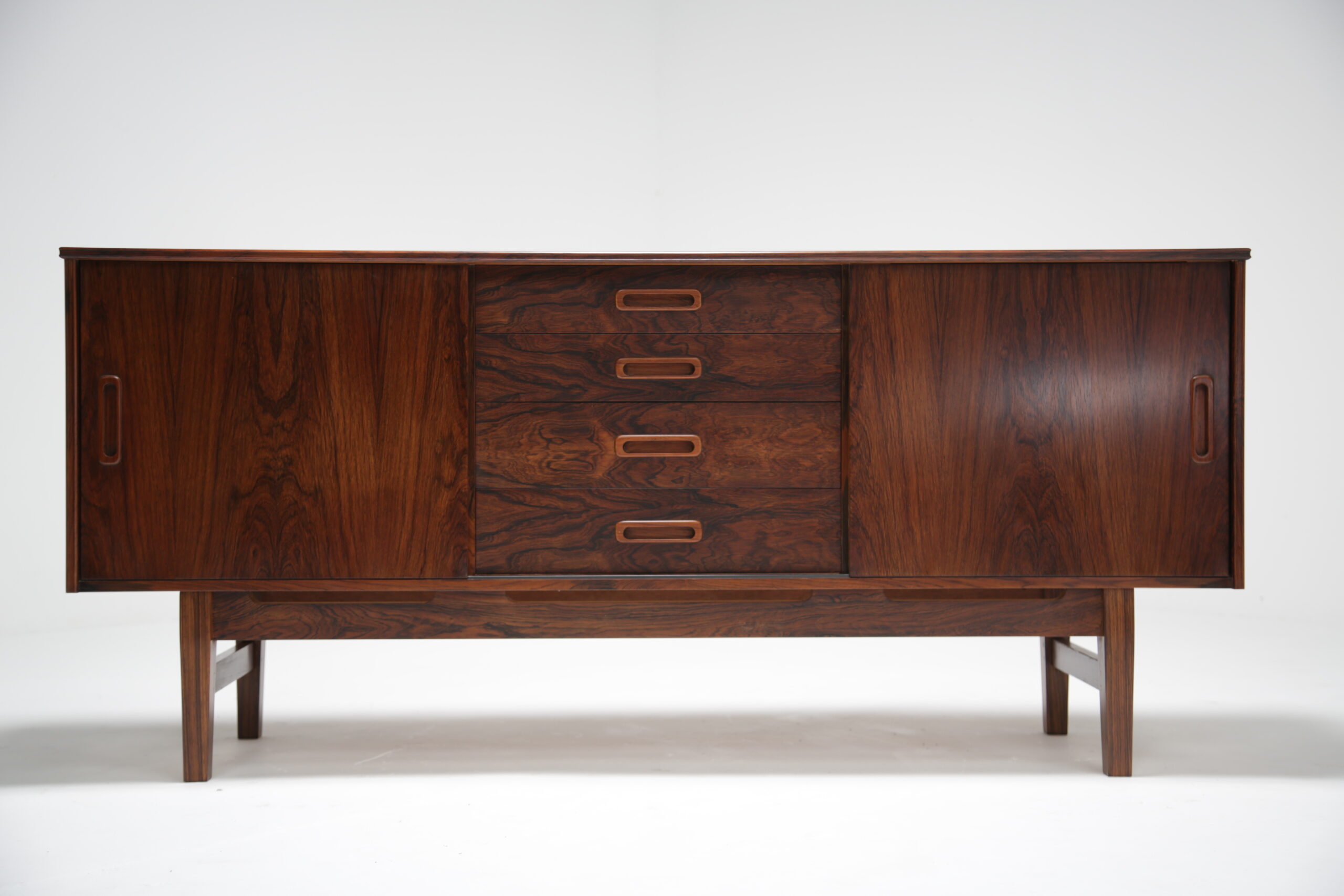 A 1960s rosewood sideboard with 4 central drawers and doors to the left and right. When either door is opened it slides across the front of the drawers and hides / blocks them. Each side has a large cupboard space with a shelf that creates two levels. This shelf can be removed to make a larger open space on one or both sides. The drawers are generous and will hold table cloths / candles / cutlery / utensils etc. The rosewood has a stunning vivid grain and has been beautifully and professionally polished and while the piece retains a period / vintage feel it certainly looks fresh and new. Pricing includes delivery in Ireland. Worldwide shipping available.