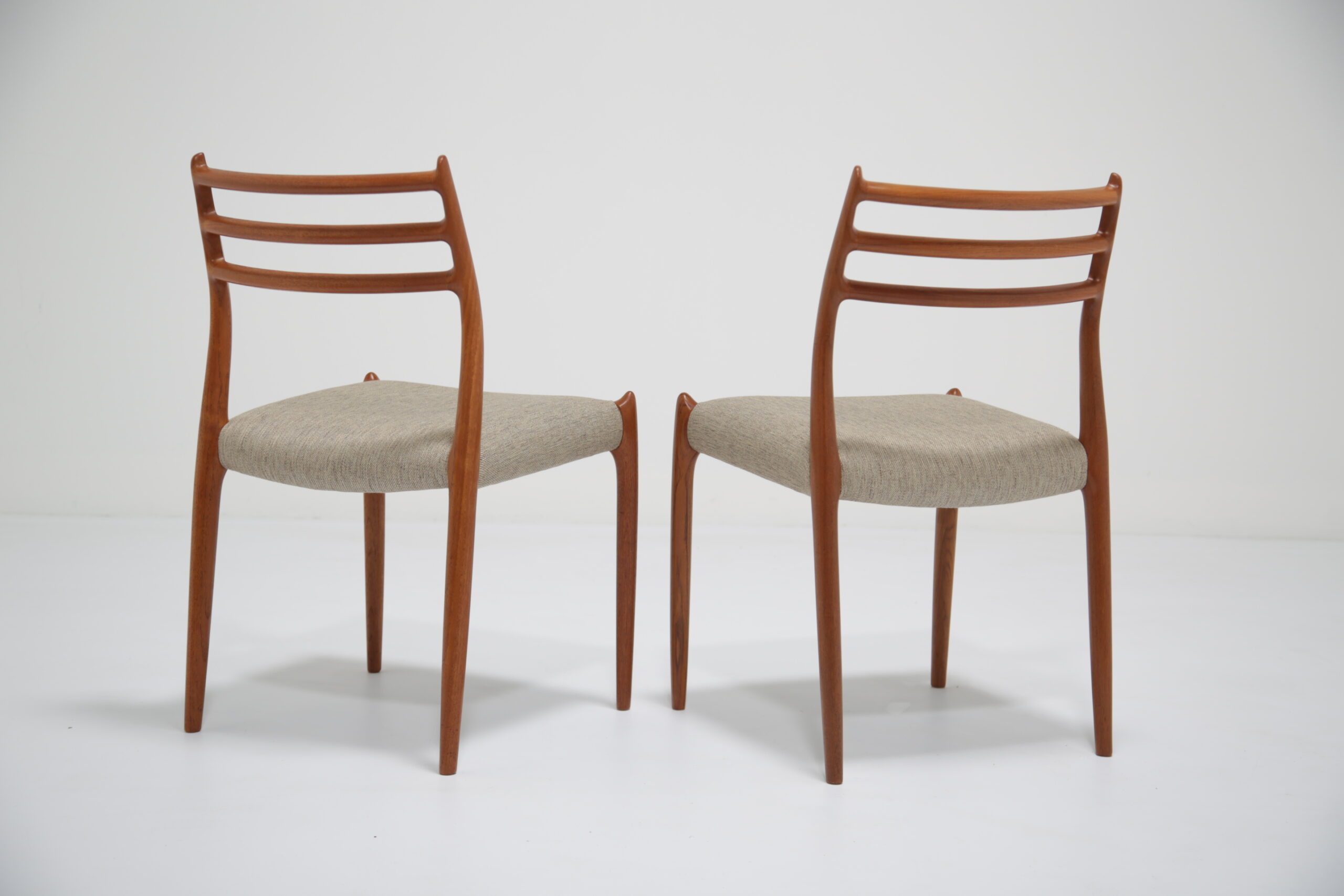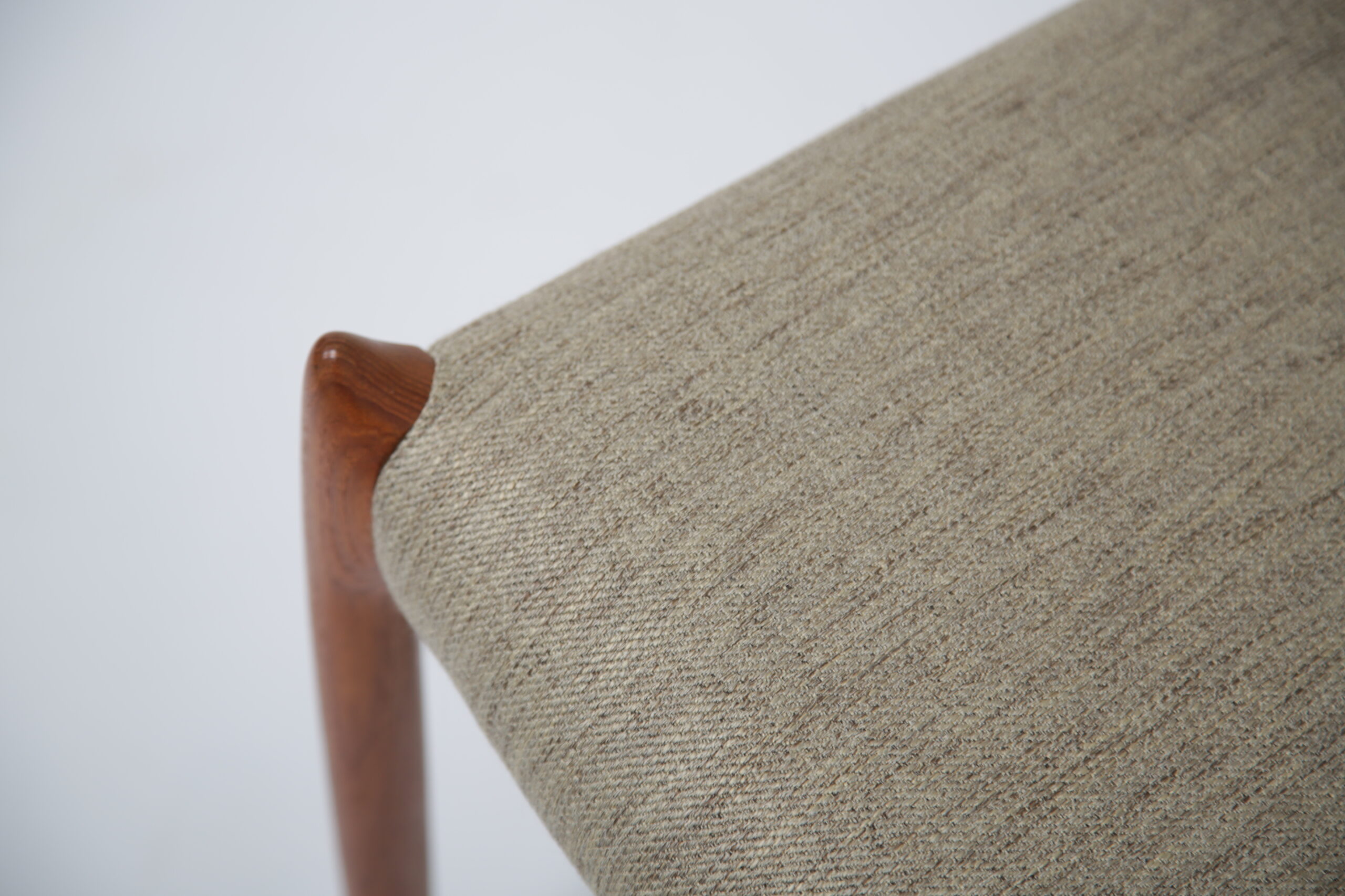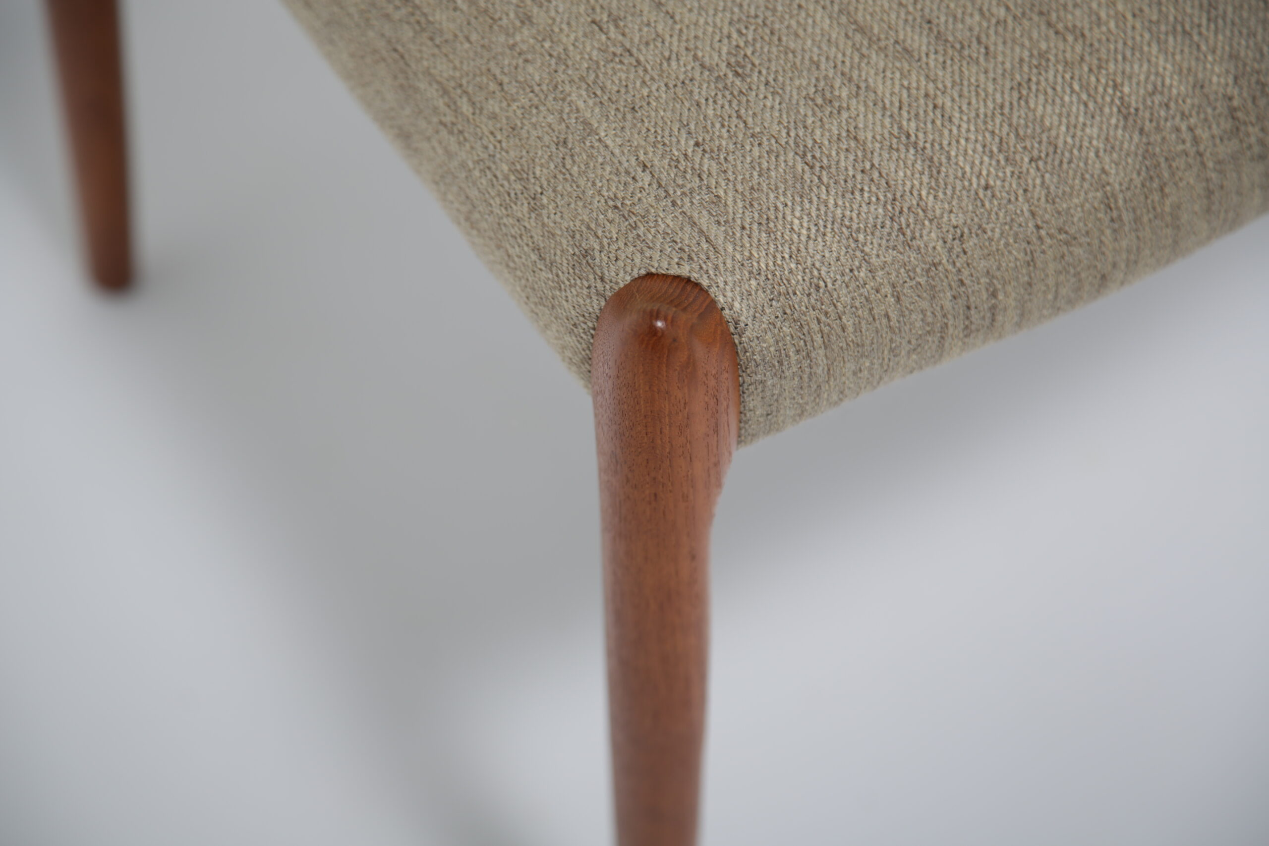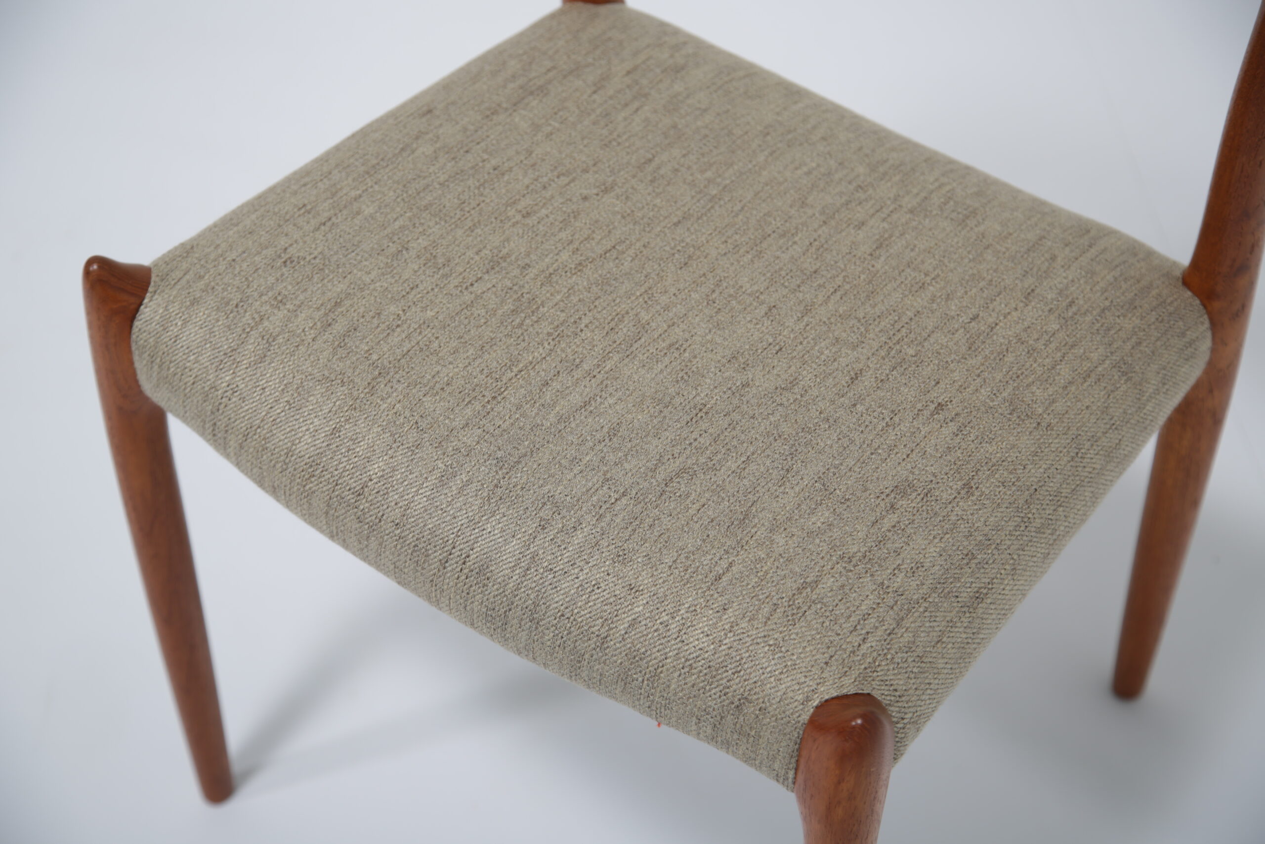 One of the most iconic designs in the world is the beautiful, elegant and timeless design of the Model 78 dining chair. Designed in 1962 by the renowned and celebrated Danish designer by Niels Otto Moller for J.L. Mollers Mobelfabrik. The chair is manufactured in solid teak and we have beautifully restored each frame back to it’s former glory and upholstered them in this lovely fabric which I would describe as “oatmeal”. The fabric is called “Frozen Harmony” which fits well with the aesthetics of the chairs. Møller’s attention to ergonomic detail is evident in the seamless blend of form and function. The slightly tapered legs and the smooth lines of the chair frame create a harmonious silhouette that is both graceful and sturdy. Whether you are hosting an elegant dinner party or enjoying a casual family meal, these chairs provide the perfect balance of comfort and style.