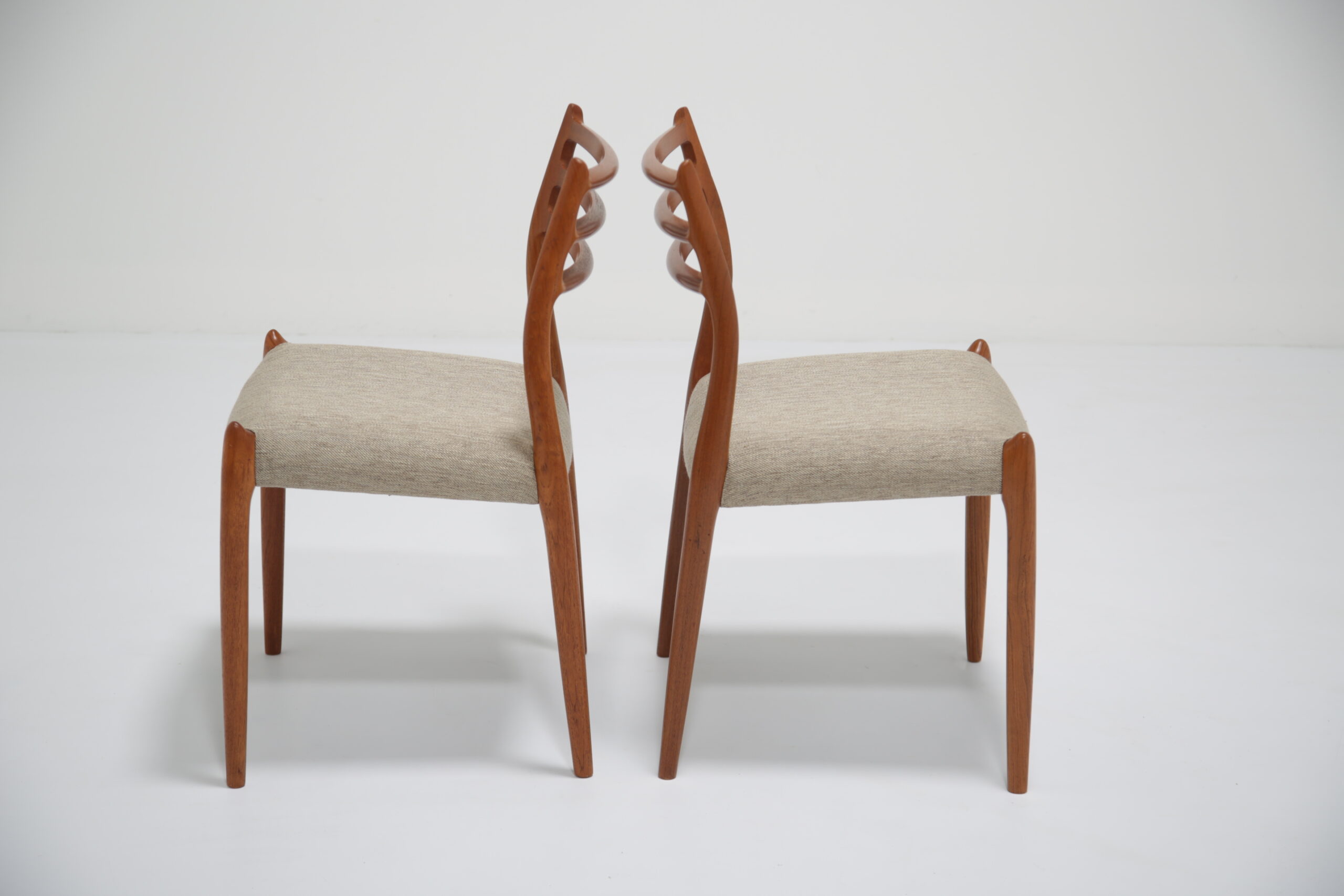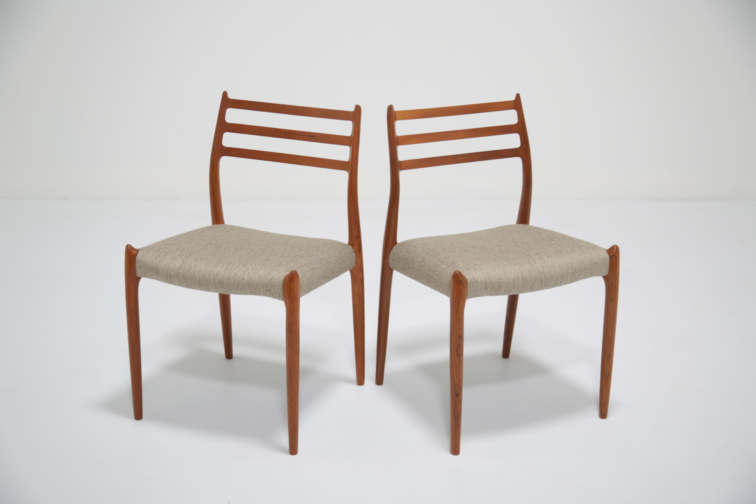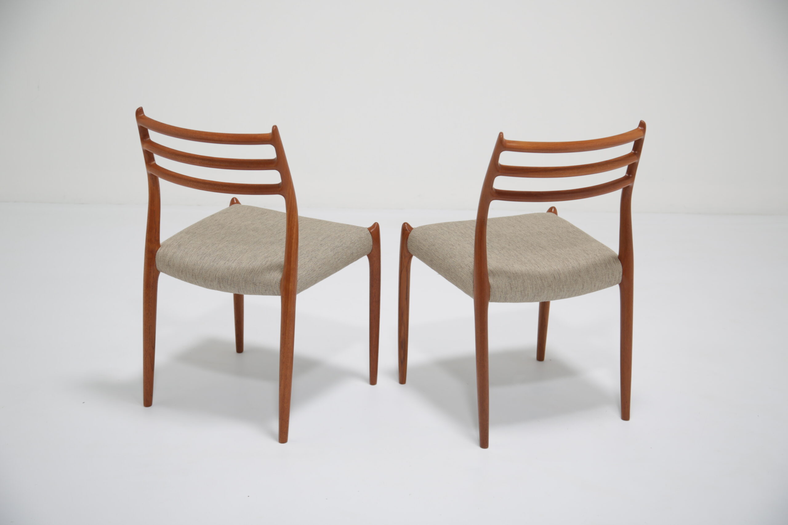 One of the most iconic designs in the world is the beautiful, elegant and timeless design of the Model 78 dining chair. Designed in 1962 by the renowned and celebrated Danish designer by Niels Otto Moller for J.L. Mollers Mobelfabrik. The chair is manufactured in solid teak and we have beautifully restored each frame back to it’s former glory and upholstered them in this lovely fabric which I would describe as “oatmeal”. The fabric is called “Frozen Harmony” which fits well with the aesthetics of the chairs. Møller’s attention to ergonomic detail is evident in the seamless blend of form and function. The slightly tapered legs and the smooth lines of the chair frame create a harmonious silhouette that is both graceful and sturdy. Whether you are hosting an elegant dinner party or enjoying a casual family meal, these chairs provide the perfect balance of comfort and style.