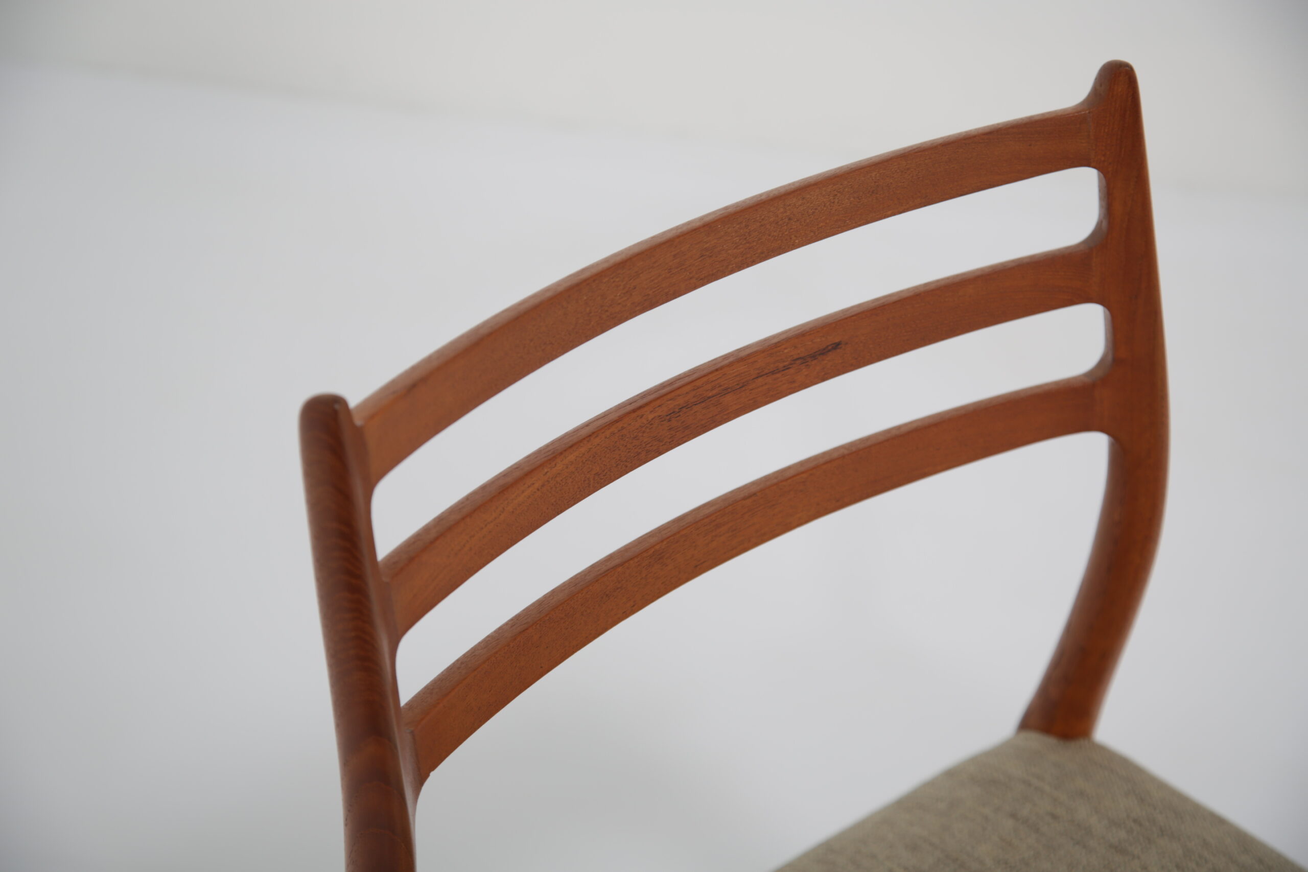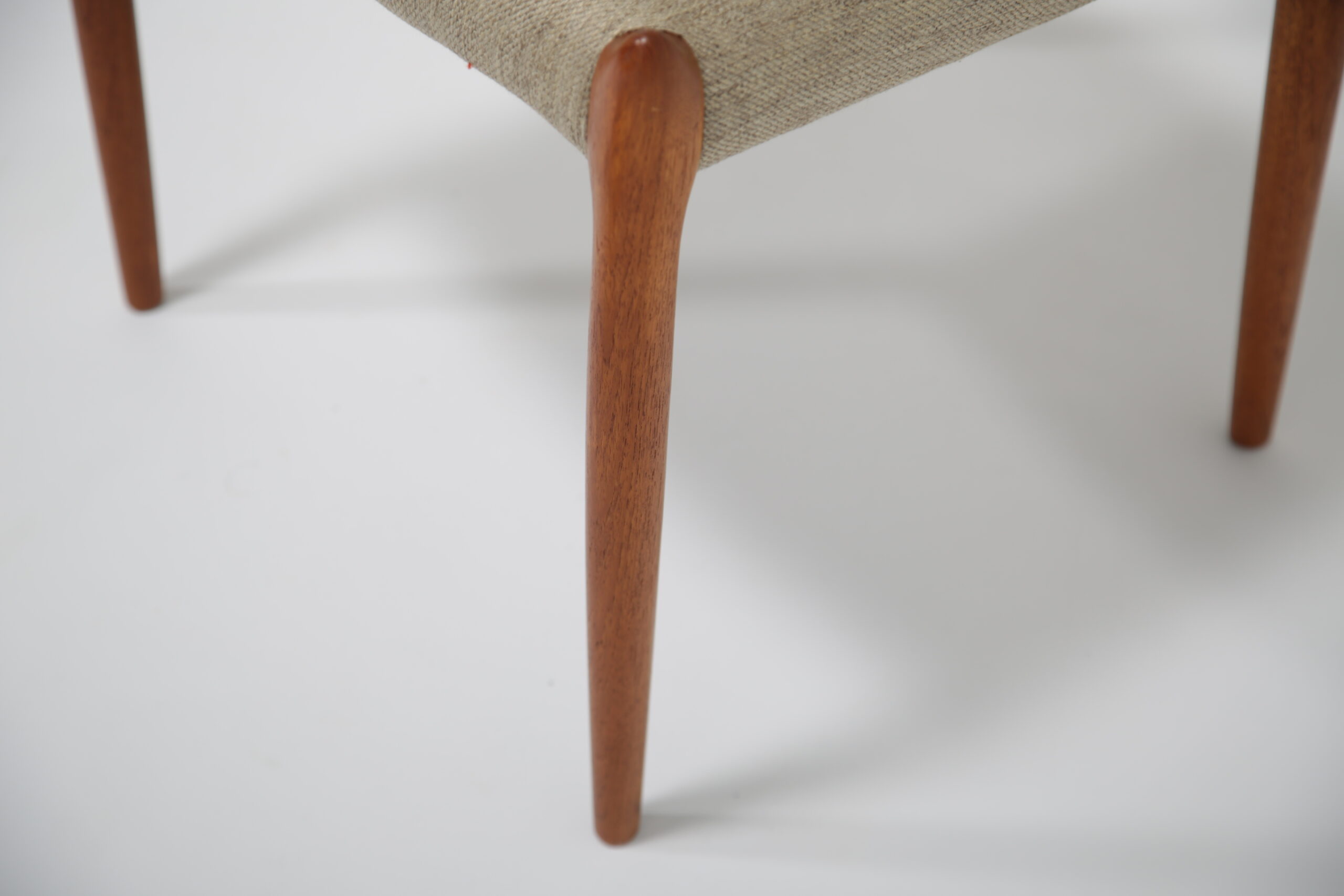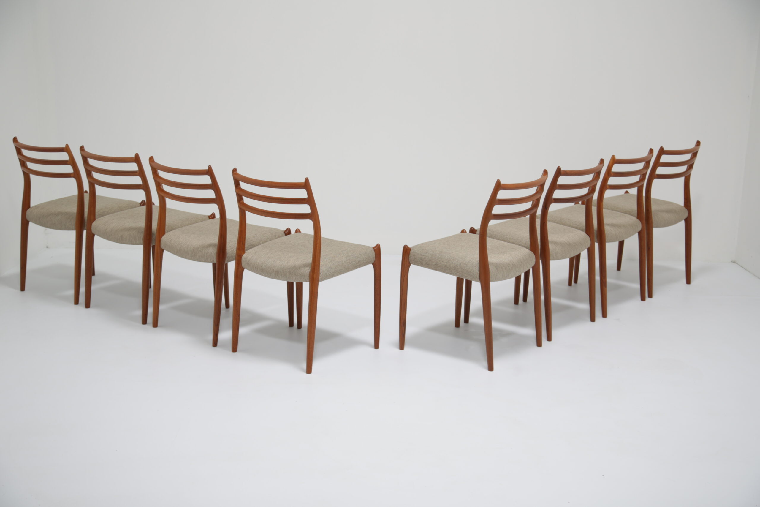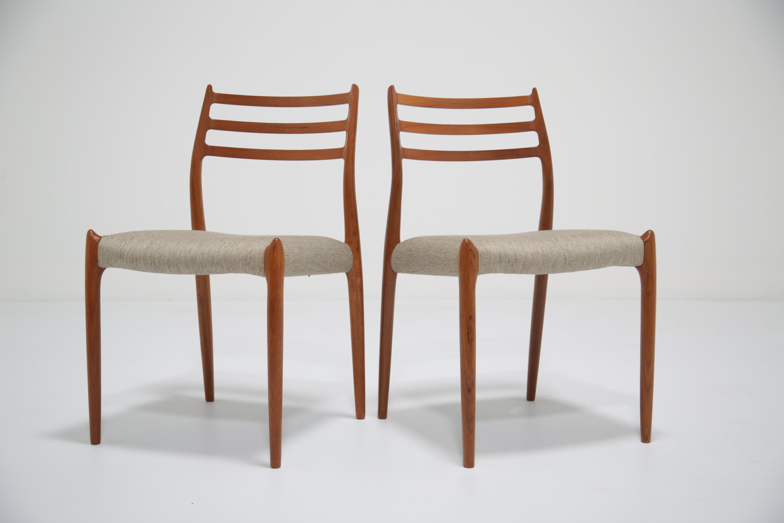 One of the most iconic designs in the world is the beautiful, elegant and timeless design of the Model 78 dining chair. Designed in 1962 by the renowned and celebrated Danish designer by Niels Otto Moller for J.L. Mollers Mobelfabrik. The chair is manufactured in solid teak and we have beautifully restored each frame back to it’s former glory and upholstered them in this lovely fabric which I would describe as “oatmeal”. The fabric is called “Frozen Harmony” which fits well with the aesthetics of the chairs. Møller’s attention to ergonomic detail is evident in the seamless blend of form and function. The slightly tapered legs and the smooth lines of the chair frame create a harmonious silhouette that is both graceful and sturdy. Whether you are hosting an elegant dinner party or enjoying a casual family meal, these chairs provide the perfect balance of comfort and style.