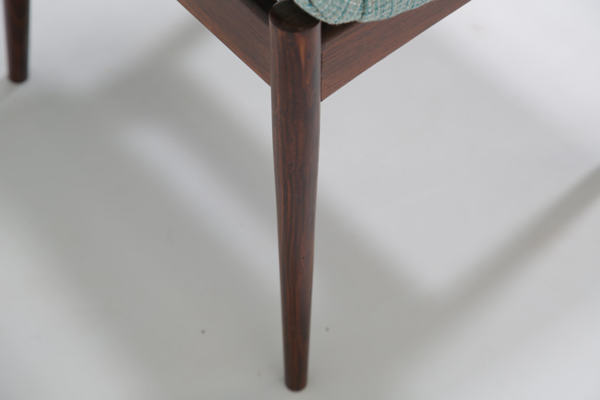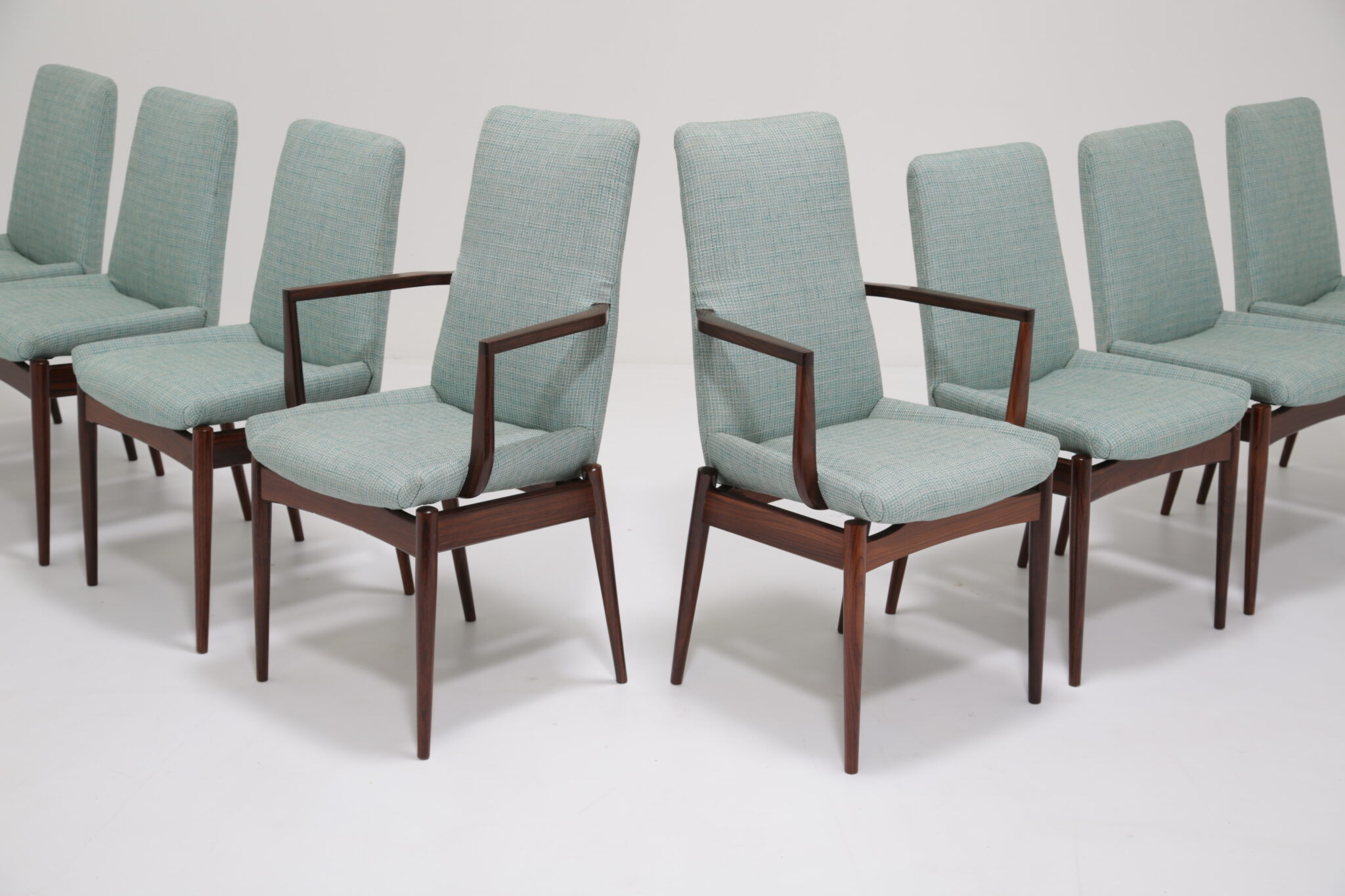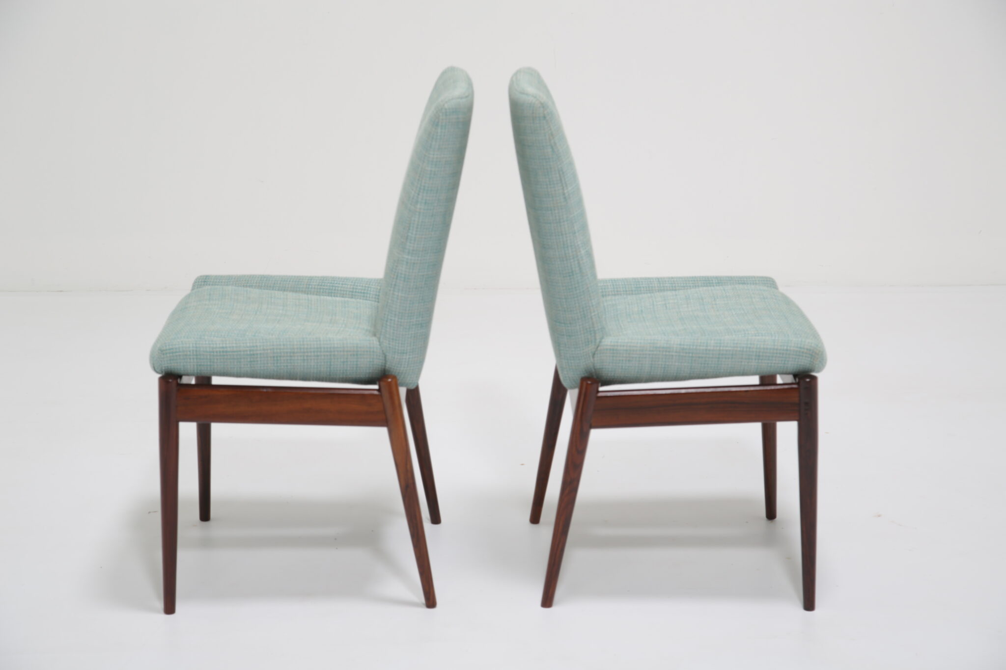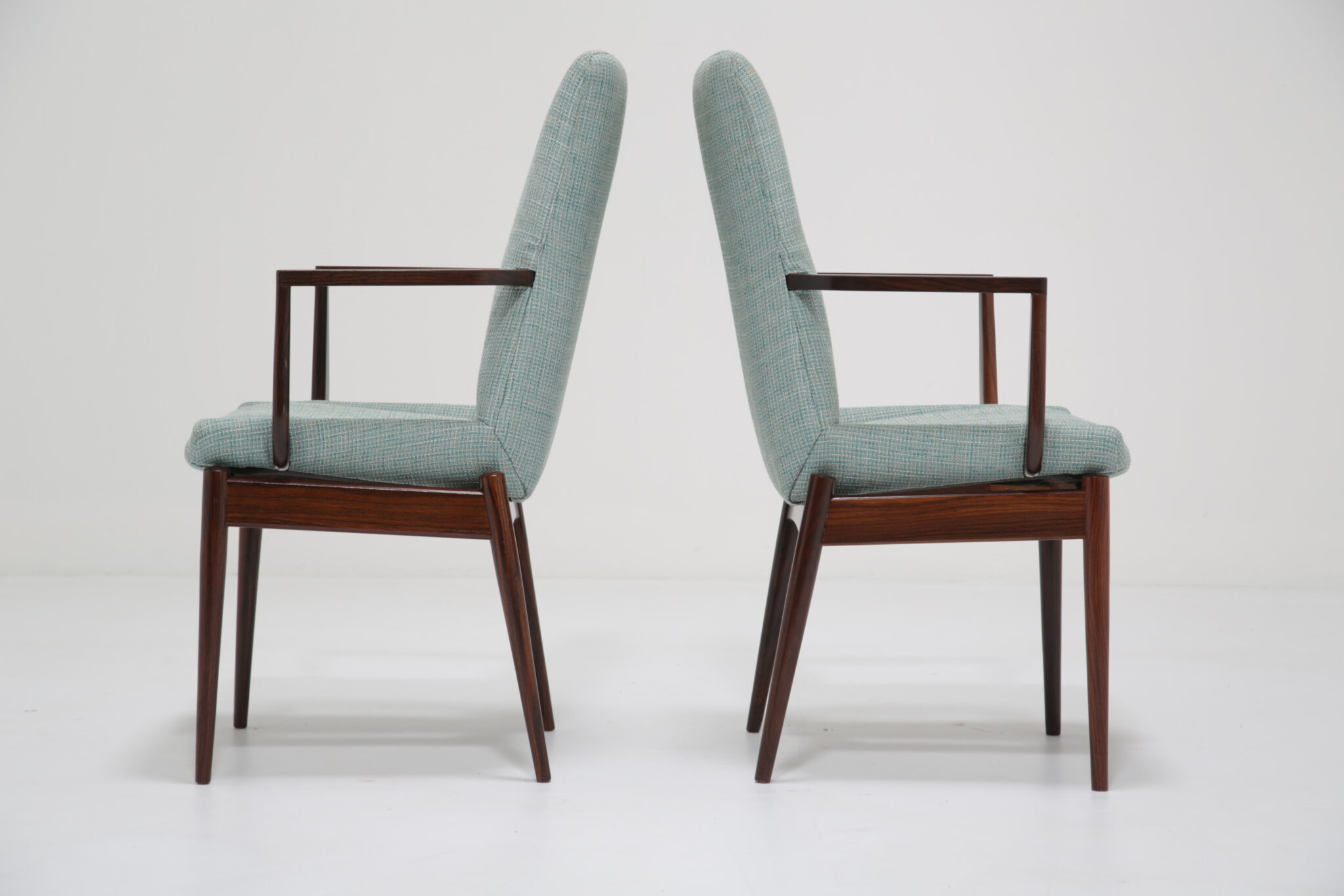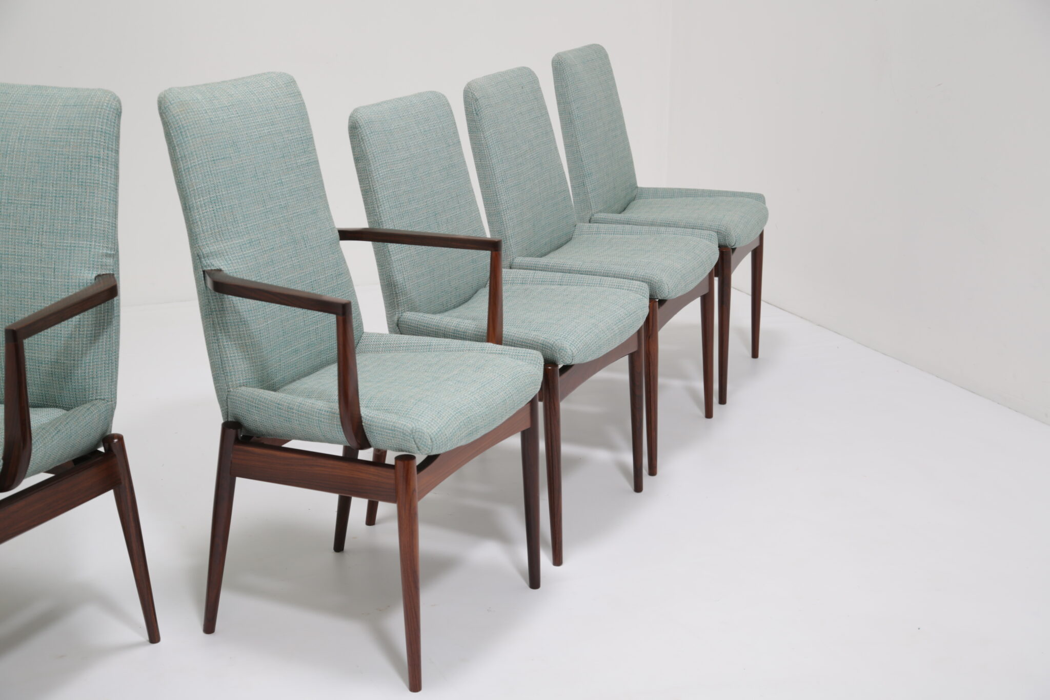 Designed by Robert Heritage, these chairs are truly magnificent with a beautiful profile and overall design. The upholstered seat, which we have done provides comfort and good support for the back and is perfect for long evenings at the dining table. The frames are manufactured in rosewood and has a lovely deep red tone with beautifully pronounced grain. The fabric is internally known here as “Chanel” which is a duck-egg blue tweed like fabric. This set was manufactured in the 1960s for Archie Shine in the United Kingdom and was sold under the model name “Hamilton”.