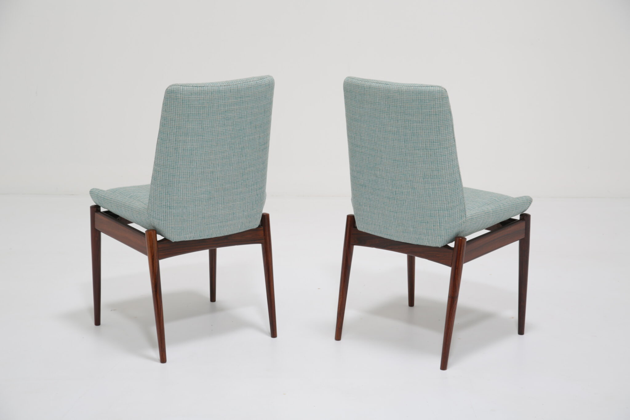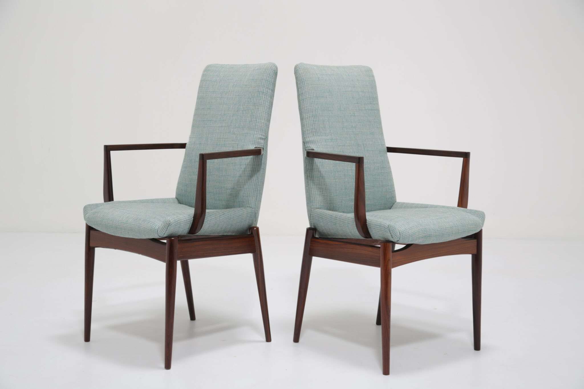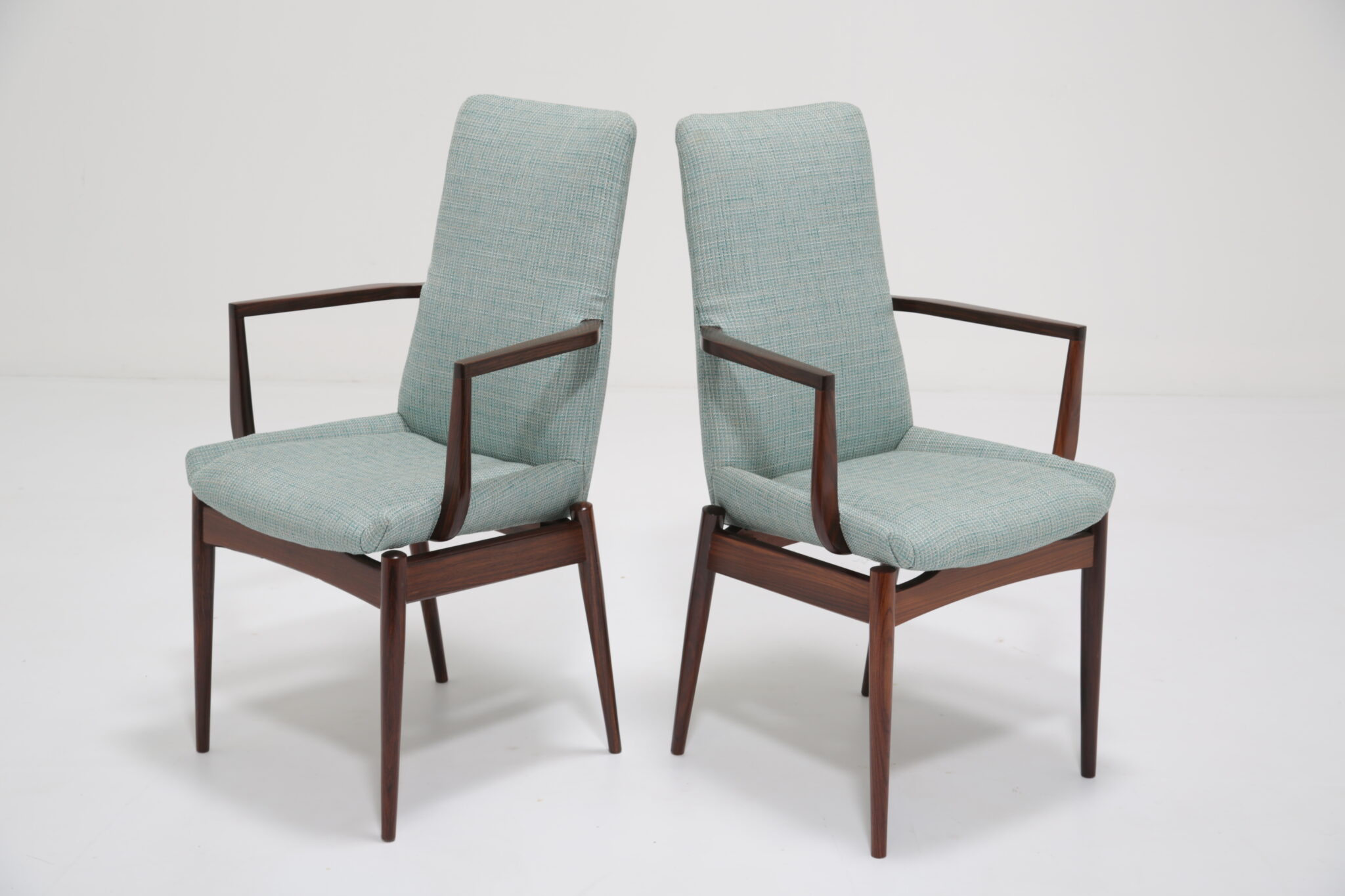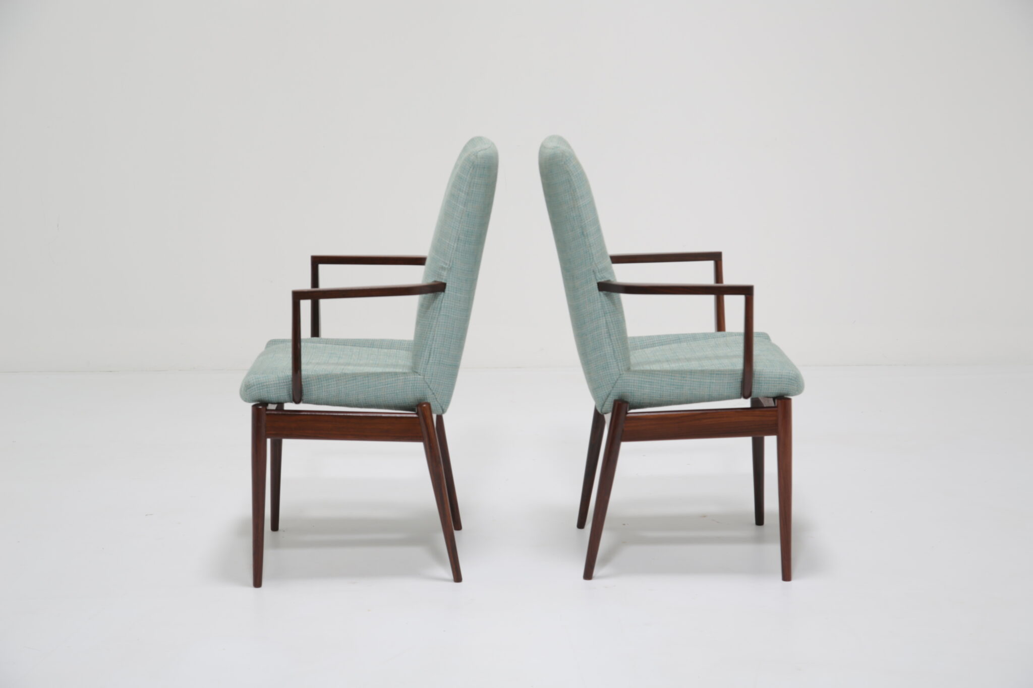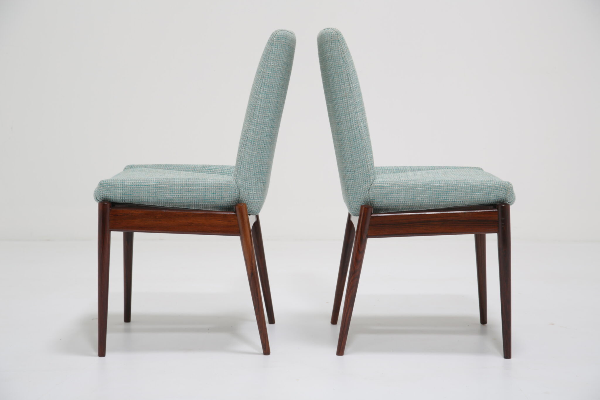 Designed by Robert Heritage, these chairs are truly magnificent with a beautiful profile and overall design. The upholstered seat, which we have done provides comfort and good support for the back and is perfect for long evenings at the dining table. The frames are manufactured in rosewood and has a lovely deep red tone with beautifully pronounced grain. The fabric is internally known here as “Chanel” which is a duck-egg blue tweed like fabric. This set was manufactured in the 1960s for Archie Shine in the United Kingdom and was sold under the model name “Hamilton”.