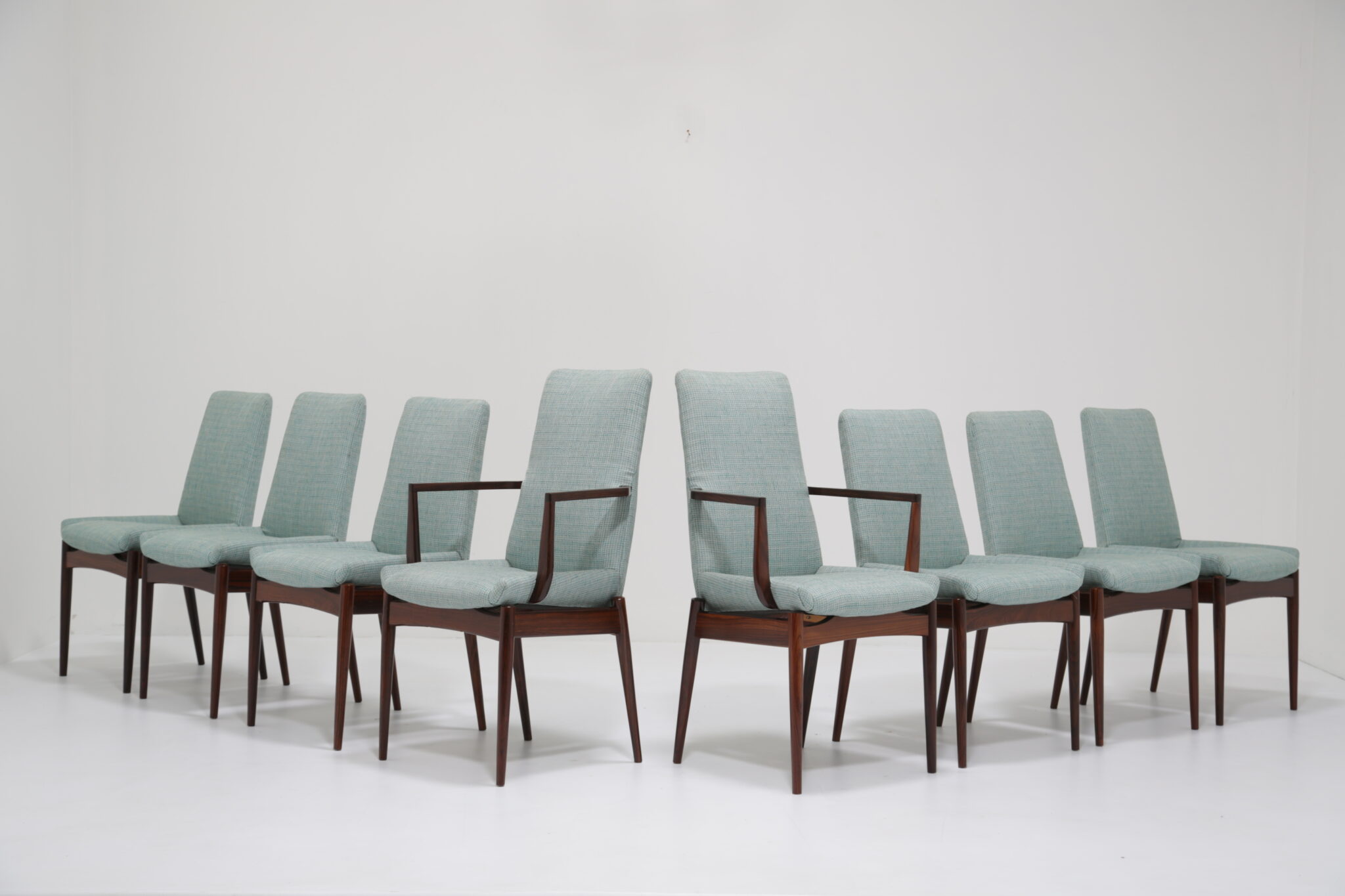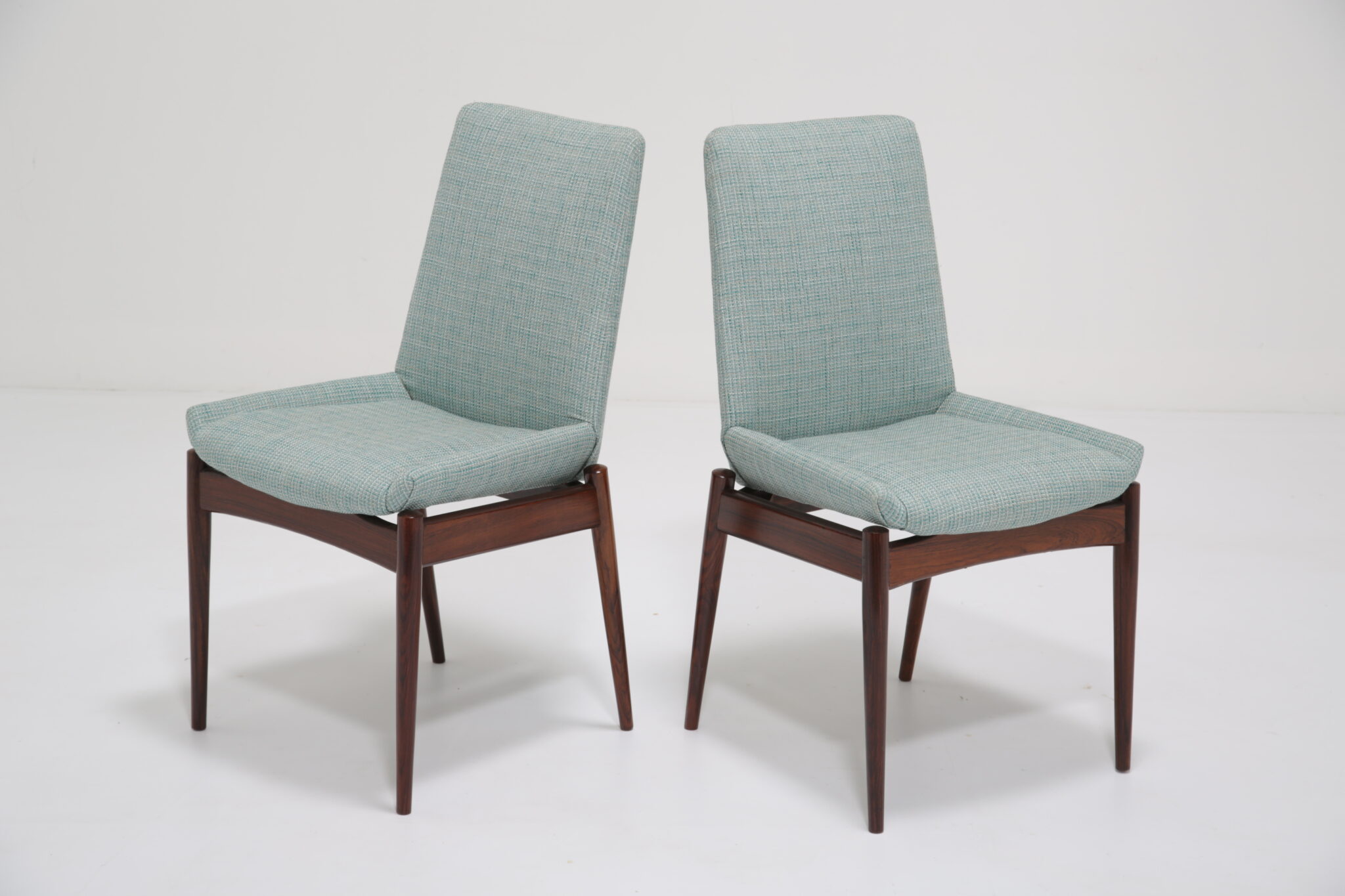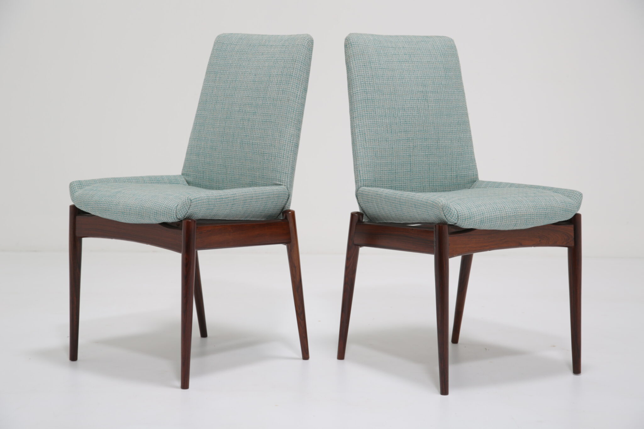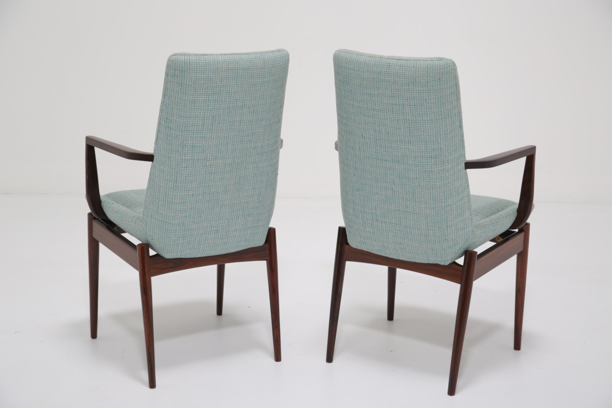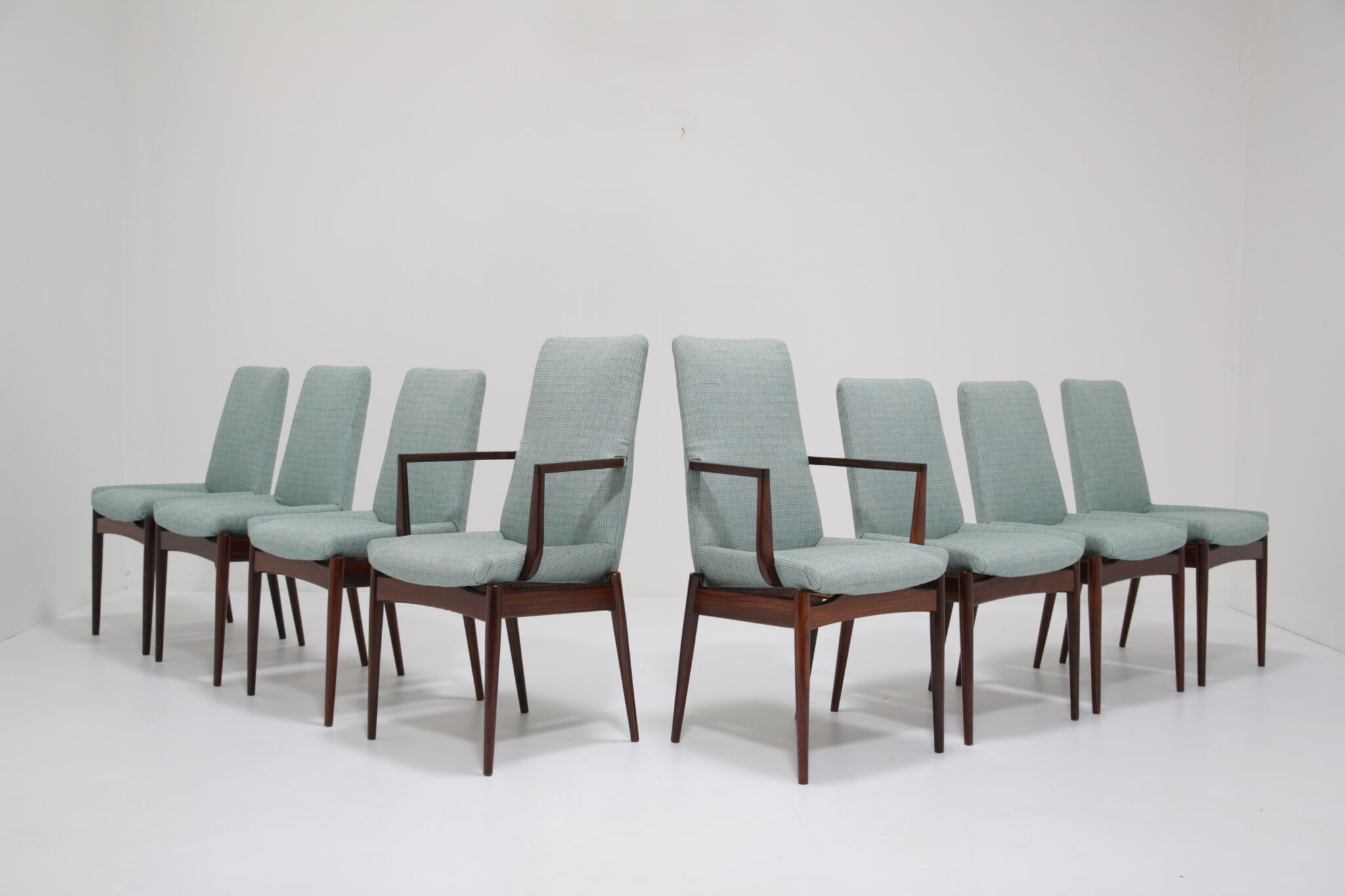 Designed by Robert Heritage, these chairs are truly magnificent with a beautiful profile and overall design. The upholstered seat, which we have done provides comfort and good support for the back and is perfect for long evenings at the dining table. The frames are manufactured in rosewood and has a lovely deep red tone with beautifully pronounced grain. The fabric is internally known here as “Chanel” which is a duck-egg blue tweed like fabric. This set was manufactured in the 1960s for Archie Shine in the United Kingdom and was sold under the model name “Hamilton”.