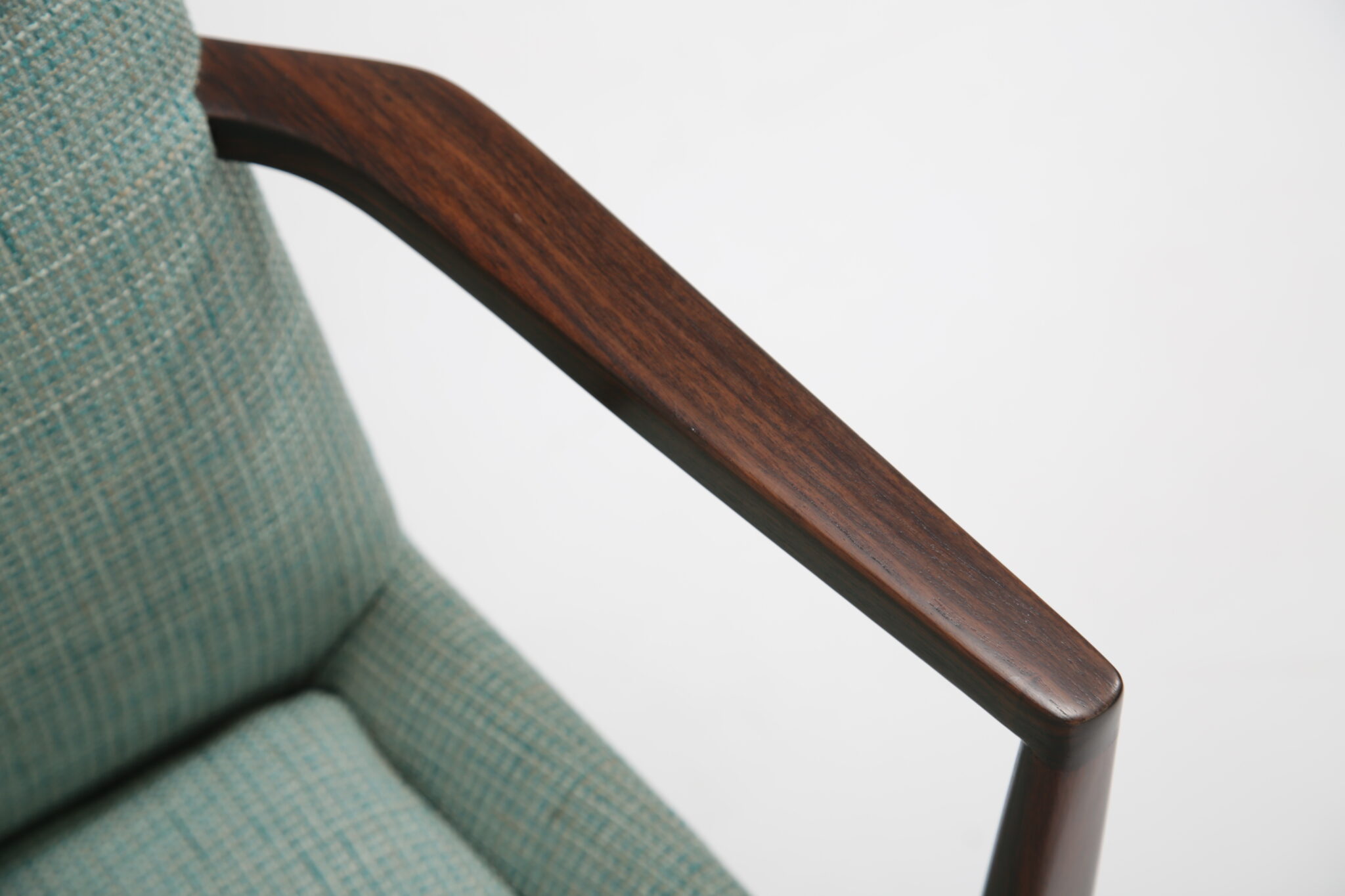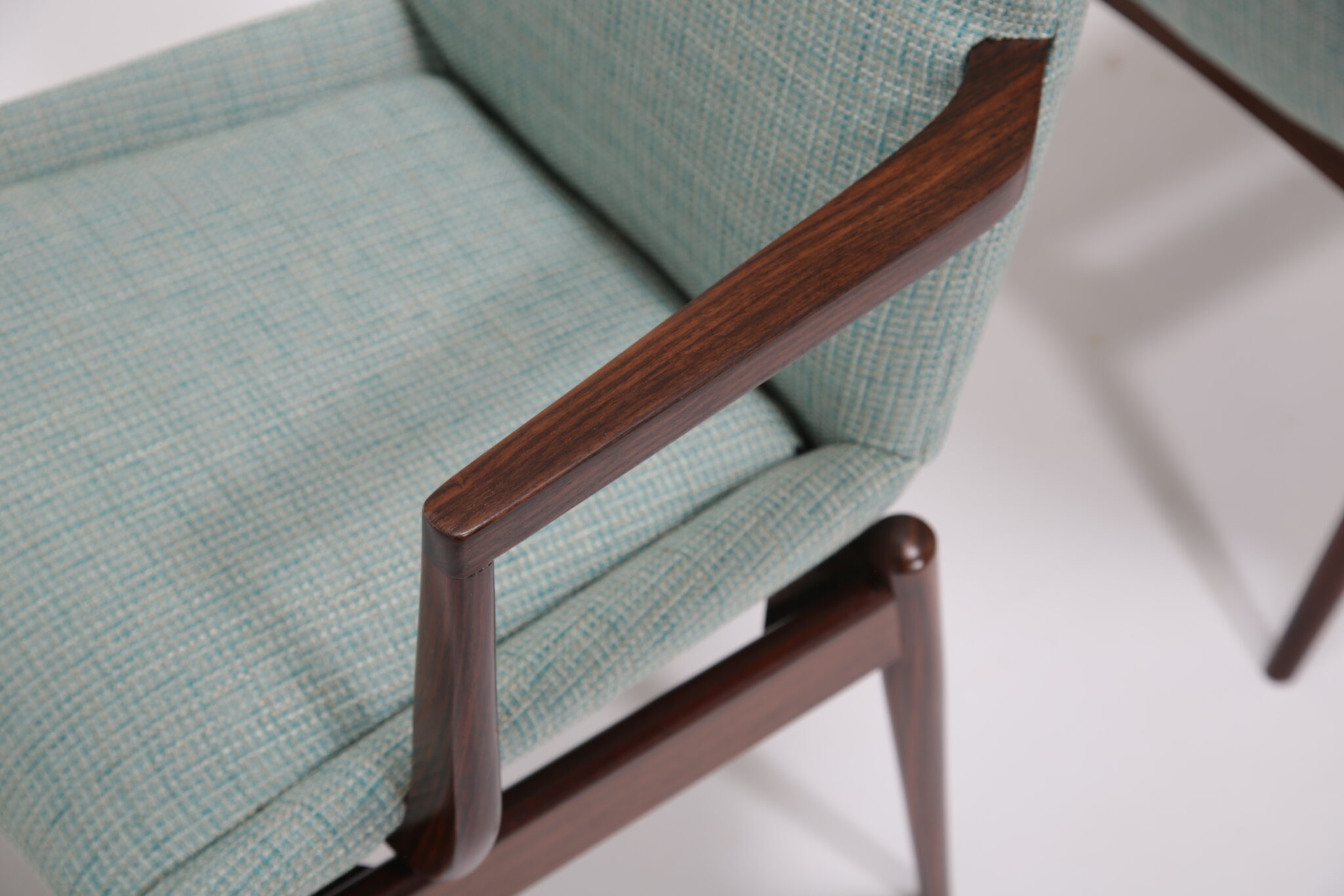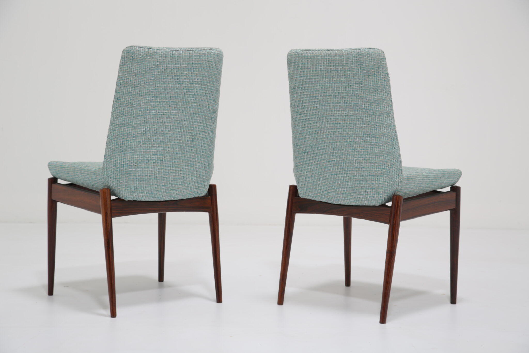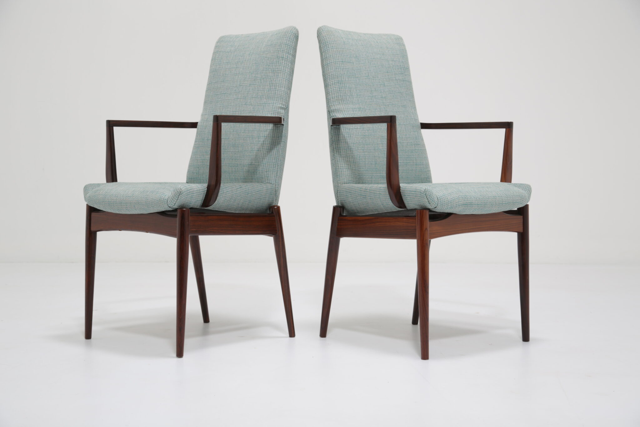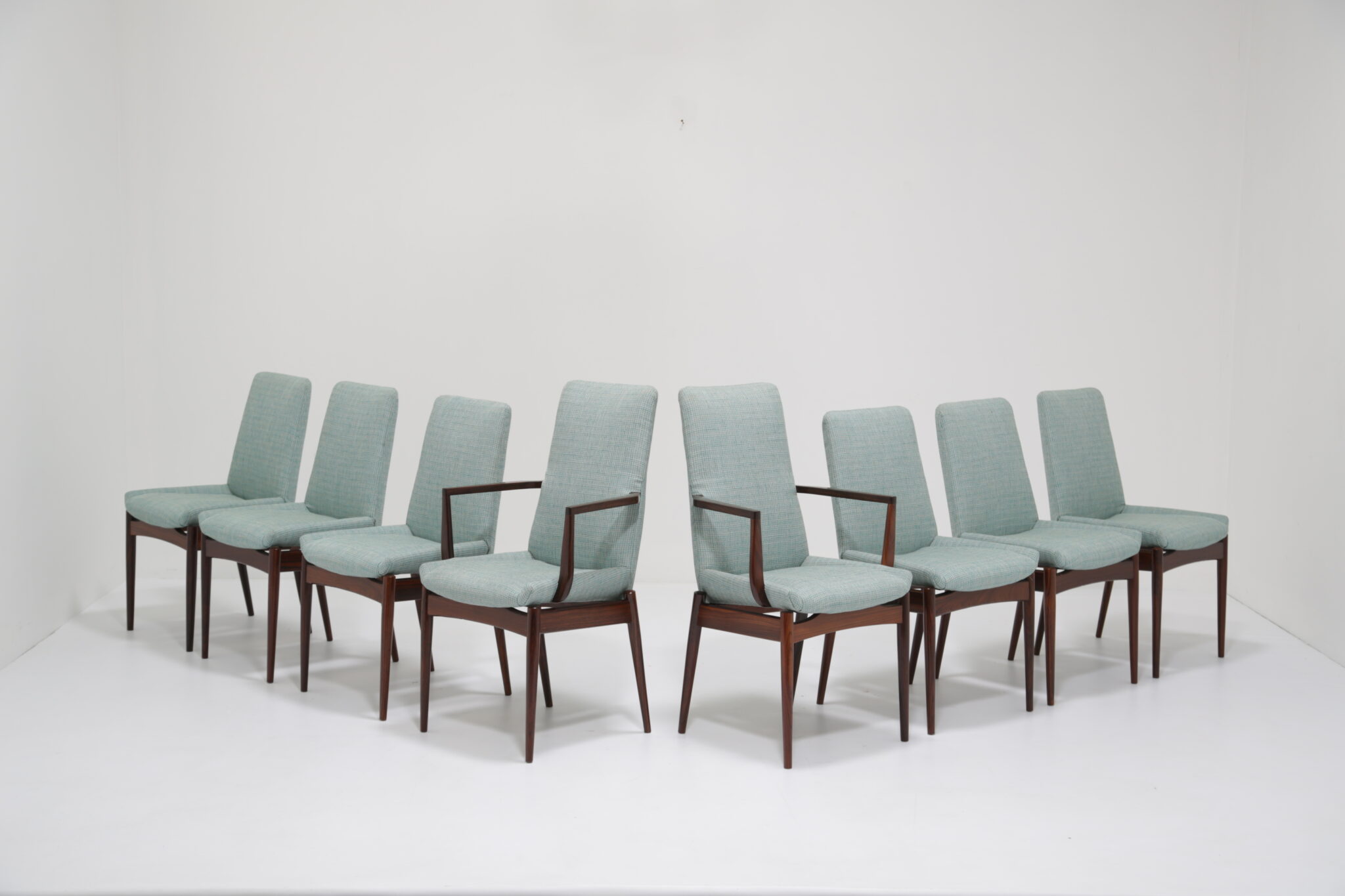 Designed by Robert Heritage, these chairs are truly magnificent with a beautiful profile and overall design. The upholstered seat, which we have done provides comfort and good support for the back and is perfect for long evenings at the dining table. The frames are manufactured in rosewood and has a lovely deep red tone with beautifully pronounced grain. The fabric is internally known here as “Chanel” which is a duck-egg blue tweed like fabric. This set was manufactured in the 1960s for Archie Shine in the United Kingdom and was sold under the model name “Hamilton”.