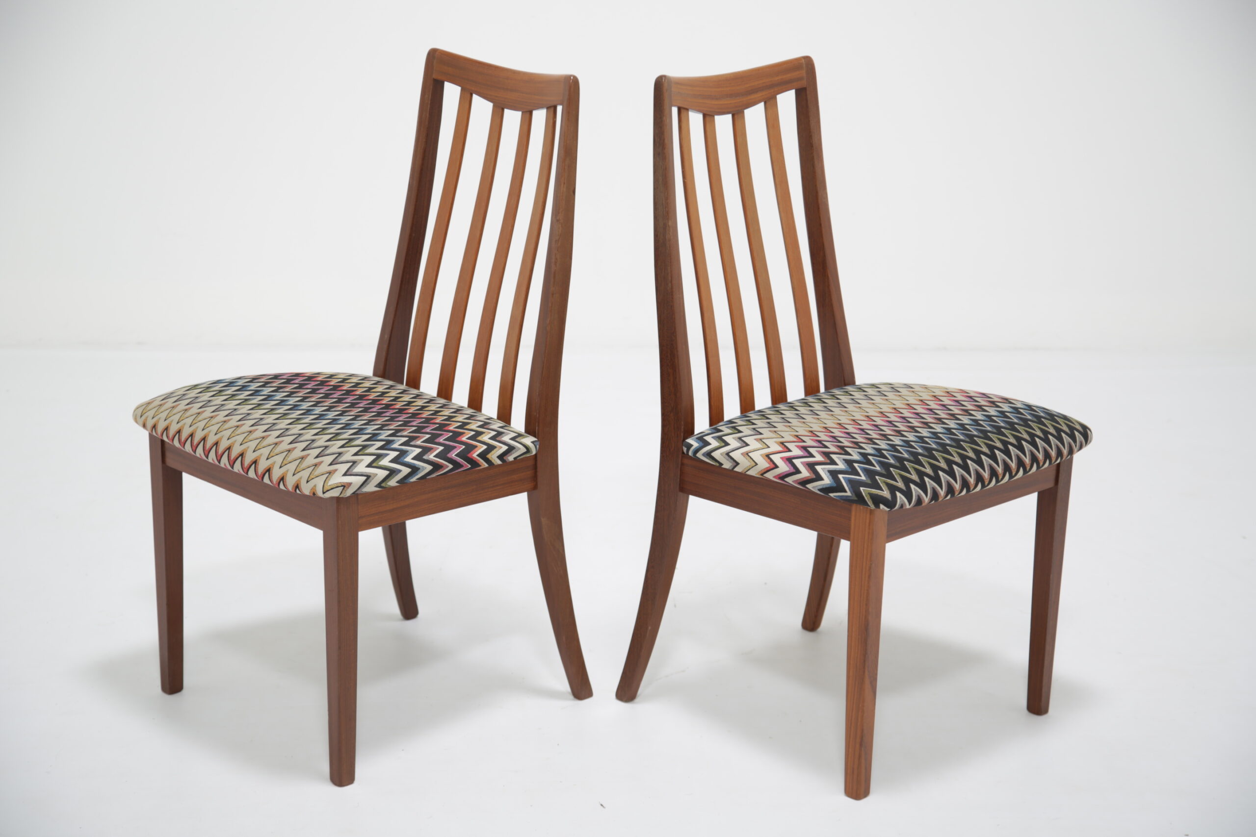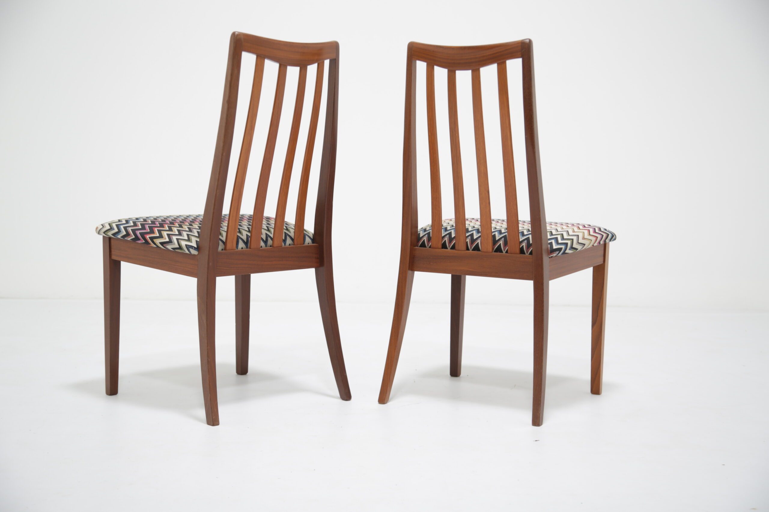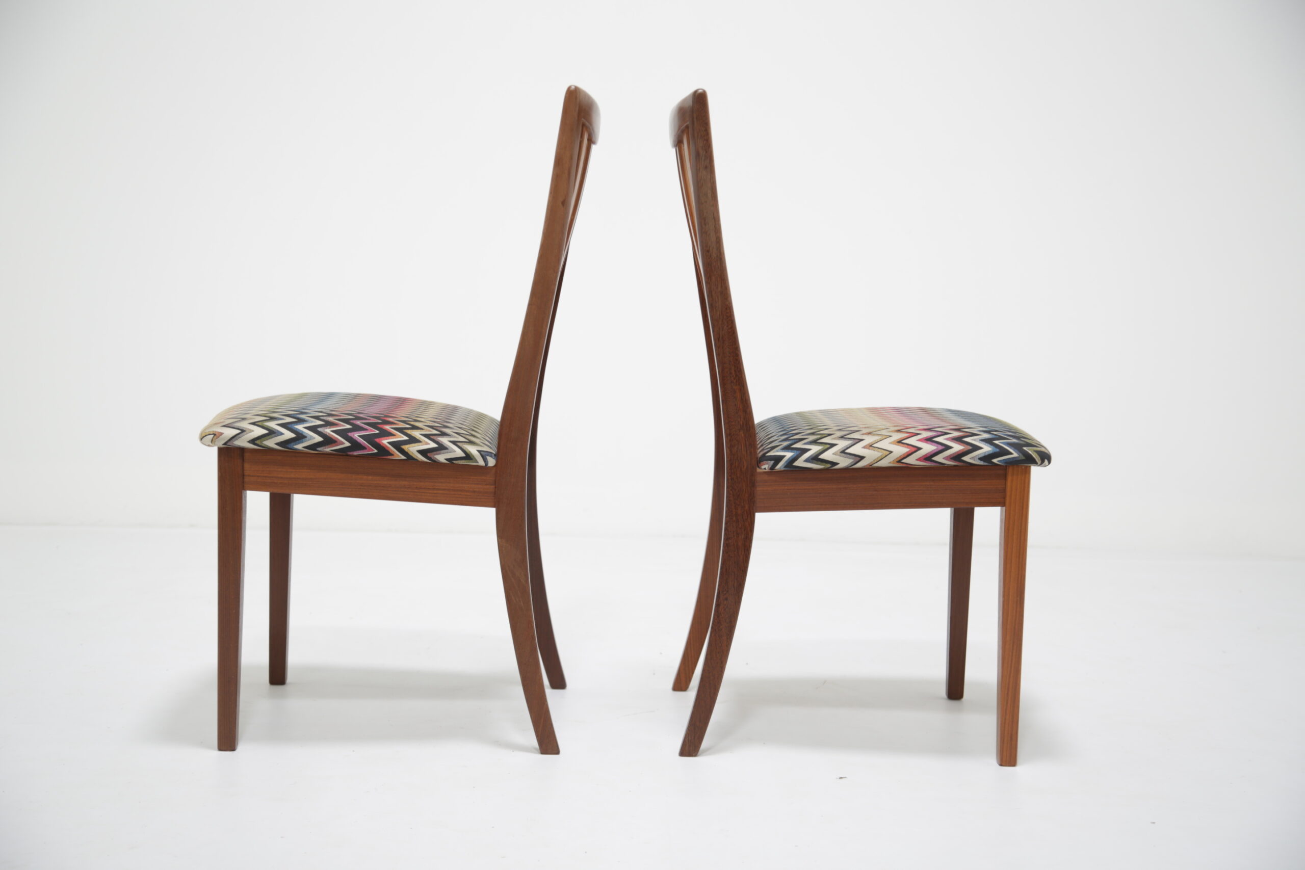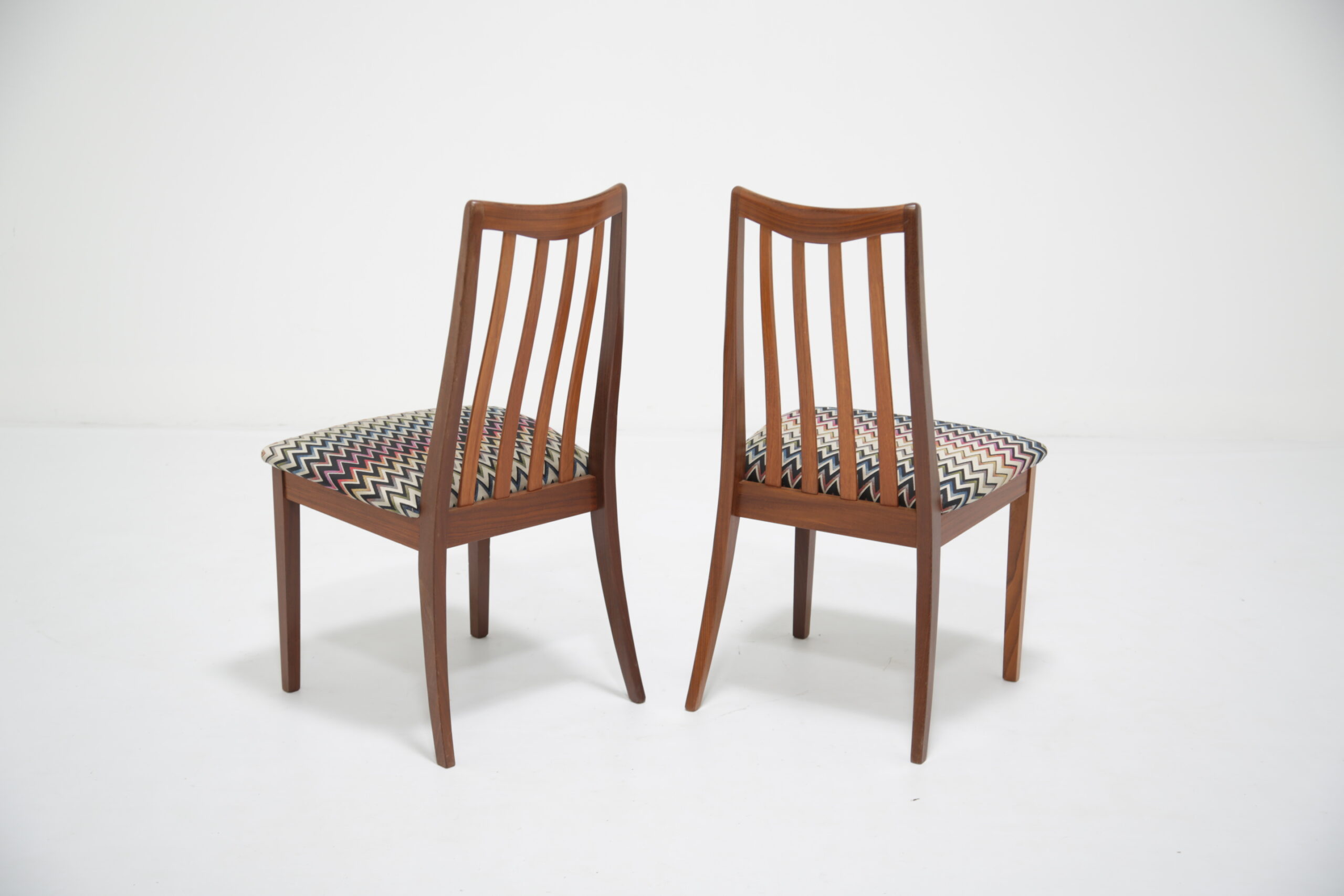 Elevate your dining space with this stunning set of four G-Plan Fresco dining chairs, a perfect blend of mid-century modern elegance and contemporary flair. Crafted from rich, warm teak wood, these iconic chairs are part of G-Plan’s celebrated Fresco range, known for its Scandinavian-inspired lines and timeless appeal. Each dining chair has been fully restored to what we call “the factory standard” and what we mean by that is that each chair should look like when they left the production line back in the 1960s. We have upholstered the seat pads in a funky wavy fabric, adding a vibrant pop of color that complements the teak’s natural grain.