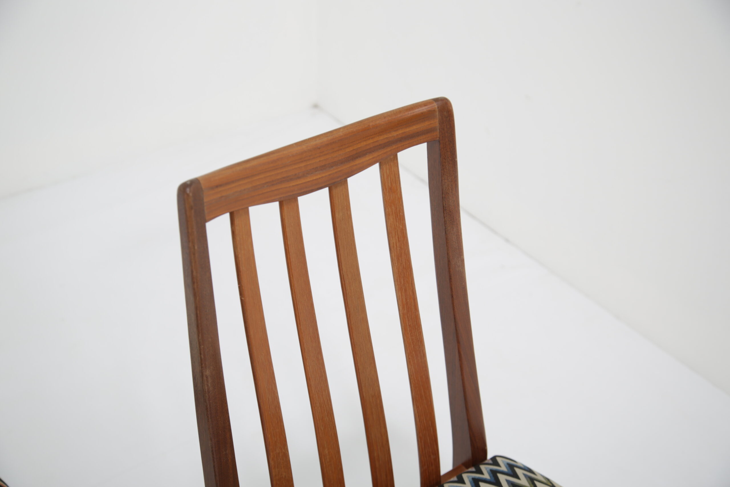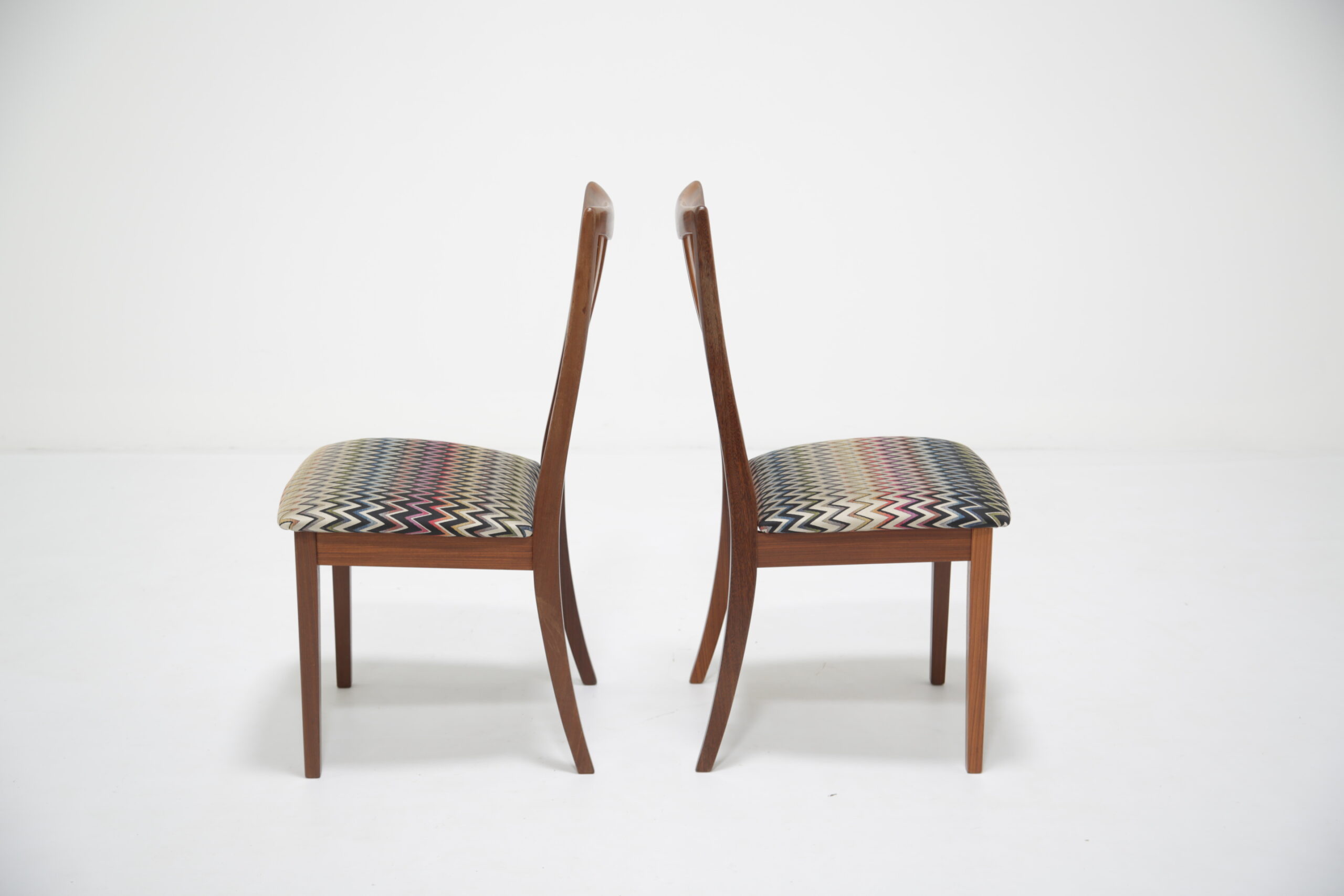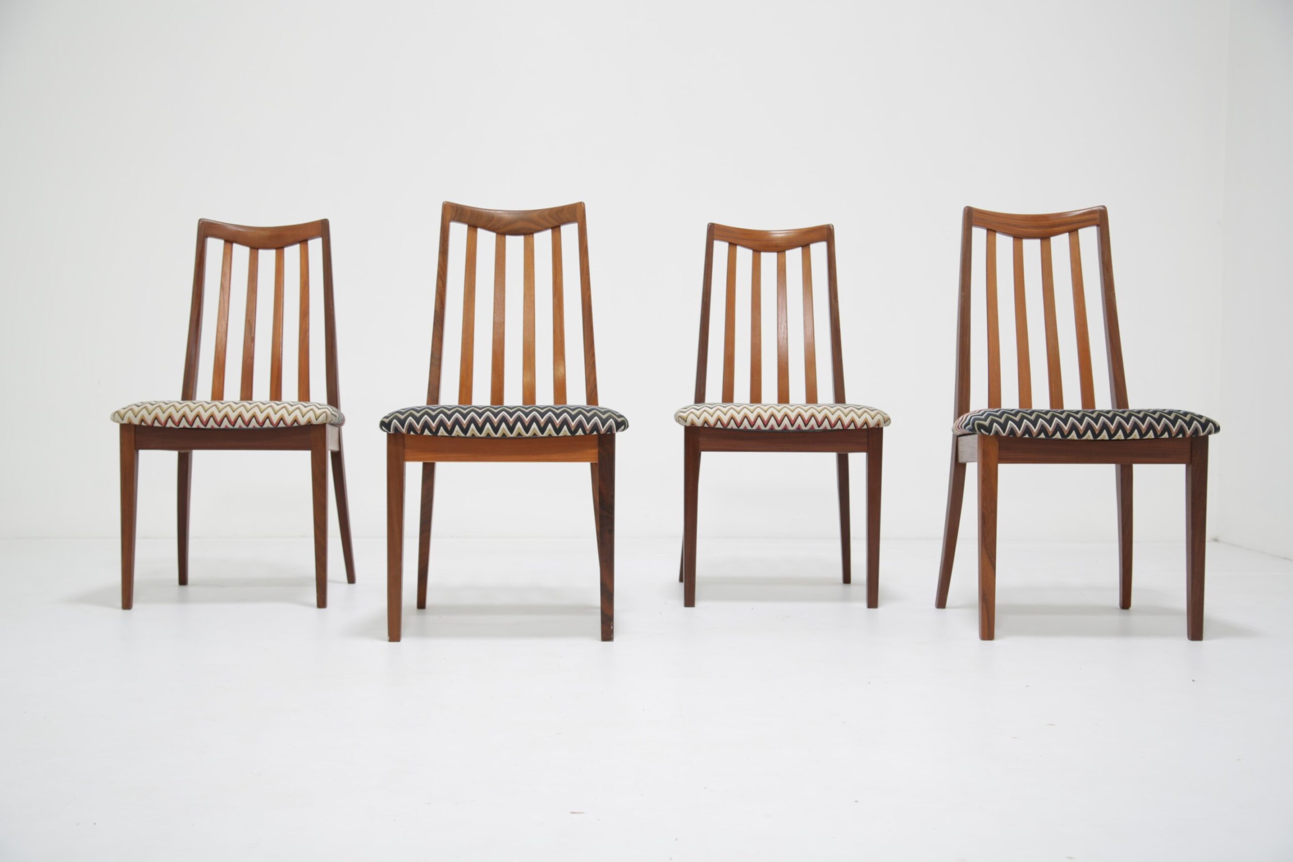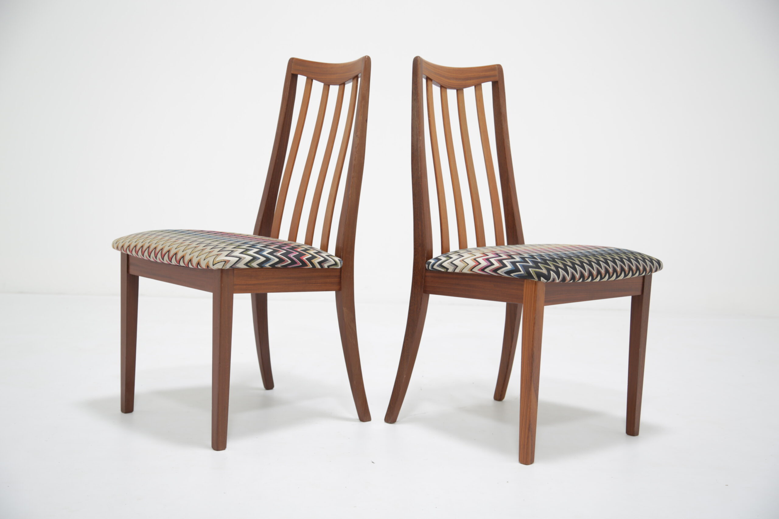 Elevate your dining space with this stunning set of four G-Plan Fresco dining chairs, a perfect blend of mid-century modern elegance and contemporary flair. Crafted from rich, warm teak wood, these iconic chairs are part of G-Plan’s celebrated Fresco range, known for its Scandinavian-inspired lines and timeless appeal. Each dining chair has been fully restored to what we call “the factory standard” and what we mean by that is that each chair should look like when they left the production line back in the 1960s. We have upholstered the seat pads in a funky wavy fabric, adding a vibrant pop of color that complements the teak’s natural grain.