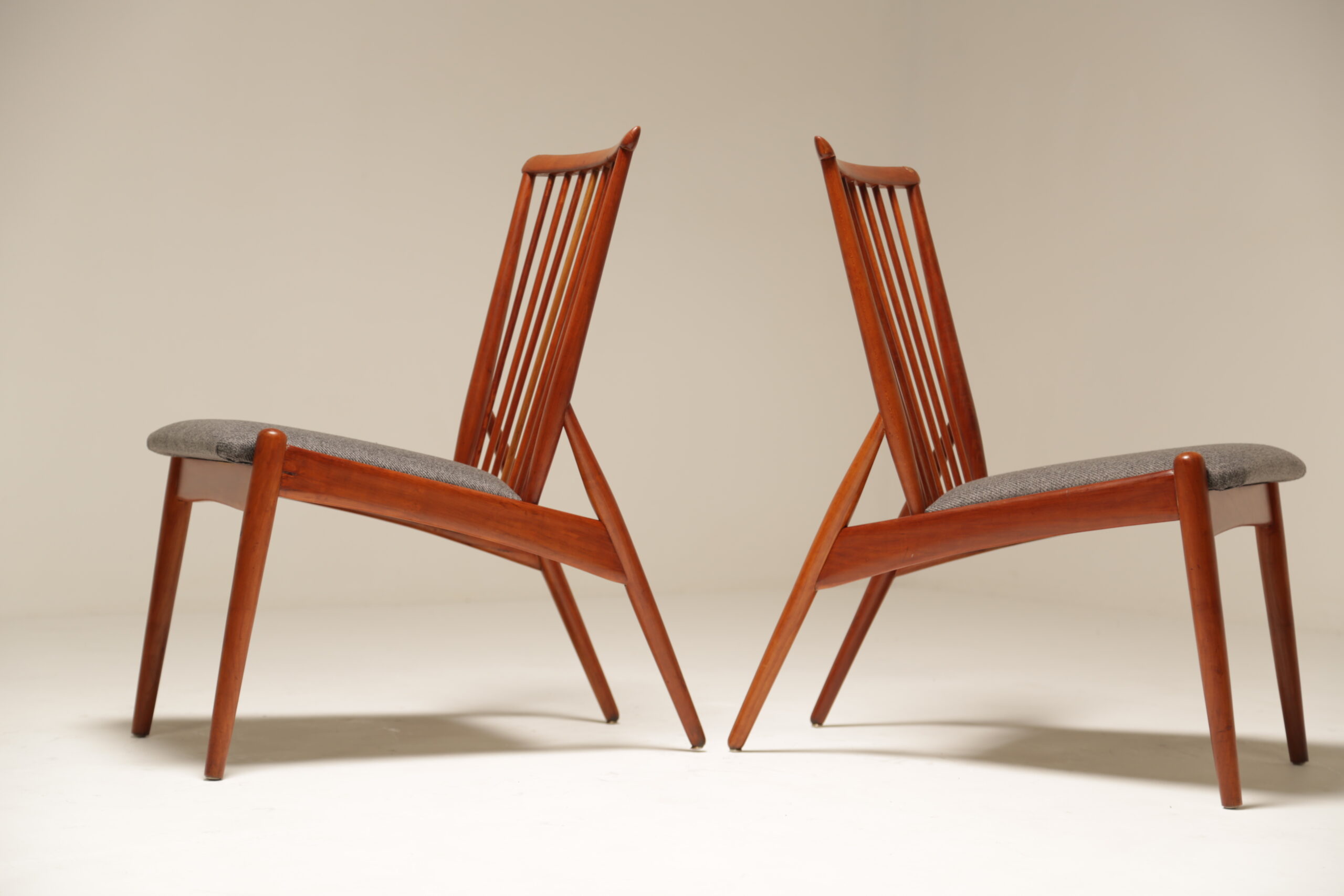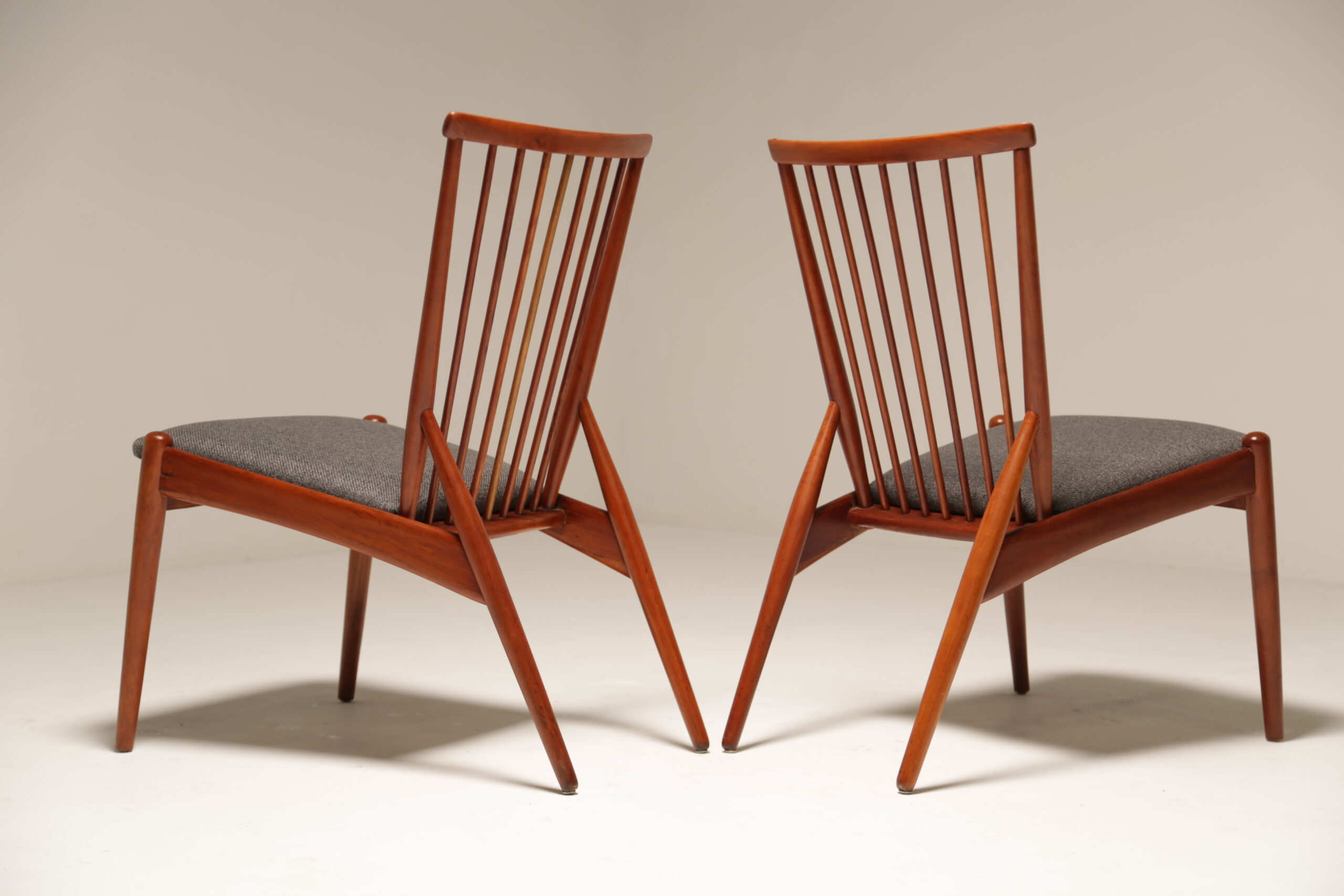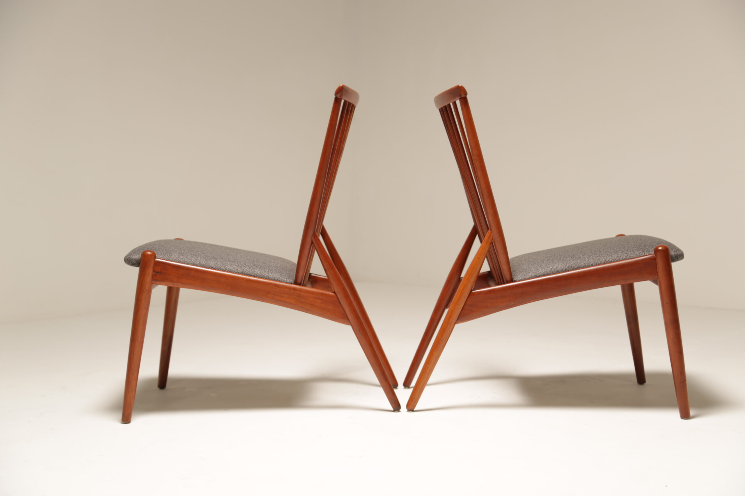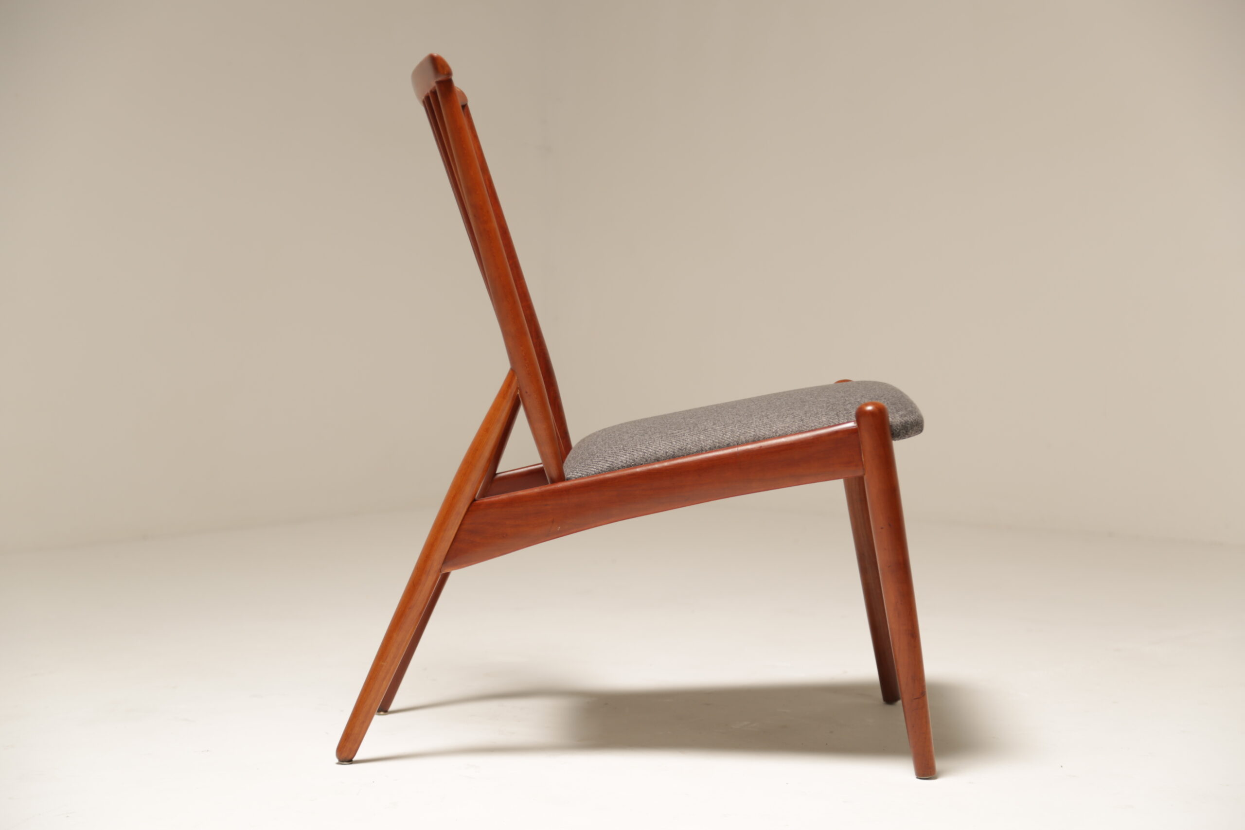 Pair of occasional chairs in teak, upholstered in a modern grey fabric for style and convenience. An occasional chair is just that – a chair that is used occasionally, though this is not to detract from its importance. This is a chair that can be moved from room to room when required and is perfect when you find yourself with an excess of guests to entertain.