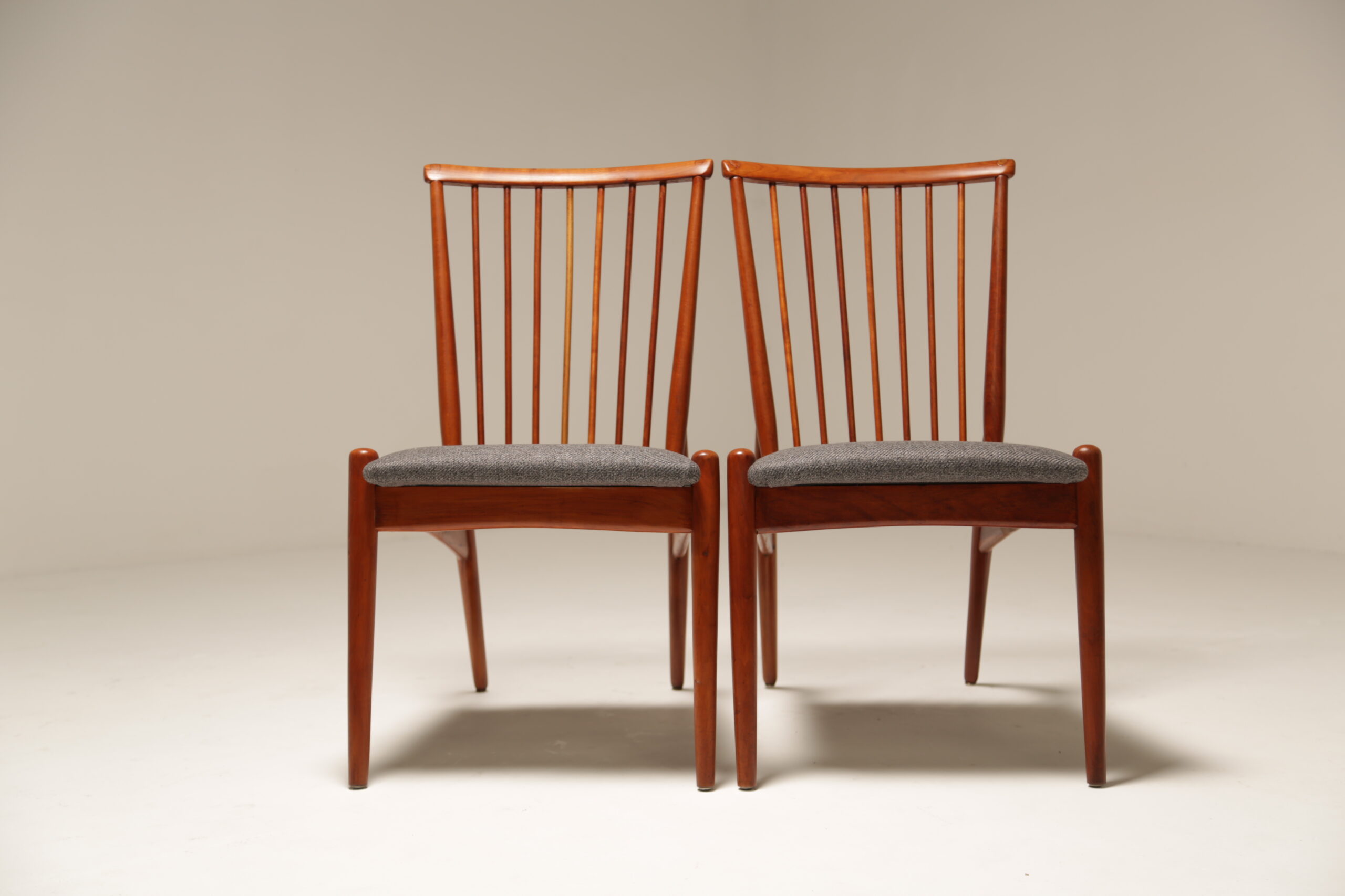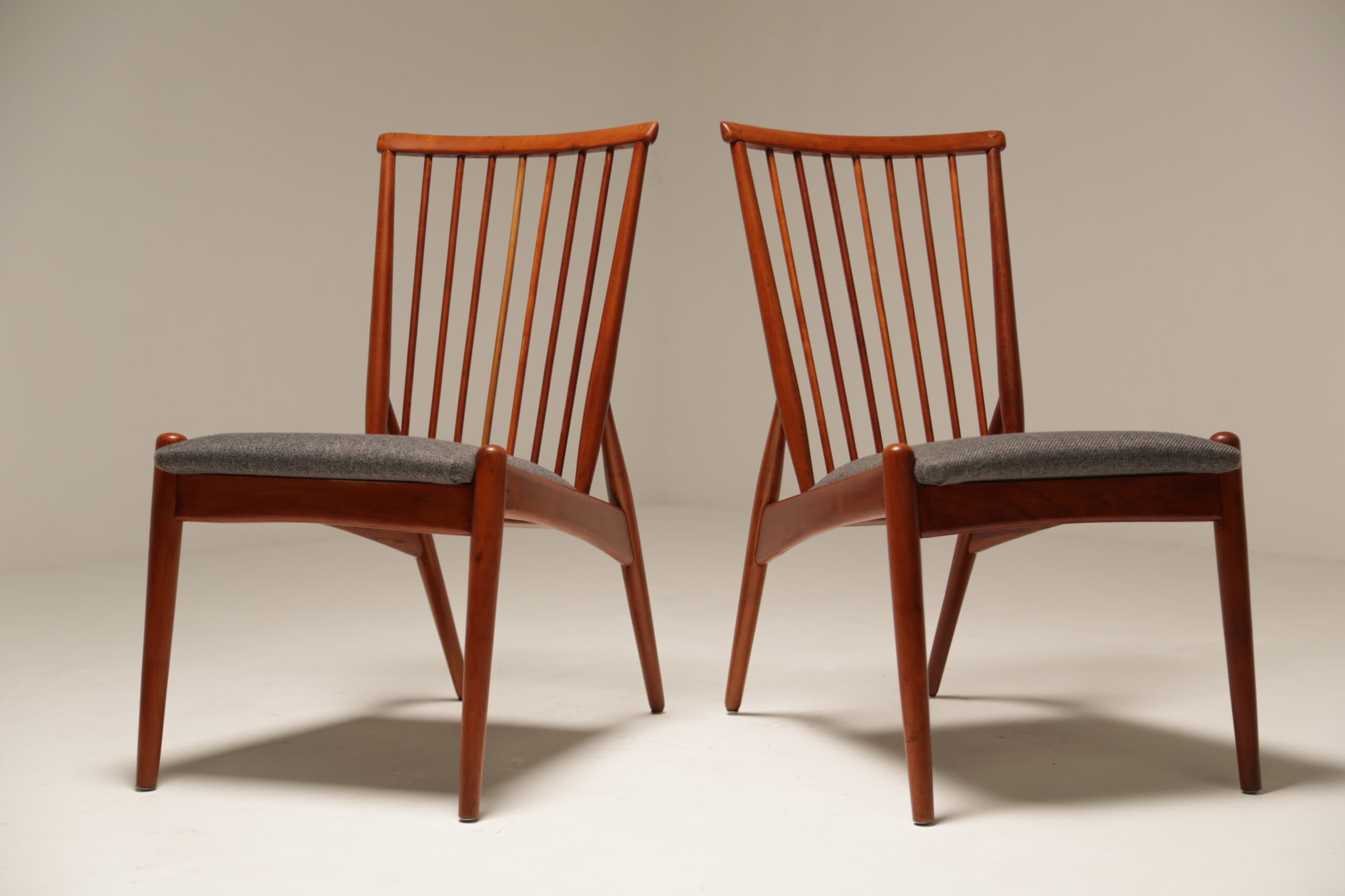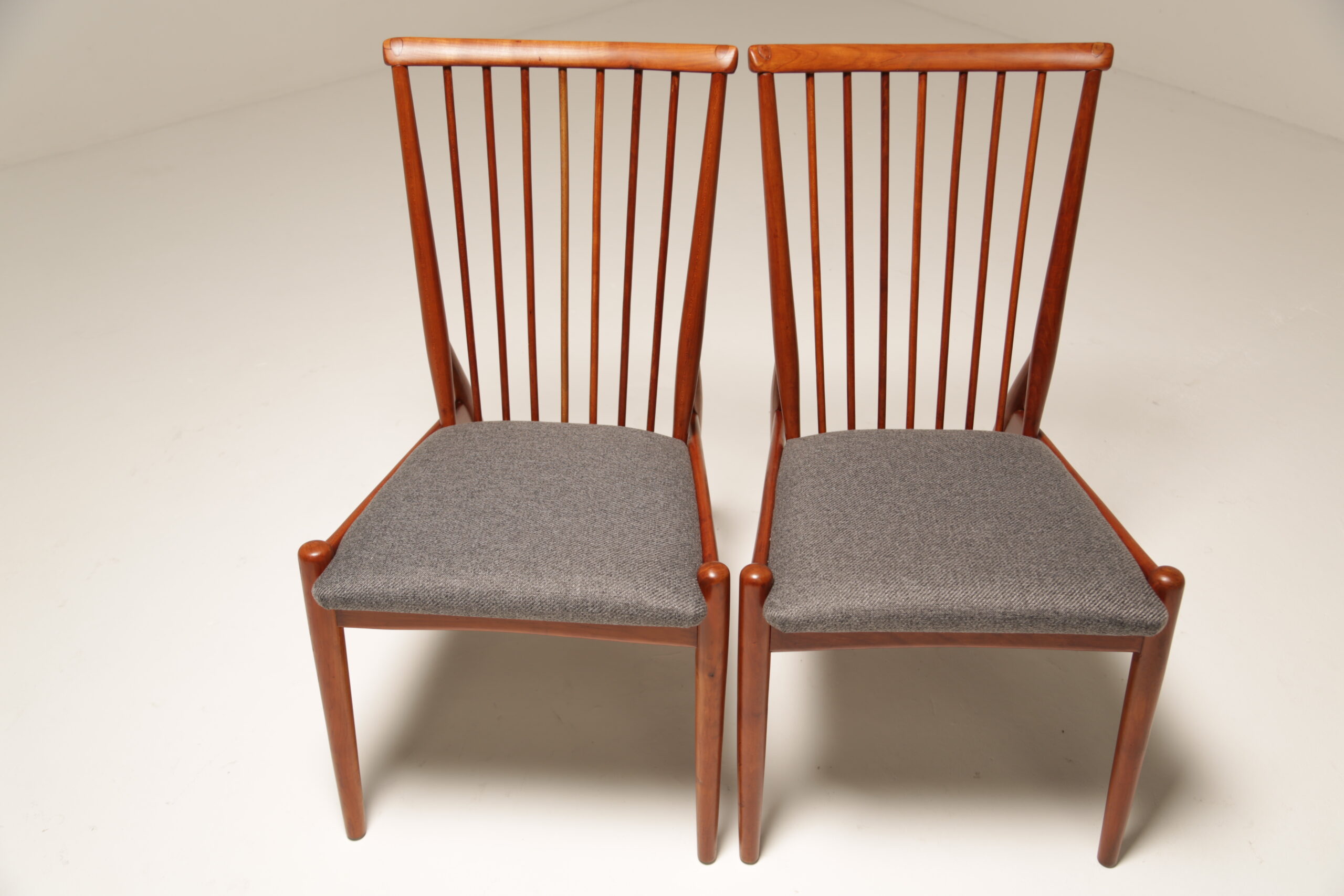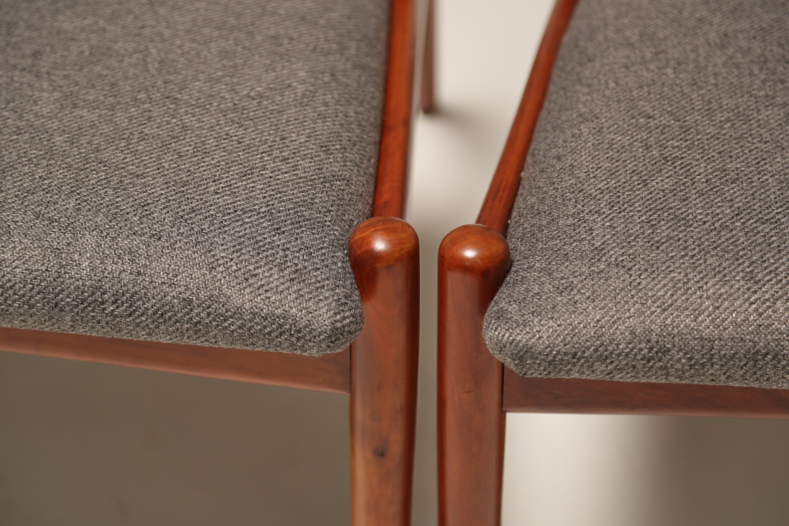 Pair of occasional chairs in teak, upholstered in a modern grey fabric for style and convenience. An occasional chair is just that – a chair that is used occasionally, though this is not to detract from its importance. This is a chair that can be moved from room to room when required and is perfect when you find yourself with an excess of guests to entertain.