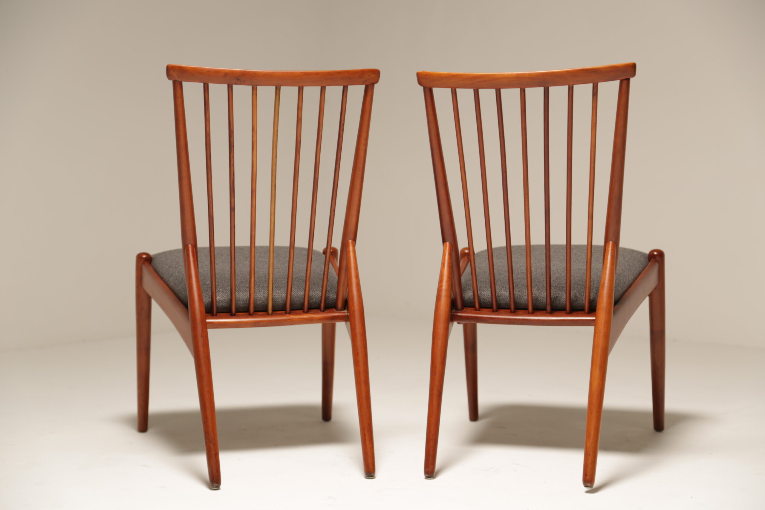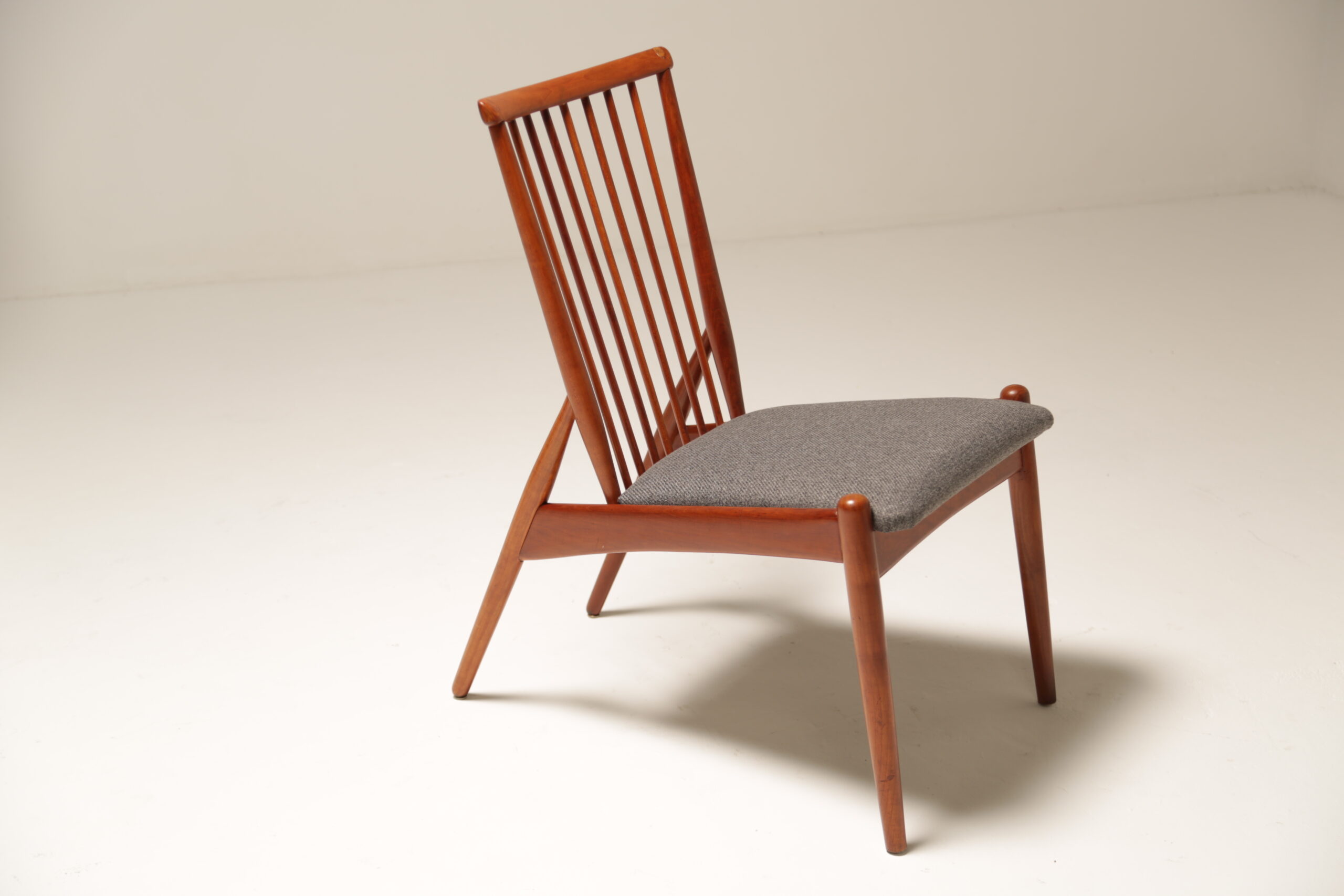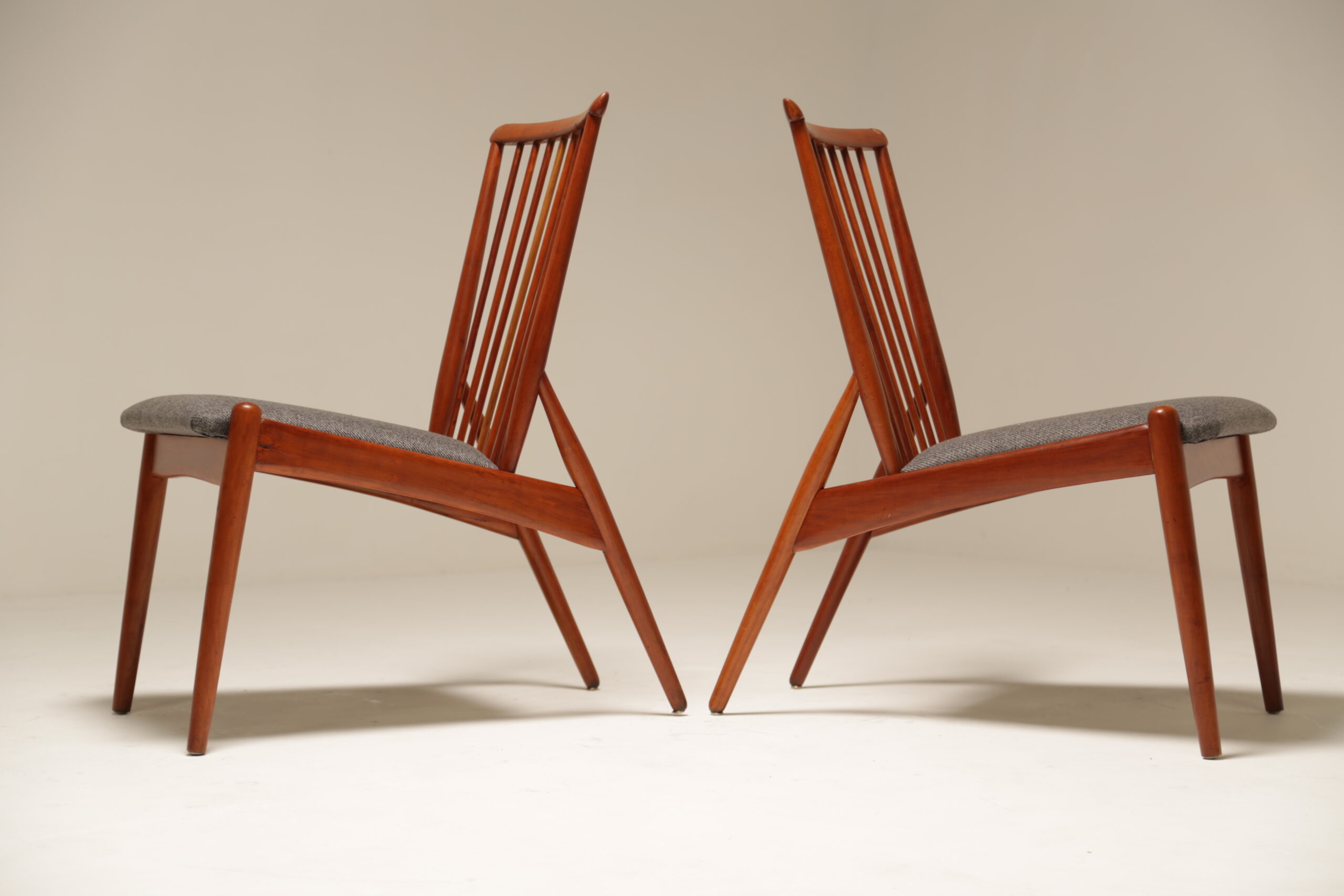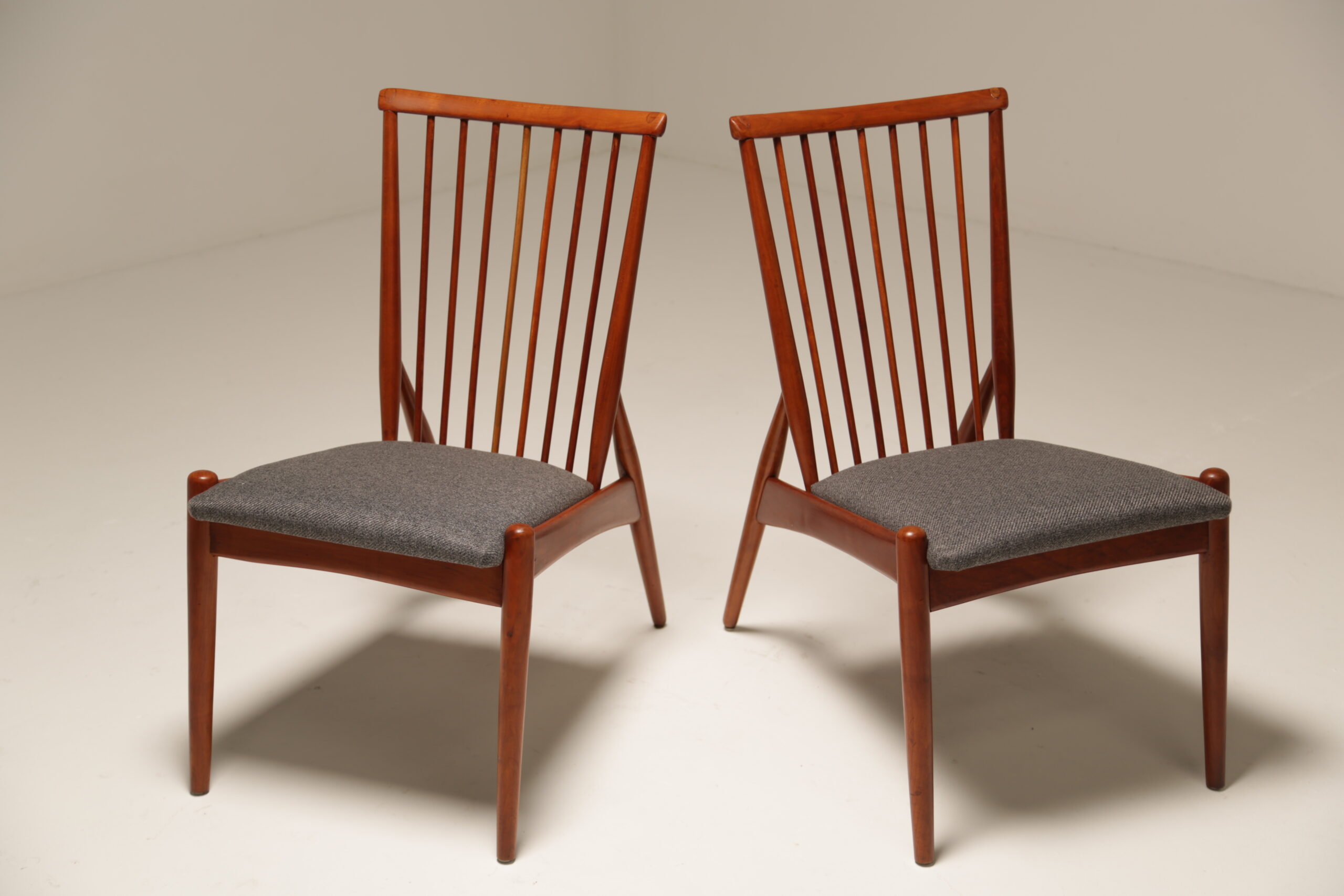 Pair of occasional chairs in teak, upholstered in a modern grey fabric for style and convenience. An occasional chair is just that – a chair that is used occasionally, though this is not to detract from its importance. This is a chair that can be moved from room to room when required and is perfect when you find yourself with an excess of guests to entertain.