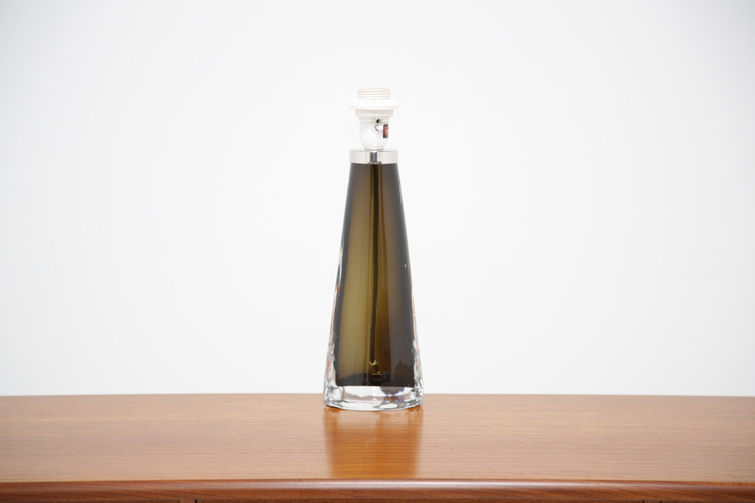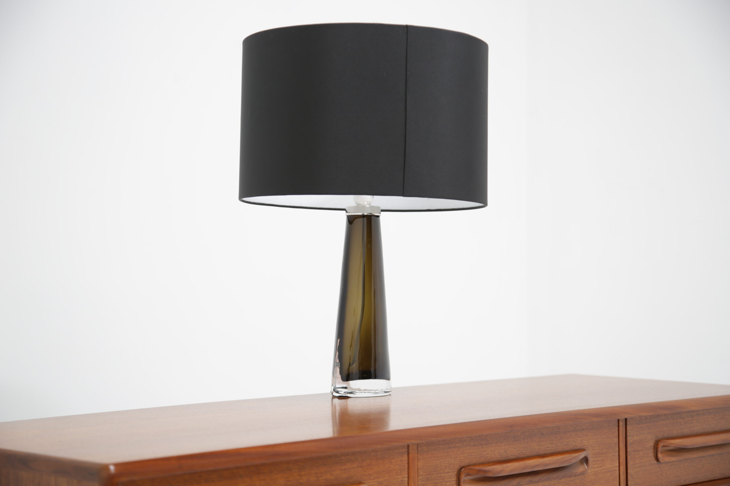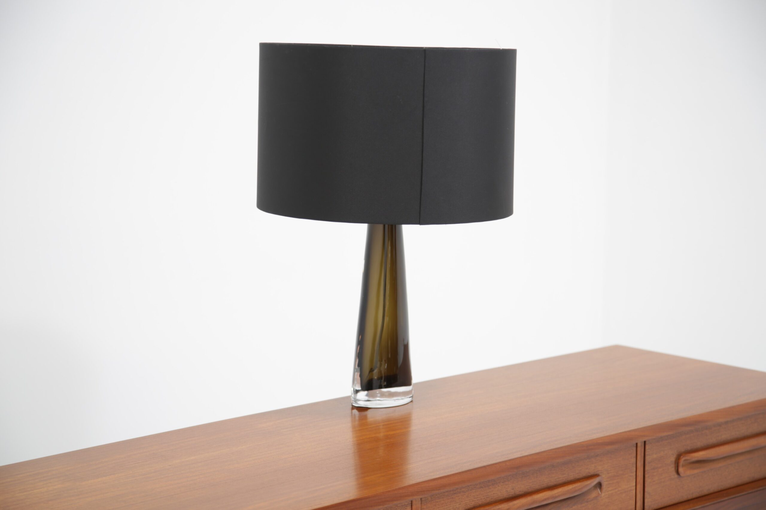 Carl Fagerlund is a popular household name in Sweden and has gained world-wide attention for his interesting table and ceiling lamps, often manufactured with interesting colors and shapes. This table lamp is no different, featuring a triangular tapered form in an olive green and clear glass that is heavy. We have paired the lamp with a modern black fabric shade. The lamp is signed on the base and includes the original sticker from Orrefors. Absolutely stunning lamp that will add a vintage charm to any interior.
