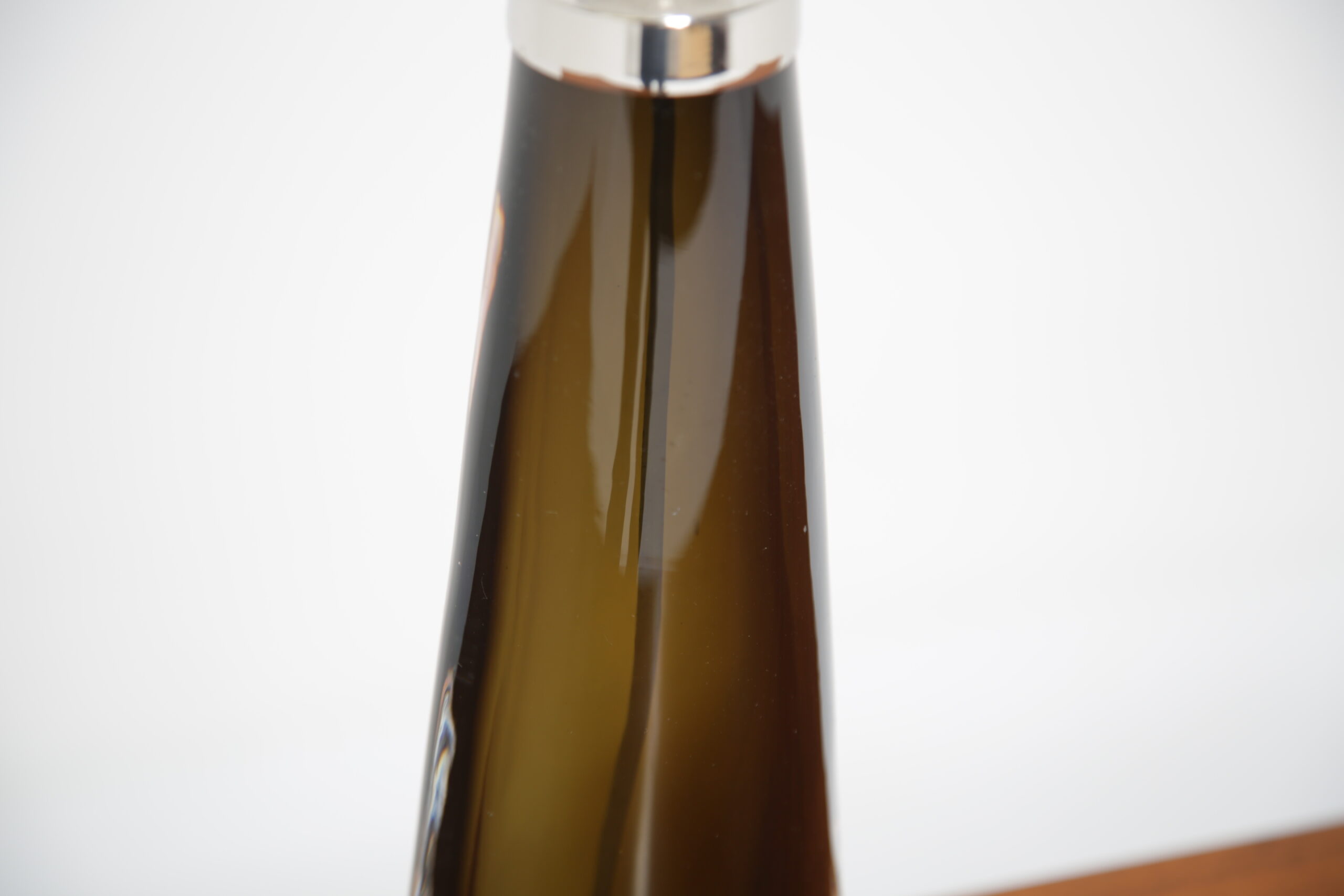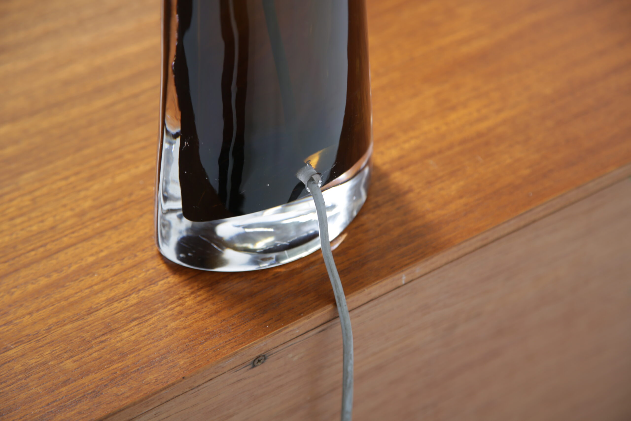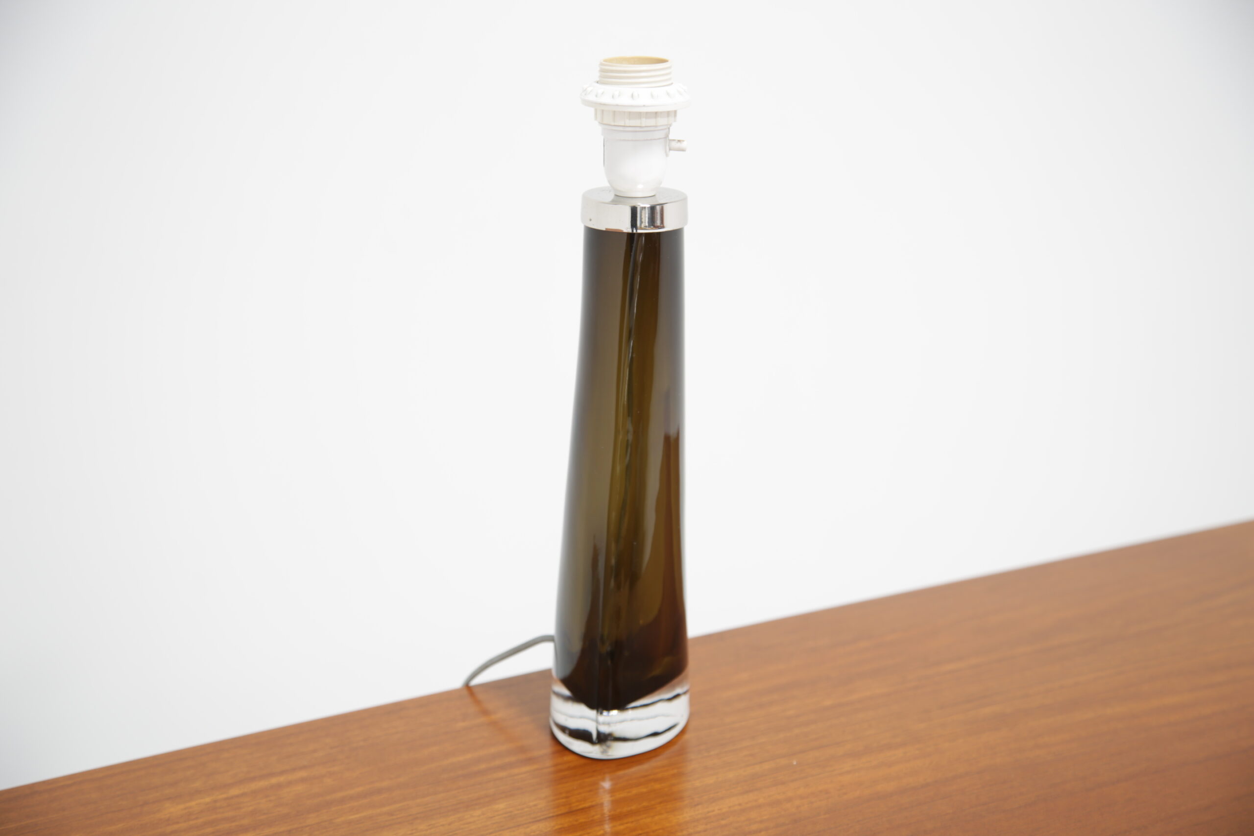 Carl Fagerlund is a popular household name in Sweden and has gained world-wide attention for his interesting table and ceiling lamps, often manufactured with interesting colors and shapes. This table lamp is no different, featuring a triangular tapered form in an olive green and clear glass that is heavy. We have paired the lamp with a modern black fabric shade. The lamp is signed on the base and includes the original sticker from Orrefors. Absolutely stunning lamp that will add a vintage charm to any interior.