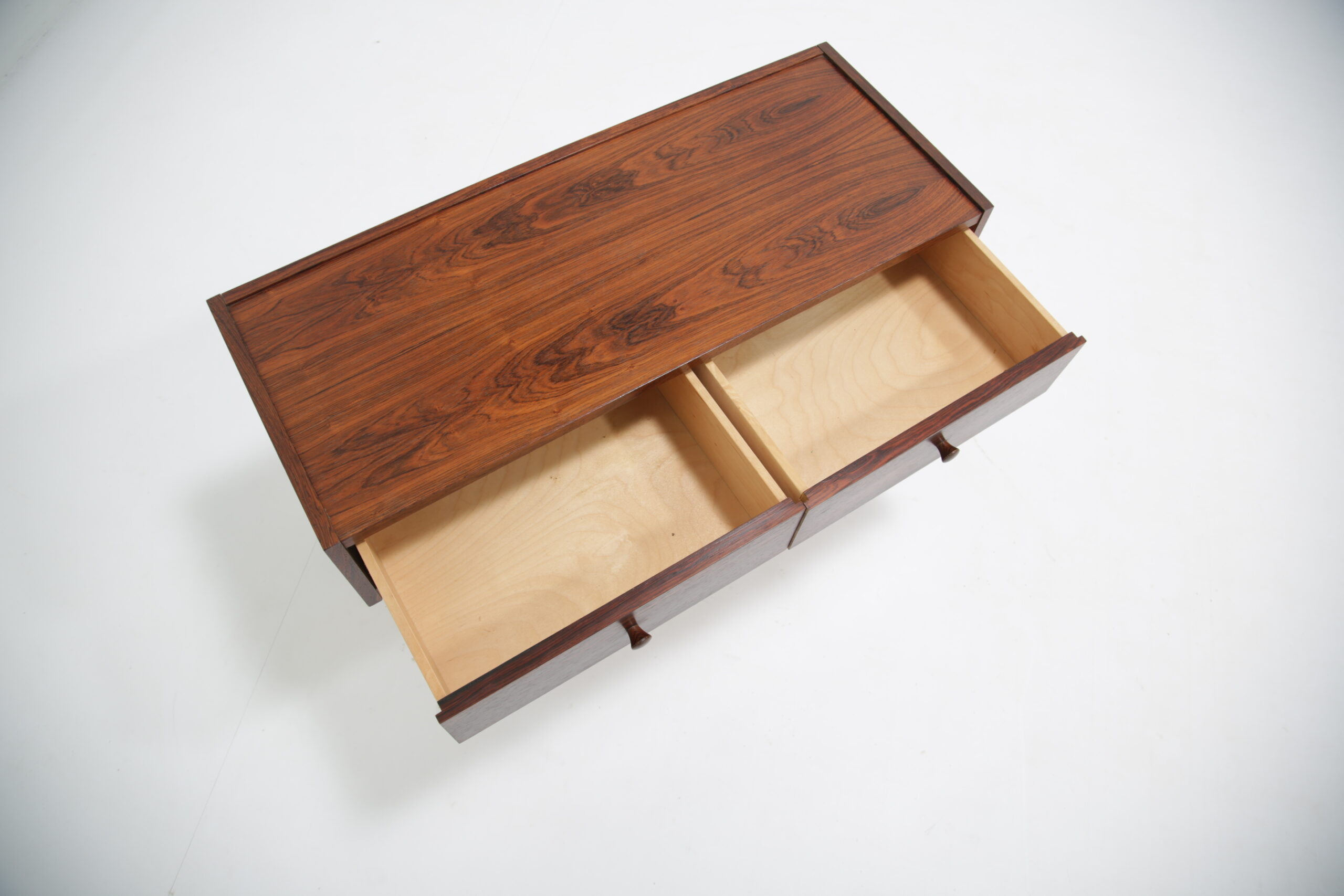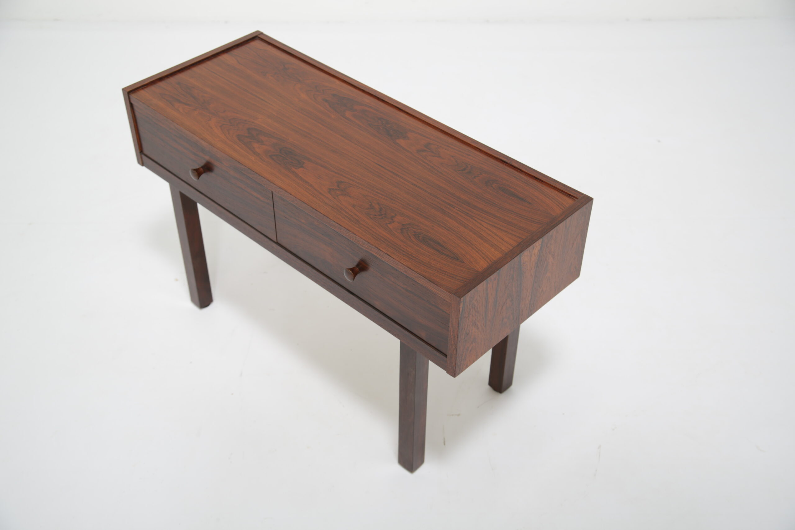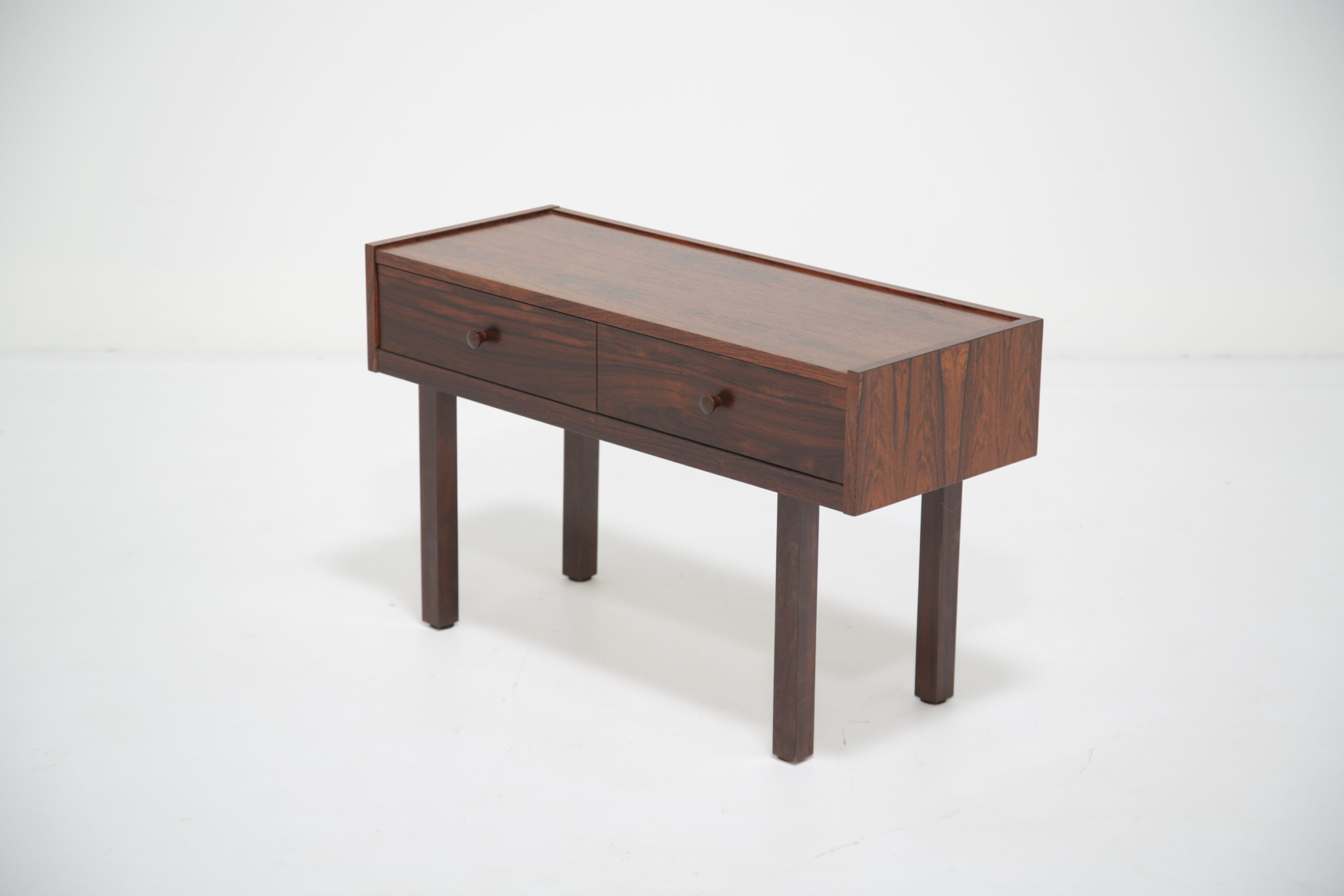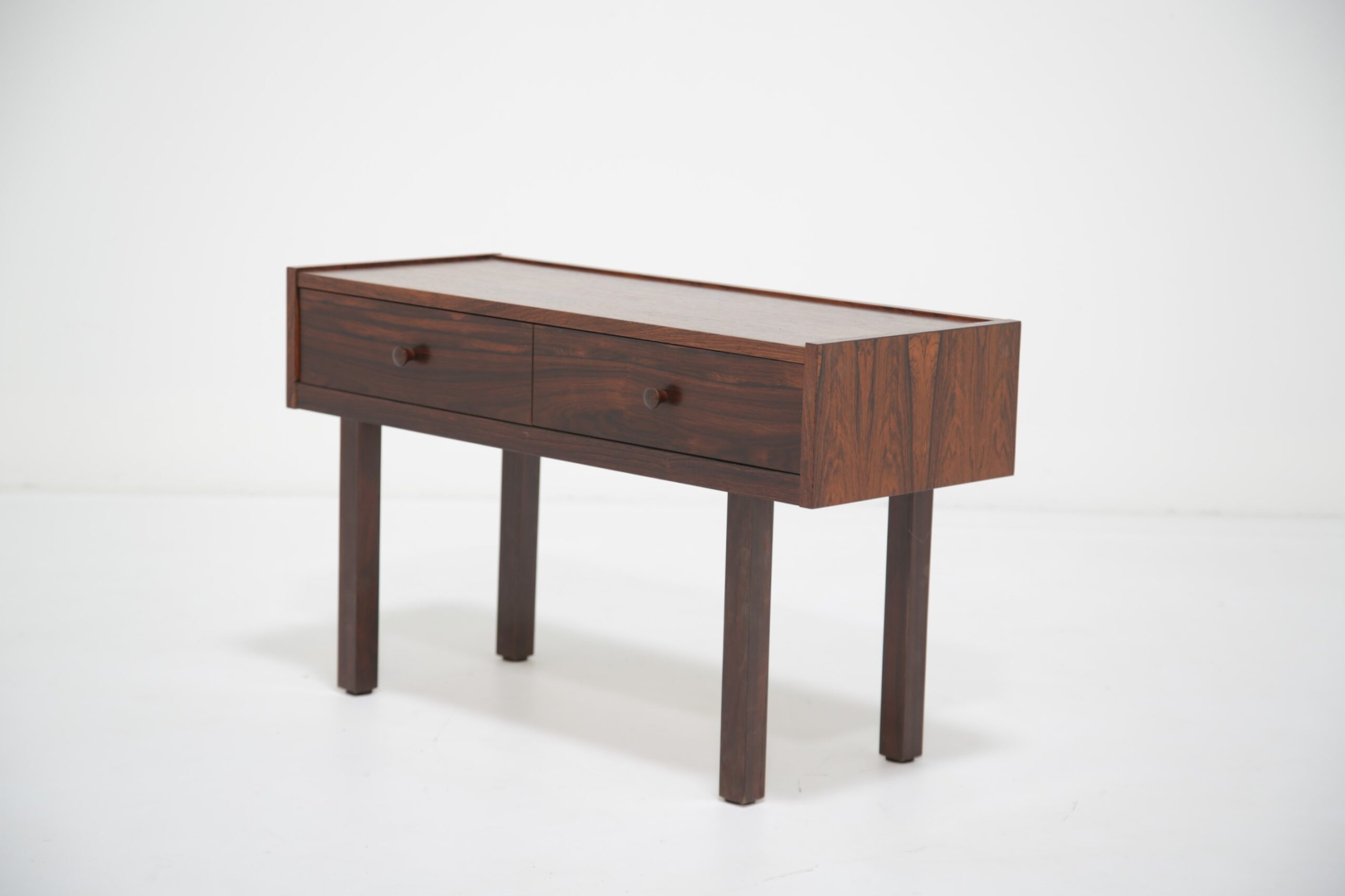 Just added to our collection is this minimalist design two drawer unit manufactured in rosewood with a beautiful dark and pronounced grain with lovely turned knob handles. These types of units are often seen in hallways or living rooms and is often used to hold a table lamp and to store miscellaneous items such as keys, candles, batteries and the like, however, the choice on how to dress it and what to store is up to you. Label on the back reads “Slutarp” which stands for Slutarps Mobelindustri.