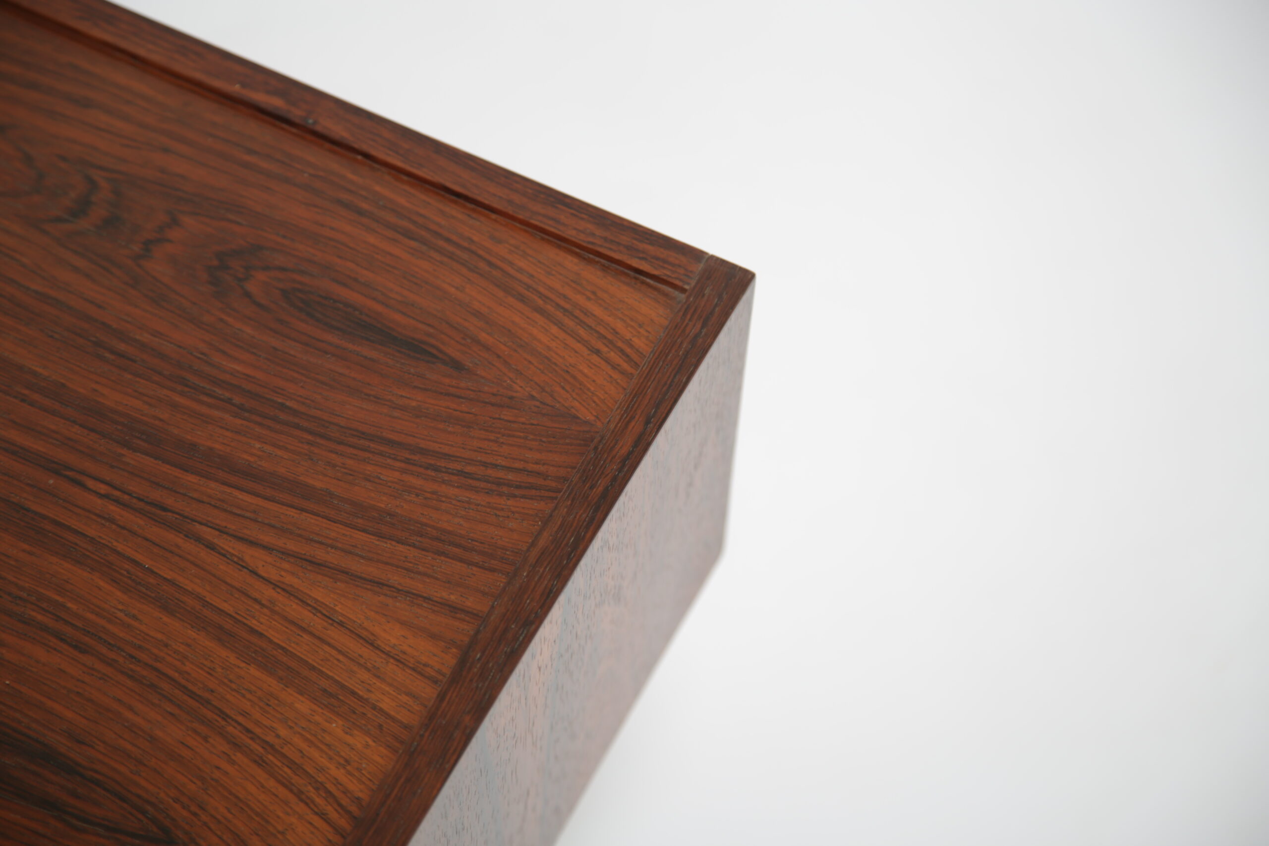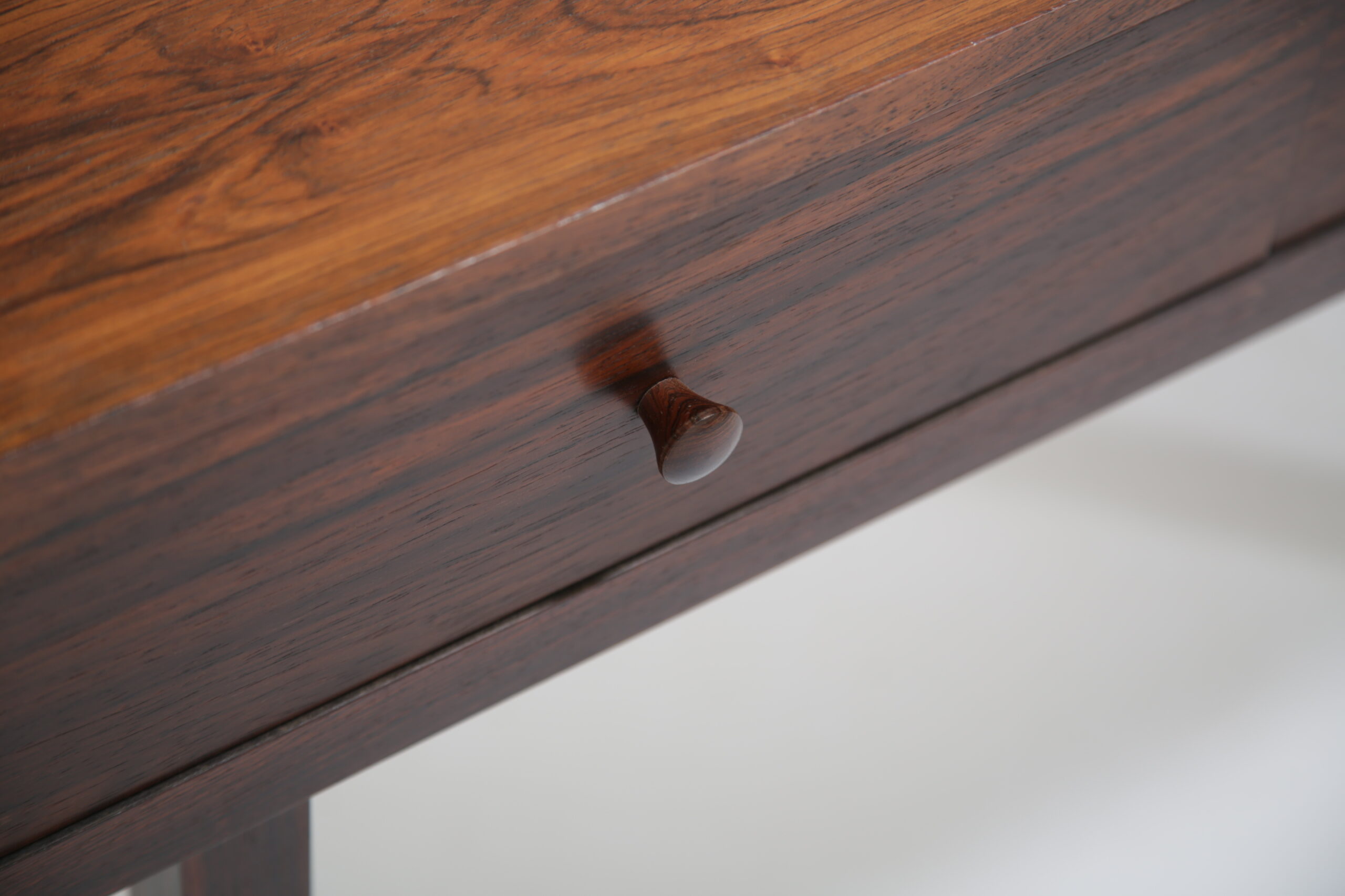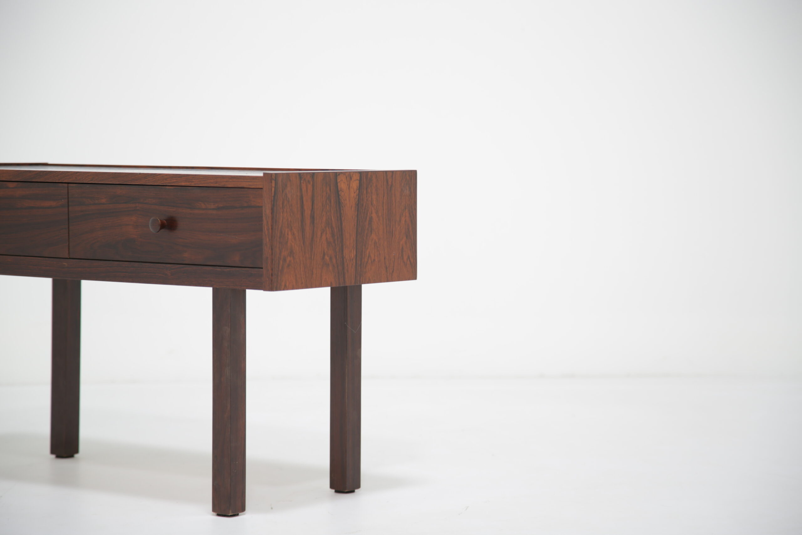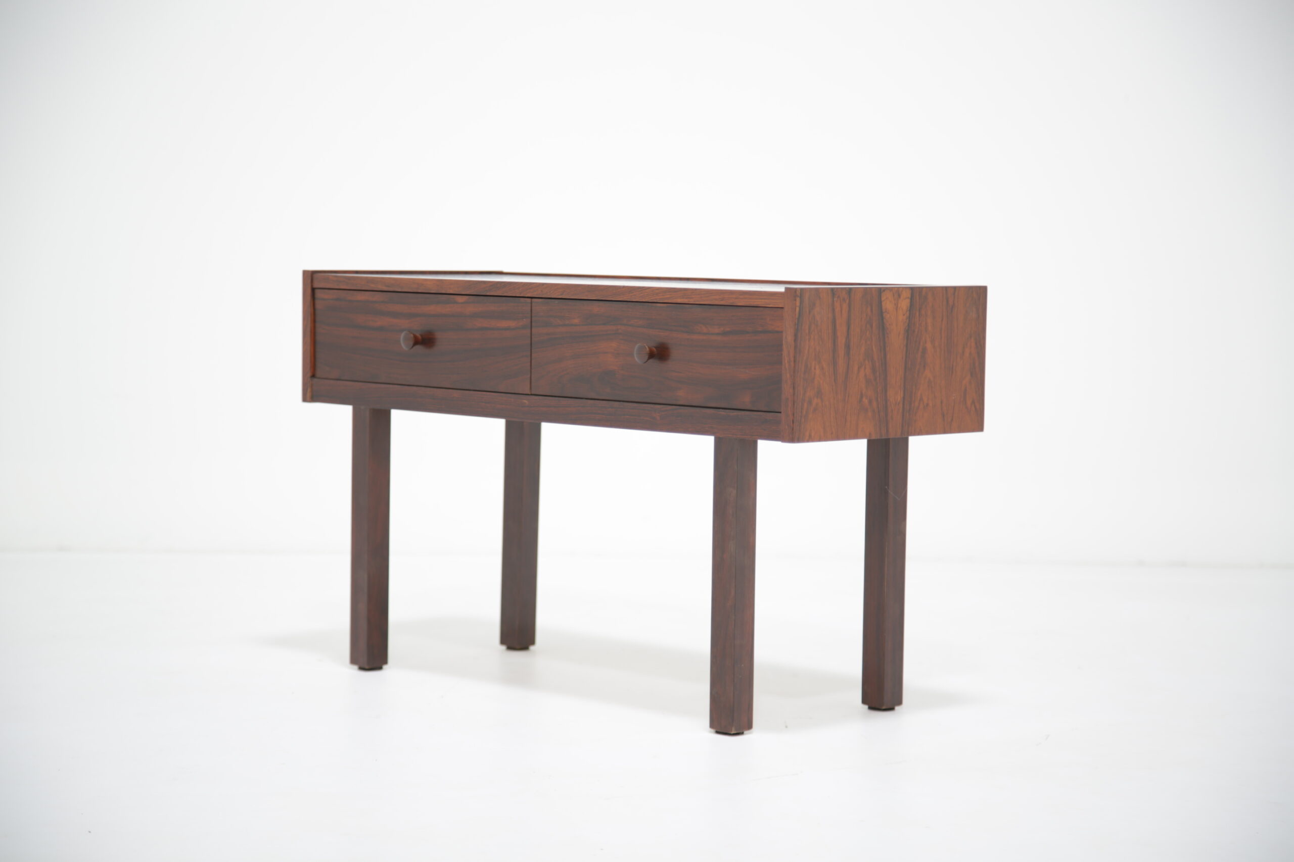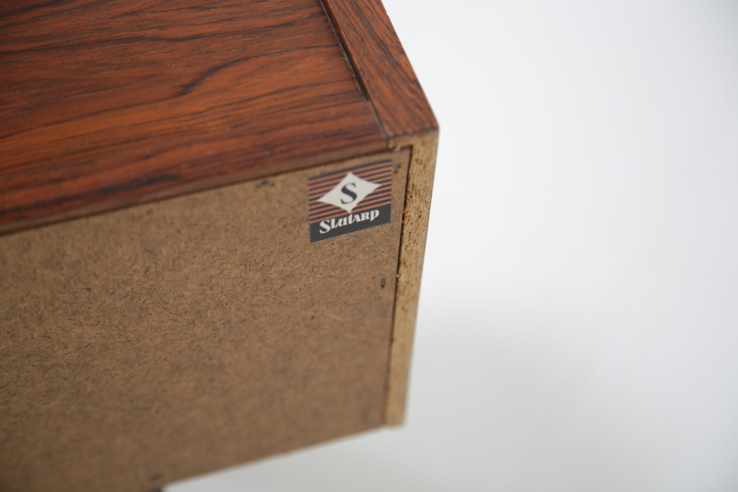 Just added to our collection is this minimalist design two drawer unit manufactured in rosewood with a beautiful dark and pronounced grain with lovely turned knob handles. These types of units are often seen in hallways or living rooms and is often used to hold a table lamp and to store miscellaneous items such as keys, candles, batteries and the like, however, the choice on how to dress it and what to store is up to you. Label on the back reads “Slutarp” which stands for Slutarps Mobelindustri.