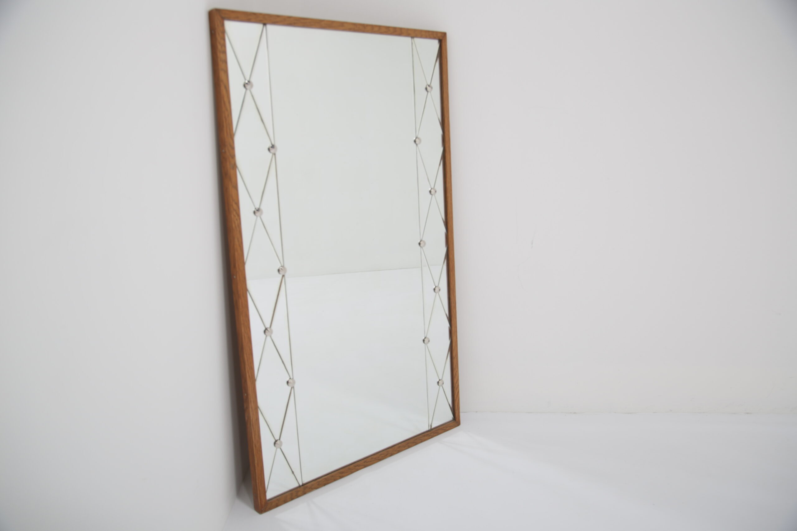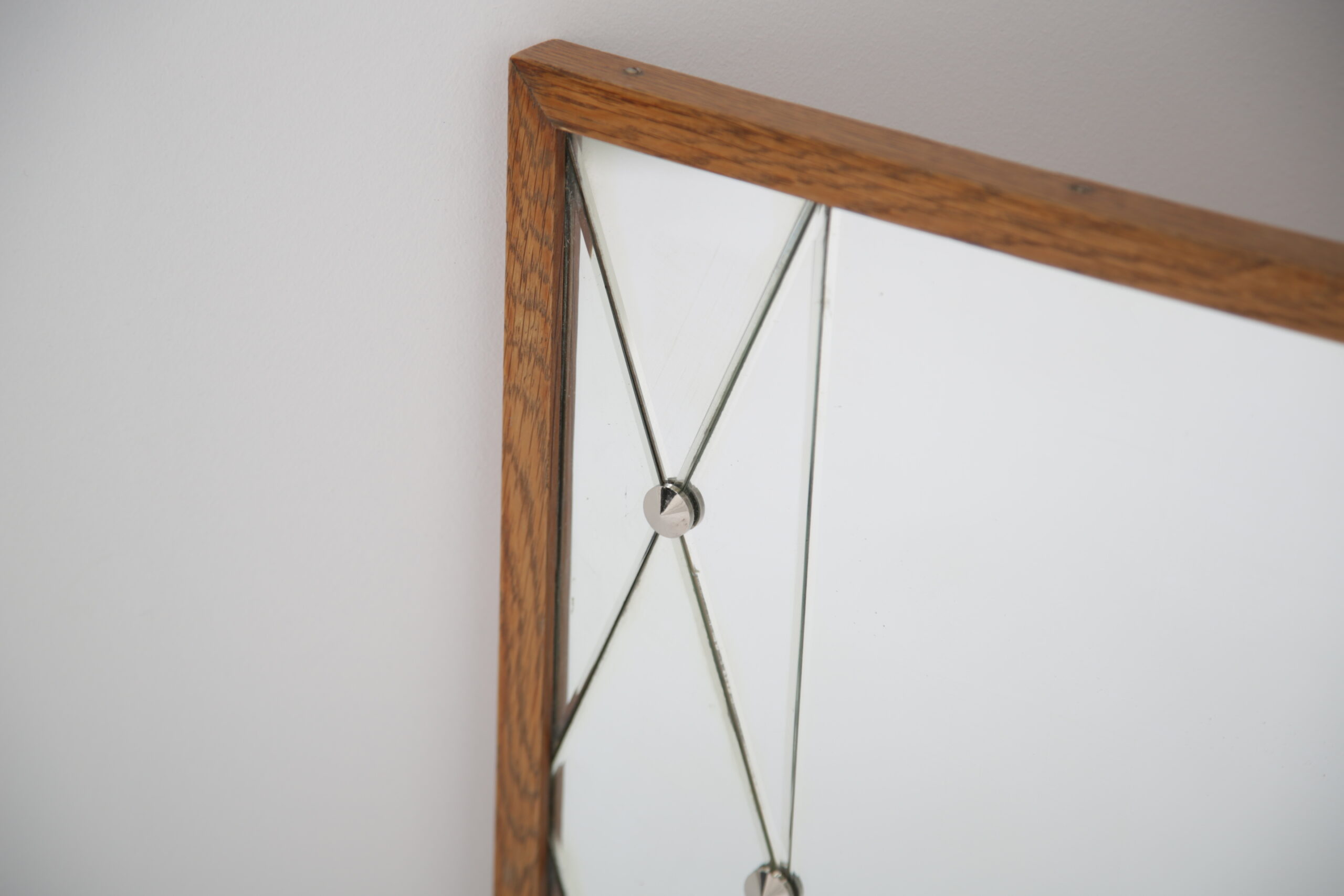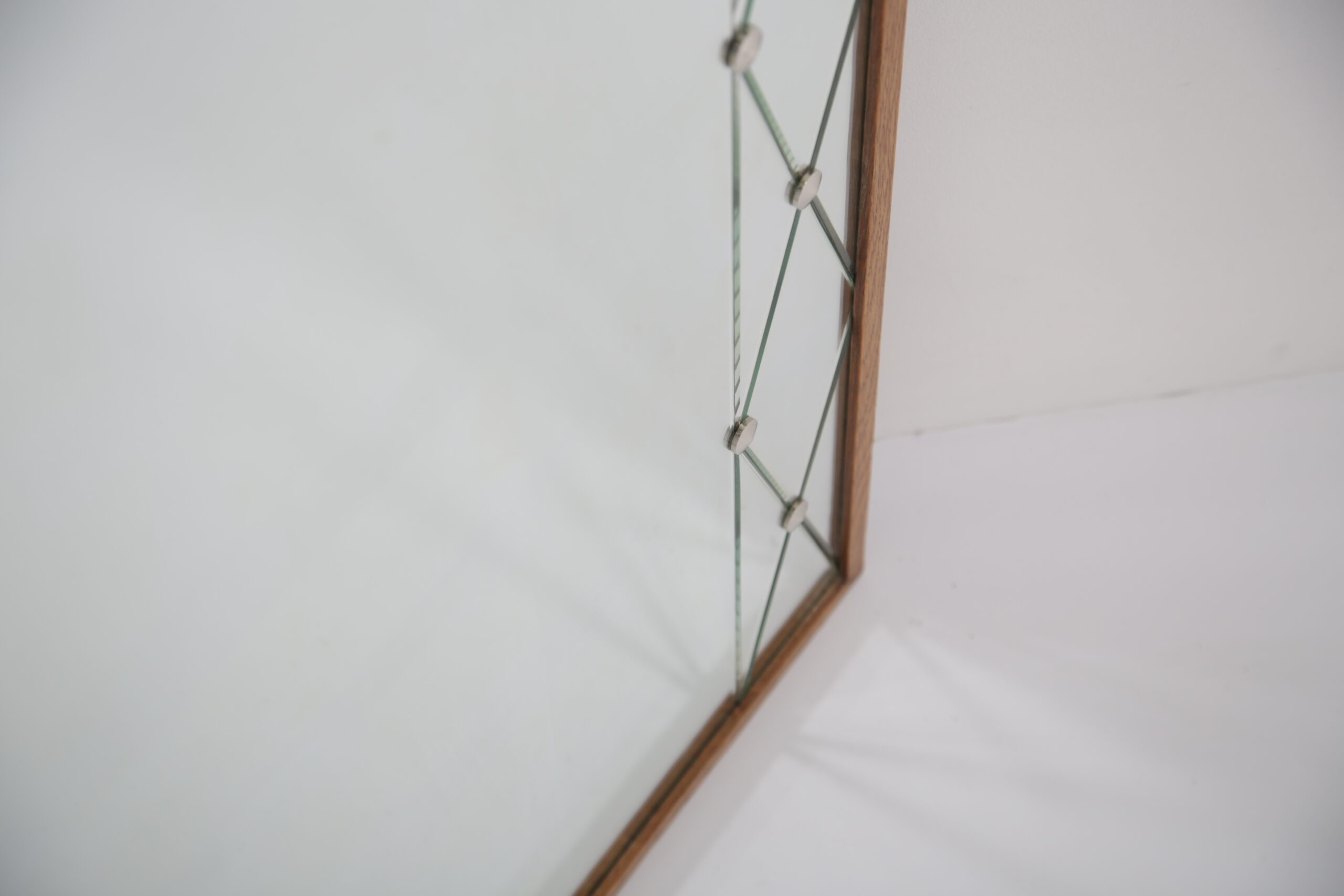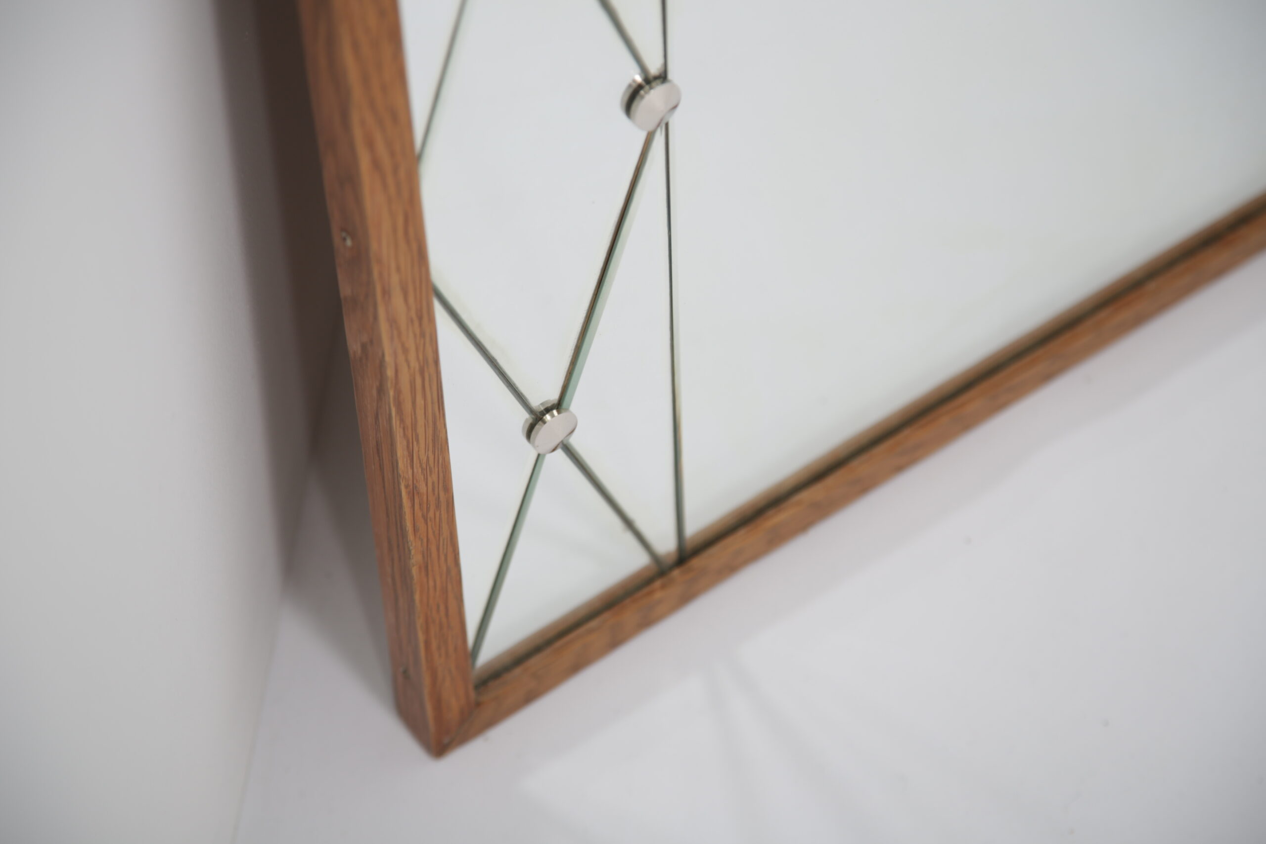Vintage Swedish Rosewood and Glass Penguin Mirror. This stunning mirror was imported from Sweden and is known as a harlequin mirror, manufactured by the Swedish company Glas & Trä (G&T). Featuring a beautifully designed harlequin-patterned glass frame, this piece embodies the playful yet refined aesthetic of 1950s Swedish design. Its clean lines and geometric elegance make it a standout addition to any hallway, bedroom, or living area.