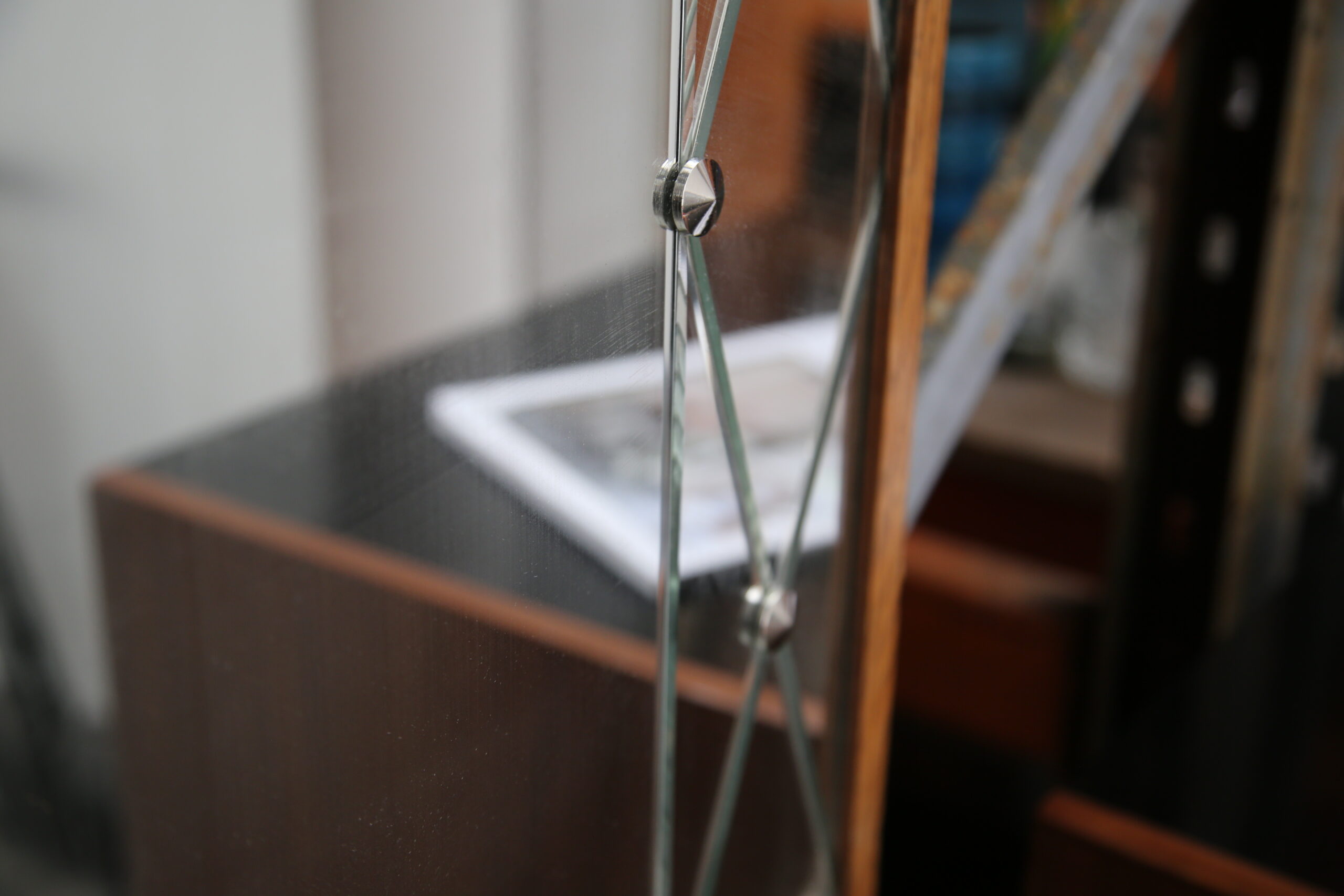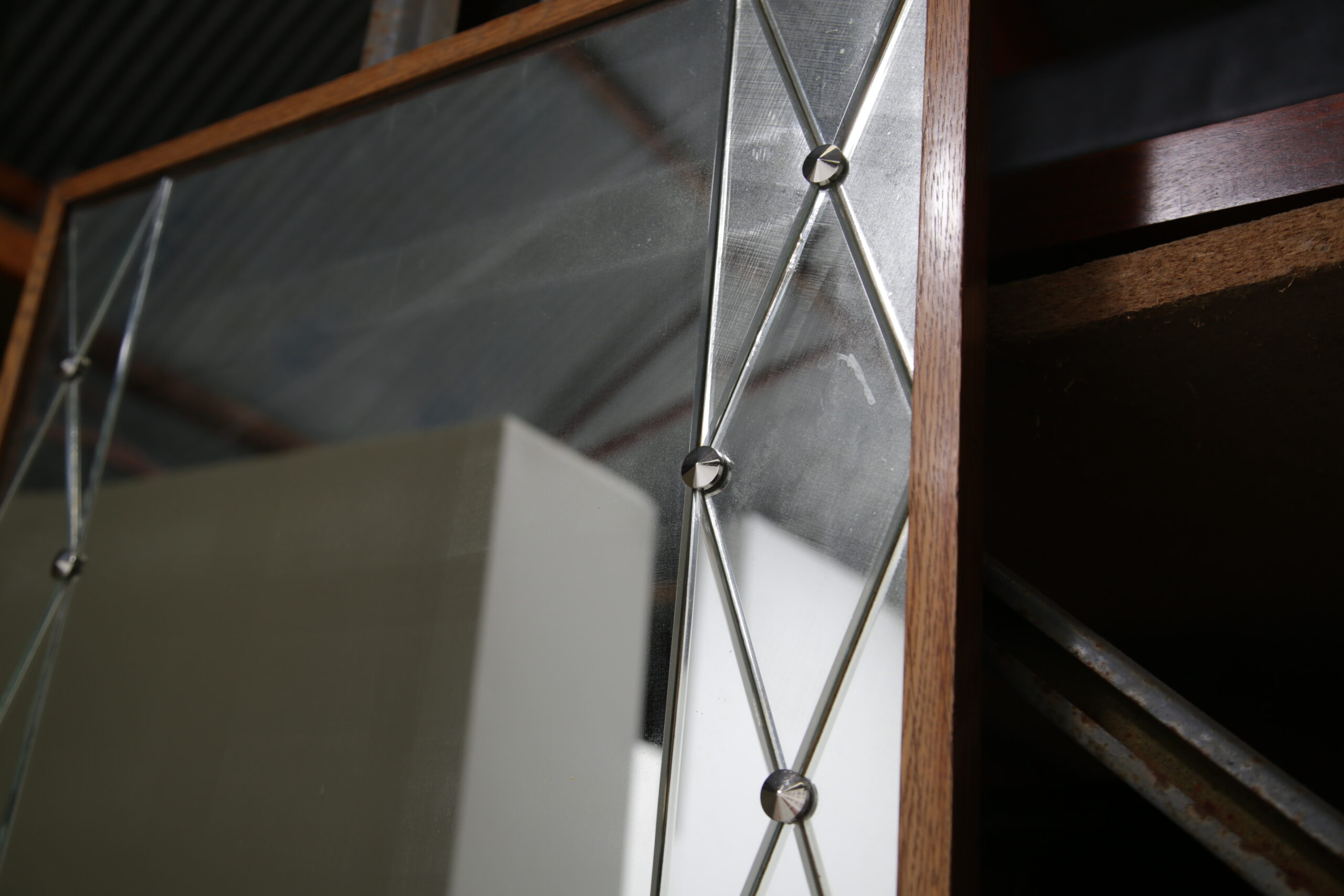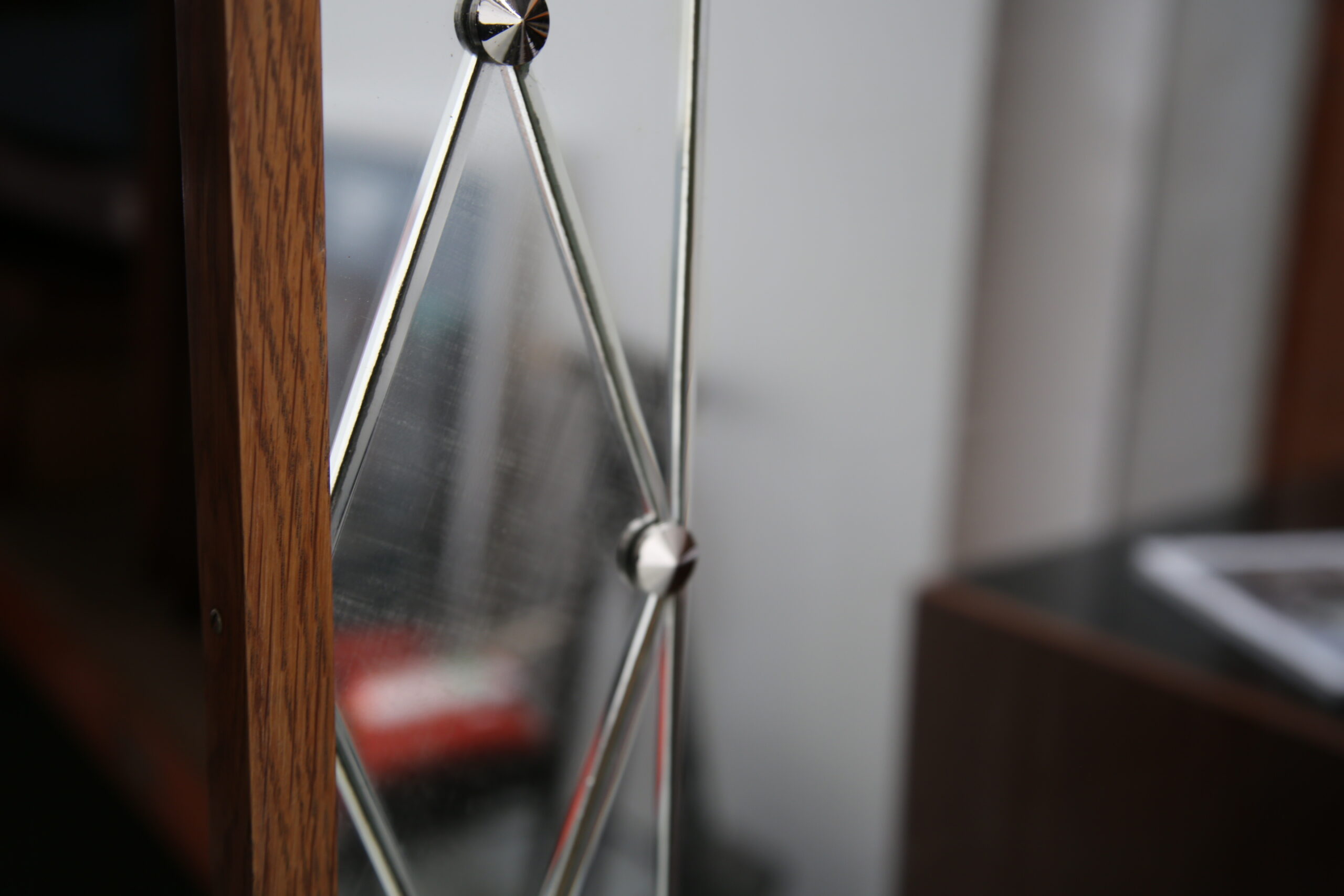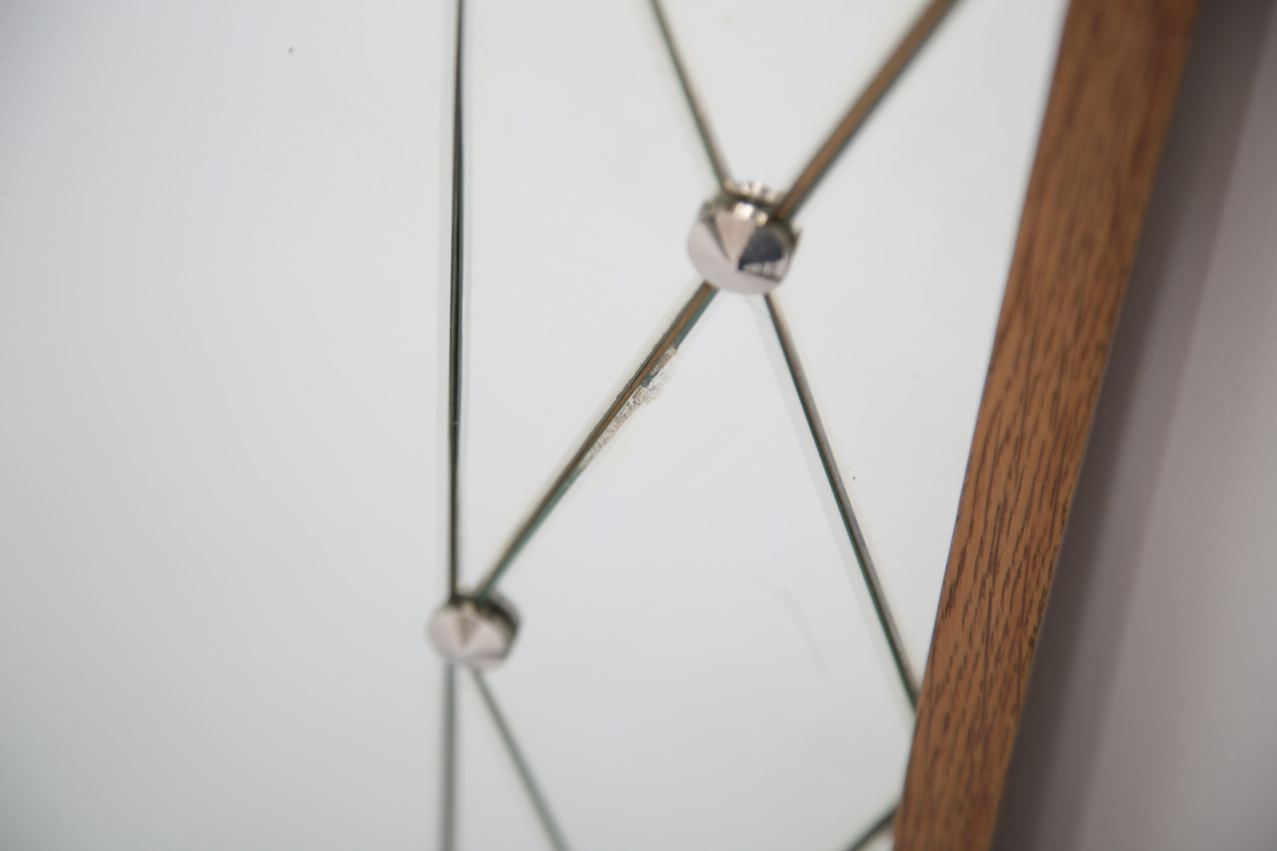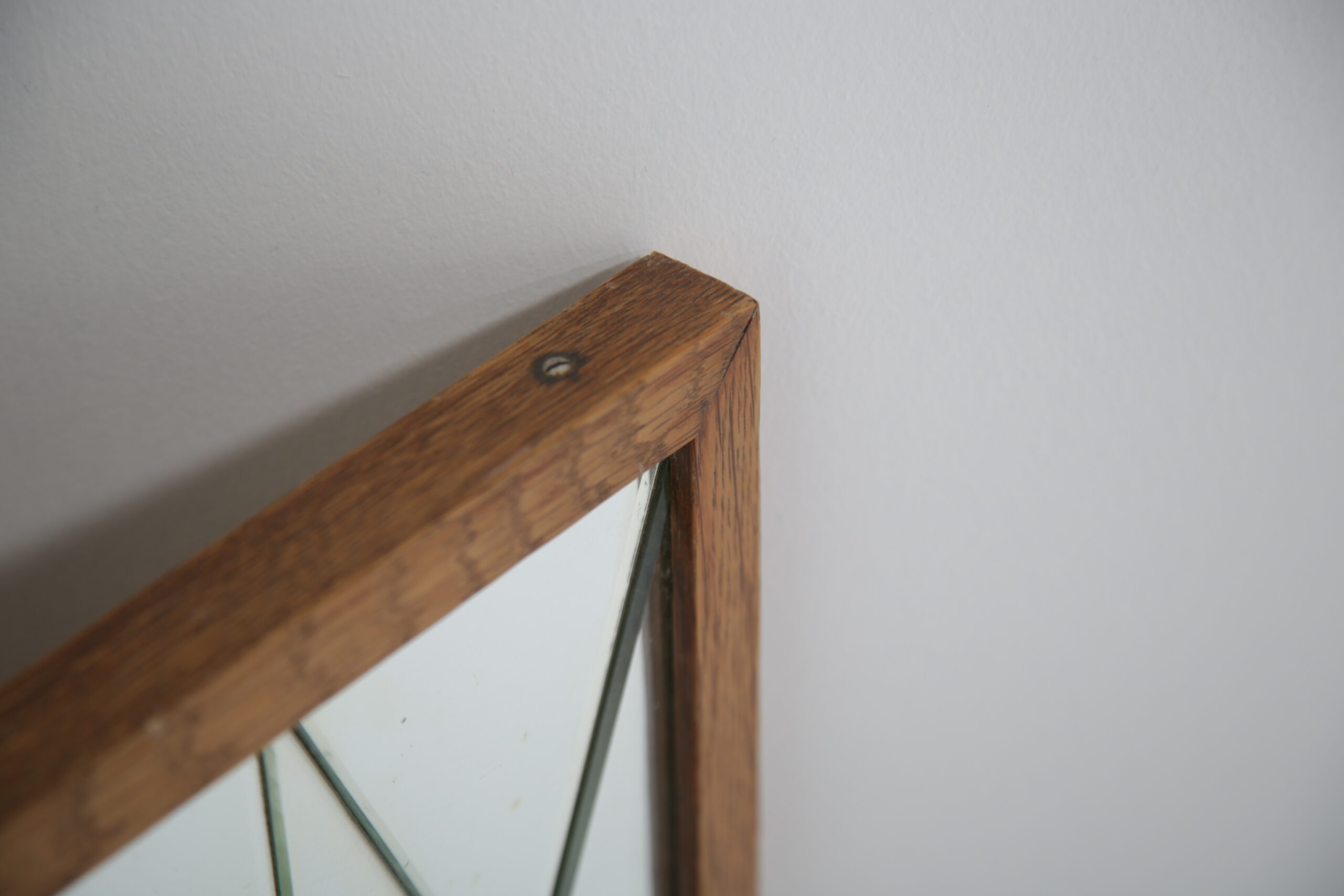 Vintage Swedish Rosewood and Glass Penguin Mirror. This stunning mirror was imported from Sweden and is known as a harlequin mirror, manufactured by the Swedish company Glas & Trä (G&T). Featuring a beautifully designed harlequin-patterned glass frame, this piece embodies the playful yet refined aesthetic of 1950s Swedish design. Its clean lines and geometric elegance make it a standout addition to any hallway, bedroom, or living area.