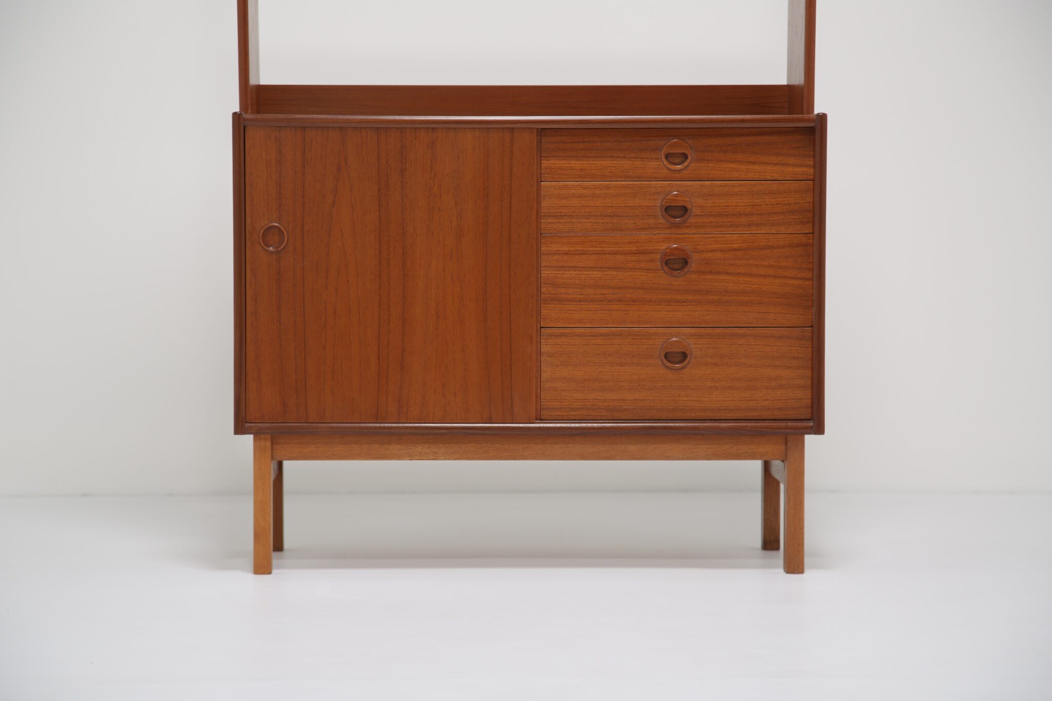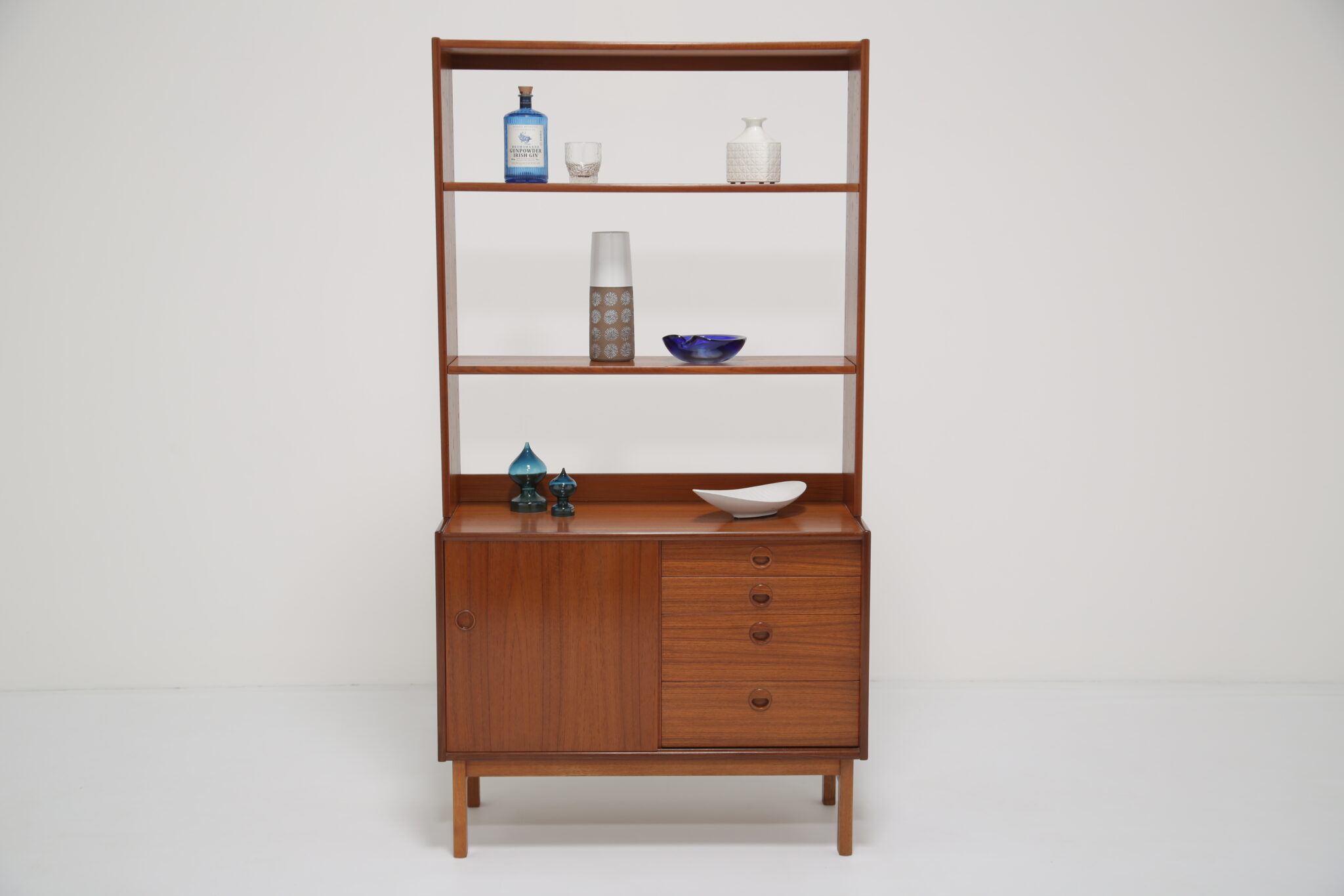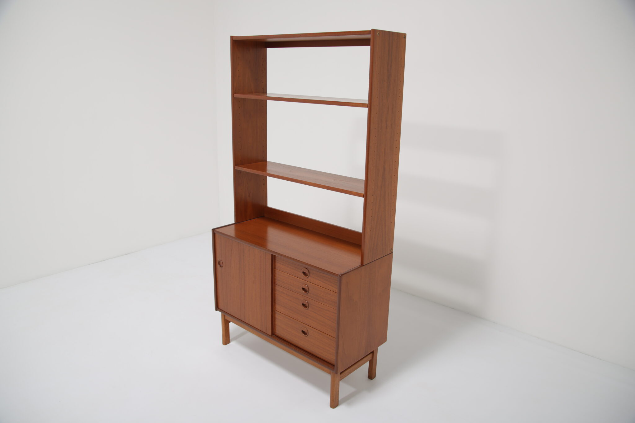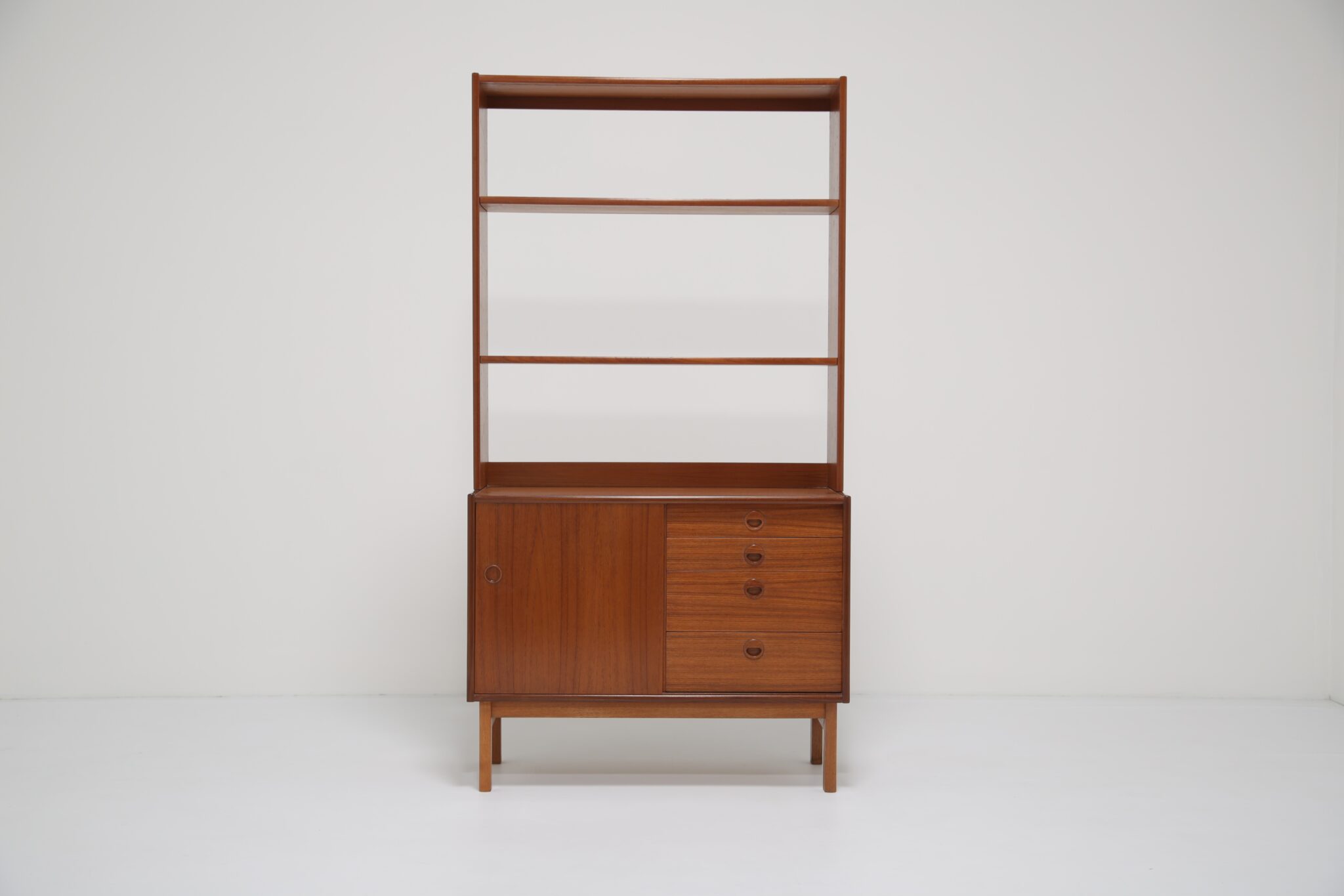 A beautifully made two-part teak bookcase, produced in Sweden in the 1960s and likely designed by Bodafors or Arne Wahl Iversen. This piece features a cabinet base with a sliding door, four drawers (with the lower two being slightly deeper), and an upper shelving section with adjustable shelves for flexible storage.