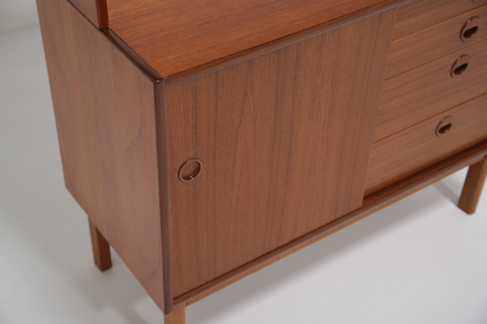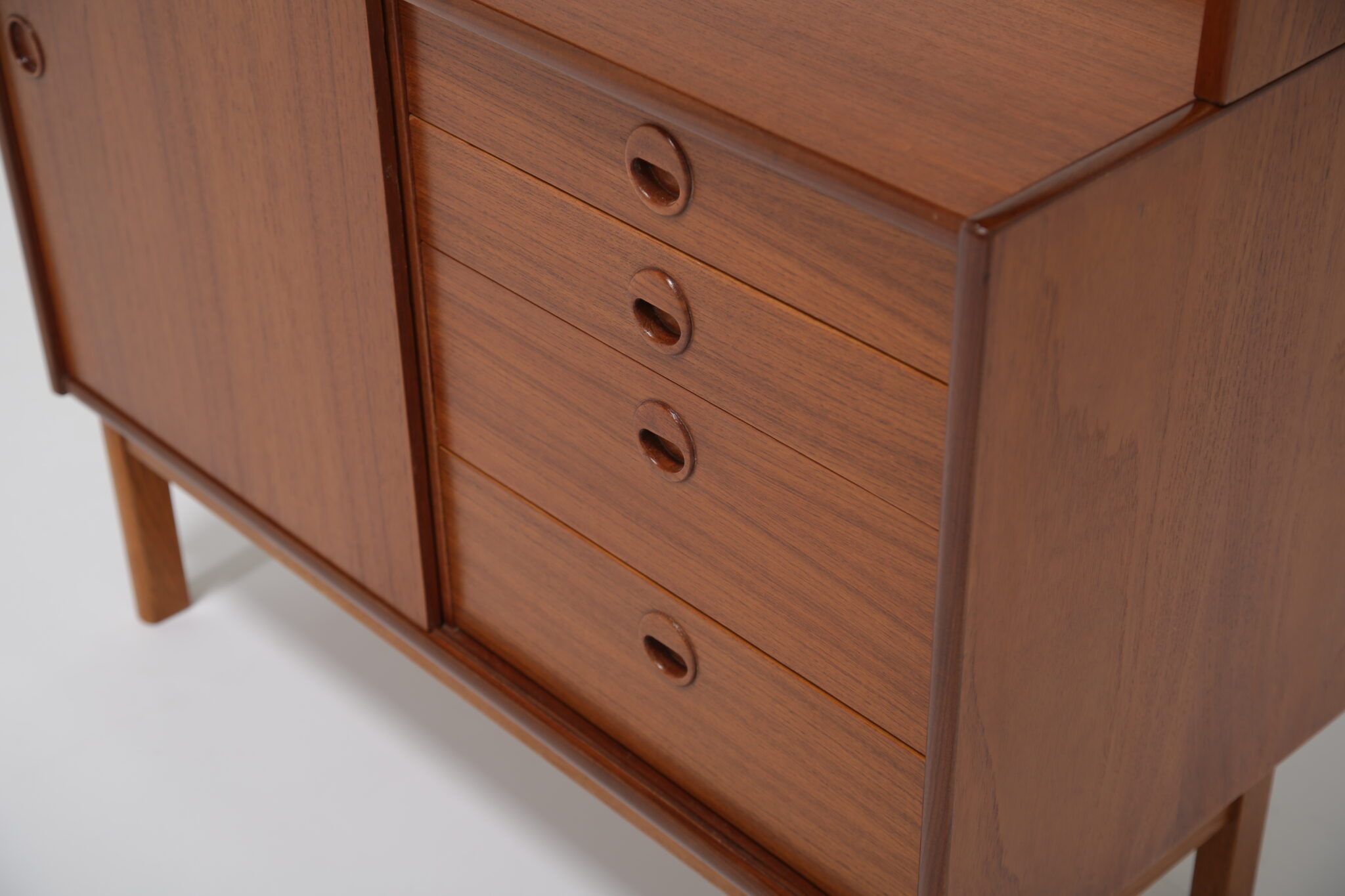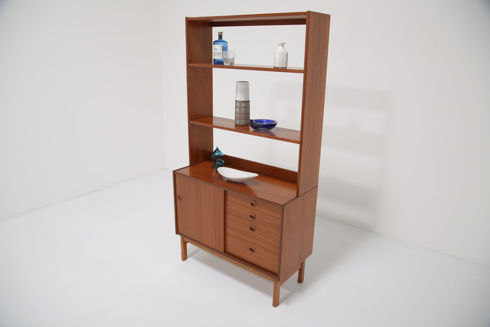 A beautifully made two-part teak bookcase, produced in Sweden in the 1960s and likely designed by Bodafors or Arne Wahl Iversen. This piece features a cabinet base with a sliding door, four drawers (with the lower two being slightly deeper), and an upper shelving section with adjustable shelves for flexible storage.