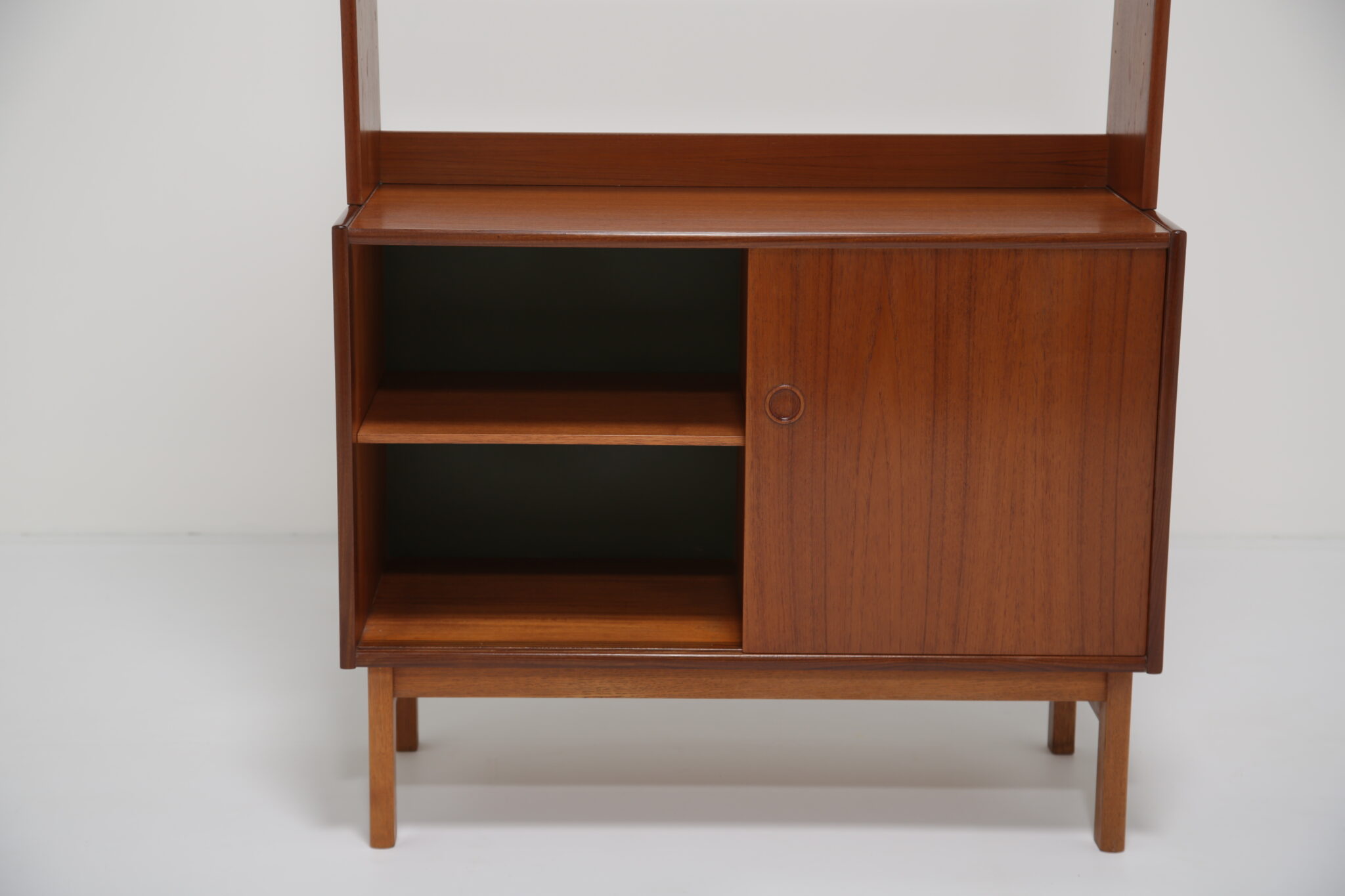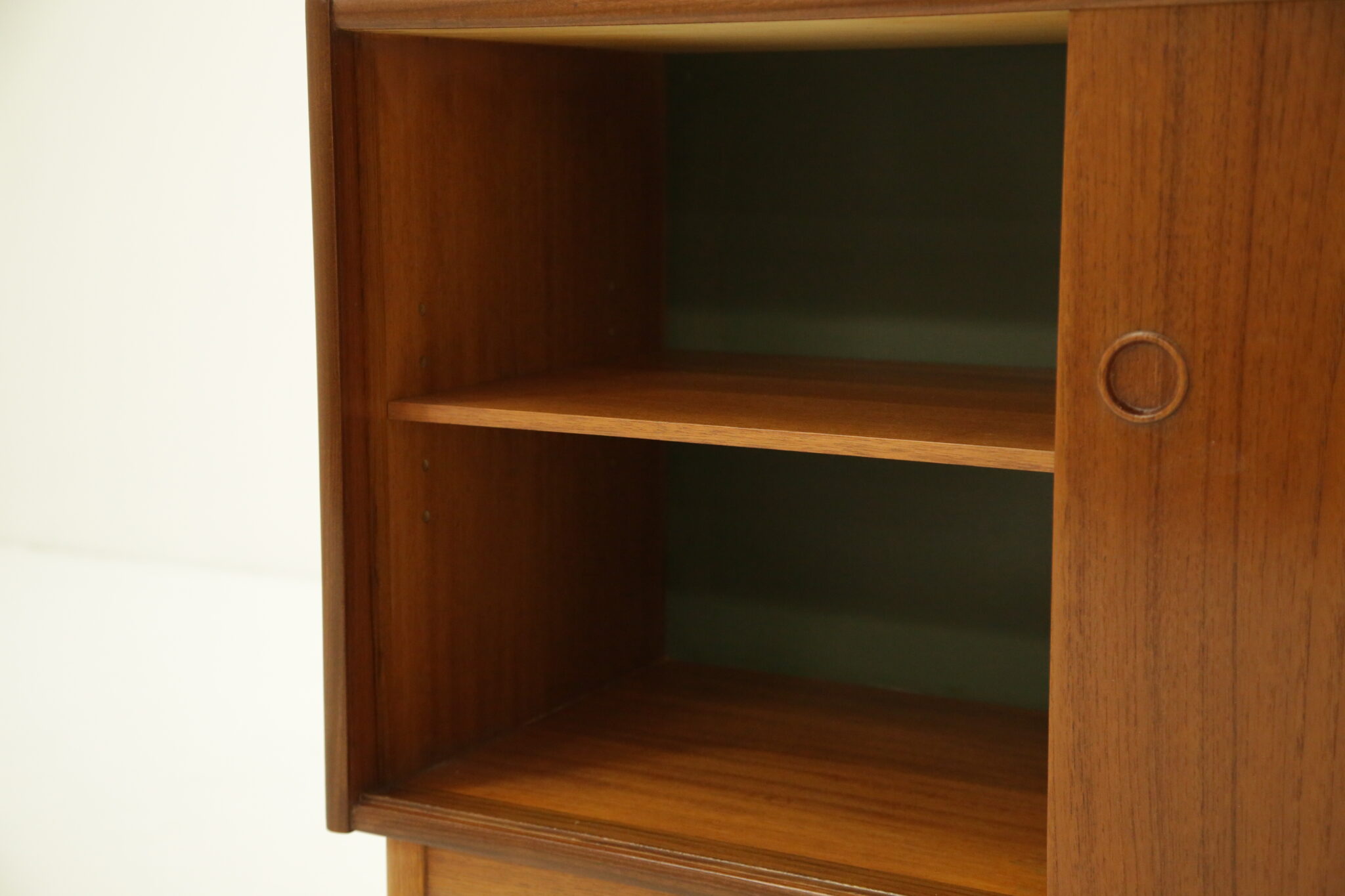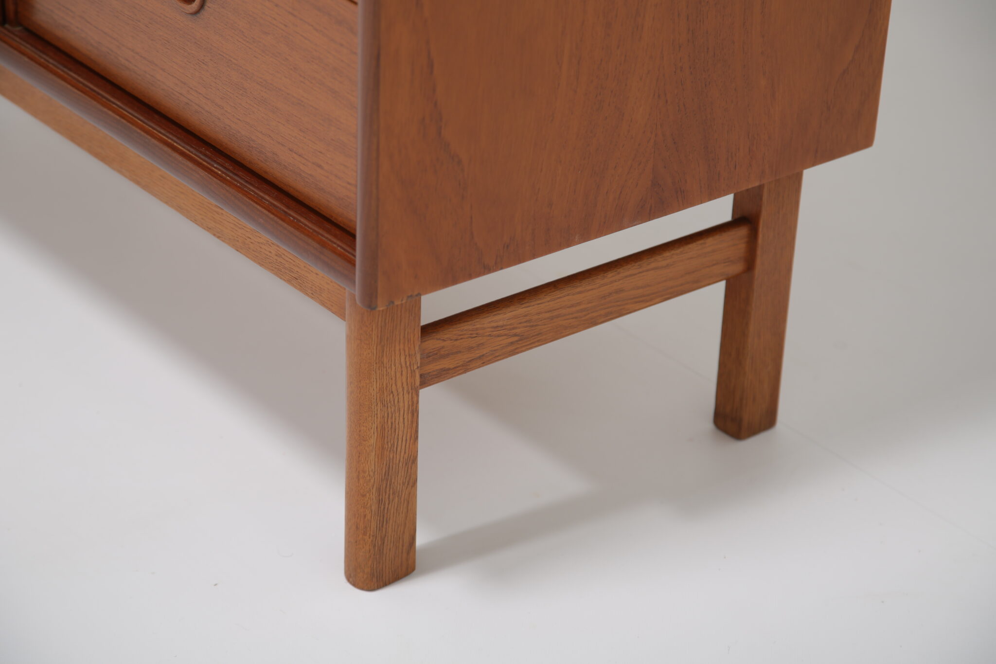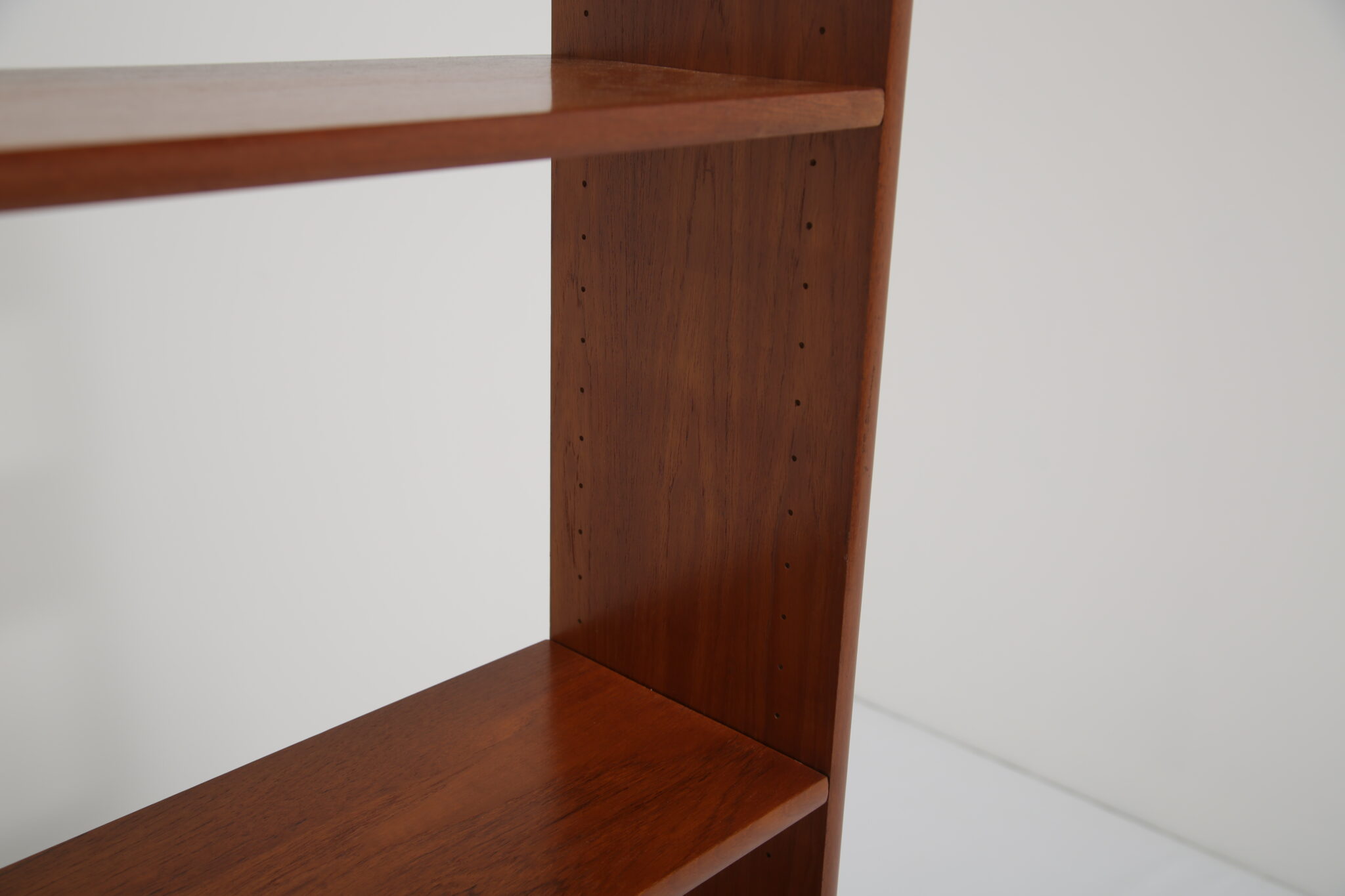 A beautifully made two-part teak bookcase, produced in Sweden in the 1960s and likely designed by Bodafors or Arne Wahl Iversen. This piece features a cabinet base with a sliding door, four drawers (with the lower two being slightly deeper), and an upper shelving section with adjustable shelves for flexible storage.