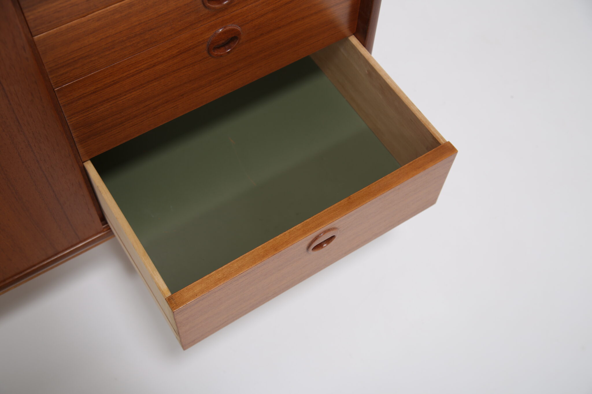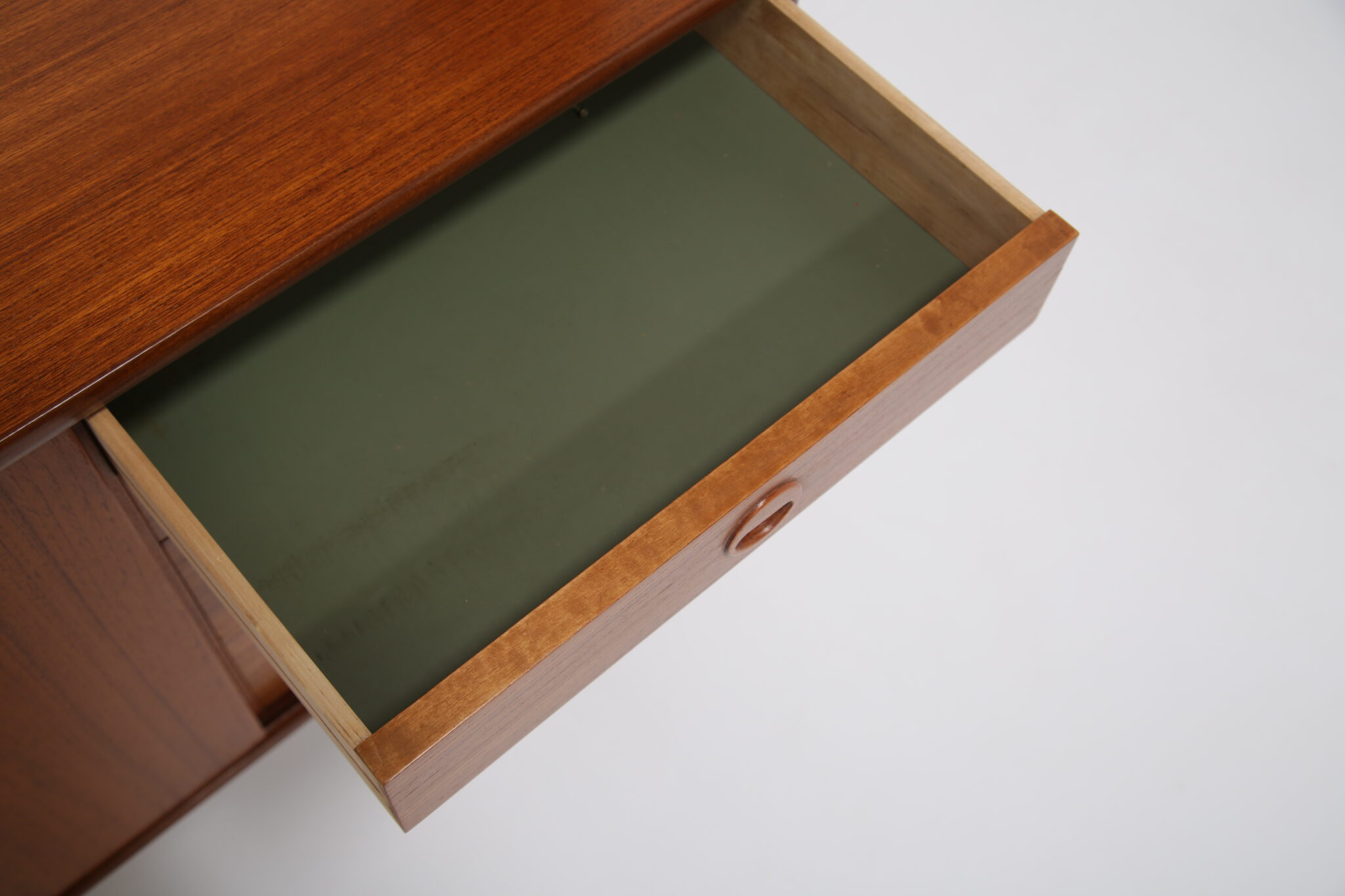 The entire piece has been professionally restored in-house. As with all our items, the teak surfaces were stripped, hand-sanded using multiple grades of paper, stained with a dye, and finished with a French polish to bring out the natural character of the grain. Drawers and doors glide smoothly, and all joints have been re-glued or dowelled as needed to ensure structural integrity.