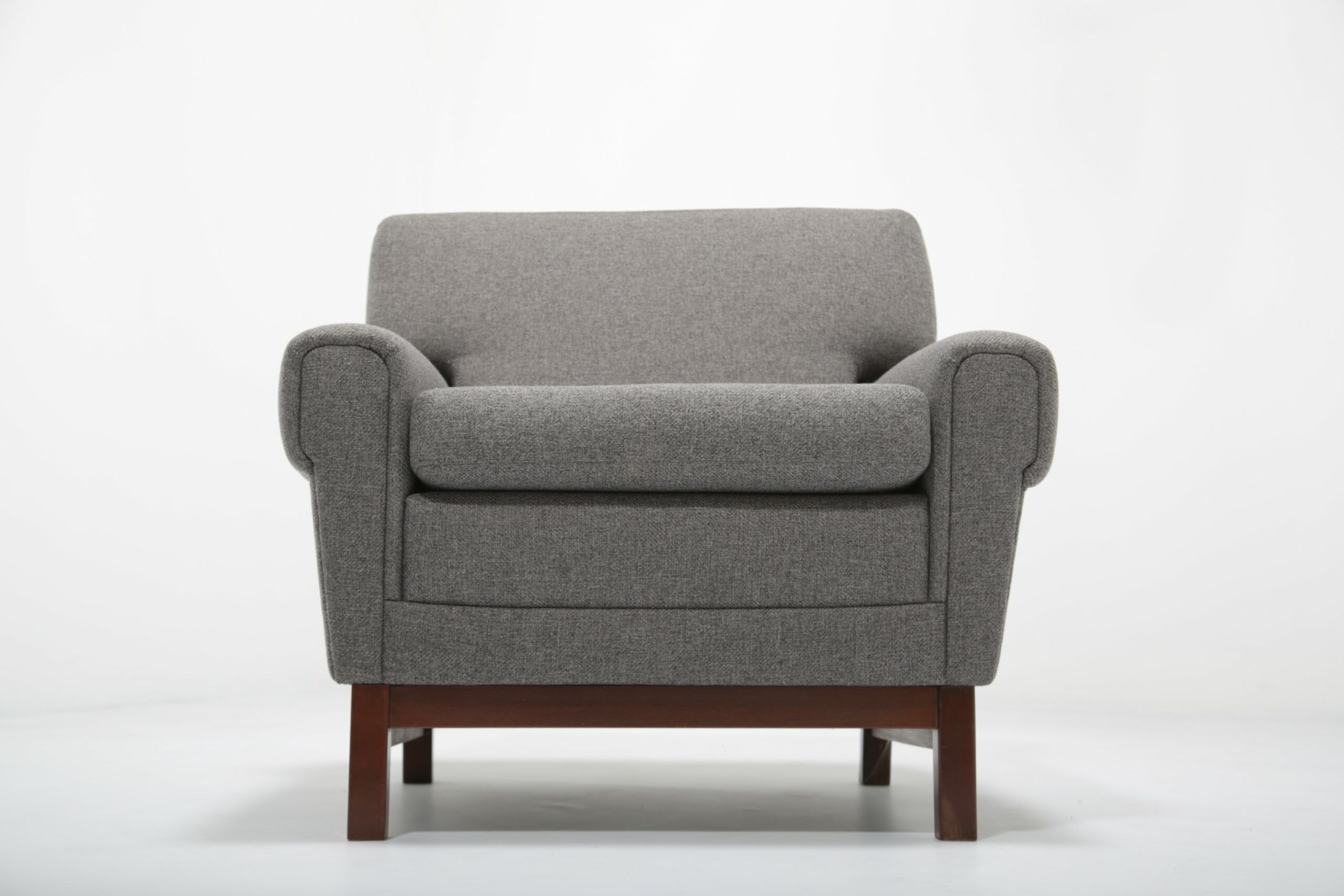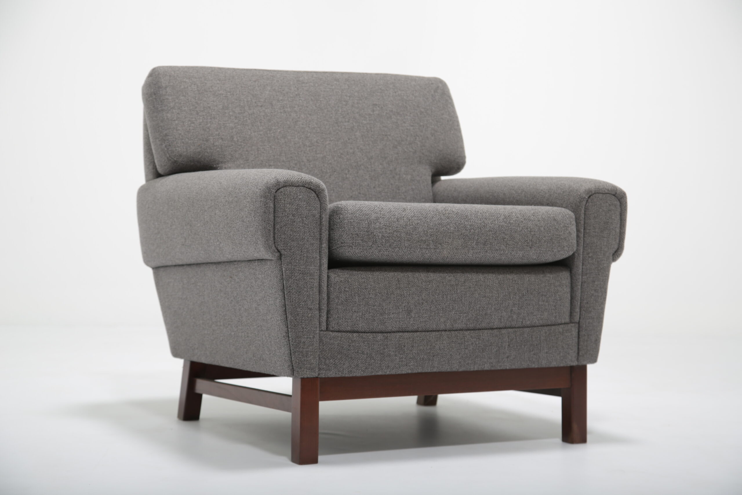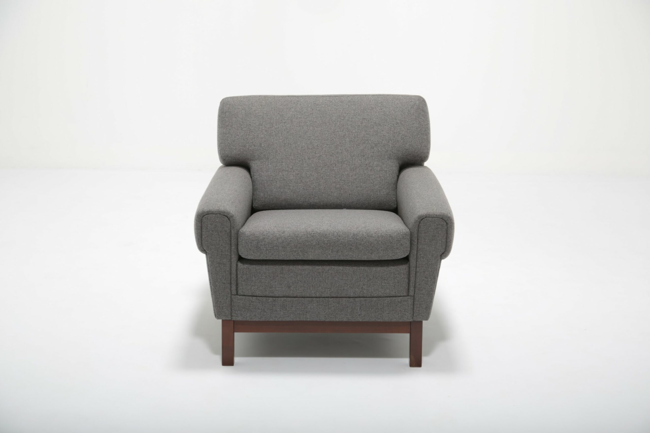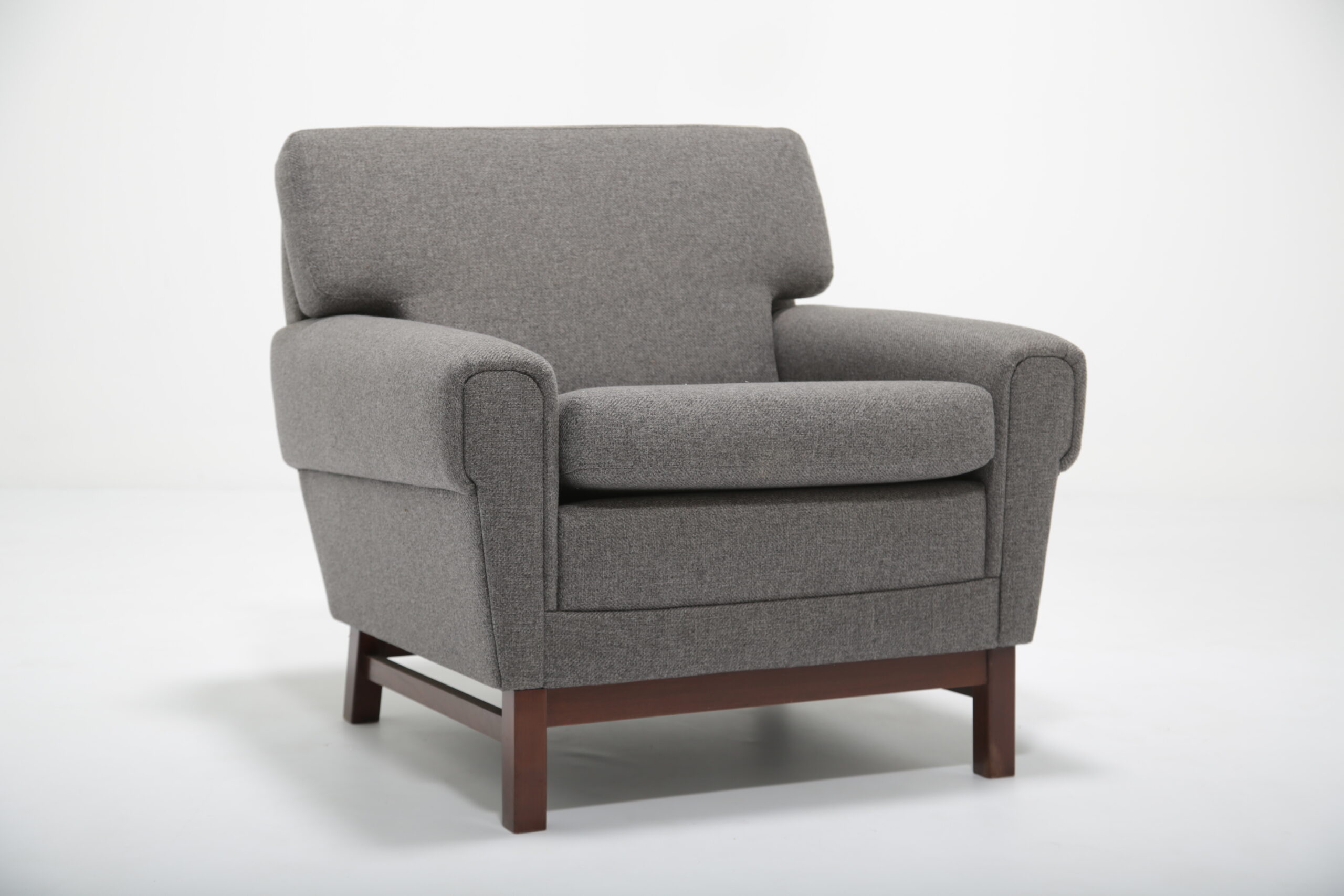 Bring comfort to your home with this sleek grey upholstery armchair, featuring a dark wood frame. This would be perfect for your living room as an addition to your current setup or for your favorite corner as a reading chair. The chair offers optimal support for the back. The chair was originally upholstered in a dull brown fabric that was ripped and the foam was damaged. We have fully refurbished this chair with new modern fabric and foam, in theory a brand new chair on a vintage frame. This chair was imported from Sweden, designer remains unknown but it may have potentially been produced by IKEA.