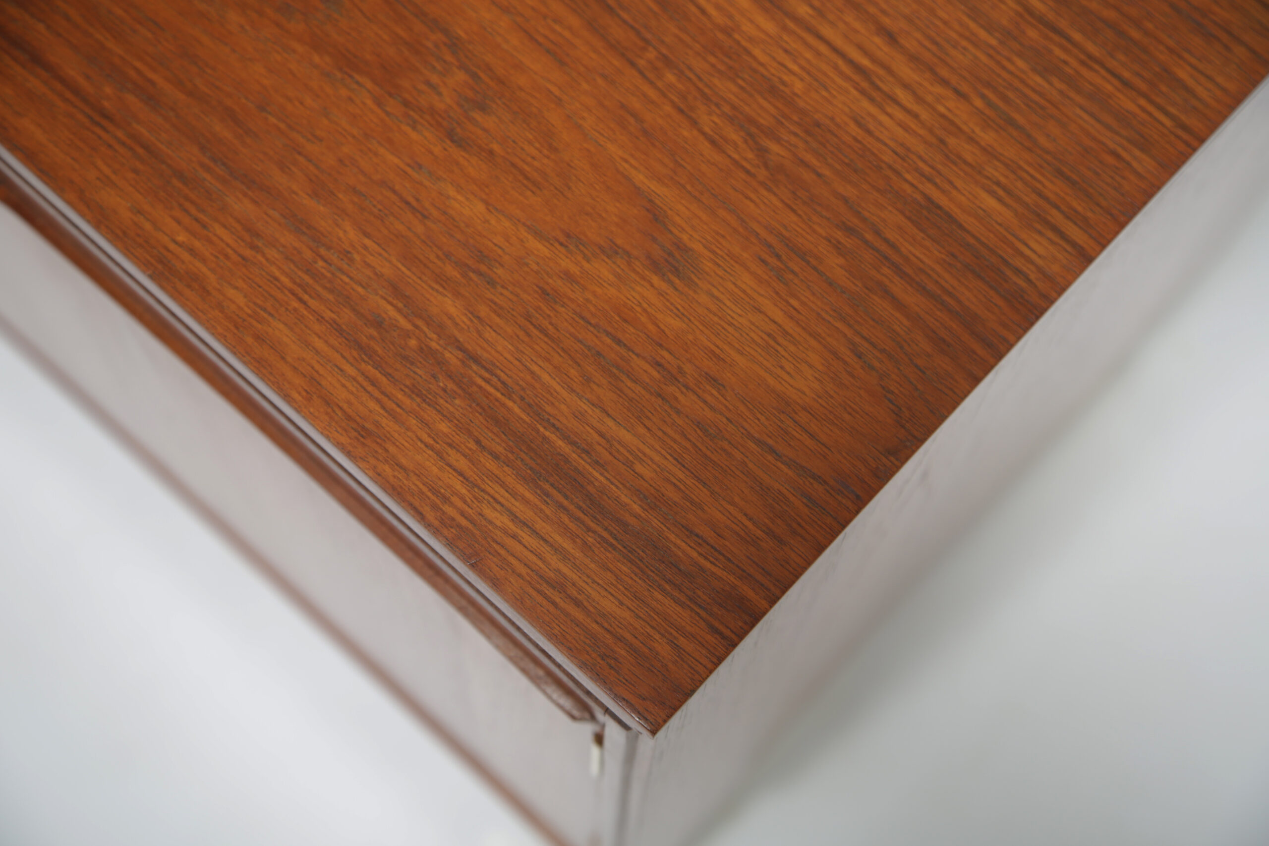 We have fully restored this unit. The restoration process included a full strip and sanding of the old varnish and the unit has been polished for a fresh new look. The hinges were removed and polished to give them a shine and a fresh look. The feet, which is not original was put in as the old base was too far gone to salvage.