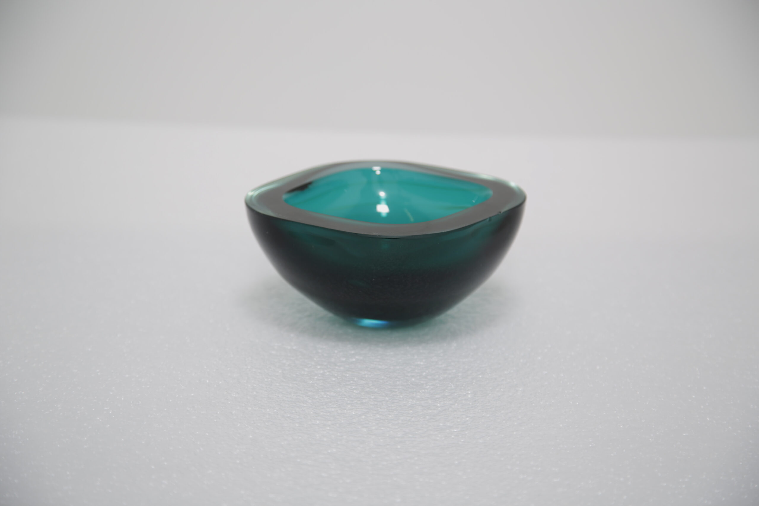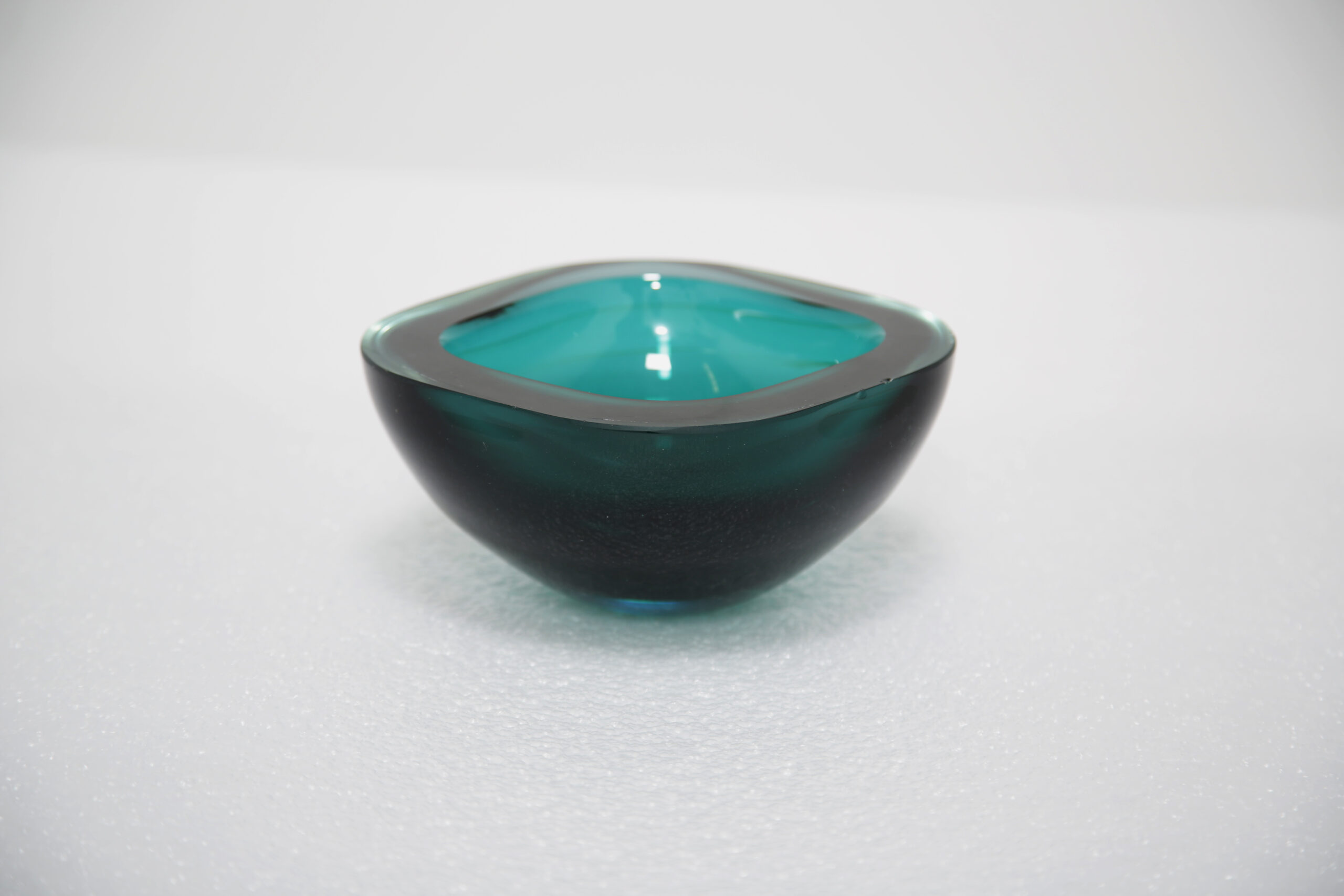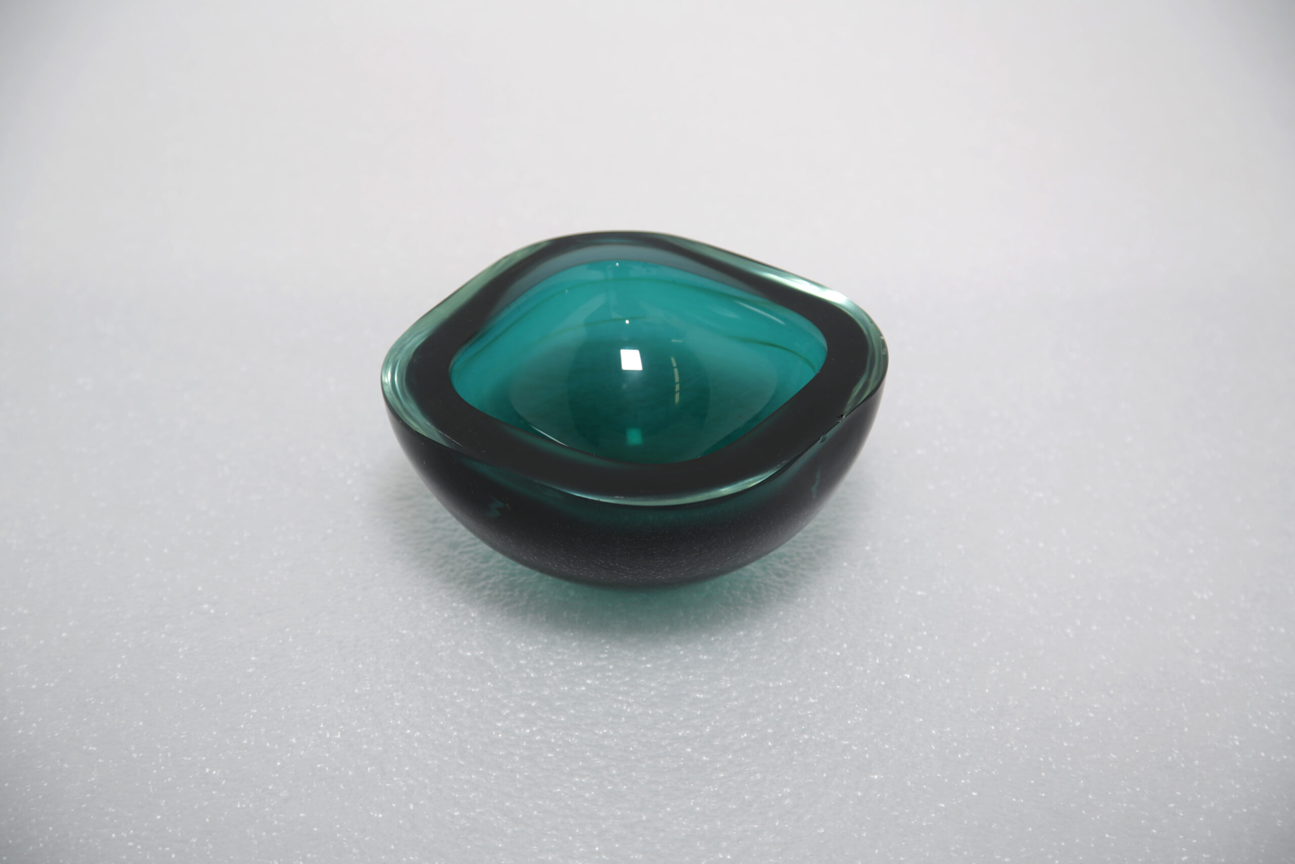 The rich teal color submerged within crystal-clear glass creates a mesmerizing visual effect, embodying the essence of the Sommerso technique. Distinctive, fluid and masterfully executed, this piece showcases the artistry of Archimede Seguso—one of Murano’s most revered glassmakers. Ideal as a functional bowl or displayed purely as a sculptural accent, it serves as a bold statement of mid-century Italian craftsmanship.